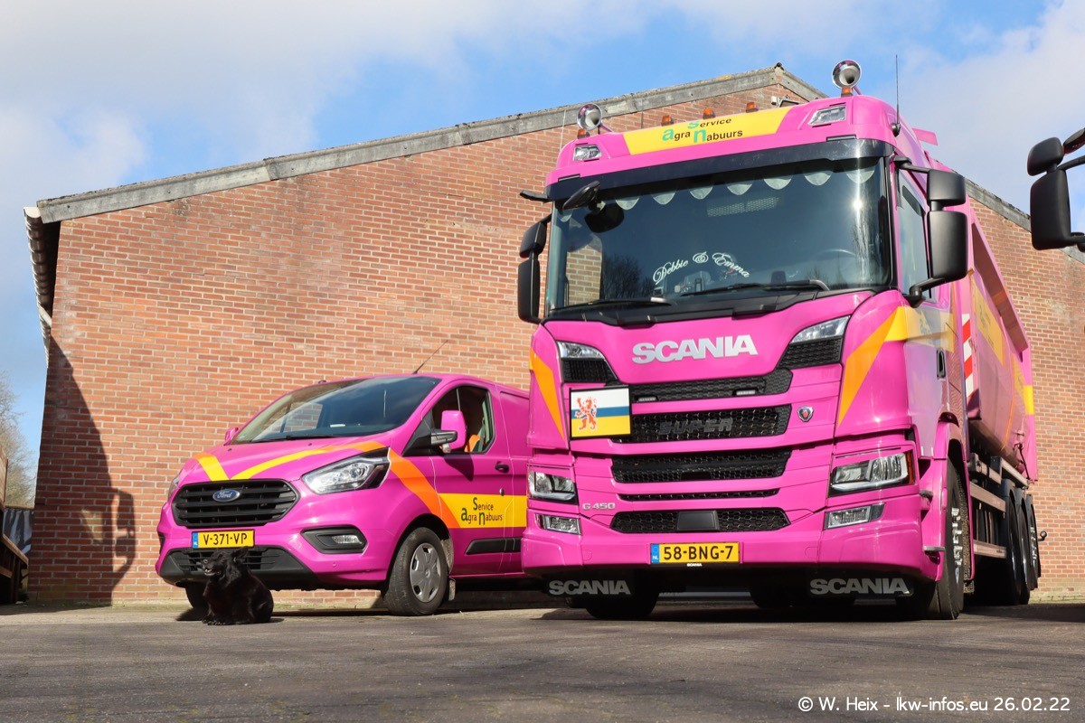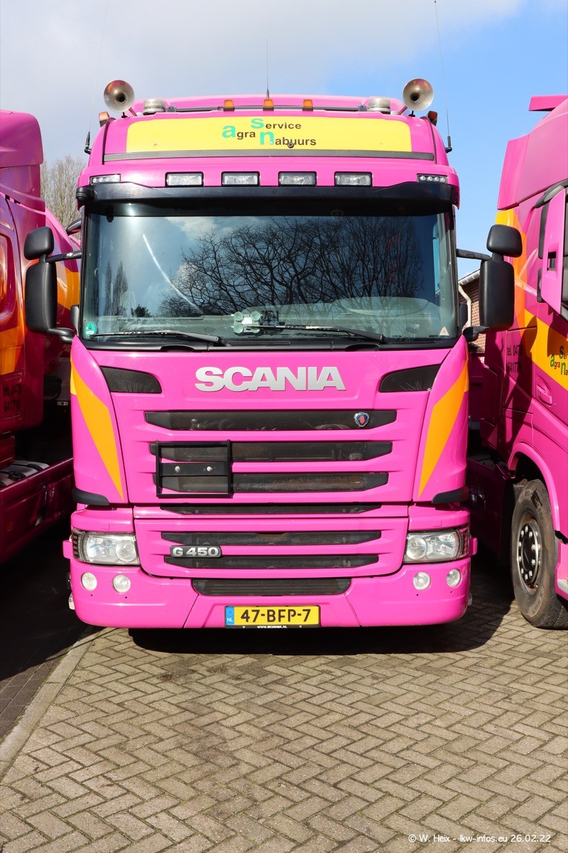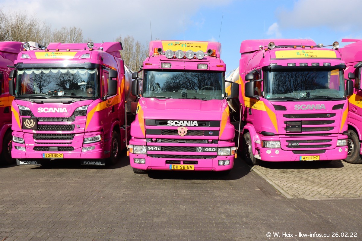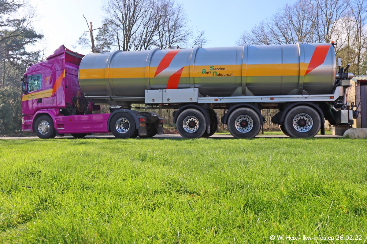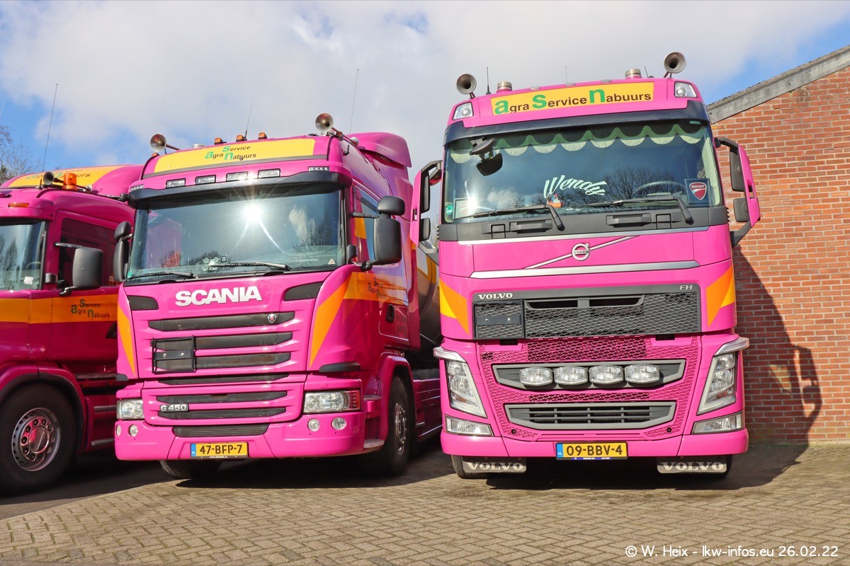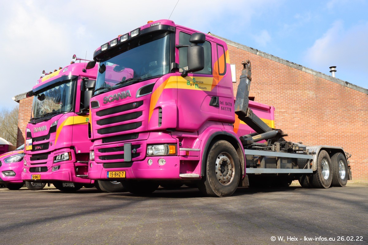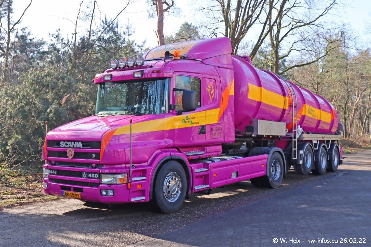 Mein erster Besuch bei der Firma Agra Service Nabuurs in Overloon (in der Nähe von Boxmeer gelegen) begann direkt mit einem schönen Fotoshooting, mit dem ich so nicht gerechnet bzw,. das ich so nicht geplant hatte. Aber gerade so macht das Hobby Spaß! Alle sieben LKW standen frisch gewaschen nebeneinander auf dem Hof. Sechs davon sind im täglichen Einsatz. Der SCANIA T 144 L 460 V8 Hauber wird nur noch als Ersatz und für Hobbyzwecke verwendet und ist inzwischen schon 21 (!) Jahre alt. Das Wetter war fast perfekt, wobei es gegen Ende des Fotoshootings leider wieder grau wurde, der Nebel kam langsam zurück.