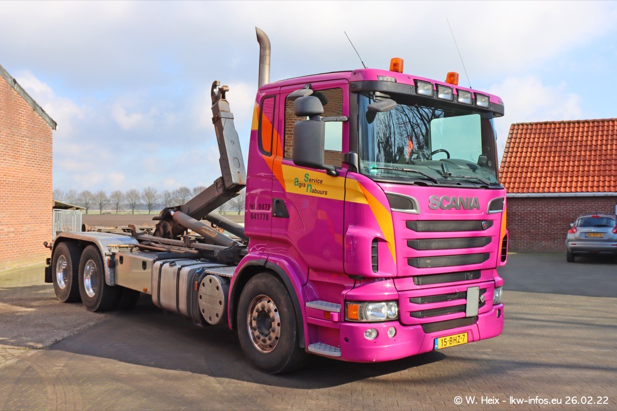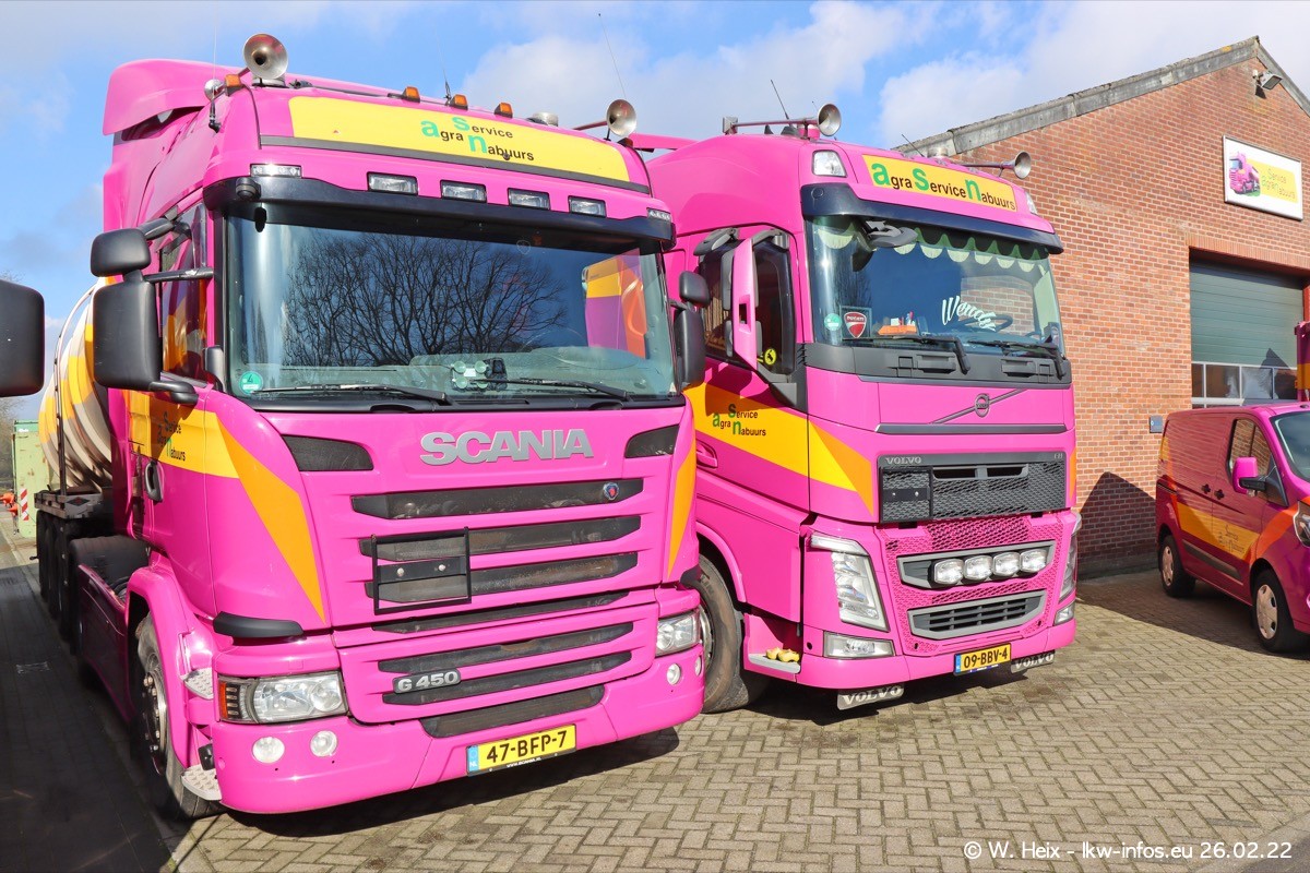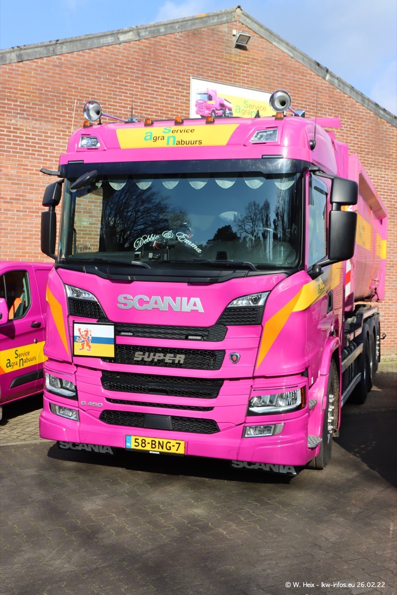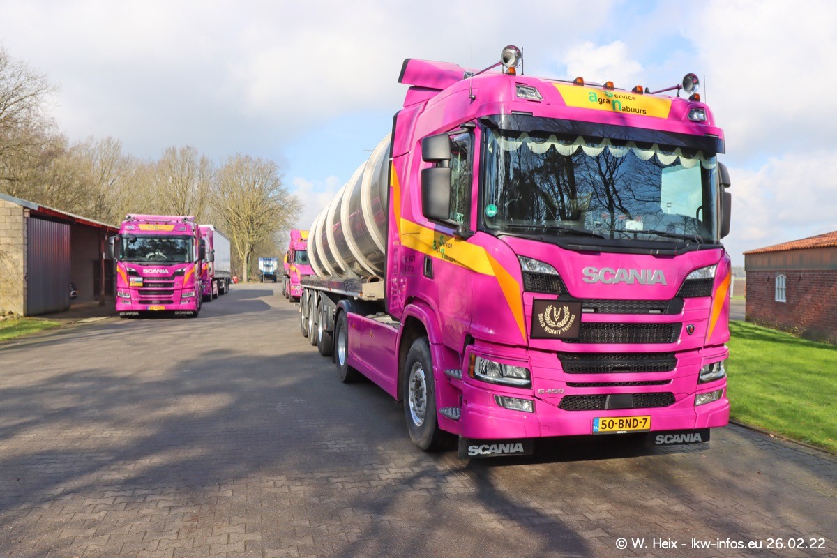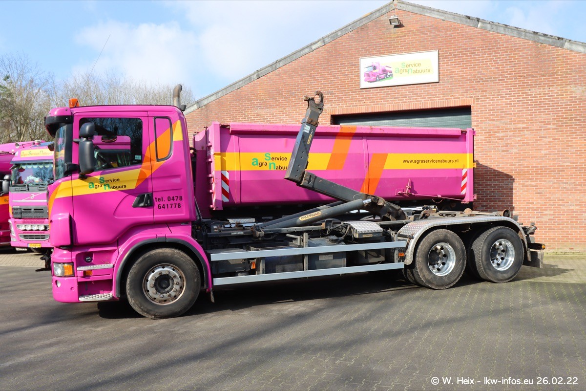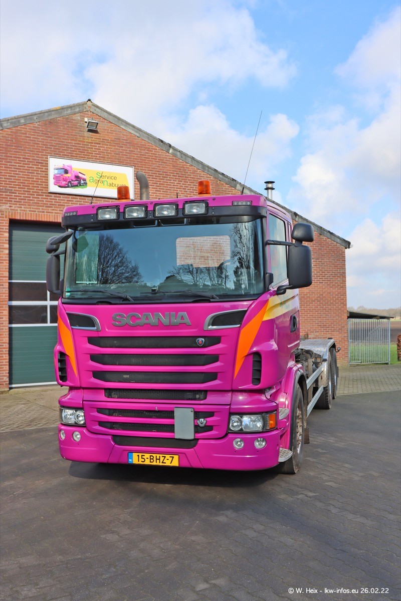 Mein erster Besuch bei der Firma Agra Service Nabuurs in Overloon (in der Nähe von Boxmeer gelegen) begann direkt mit einem schönen Fotoshooting, mit dem ich so nicht gerechnet bzw,. das ich so nicht geplant hatte. Aber gerade so macht das Hobby Spaß! Alle sieben LKW standen frisch gewaschen nebeneinander auf dem Hof. Sechs davon sind im täglichen Einsatz. Der SCANIA T 144 L 460 V8 Hauber wird nur noch als Ersatz und für Hobbyzwecke verwendet und ist inzwischen schon 21 (!) Jahre alt. Das Wetter war fast perfekt, wobei es gegen Ende des Fotoshootings leider wieder grau wurde, der Nebel kam langsam zurück.