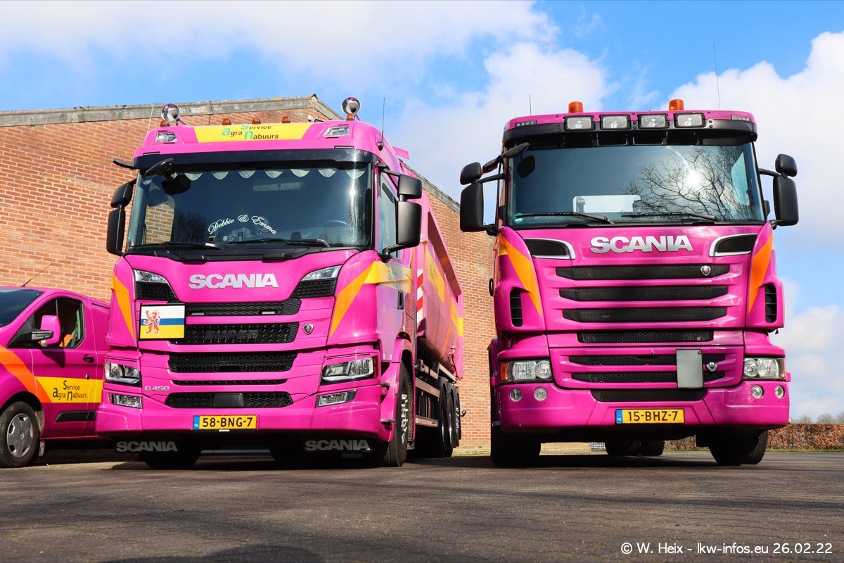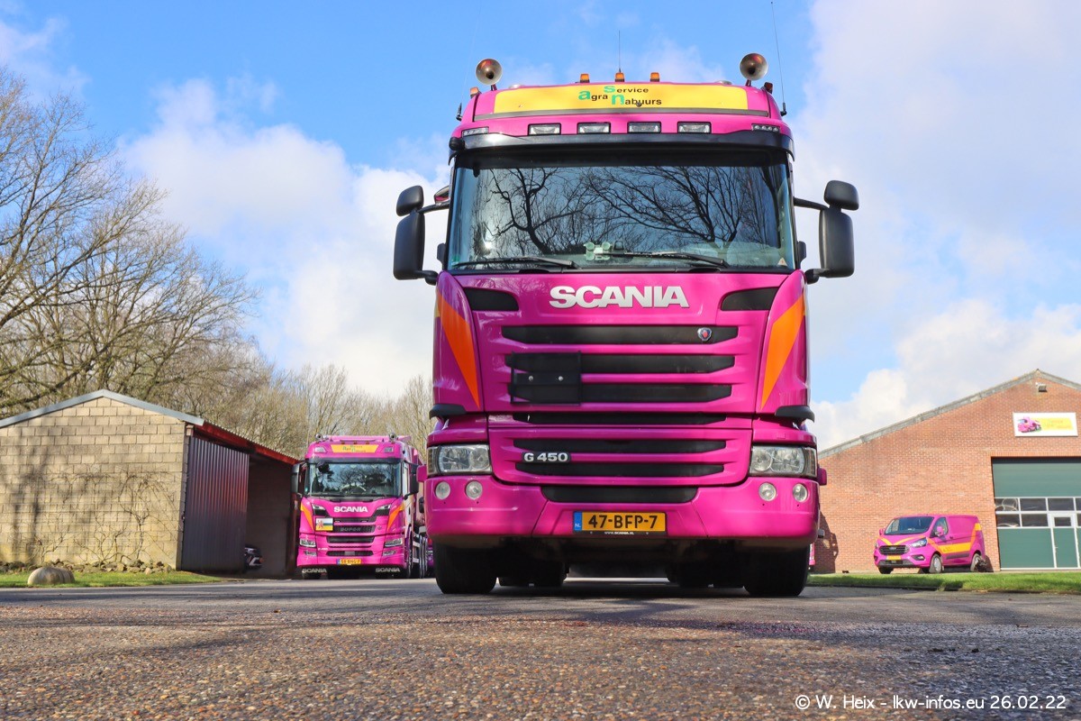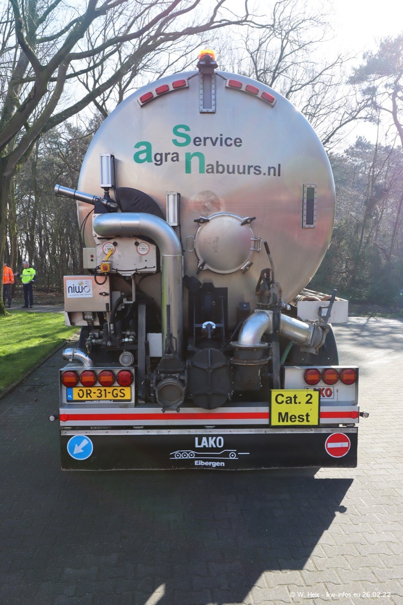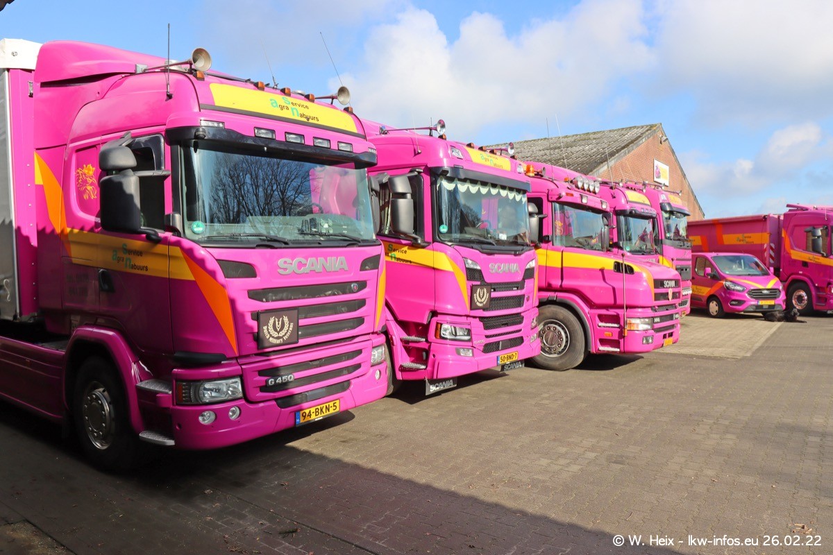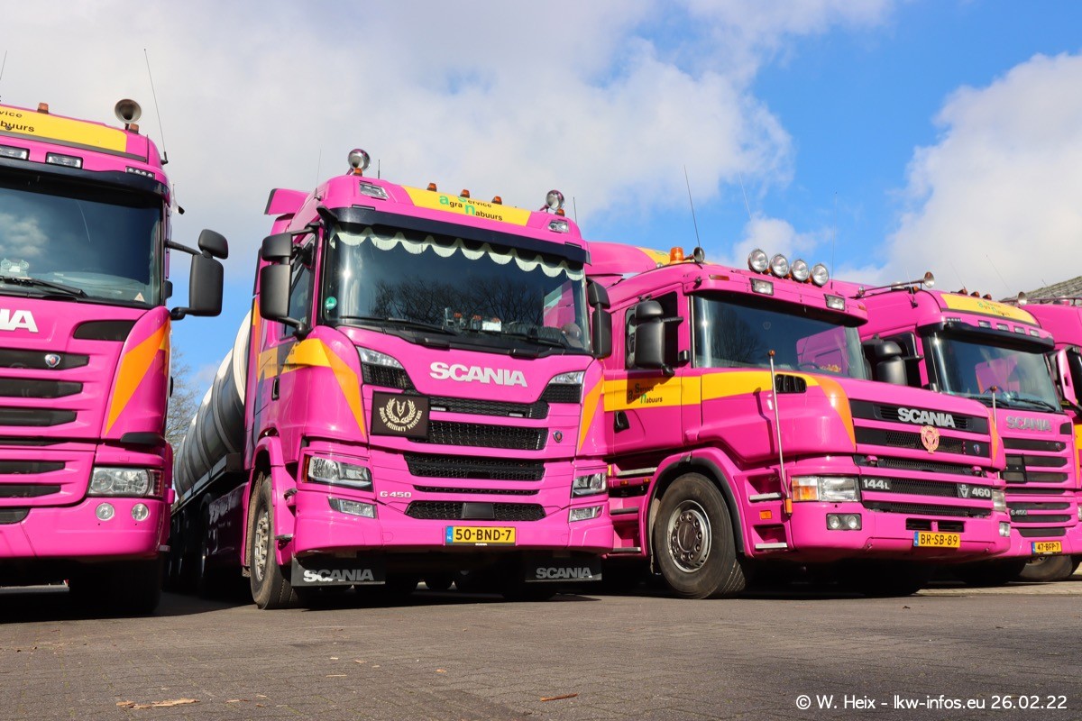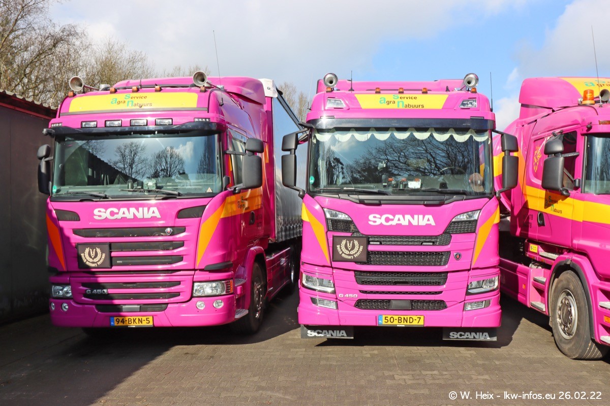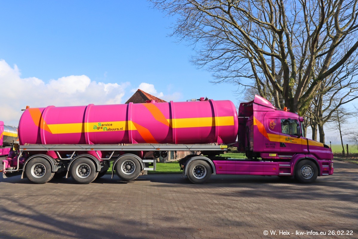 Mein erster Besuch bei der Firma Agra Service Nabuurs in Overloon (in der Nähe von Boxmeer gelegen) begann direkt mit einem schönen Fotoshooting, mit dem ich so nicht gerechnet bzw,. das ich so nicht geplant hatte. Aber gerade so macht das Hobby Spaß! Alle sieben LKW standen frisch gewaschen nebeneinander auf dem Hof. Sechs davon sind im täglichen Einsatz. Der SCANIA T 144 L 460 V8 Hauber wird nur noch als Ersatz und für Hobbyzwecke verwendet und ist inzwischen schon 21 (!) Jahre alt. Das Wetter war fast perfekt, wobei es gegen Ende des Fotoshootings leider wieder grau wurde, der Nebel kam langsam zurück.