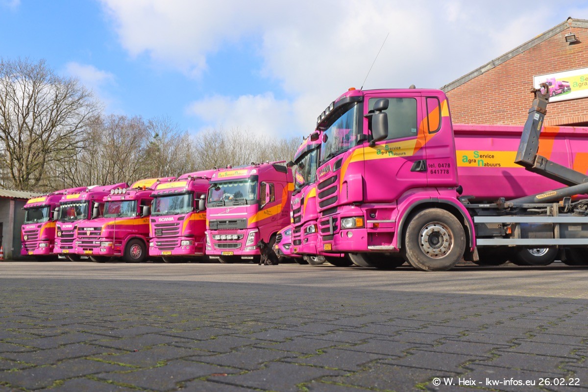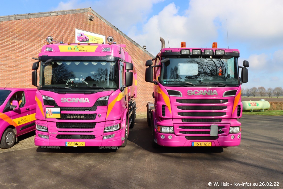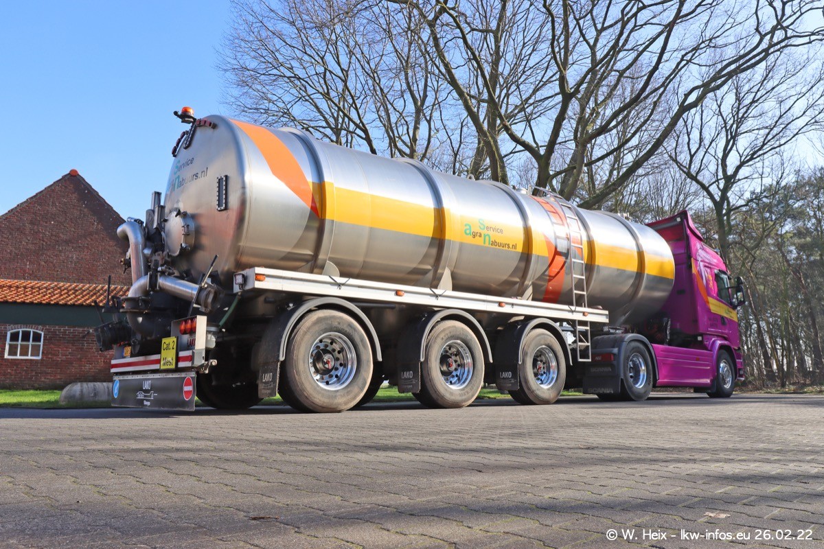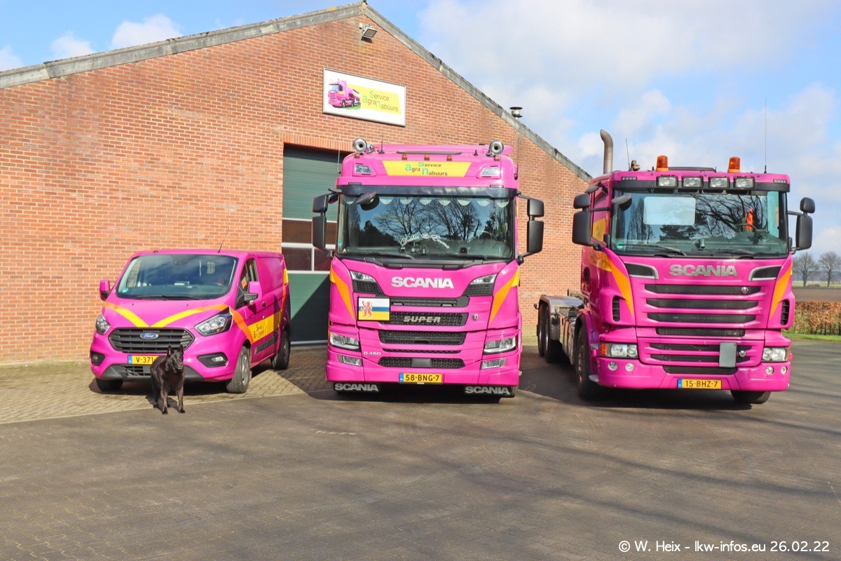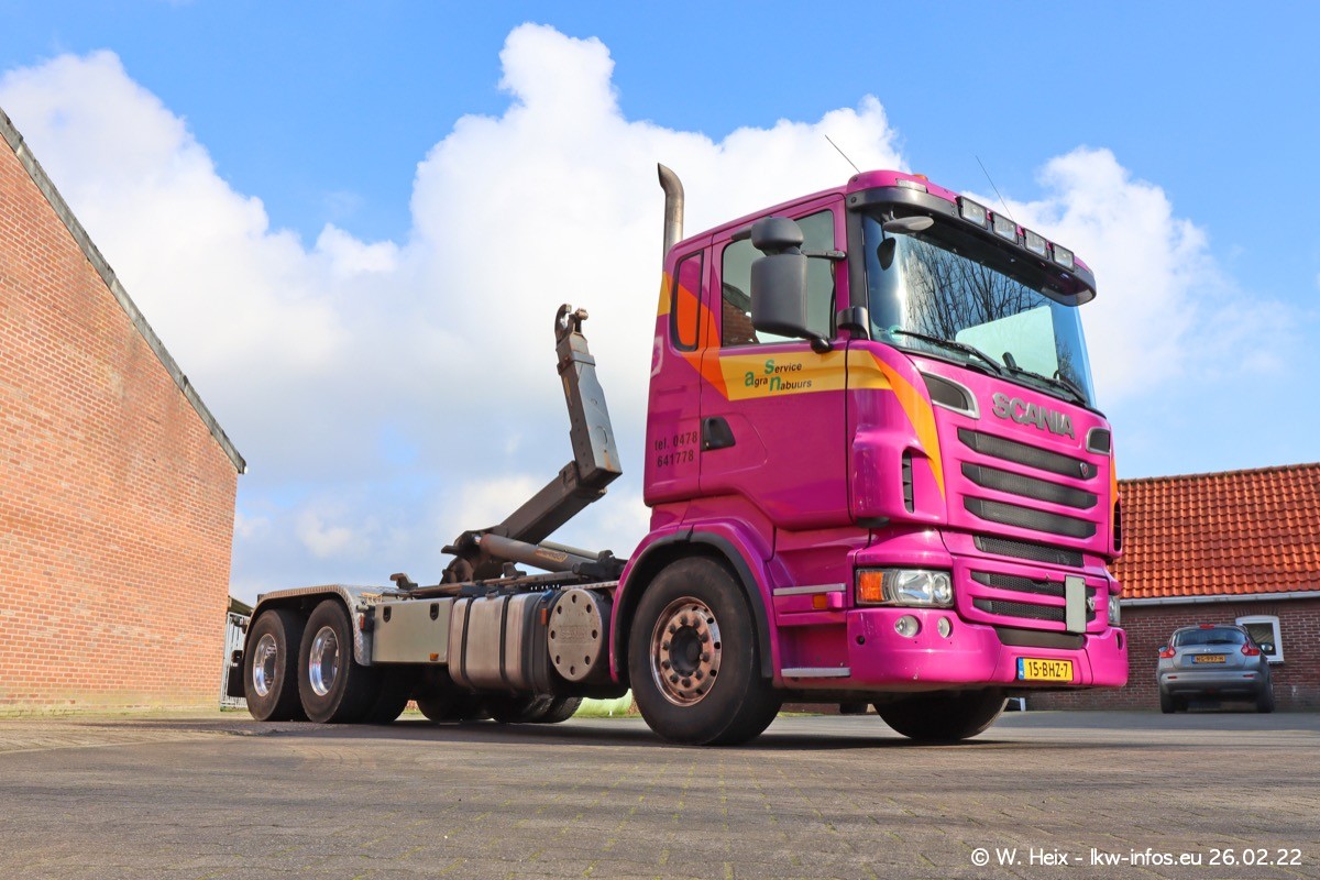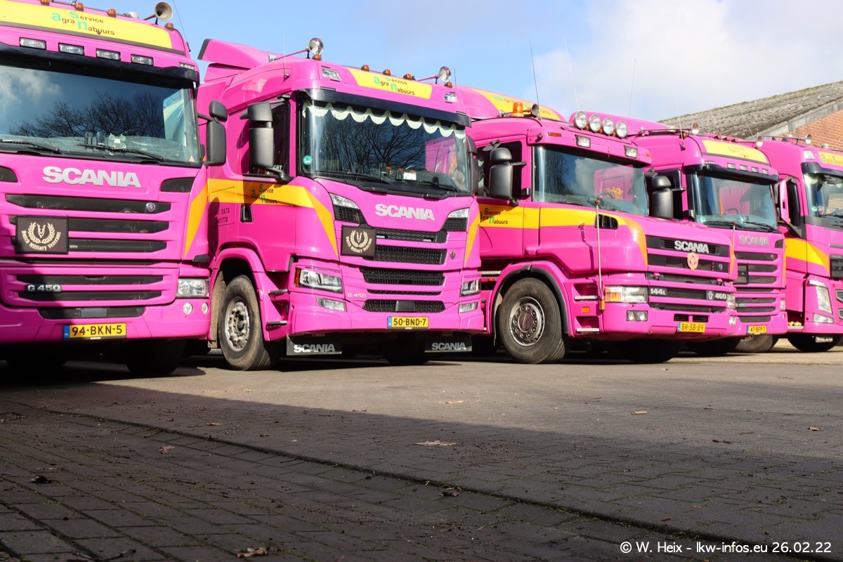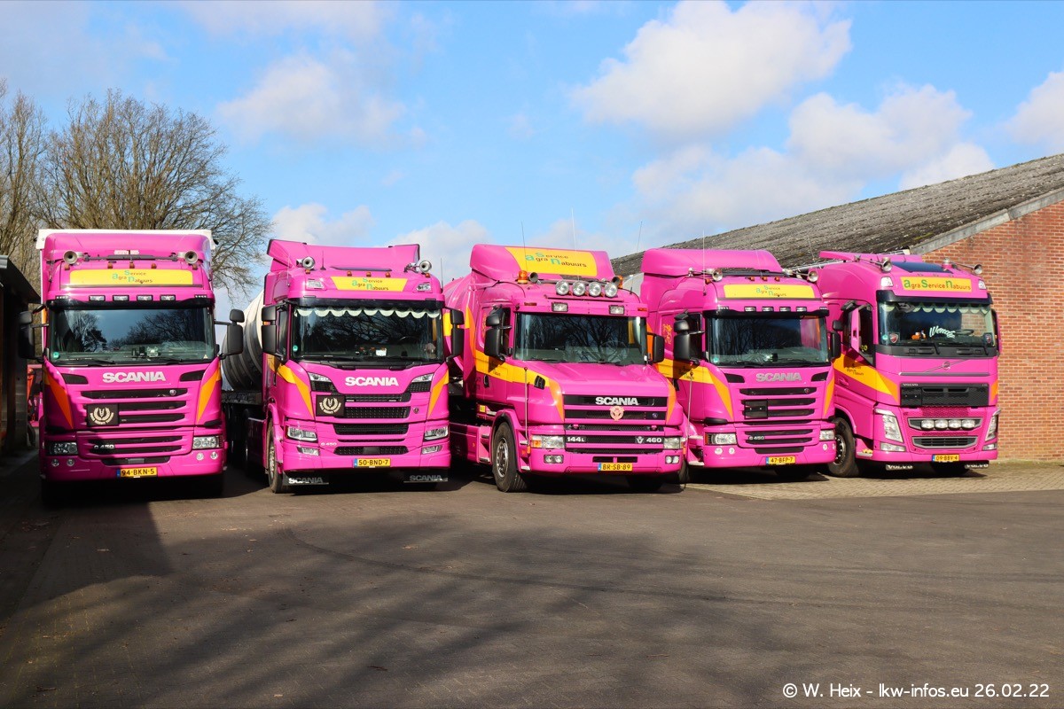 Mein erster Besuch bei der Firma Agra Service Nabuurs in Overloon (in der Nähe von Boxmeer gelegen) begann direkt mit einem schönen Fotoshooting, mit dem ich so nicht gerechnet bzw,. das ich so nicht geplant hatte. Aber gerade so macht das Hobby Spaß! Alle sieben LKW standen frisch gewaschen nebeneinander auf dem Hof. Sechs davon sind im täglichen Einsatz. Der SCANIA T 144 L 460 V8 Hauber wird nur noch als Ersatz und für Hobbyzwecke verwendet und ist inzwischen schon 21 (!) Jahre alt. Das Wetter war fast perfekt, wobei es gegen Ende des Fotoshootings leider wieder grau wurde, der Nebel kam langsam zurück.