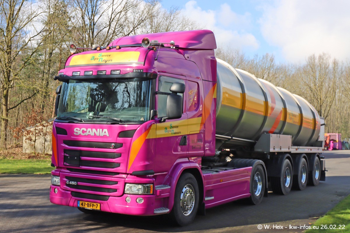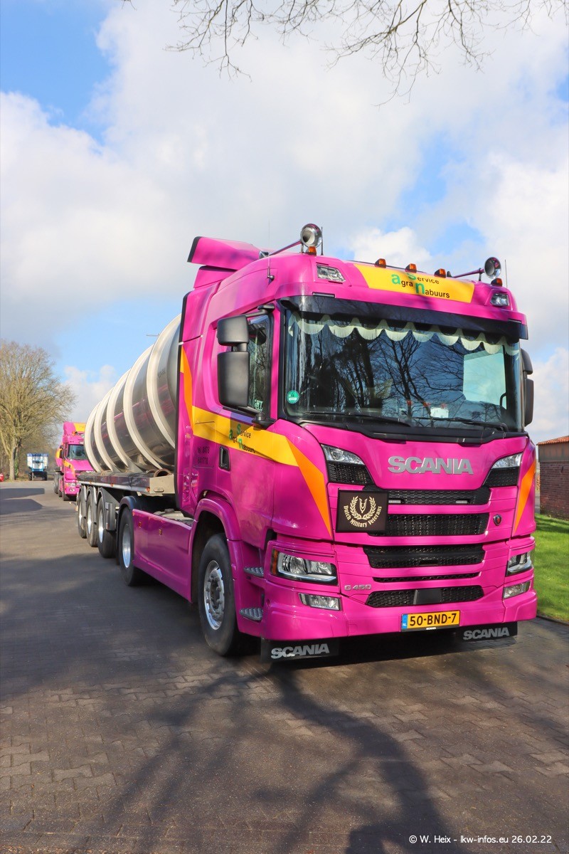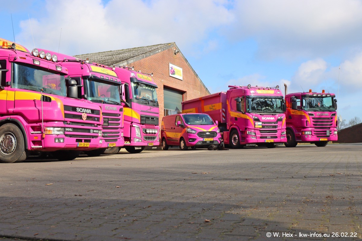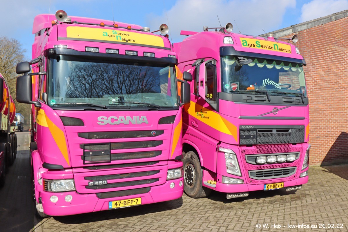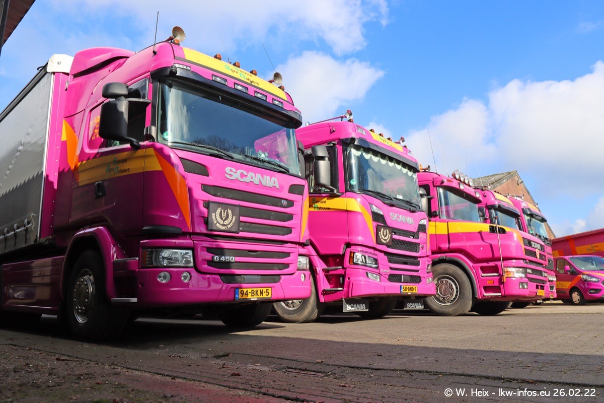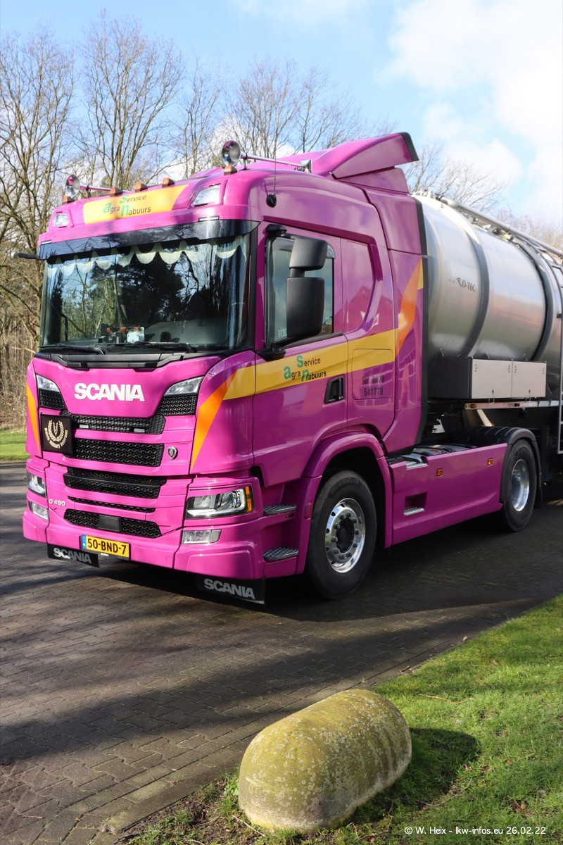 Mein erster Besuch bei der Firma Agra Service Nabuurs in Overloon (in der Nähe von Boxmeer gelegen) begann direkt mit einem schönen Fotoshooting, mit dem ich so nicht gerechnet bzw,. das ich so nicht geplant hatte. Aber gerade so macht das Hobby Spaß! Alle sieben LKW standen frisch gewaschen nebeneinander auf dem Hof. Sechs davon sind im täglichen Einsatz. Der SCANIA T 144 L 460 V8 Hauber wird nur noch als Ersatz und für Hobbyzwecke verwendet und ist inzwischen schon 21 (!) Jahre alt. Das Wetter war fast perfekt, wobei es gegen Ende des Fotoshootings leider wieder grau wurde, der Nebel kam langsam zurück.