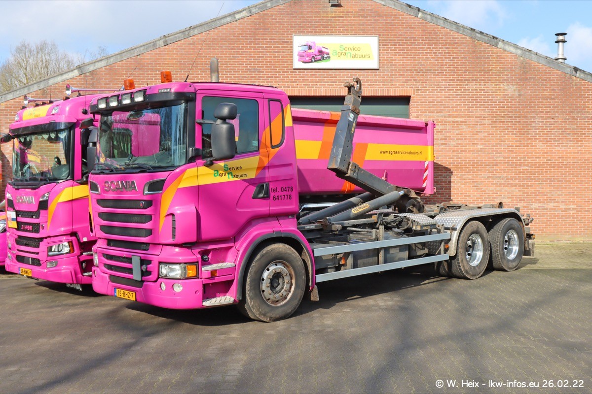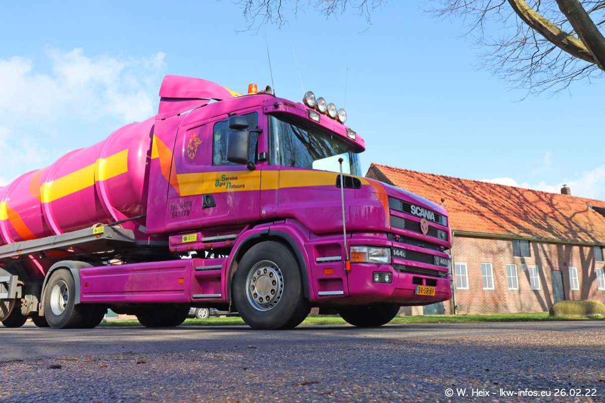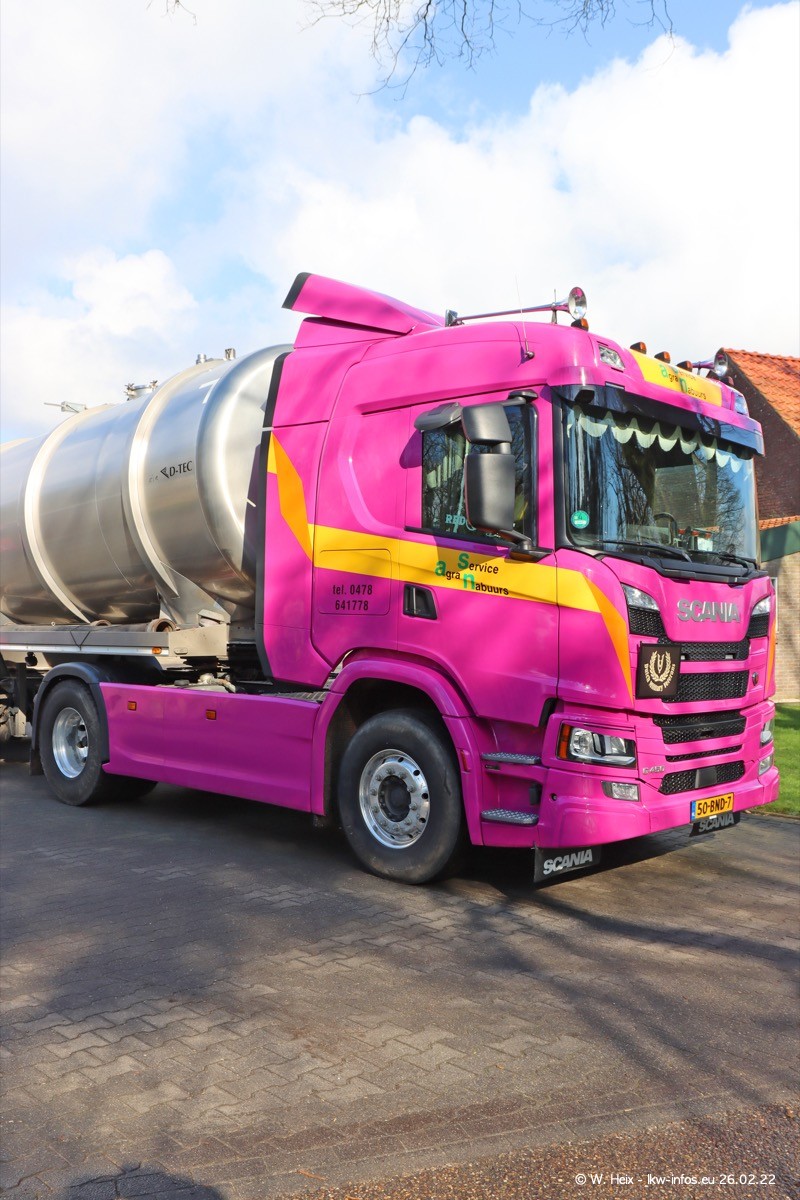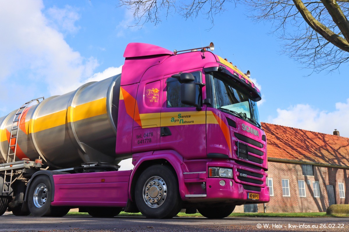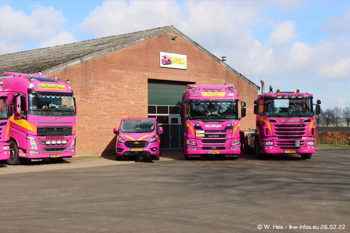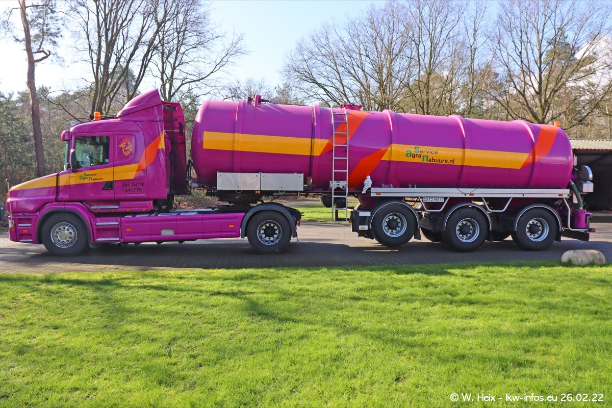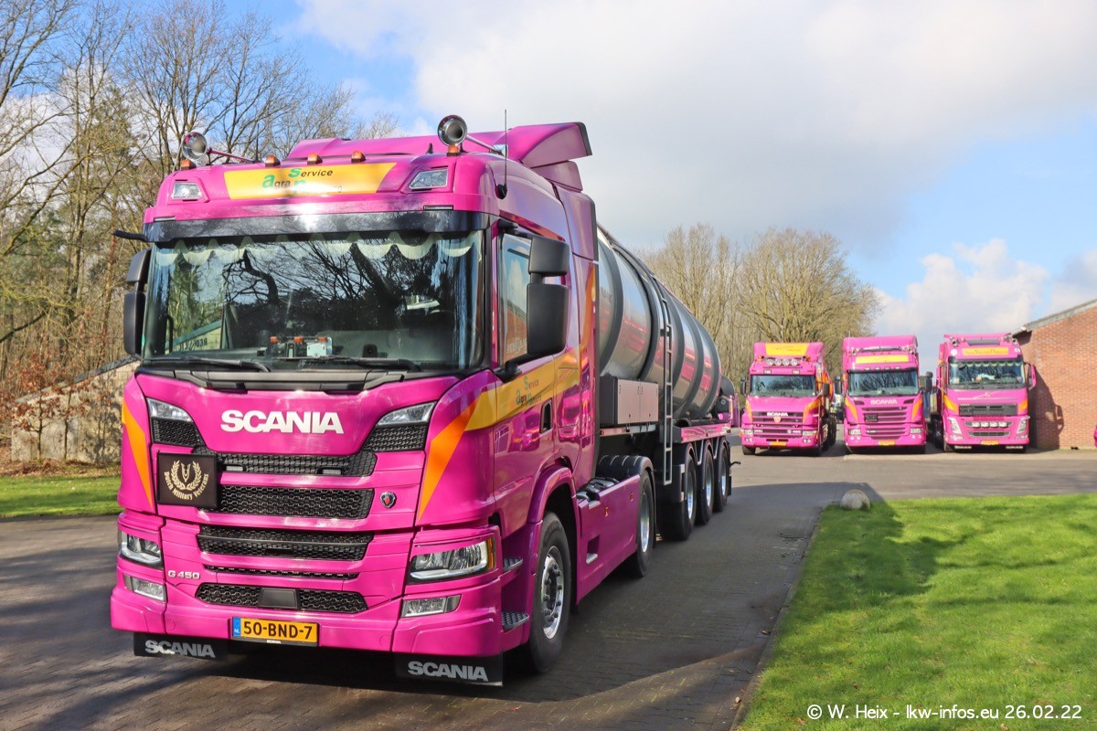 Mein erster Besuch bei der Firma Agra Service Nabuurs in Overloon (in der Nähe von Boxmeer gelegen) begann direkt mit einem schönen Fotoshooting, mit dem ich so nicht gerechnet bzw,. das ich so nicht geplant hatte. Aber gerade so macht das Hobby Spaß! Alle sieben LKW standen frisch gewaschen nebeneinander auf dem Hof. Sechs davon sind im täglichen Einsatz. Der SCANIA T 144 L 460 V8 Hauber wird nur noch als Ersatz und für Hobbyzwecke verwendet und ist inzwischen schon 21 (!) Jahre alt. Das Wetter war fast perfekt, wobei es gegen Ende des Fotoshootings leider wieder grau wurde, der Nebel kam langsam zurück.