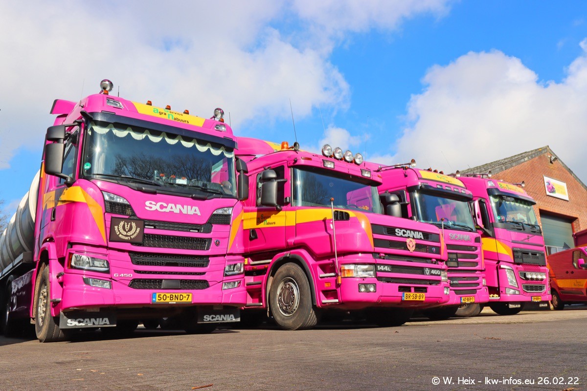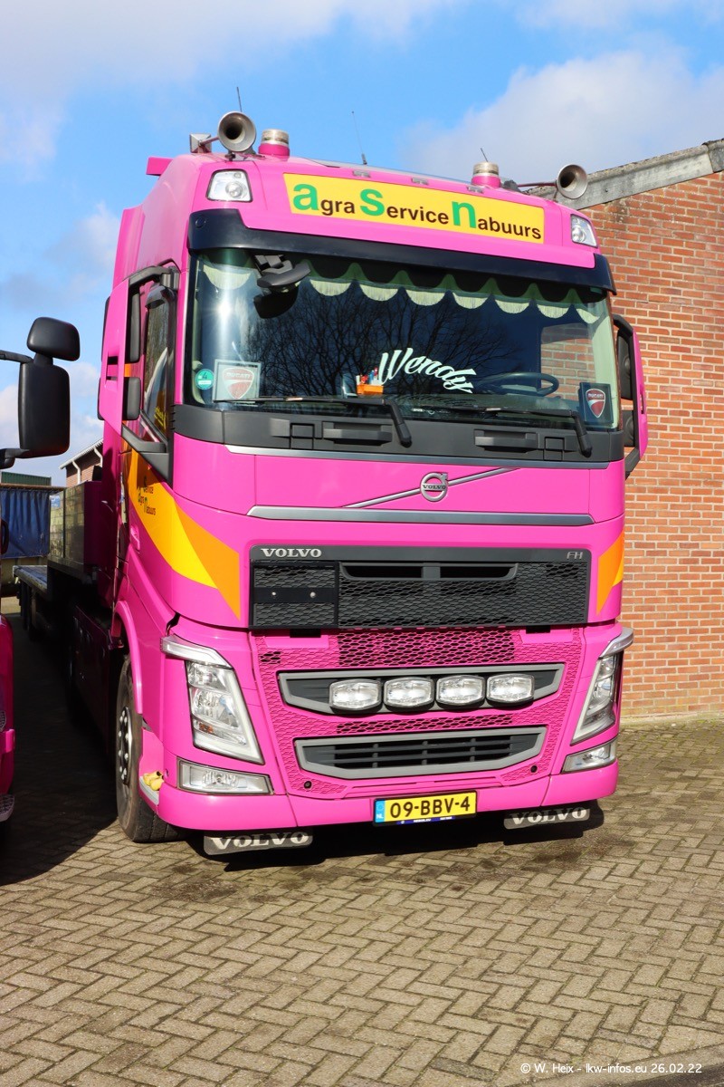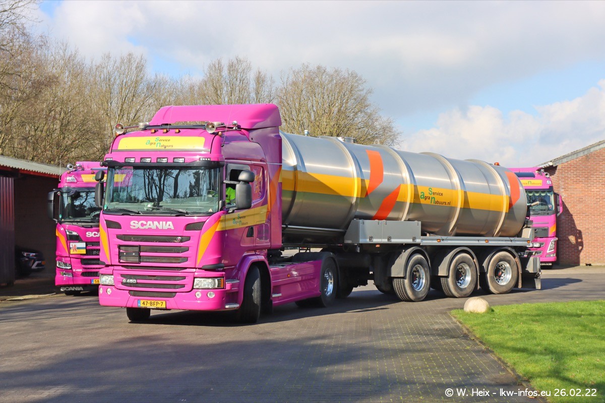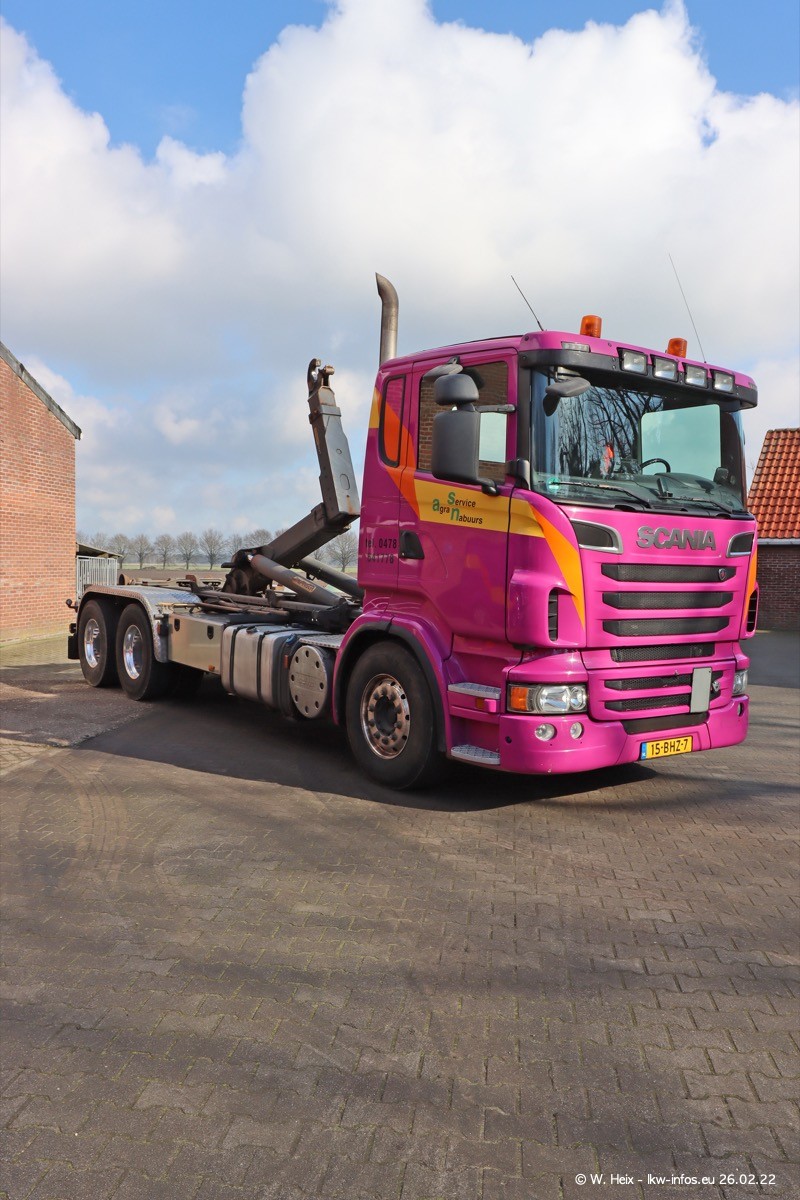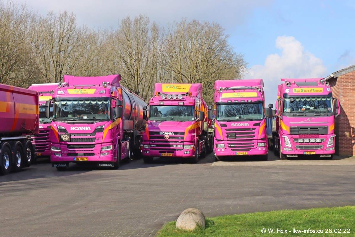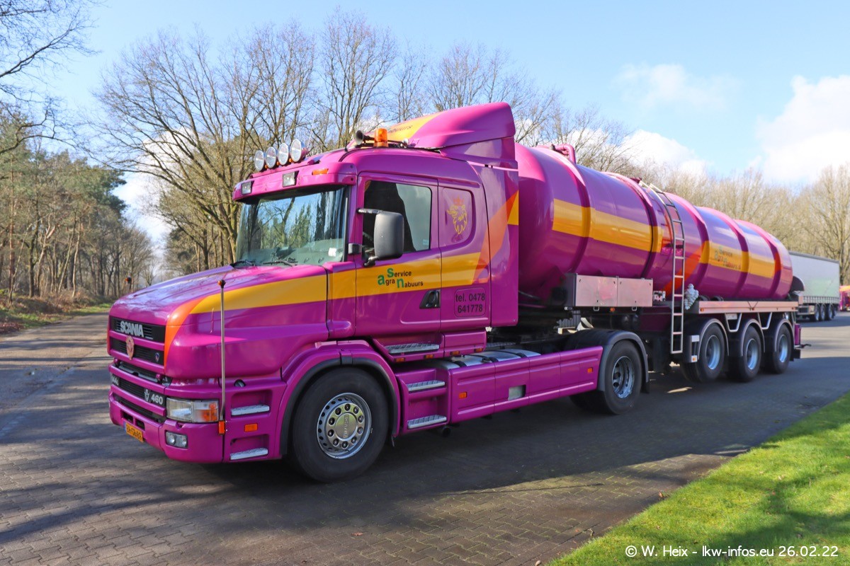 Mein erster Besuch bei der Firma Agra Service Nabuurs in Overloon (in der Nähe von Boxmeer gelegen) begann direkt mit einem schönen Fotoshooting, mit dem ich so nicht gerechnet bzw,. das ich so nicht geplant hatte. Aber gerade so macht das Hobby Spaß! Alle sieben LKW standen frisch gewaschen nebeneinander auf dem Hof. Sechs davon sind im täglichen Einsatz. Der SCANIA T 144 L 460 V8 Hauber wird nur noch als Ersatz und für Hobbyzwecke verwendet und ist inzwischen schon 21 (!) Jahre alt. Das Wetter war fast perfekt, wobei es gegen Ende des Fotoshootings leider wieder grau wurde, der Nebel kam langsam zurück.