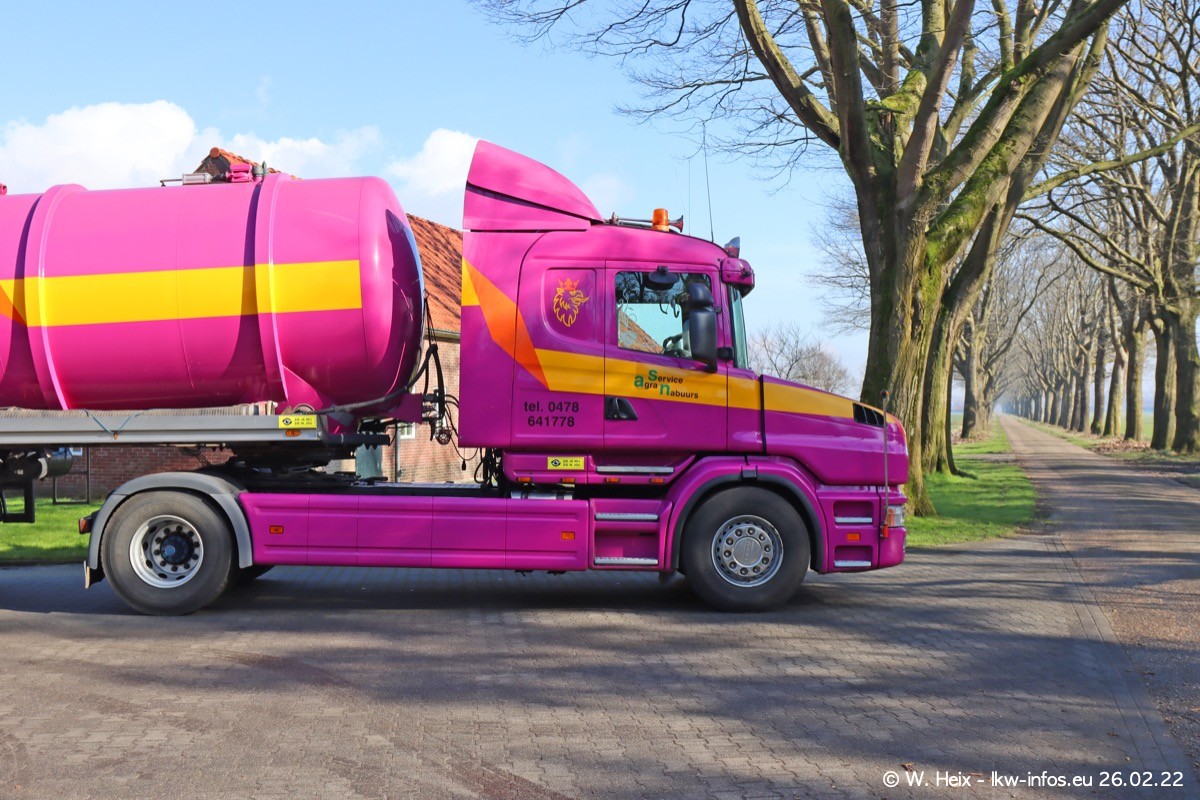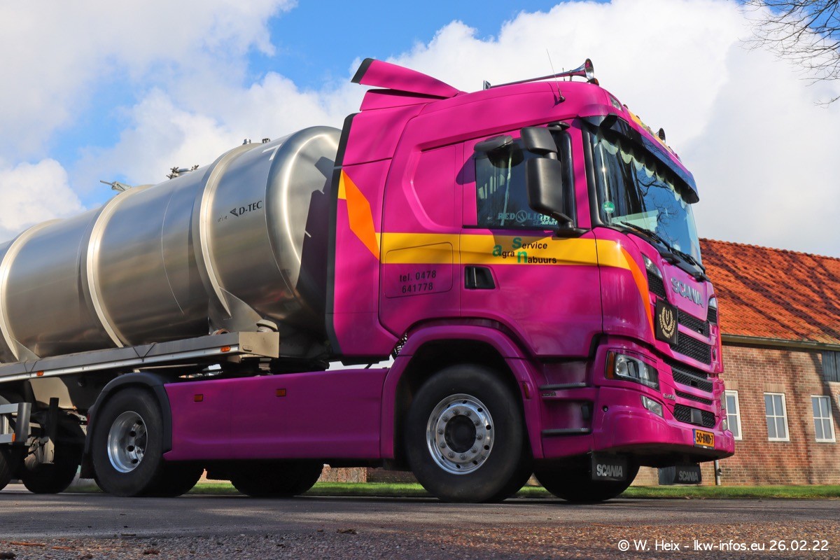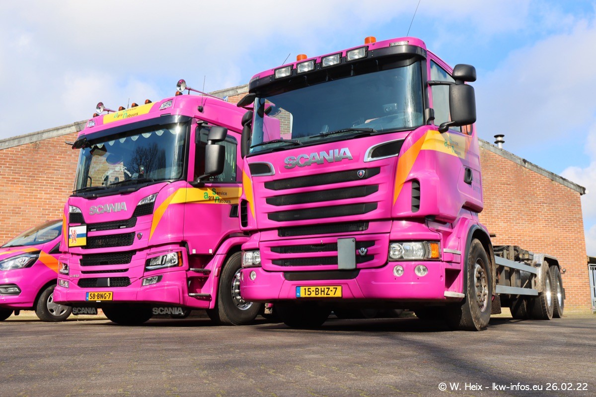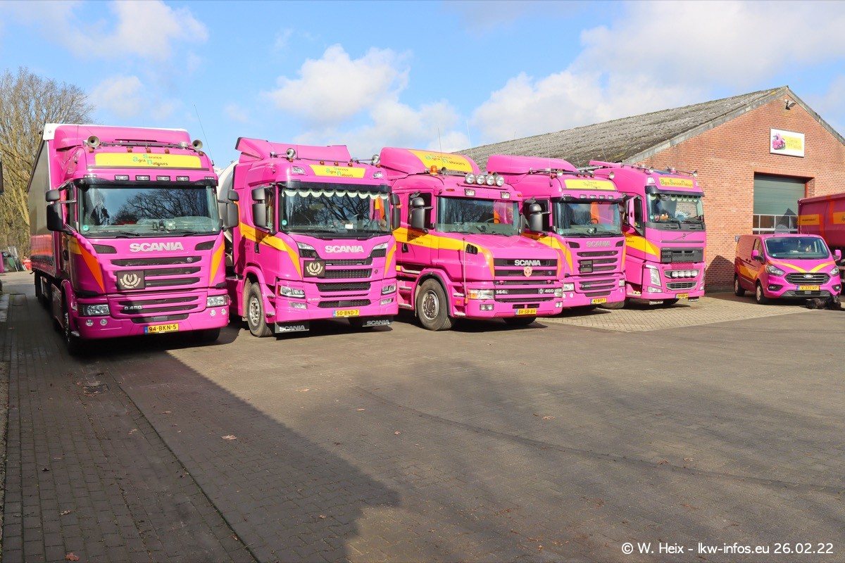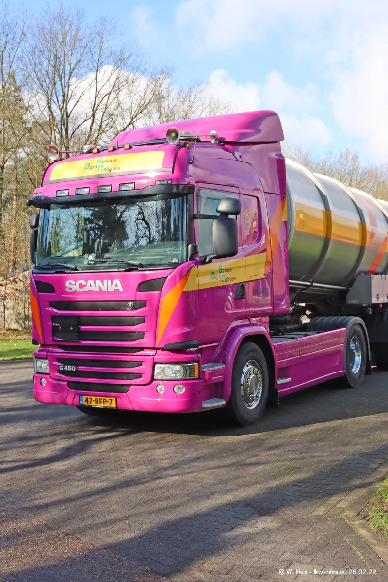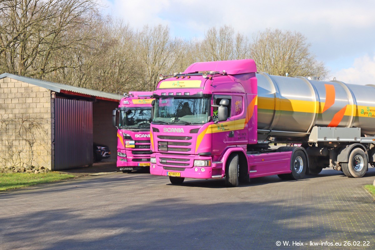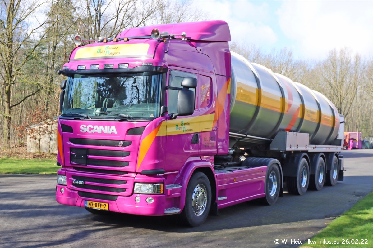Mein erster Besuch bei der Firma Agra Service Nabuurs in Overloon (in der Nähe von Boxmeer gelegen) begann direkt mit einem schönen Fotoshooting, mit dem ich so nicht gerechnet bzw,. das ich so nicht geplant hatte. Aber gerade so macht das Hobby Spaß! Alle sieben LKW standen frisch gewaschen nebeneinander auf dem Hof. Sechs davon sind im täglichen Einsatz. Der SCANIA T 144 L 460 V8 Hauber wird nur noch als Ersatz und für Hobbyzwecke verwendet und ist inzwischen schon 21 (!) Jahre alt. Das Wetter war fast perfekt, wobei es gegen Ende des Fotoshootings leider wieder grau wurde, der Nebel kam langsam zurück.