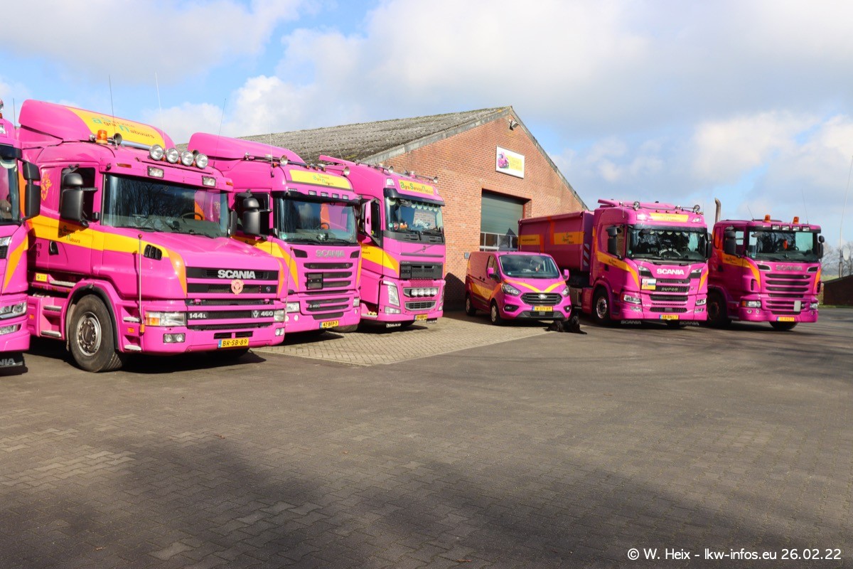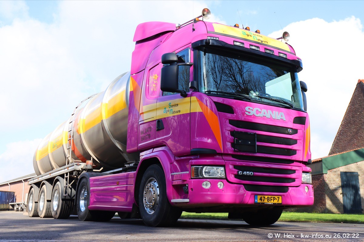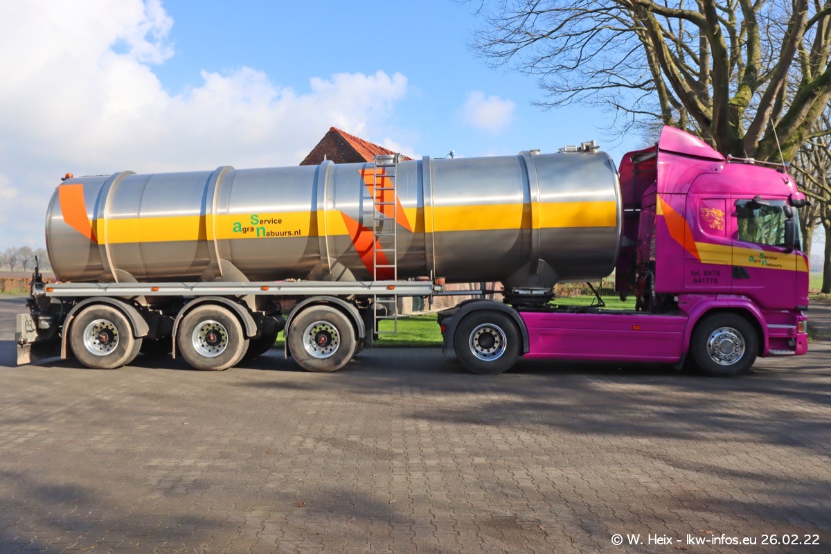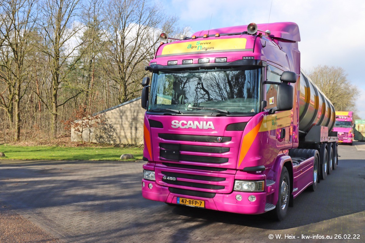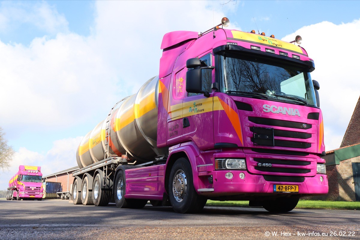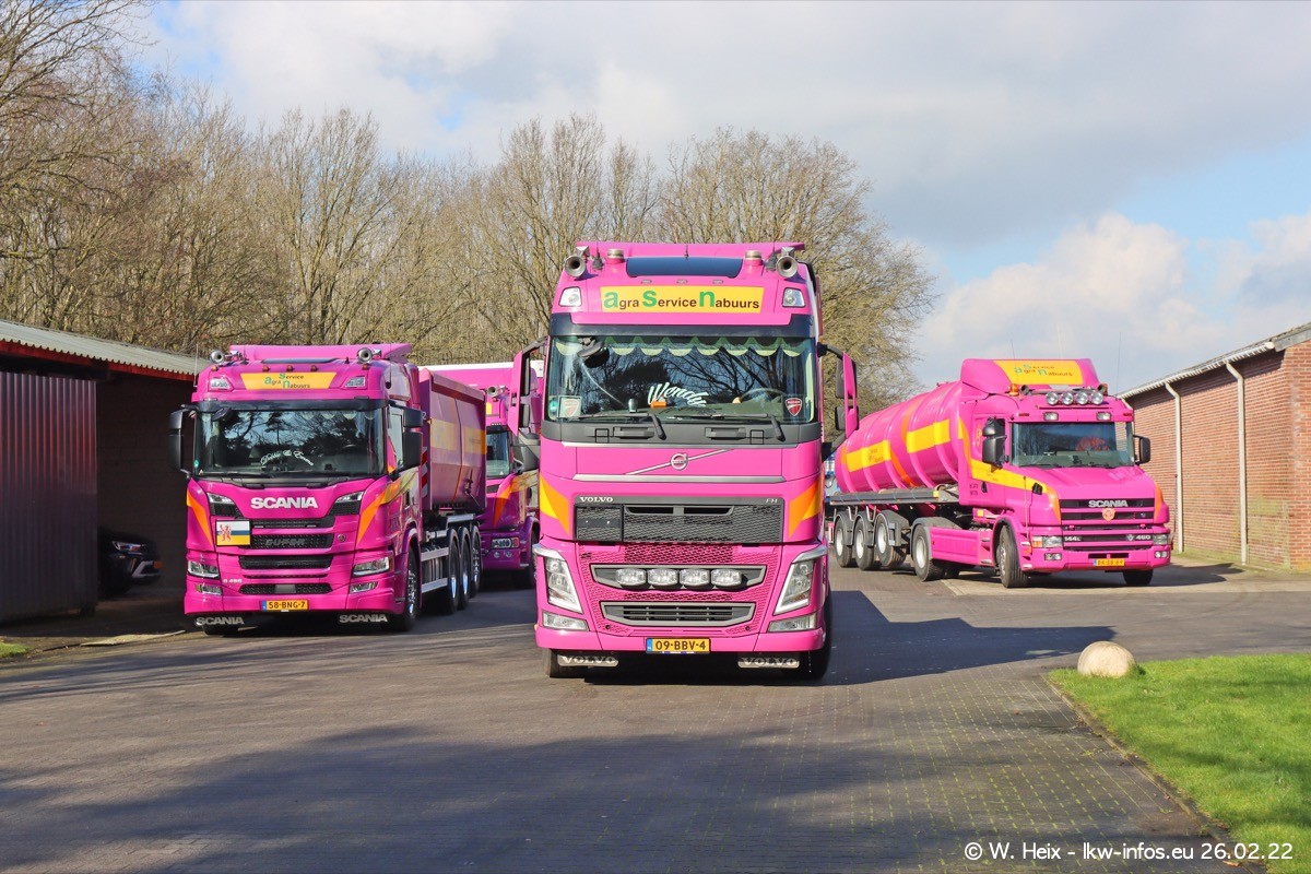 Mein erster Besuch bei der Firma Agra Service Nabuurs in Overloon (in der Nähe von Boxmeer gelegen) begann direkt mit einem schönen Fotoshooting, mit dem ich so nicht gerechnet bzw,. das ich so nicht geplant hatte. Aber gerade so macht das Hobby Spaß! Alle sieben LKW standen frisch gewaschen nebeneinander auf dem Hof. Sechs davon sind im täglichen Einsatz. Der SCANIA T 144 L 460 V8 Hauber wird nur noch als Ersatz und für Hobbyzwecke verwendet und ist inzwischen schon 21 (!) Jahre alt. Das Wetter war fast perfekt, wobei es gegen Ende des Fotoshootings leider wieder grau wurde, der Nebel kam langsam zurück.