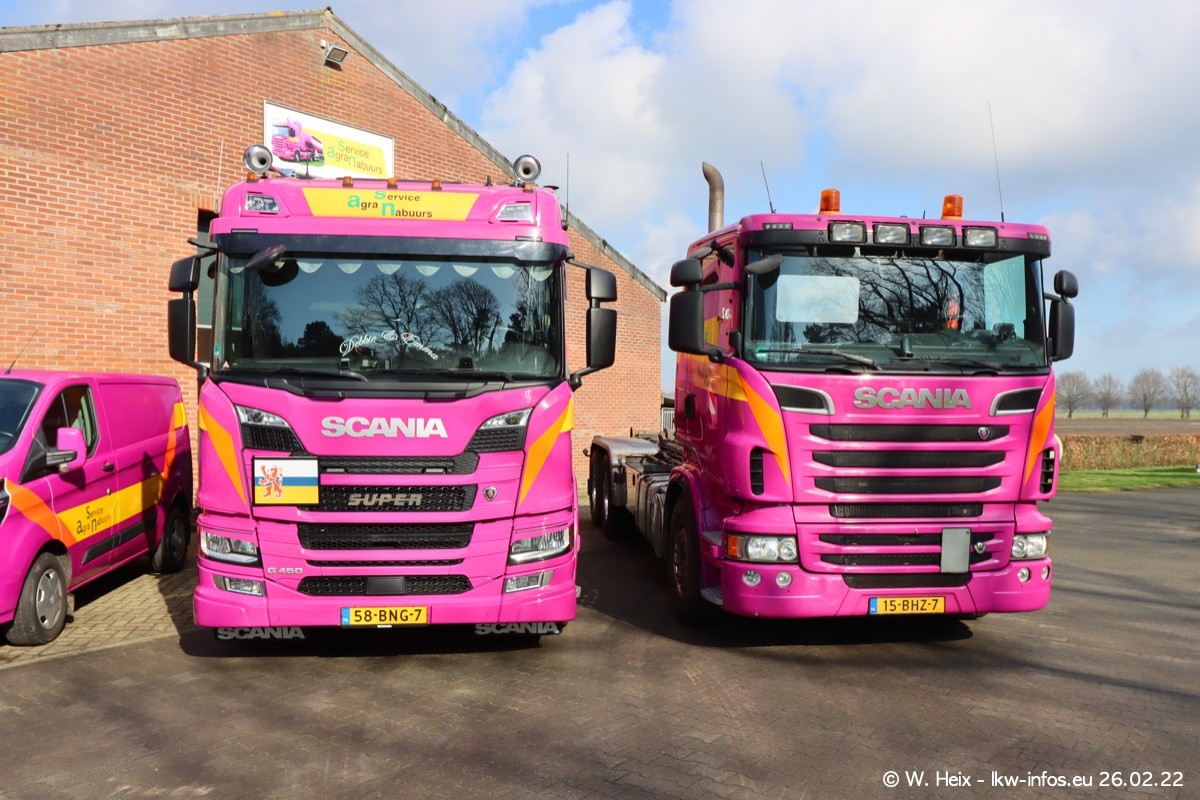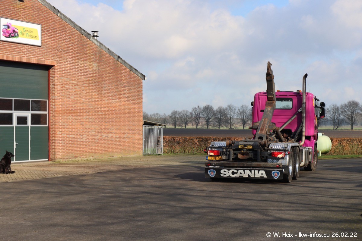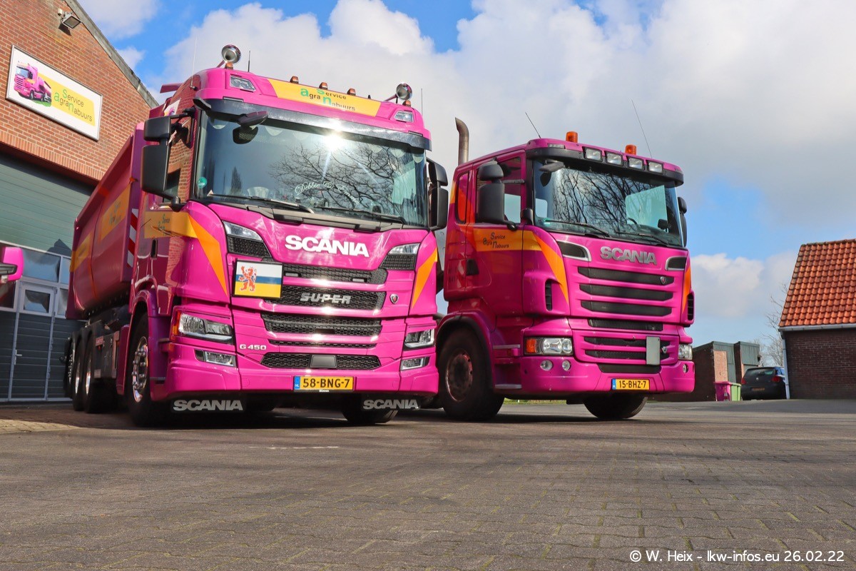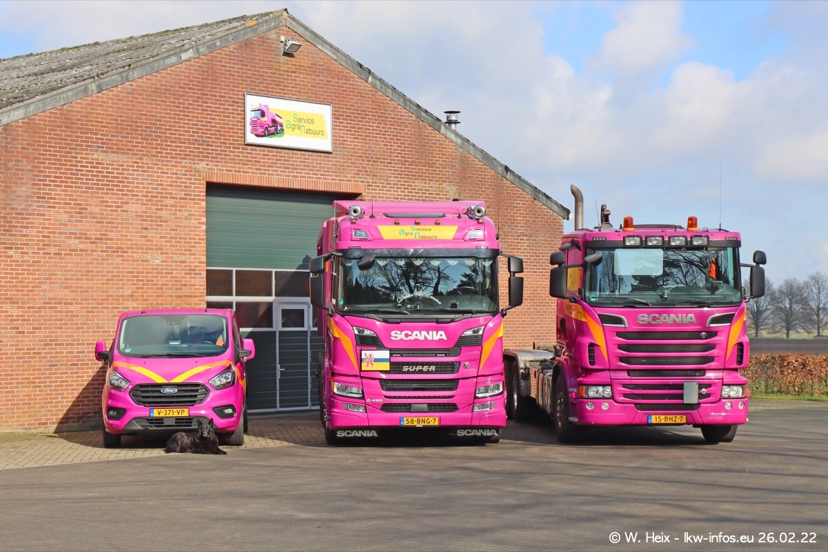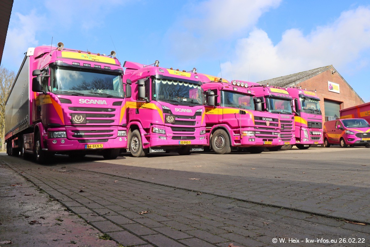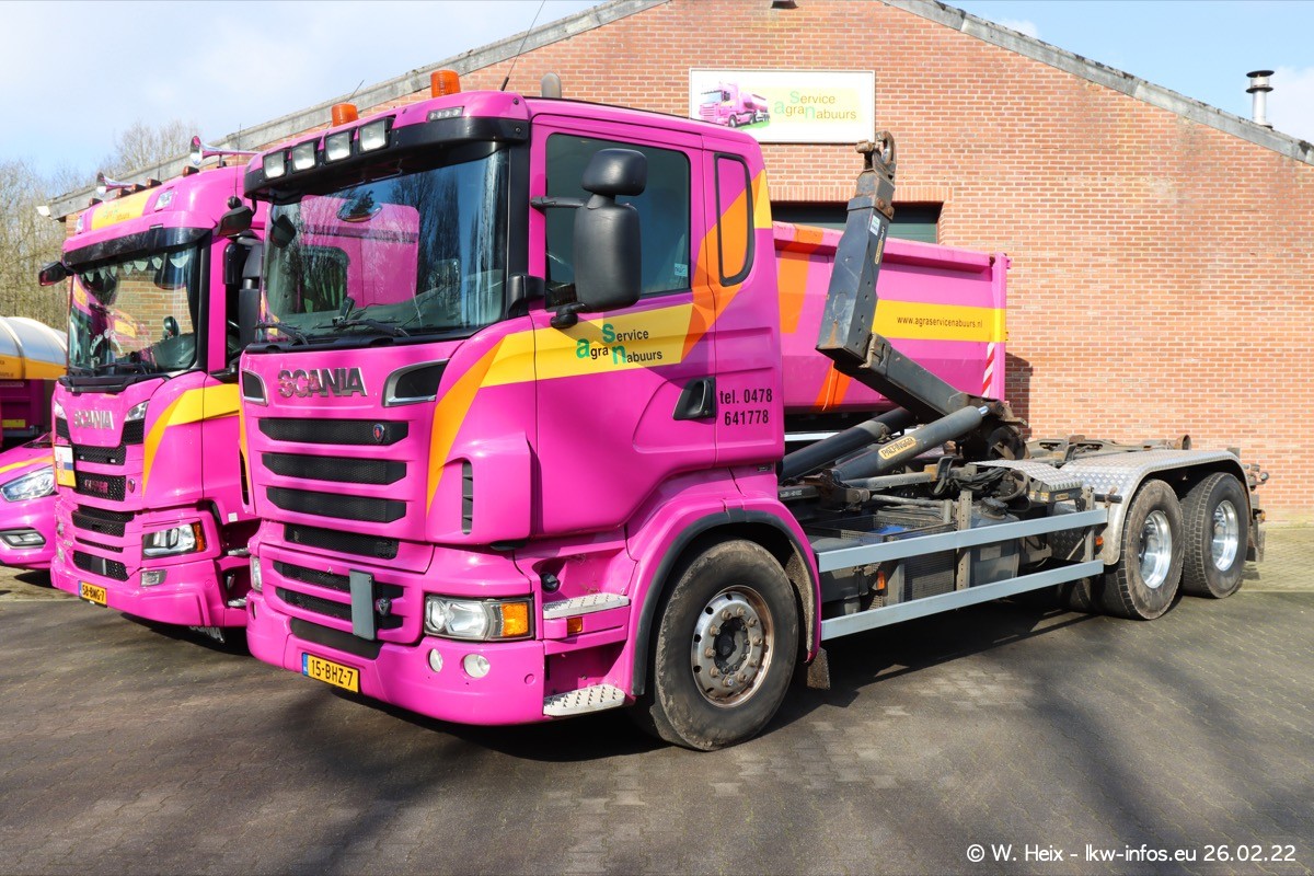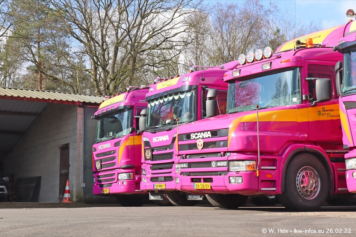 Mein erster Besuch bei der Firma Agra Service Nabuurs in Overloon (in der Nähe von Boxmeer gelegen) begann direkt mit einem schönen Fotoshooting, mit dem ich so nicht gerechnet bzw,. das ich so nicht geplant hatte. Aber gerade so macht das Hobby Spaß! Alle sieben LKW standen frisch gewaschen nebeneinander auf dem Hof. Sechs davon sind im täglichen Einsatz. Der SCANIA T 144 L 460 V8 Hauber wird nur noch als Ersatz und für Hobbyzwecke verwendet und ist inzwischen schon 21 (!) Jahre alt. Das Wetter war fast perfekt, wobei es gegen Ende des Fotoshootings leider wieder grau wurde, der Nebel kam langsam zurück.
