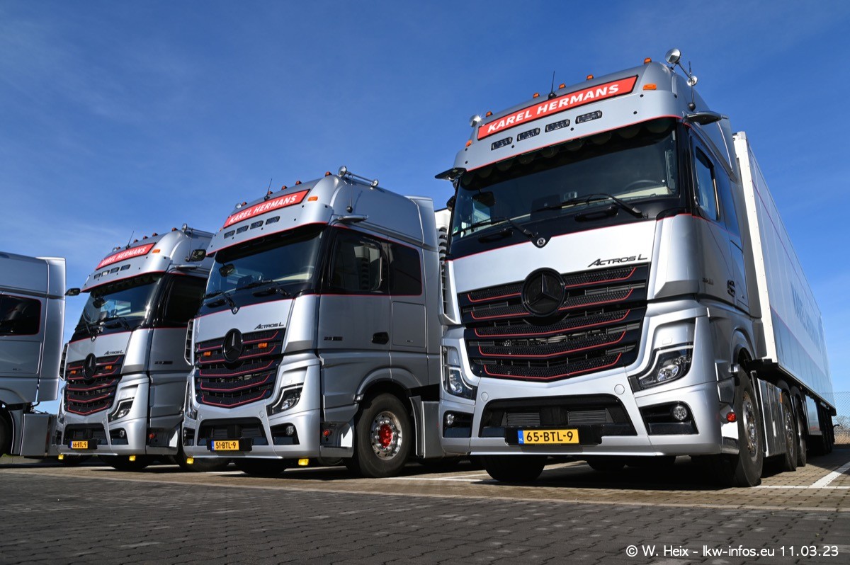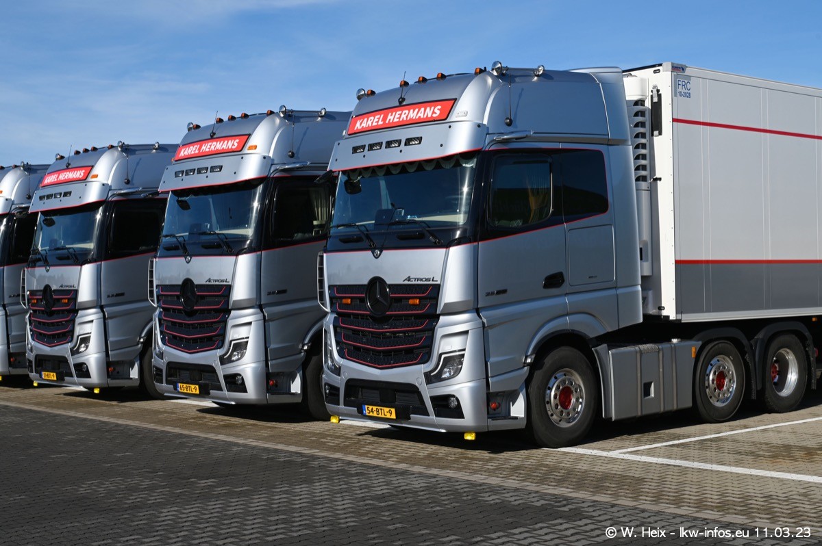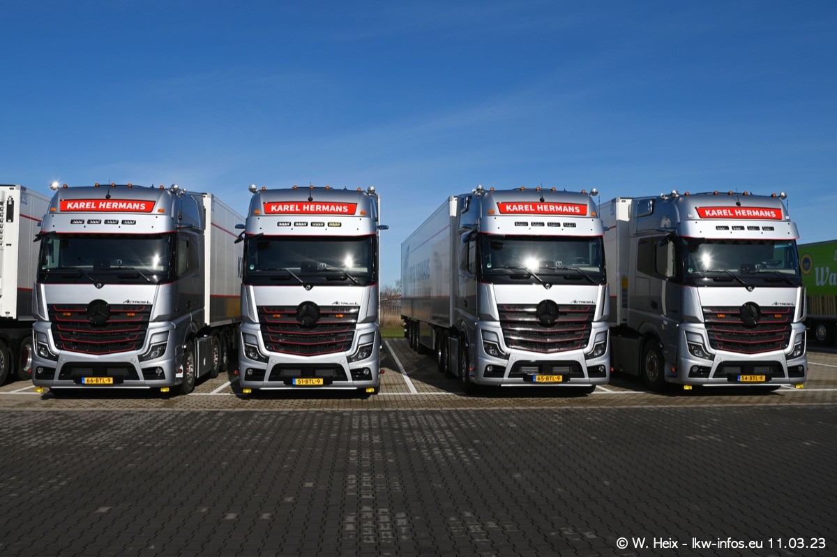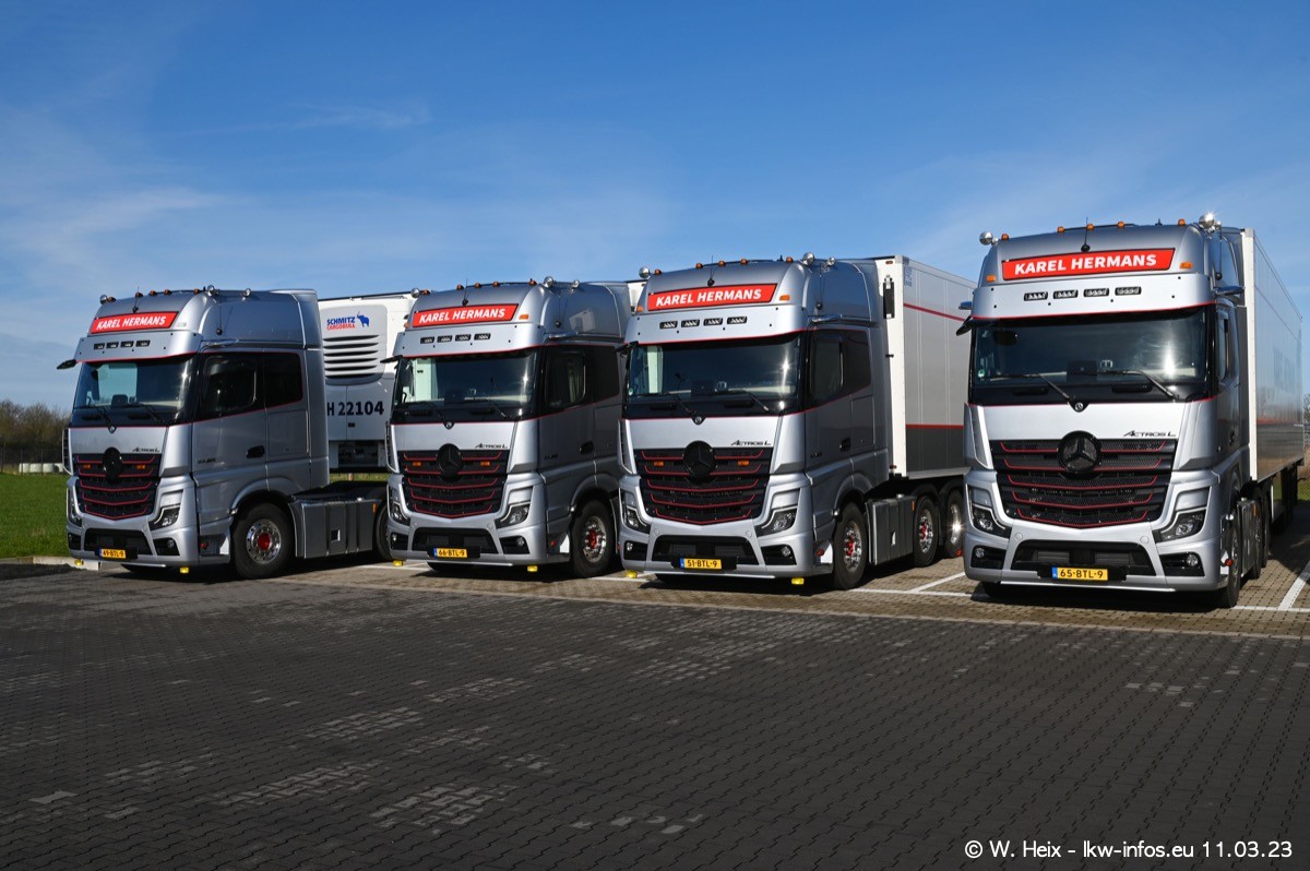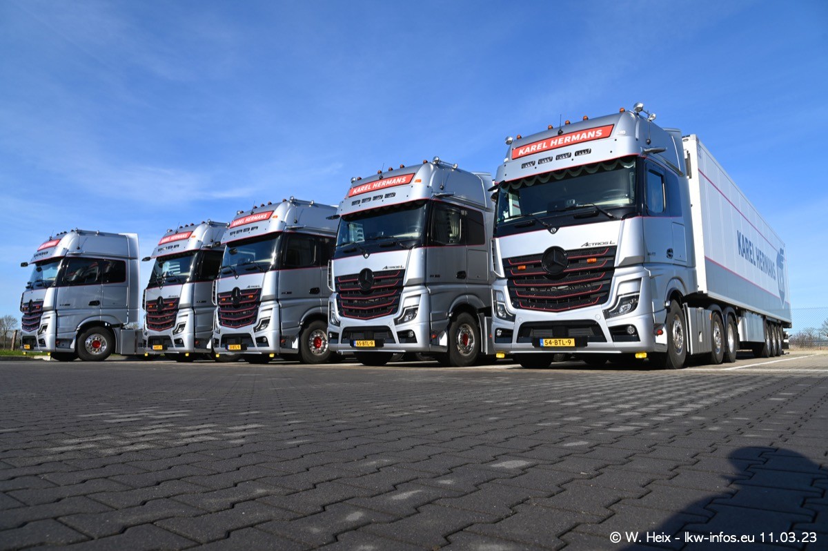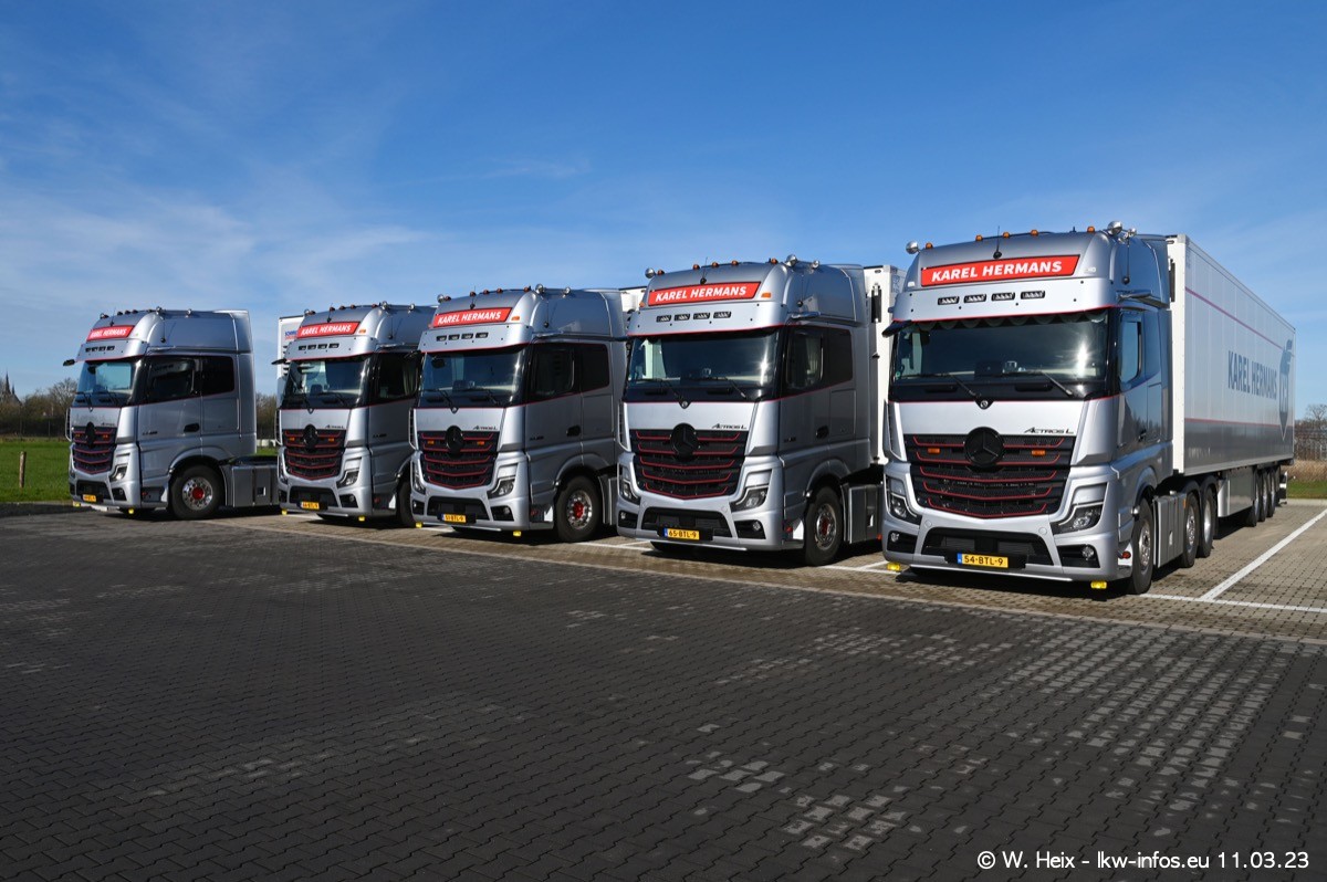 Karel Hermans ist eine neue Firma/Spedition, die in Venlo (NL) zuhause ist. Die lKW stehen allerdings bei der Spedition Klümpen in Straelen (D). Inzwischen gibt es sechs Mercedes-Benz Actros L, fünf davon konnte ich bei schönstem Wetter fotografieren. 🙂