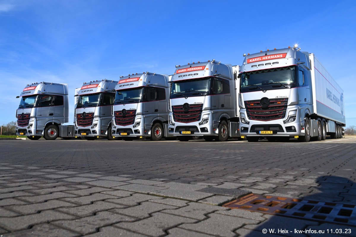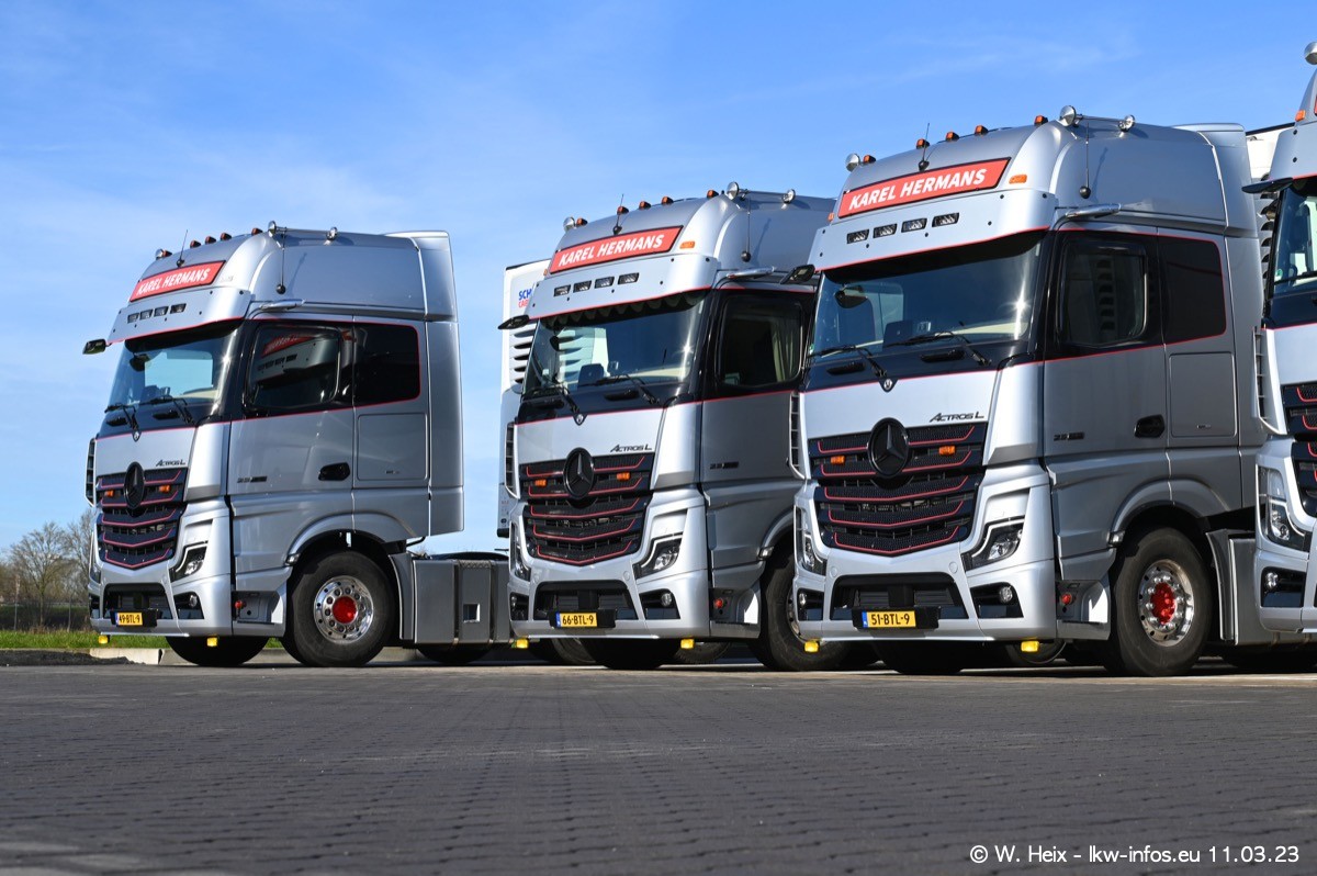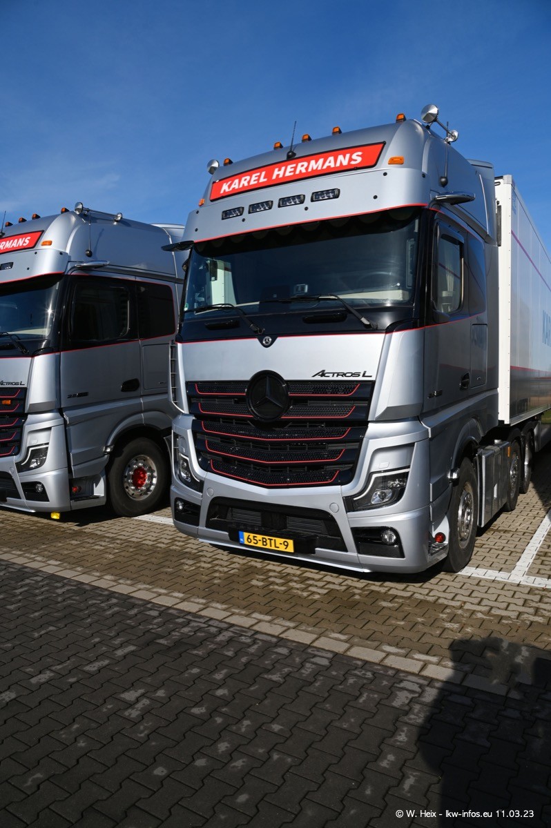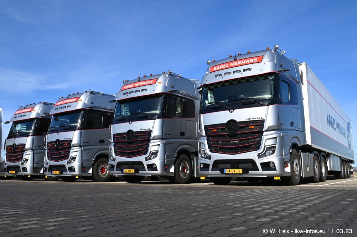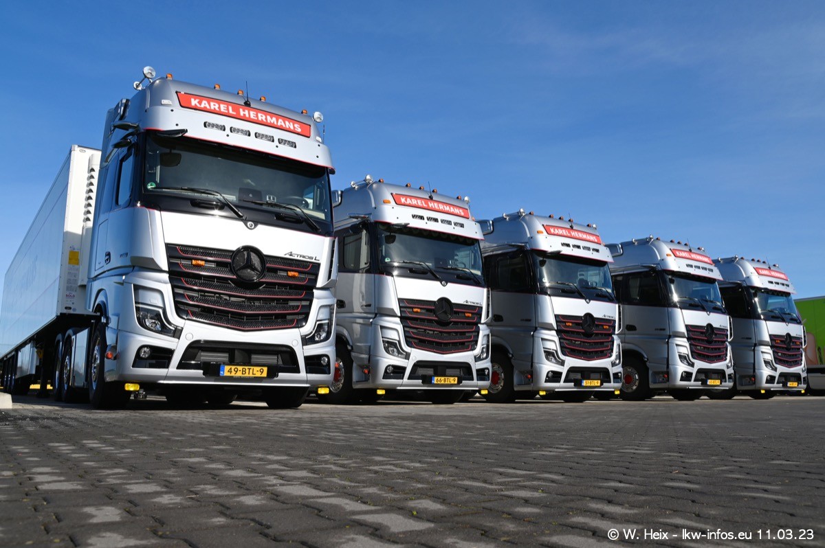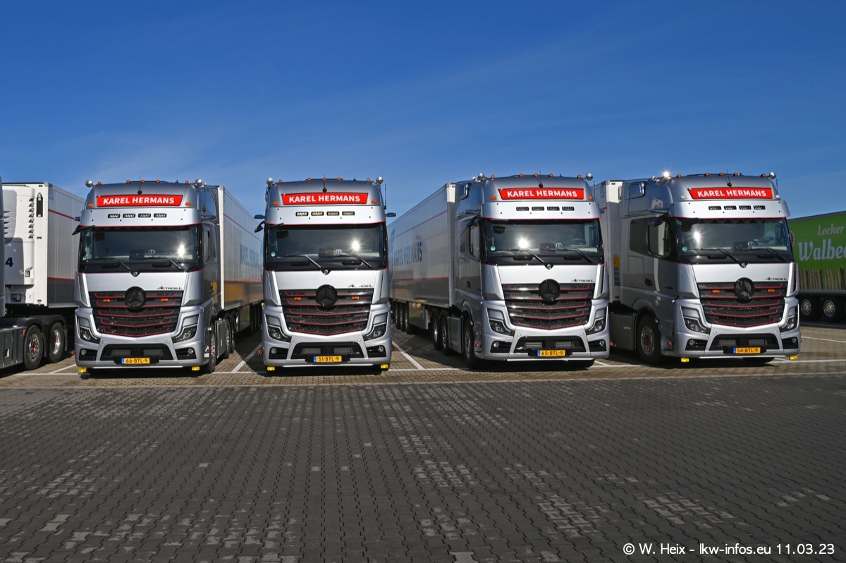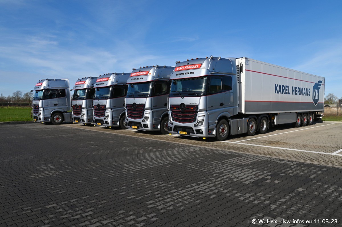 Karel Hermans ist eine neue Firma/Spedition, die in Venlo (NL) zuhause ist. Die lKW stehen allerdings bei der Spedition Klümpen in Straelen (D). Inzwischen gibt es sechs Mercedes-Benz Actros L, fünf davon konnte ich bei schönstem Wetter fotografieren. 🙂