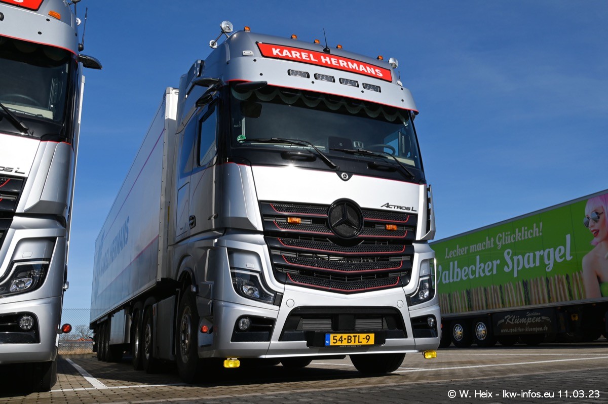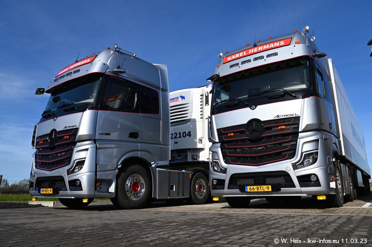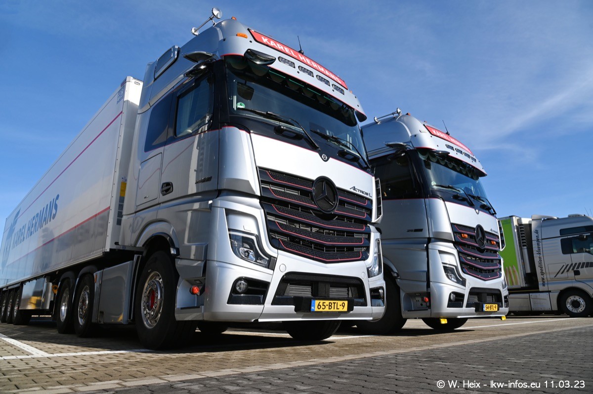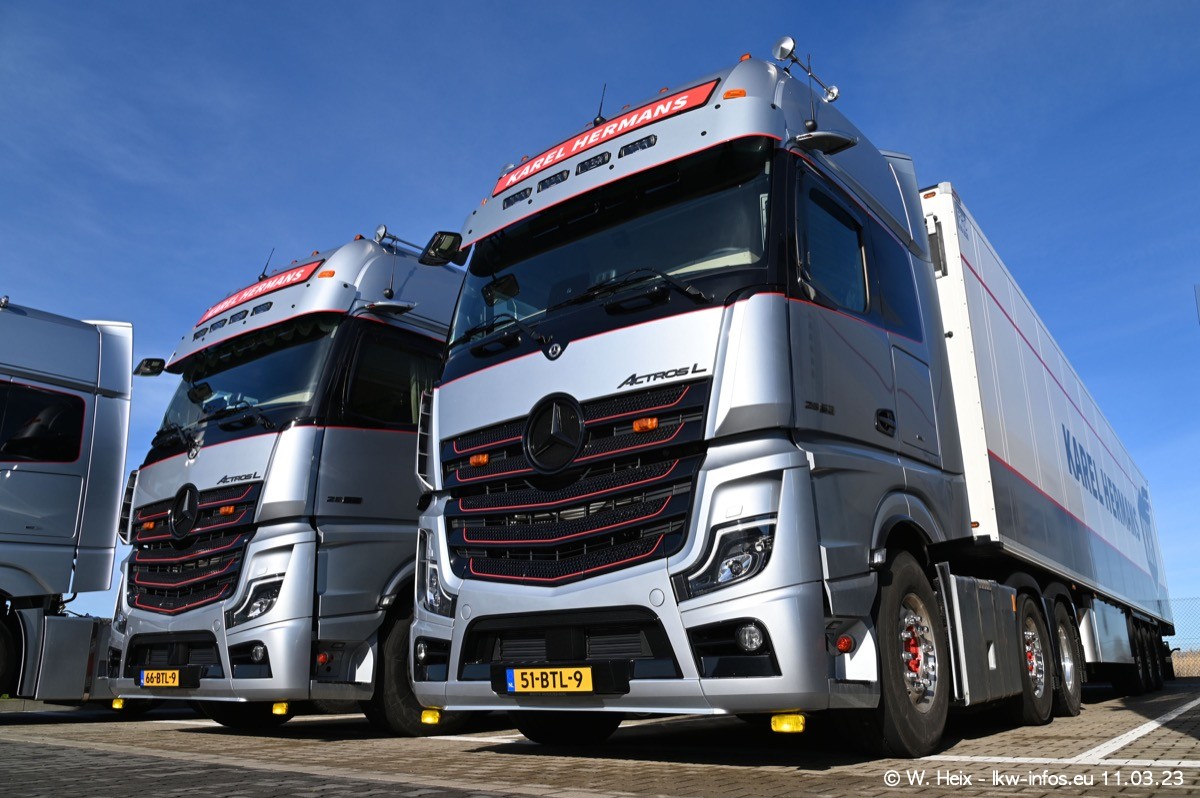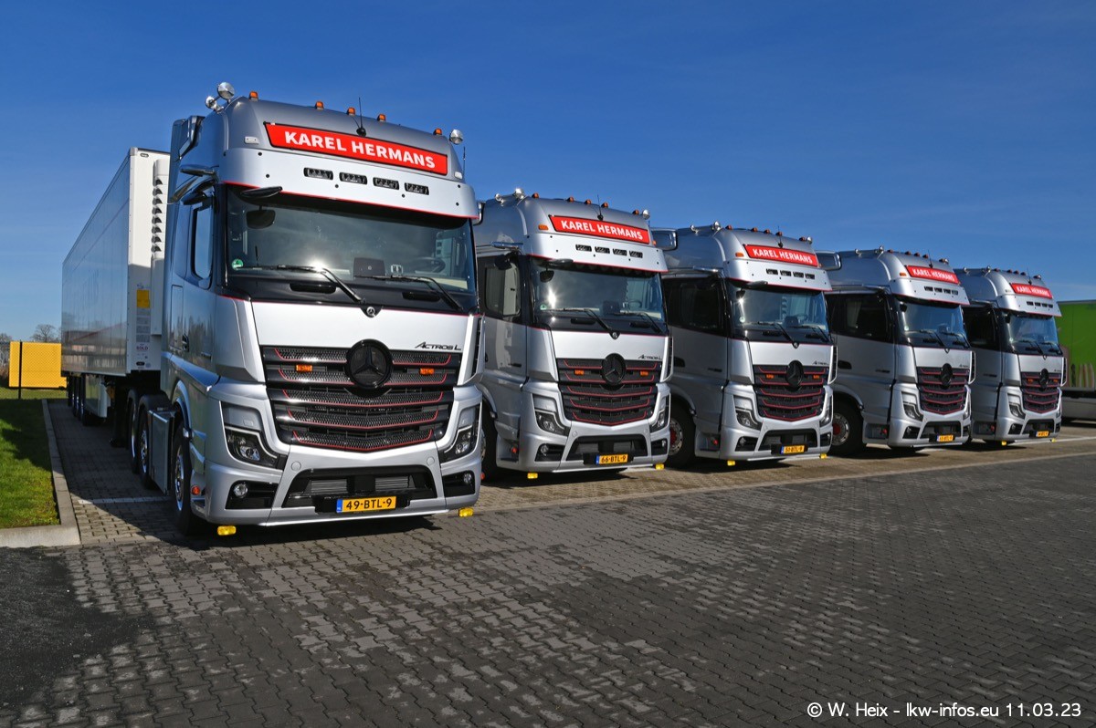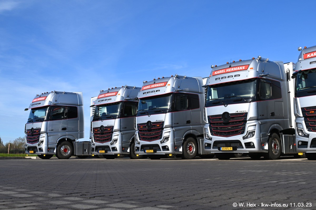 Karel Hermans ist eine neue Firma/Spedition, die in Venlo (NL) zuhause ist. Die lKW stehen allerdings bei der Spedition Klümpen in Straelen (D). Inzwischen gibt es sechs Mercedes-Benz Actros L, fünf davon konnte ich bei schönstem Wetter fotografieren. 🙂