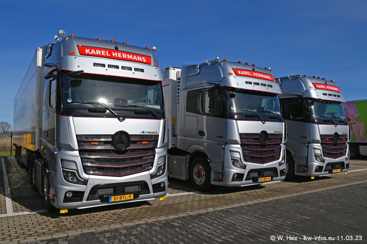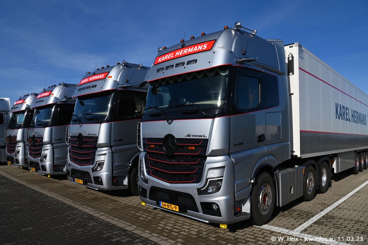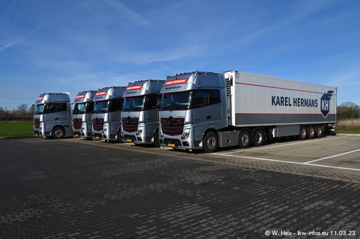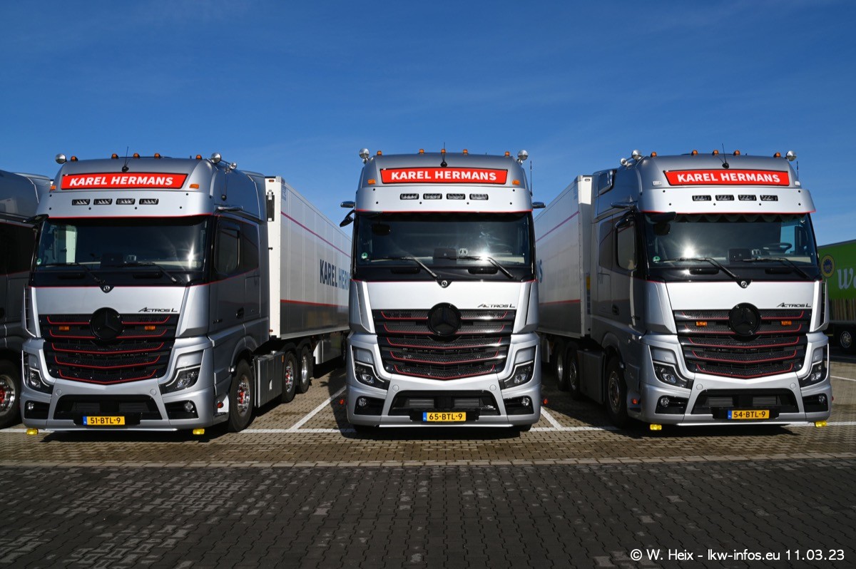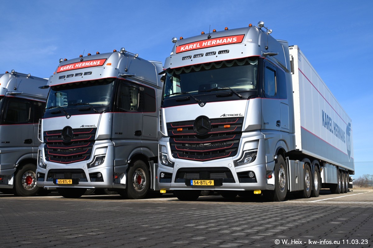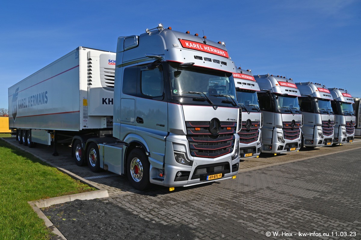 Karel Hermans ist eine neue Firma/Spedition, die in Venlo (NL) zuhause ist. Die lKW stehen allerdings bei der Spedition Klümpen in Straelen (D). Inzwischen gibt es sechs Mercedes-Benz Actros L, fünf davon konnte ich bei schönstem Wetter fotografieren. 🙂