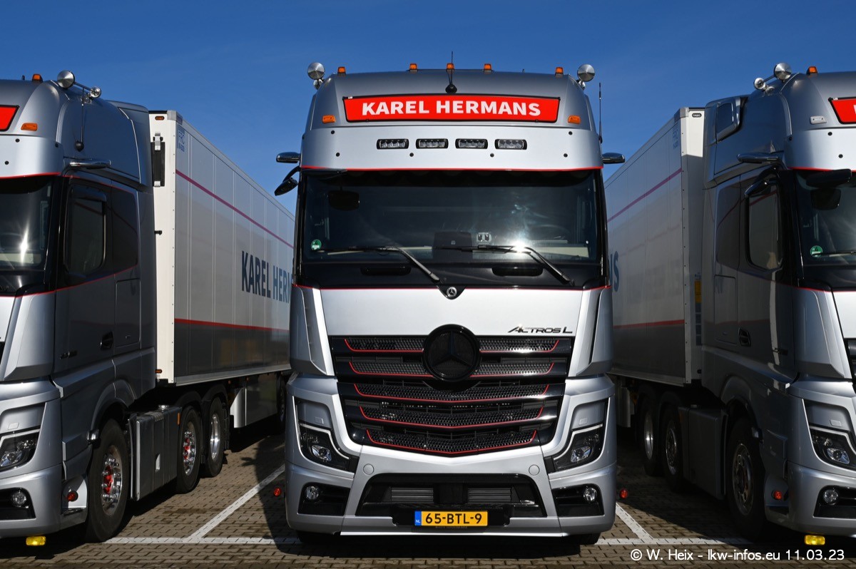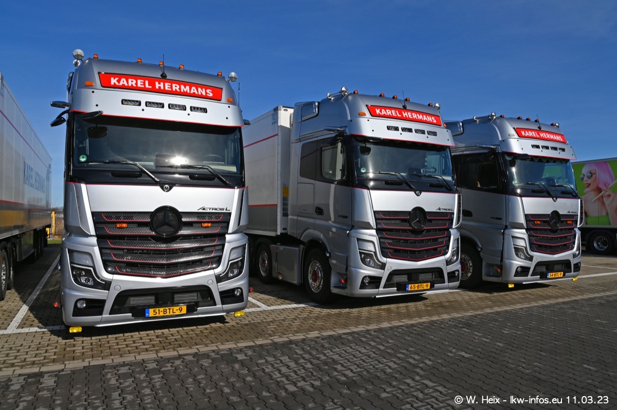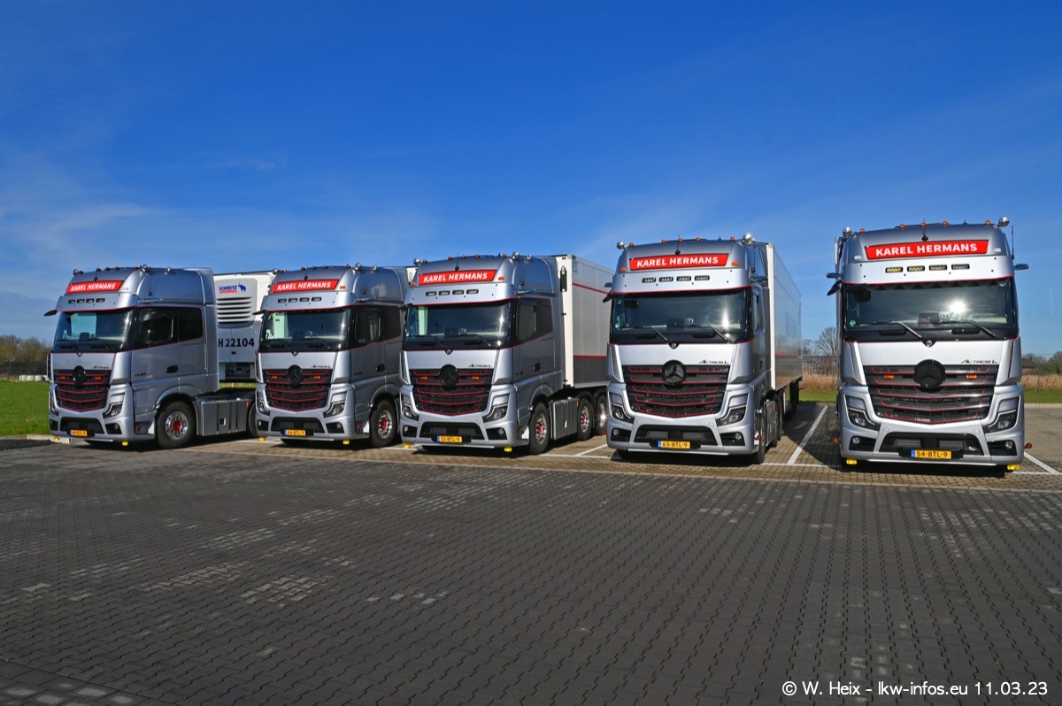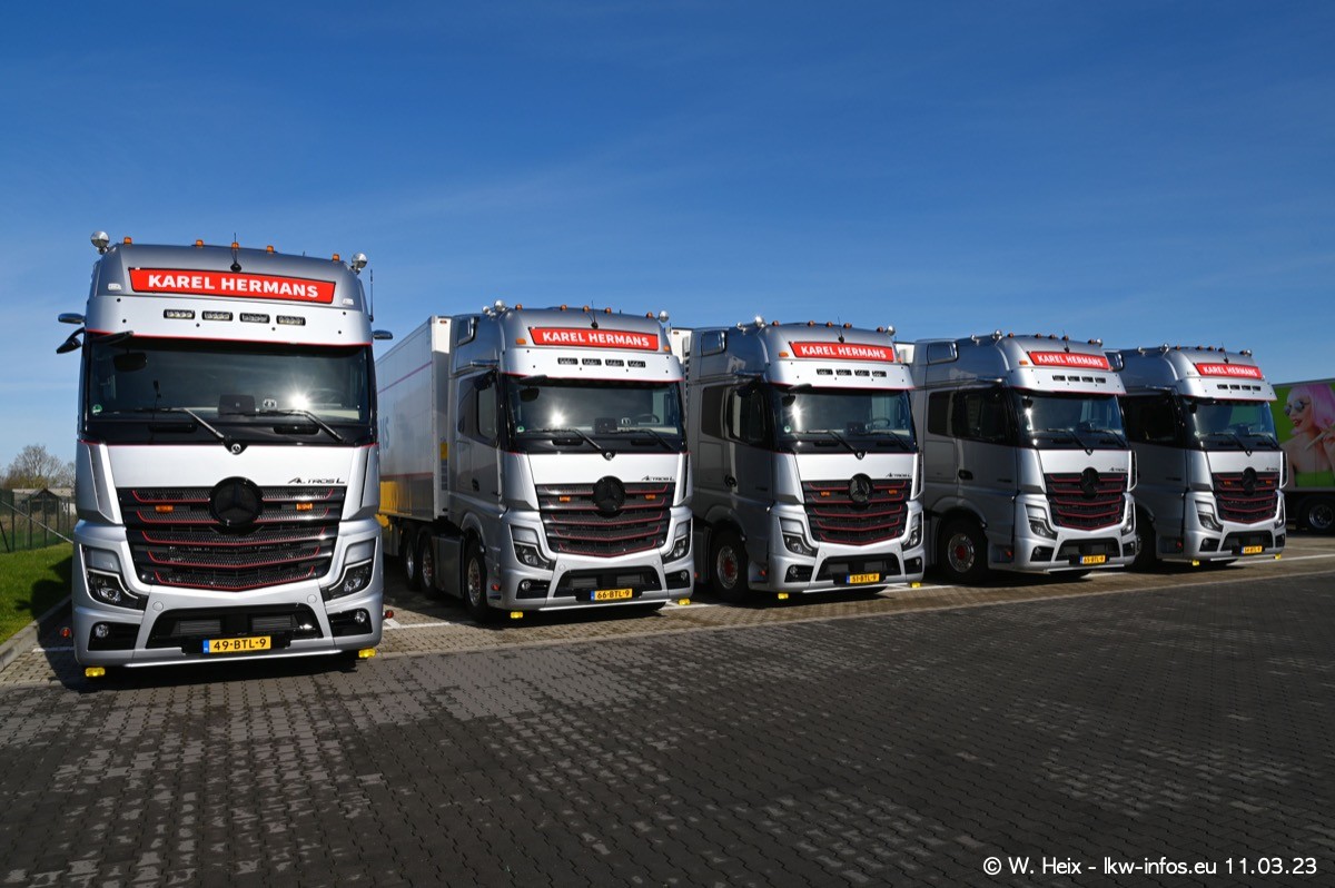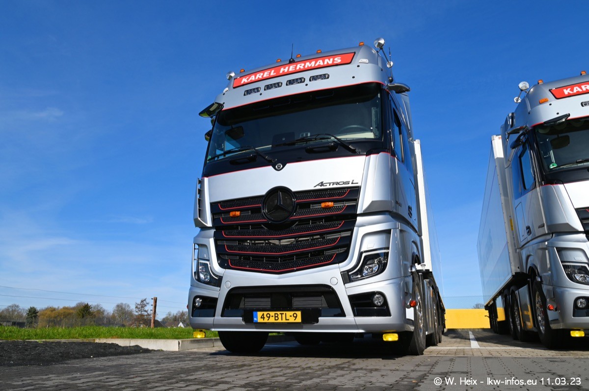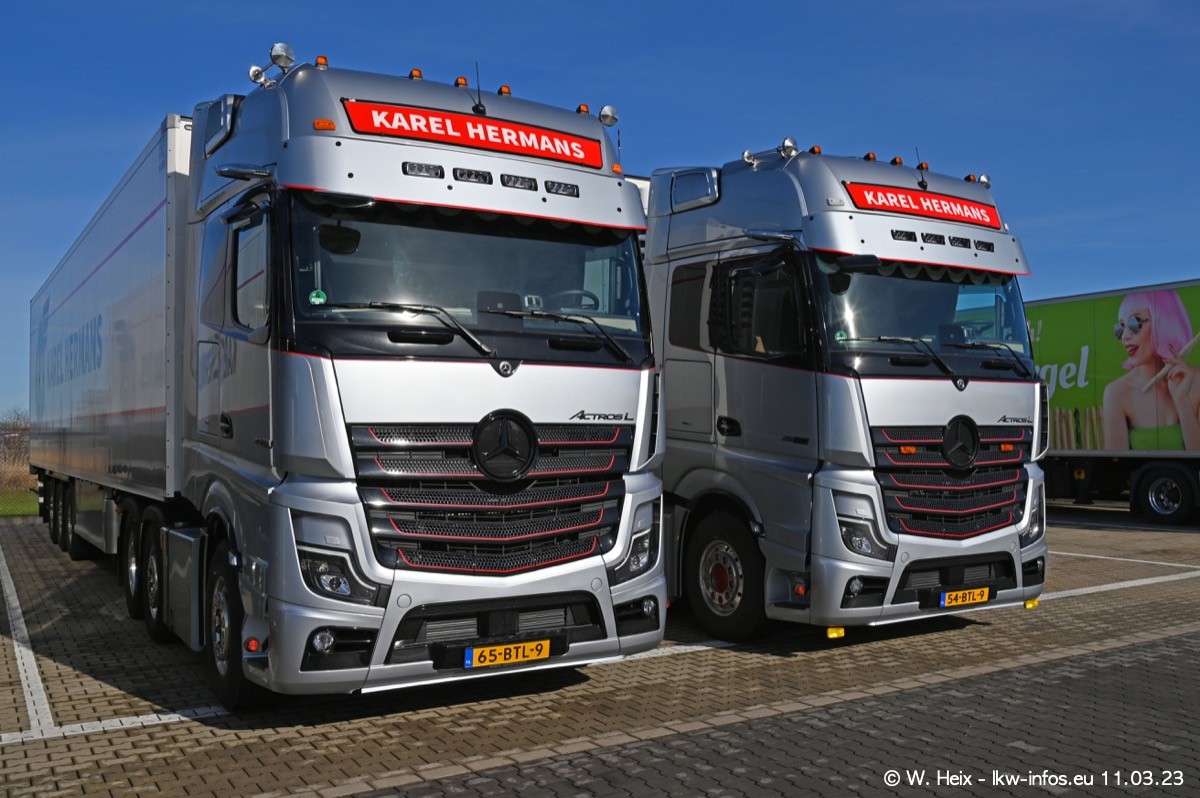 Karel Hermans ist eine neue Firma/Spedition, die in Venlo (NL) zuhause ist. Die lKW stehen allerdings bei der Spedition Klümpen in Straelen (D). Inzwischen gibt es sechs Mercedes-Benz Actros L, fünf davon konnte ich bei schönstem Wetter fotografieren. 🙂