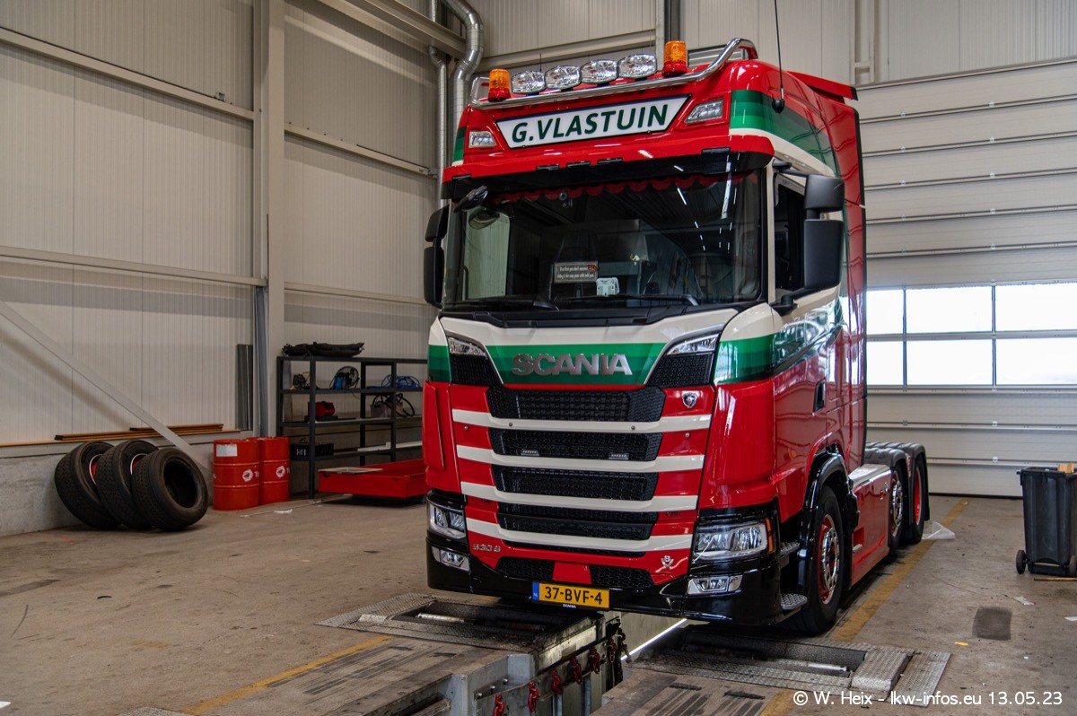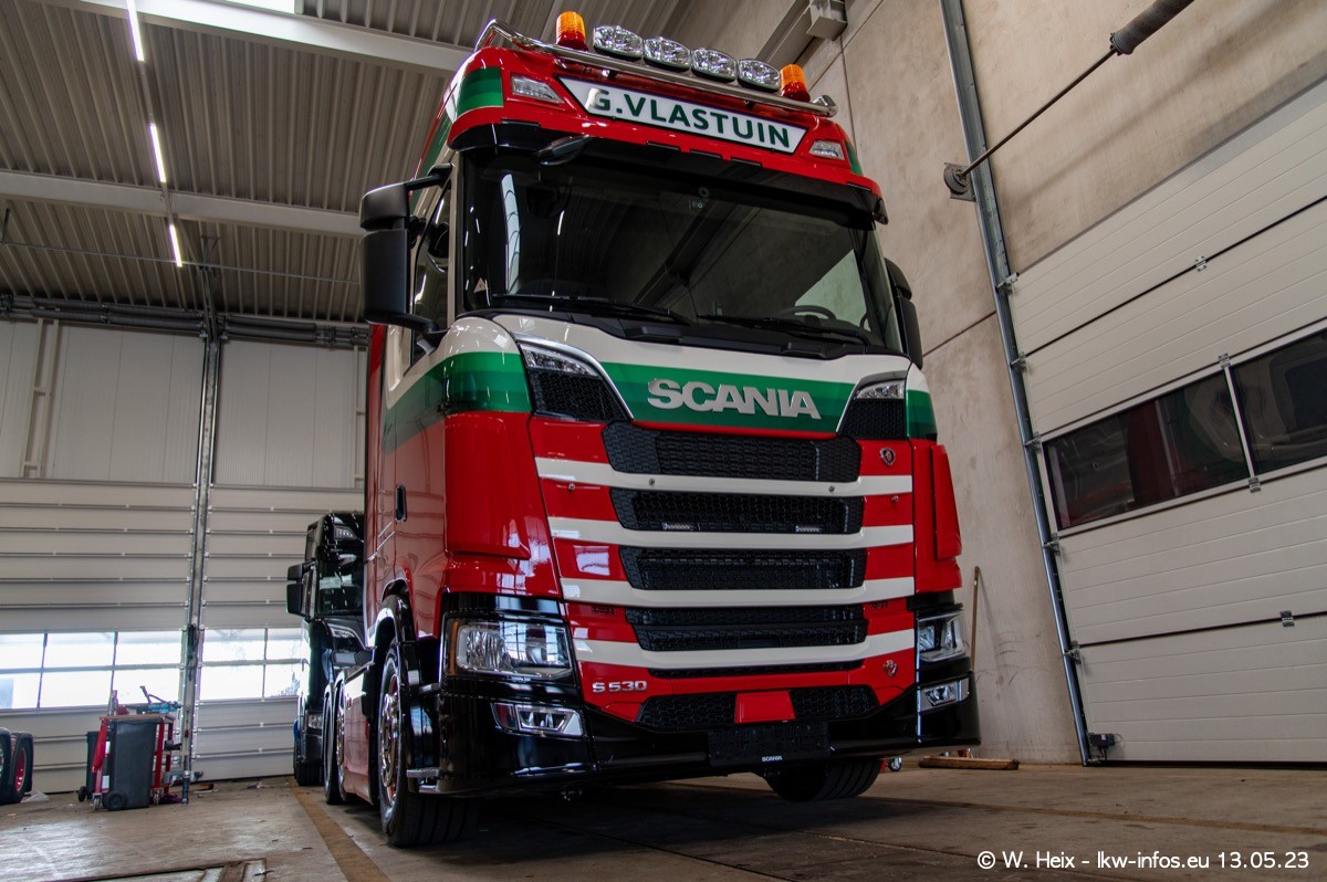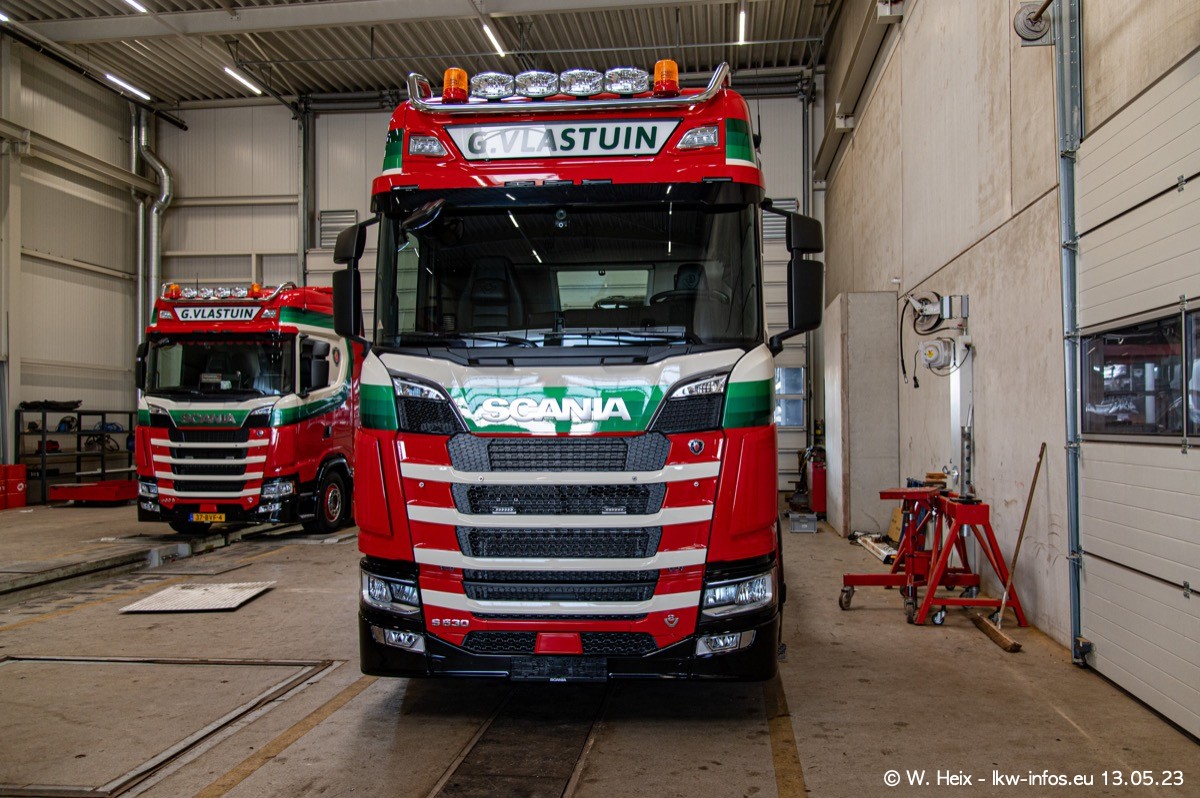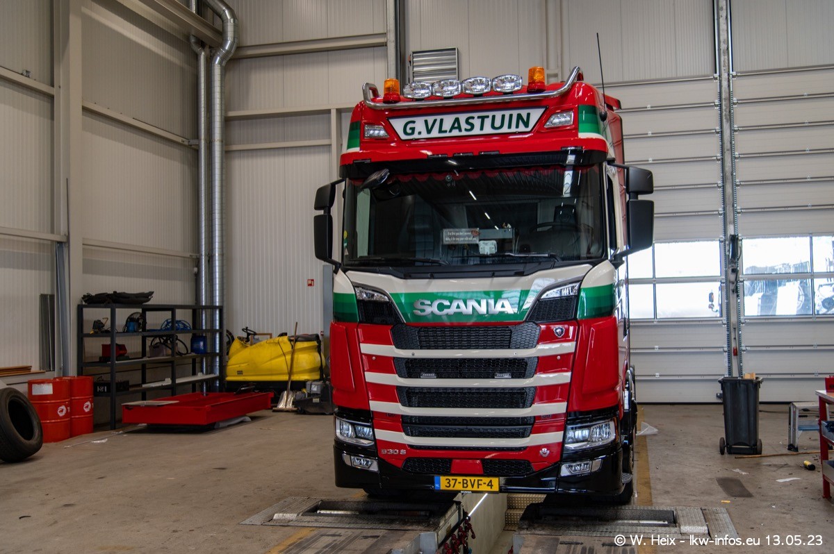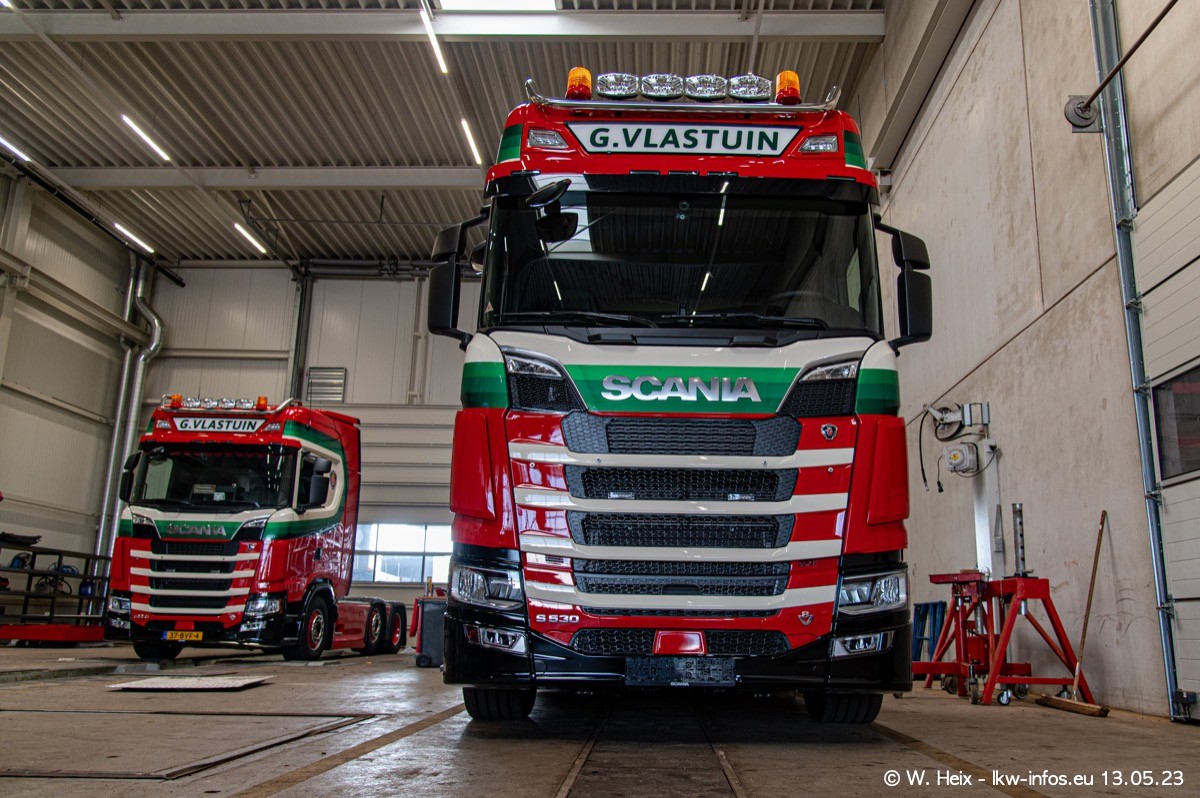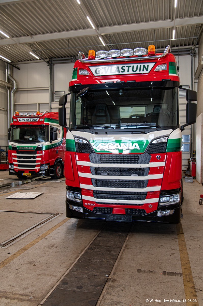 Im verganenen Jahr hat Vlastuin die Firma W. P. de Koning aus Vuren übernommnen. Zwei Fahrzeuge konnte ich heute fotografieren. Ganz neu sind zwei SCANIA 530 S V8, die ich in der Werkstatt fotografiert habe, zu sehen auf den ersten Bildern. Inzwischen sind fast alle älteren SCANIA ausgemustert bzw. durch aktuelle der Baureihen S und R ersetzt worden.
