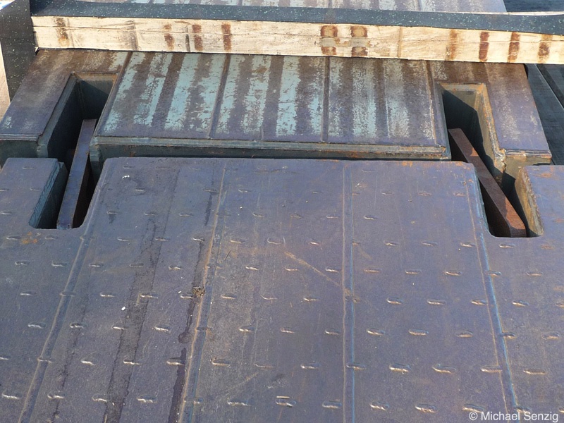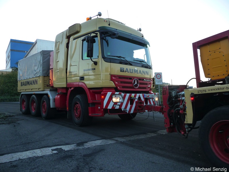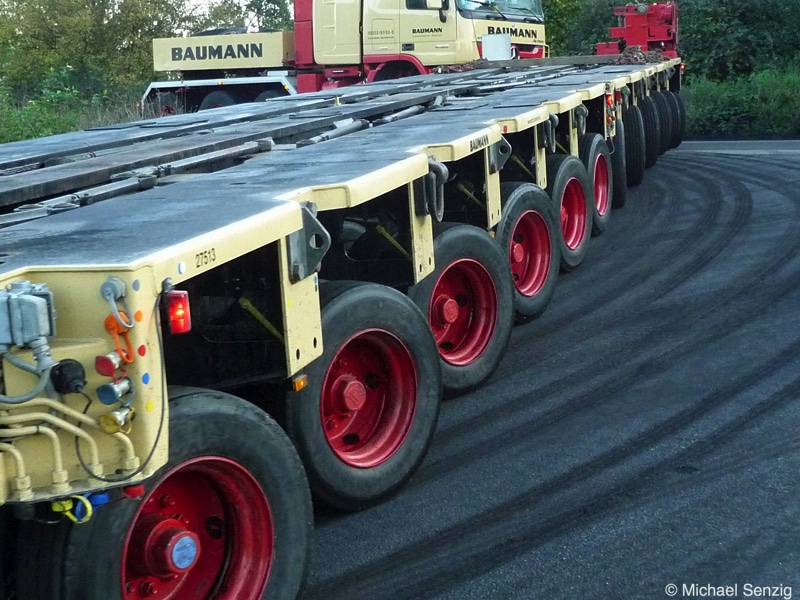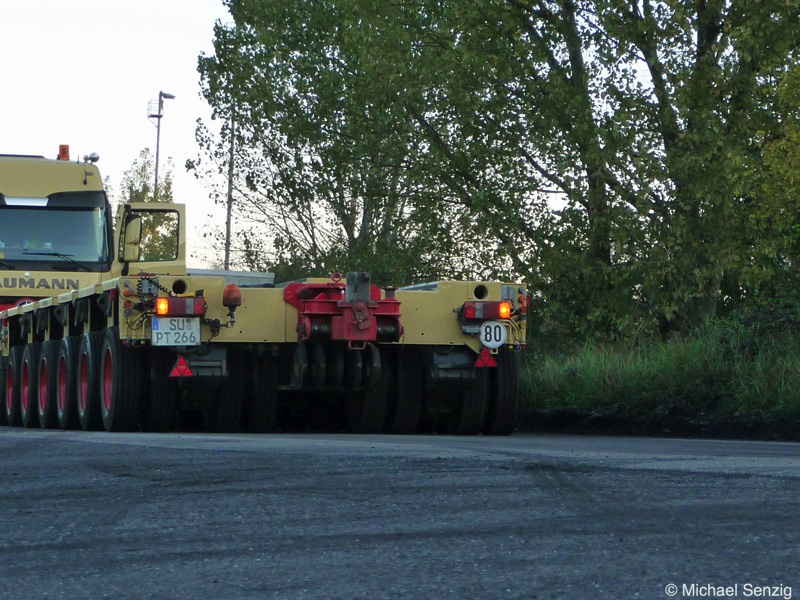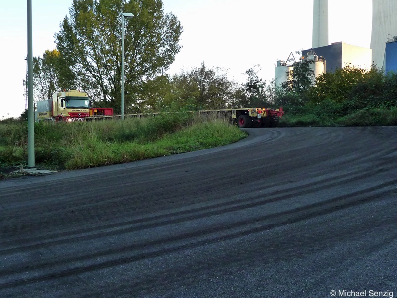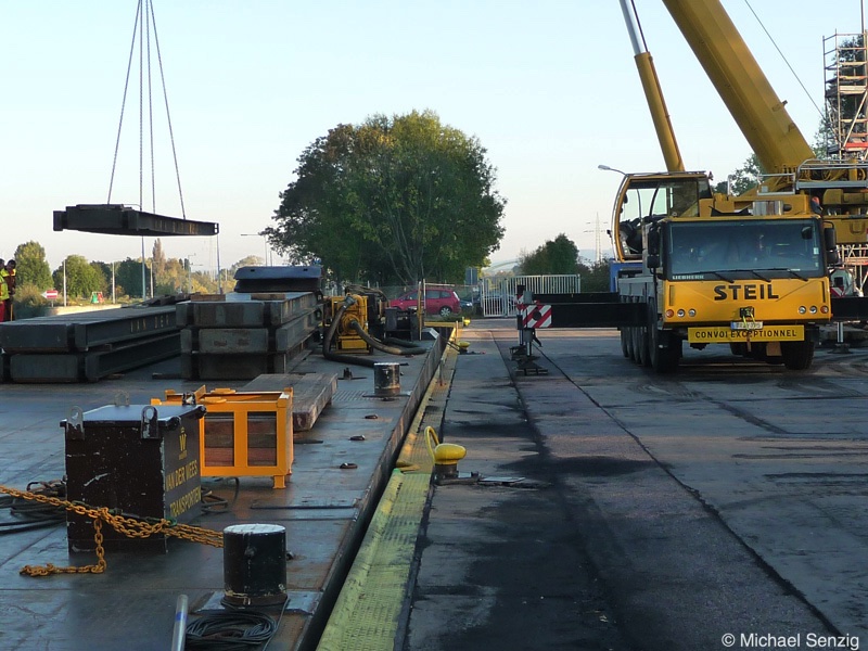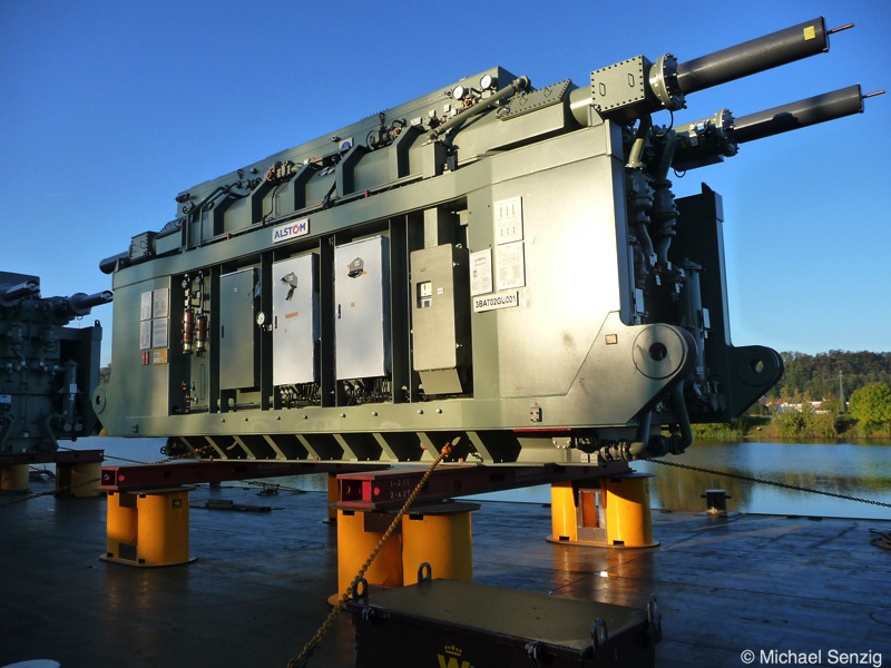 Am 15.10.2010 wurden im Saarland auf dem Gelände der Firma VSE zwei Trafos per Ponton-Schifff "angeliefert". Auf dem Ponton der Firma van der Wees aus dem niederländischen Dordrecht standen beide Trafos auf "Elefantenfüßen". Deswegen war für die Verladung kein Kran nötig. Es konnte einfach unter die Ladung gefahren werden. Michael Senzig hat einen Teil der Aktion beobachtet und fotografiert.