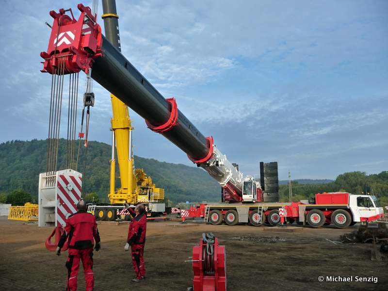 Ende September 2014 war die Firma Bohnet mit mehreren Schwertransporten im Dillinger Hafen. Die Pressenteile hatten Gewichte von bis zu 180 t. Für dem Umschlag auf ein Binnenschiff im Dillinger Hafen waren die Firmen Steil mit einem Liebherr LTM und Schuch mit einen Tadano-Kran vor Ort. Michael Senzig hat die Einfahrt der Schwertransporte in den Hafen sowie die Verladung mitverfolgt und fotografiert.