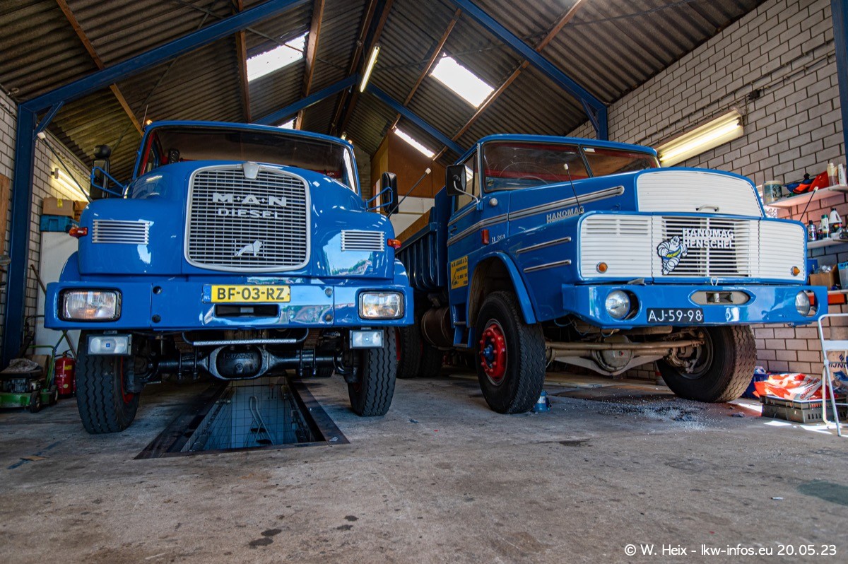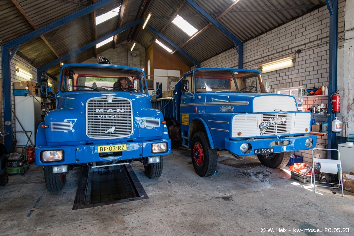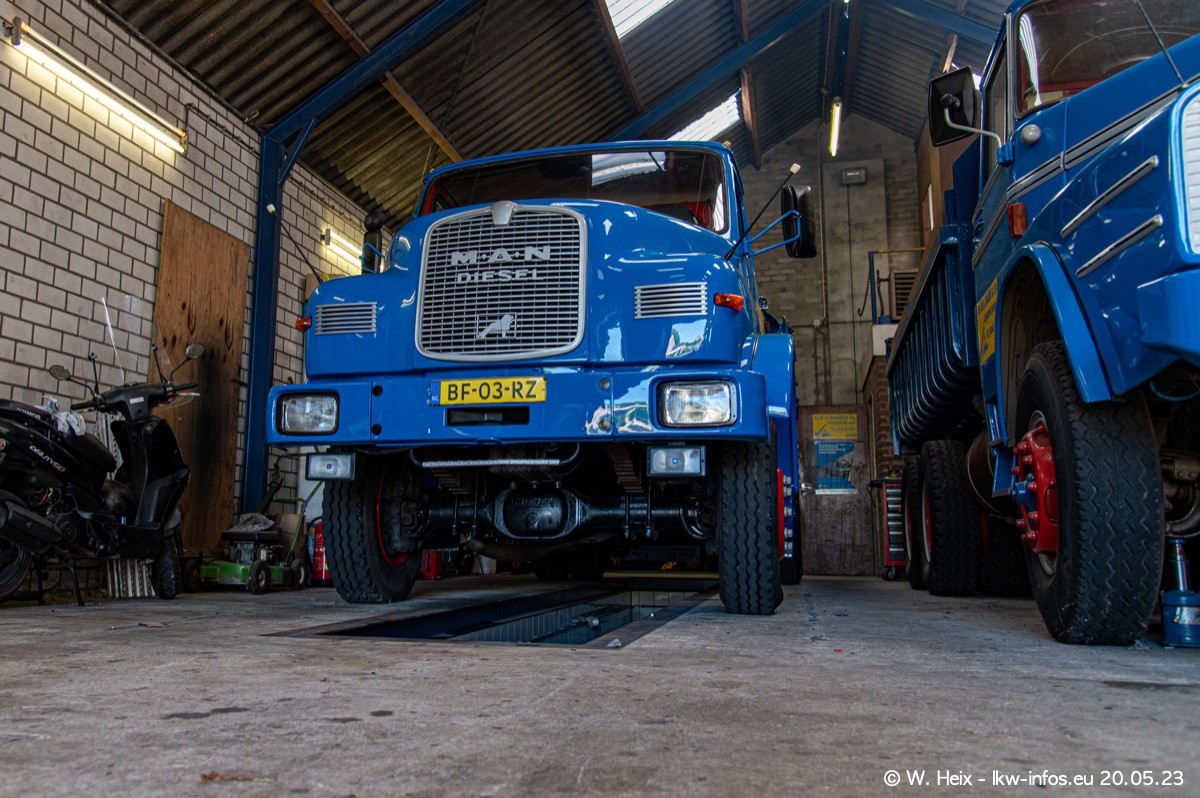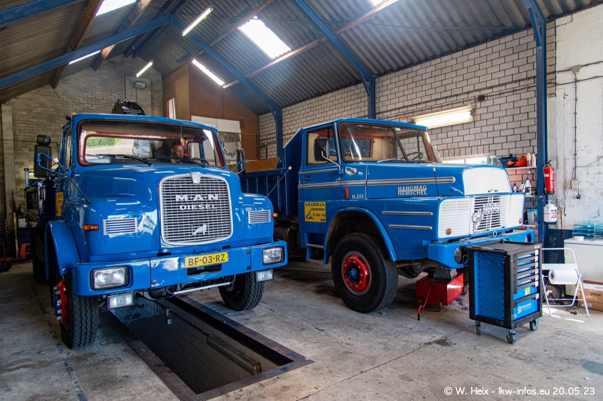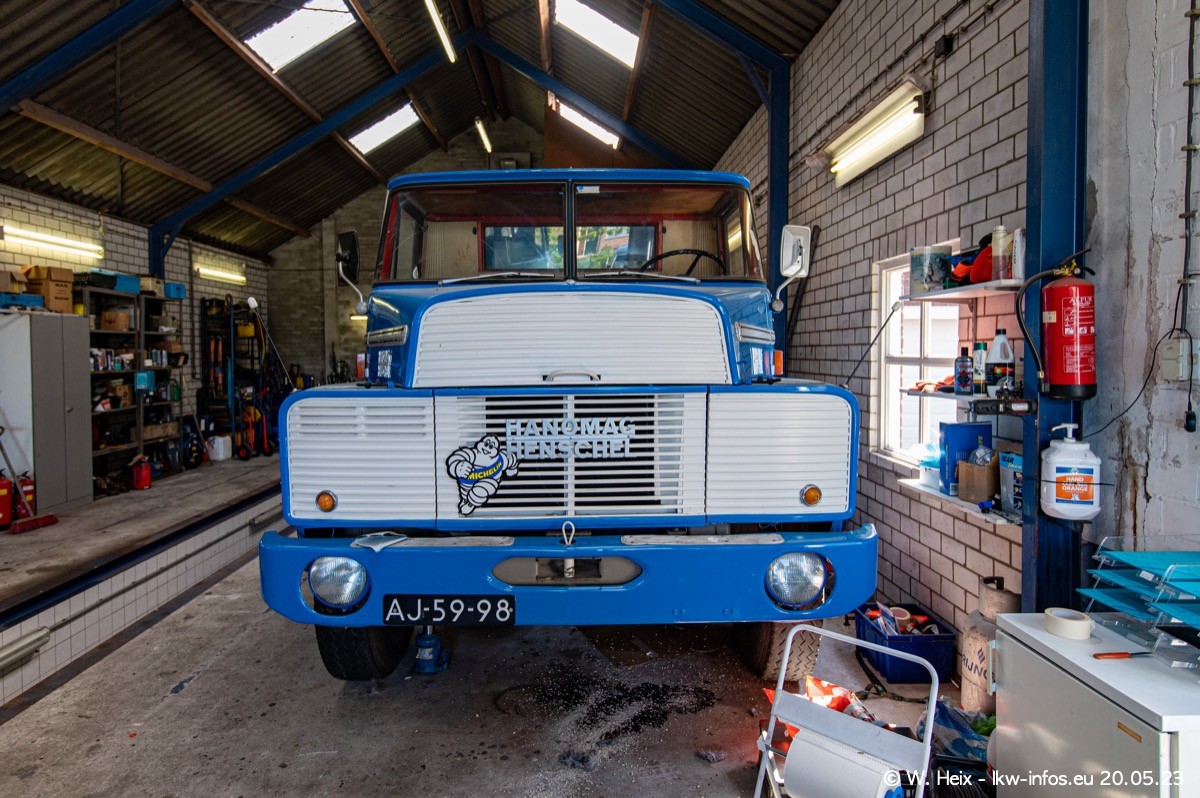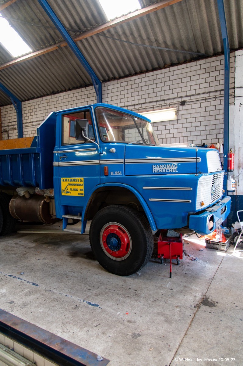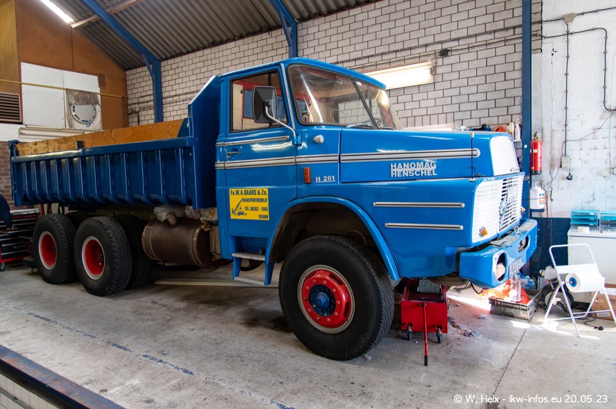 Der Fuhrpark von Baars besteht aus neun MAN, das sind vier MAN der neuen Baureihe und fünf der alten Baureihe. Die Firma ist überwiegend im Bereich Containertransport tätig. Es gibt aber auch noch zwei schöne Oldtimer. Das ist ein MAN 16.168 HAK, Baujahr 1982. Der wurde vor drei Jahren gekauft und in den eigenen Firmenfarben lackiert. Der stand auch gleich für ein kleines Fotoshooting bereit. Der zweite Oldtimer ist ein Hanomag-Henschel H 261 Allrad-Hauber. Der LKW ist von 1970 und wurde damals vom heutigen Senior-Chef neu gekauft und ist bis heute im Familienbesitz. Aktuell ist das Fahrzeug allerdings nicht fahrbereit, darum gibt es "nur" Bilder aus der Garage/Werkstatt.