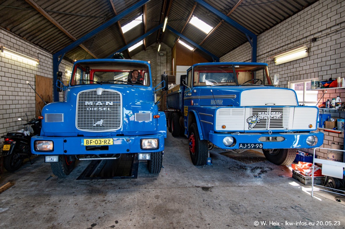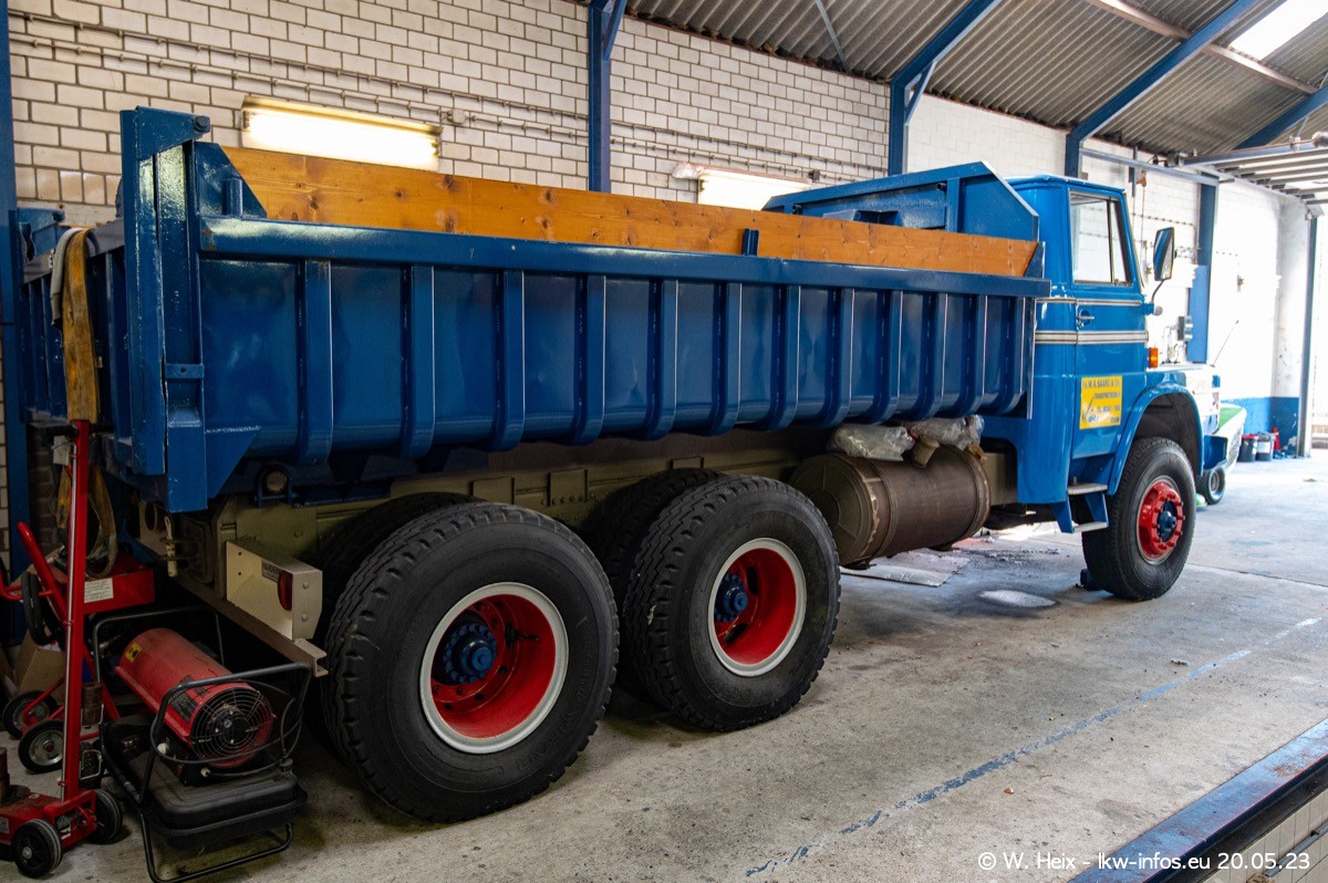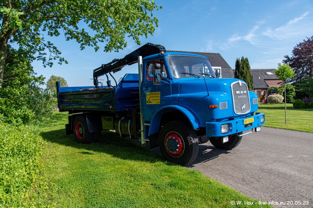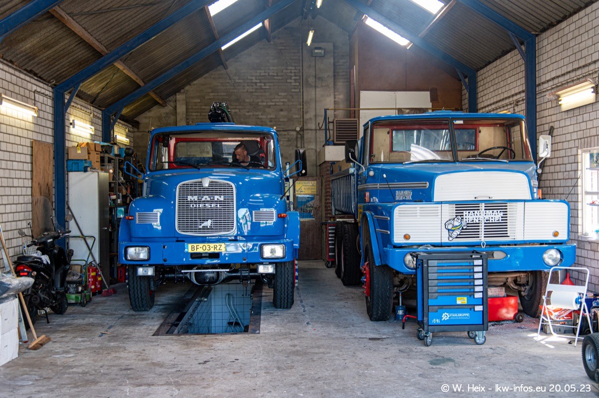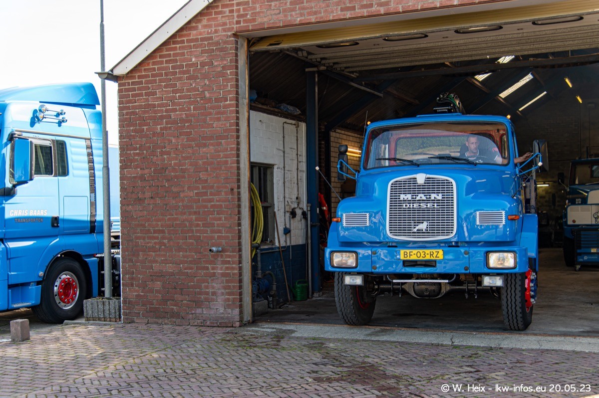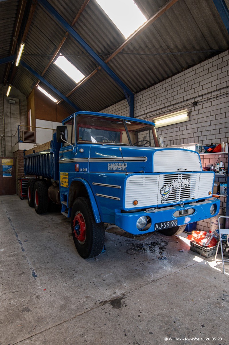 Der Fuhrpark von Baars besteht aus neun MAN, das sind vier MAN der neuen Baureihe und fünf der alten Baureihe. Die Firma ist überwiegend im Bereich Containertransport tätig. Es gibt aber auch noch zwei schöne Oldtimer. Das ist ein MAN 16.168 HAK, Baujahr 1982. Der wurde vor drei Jahren gekauft und in den eigenen Firmenfarben lackiert. Der stand auch gleich für ein kleines Fotoshooting bereit. Der zweite Oldtimer ist ein Hanomag-Henschel H 261 Allrad-Hauber. Der LKW ist von 1970 und wurde damals vom heutigen Senior-Chef neu gekauft und ist bis heute im Familienbesitz. Aktuell ist das Fahrzeug allerdings nicht fahrbereit, darum gibt es "nur" Bilder aus der Garage/Werkstatt.