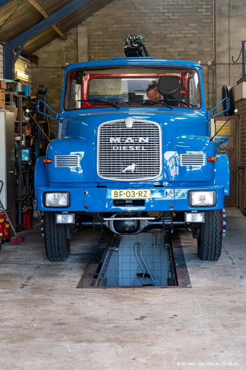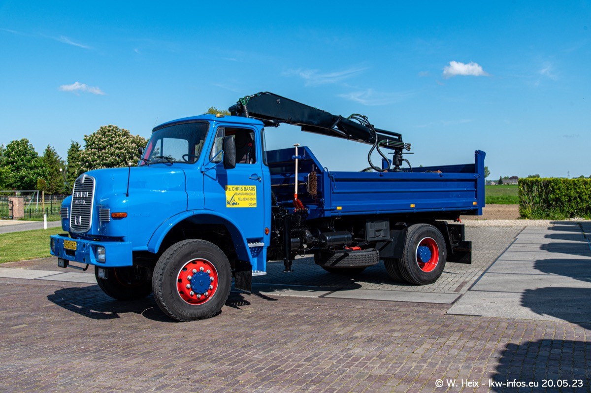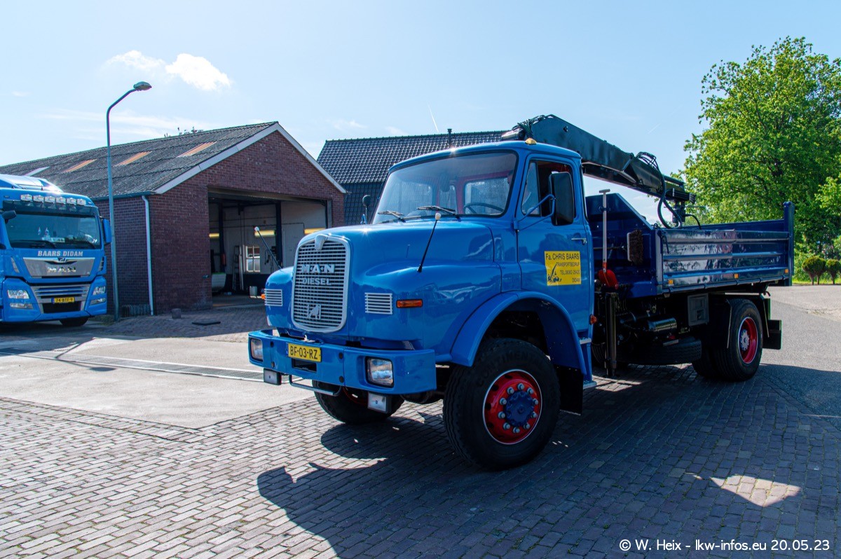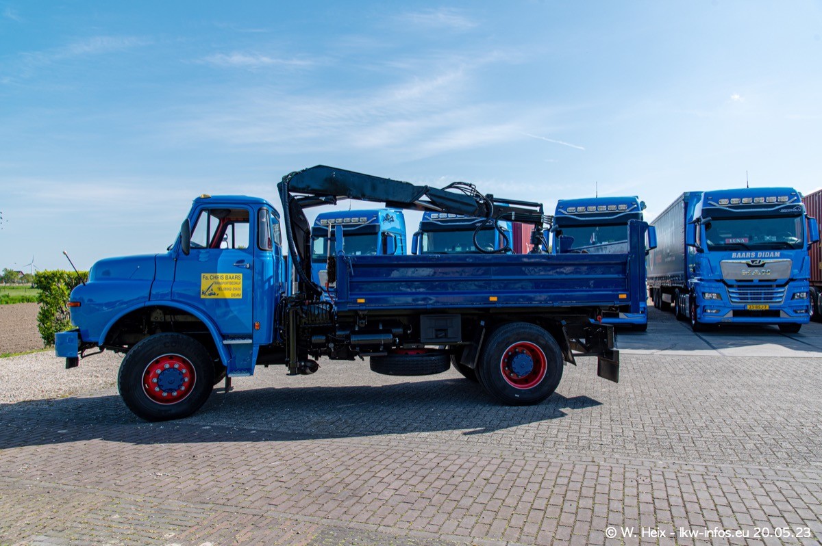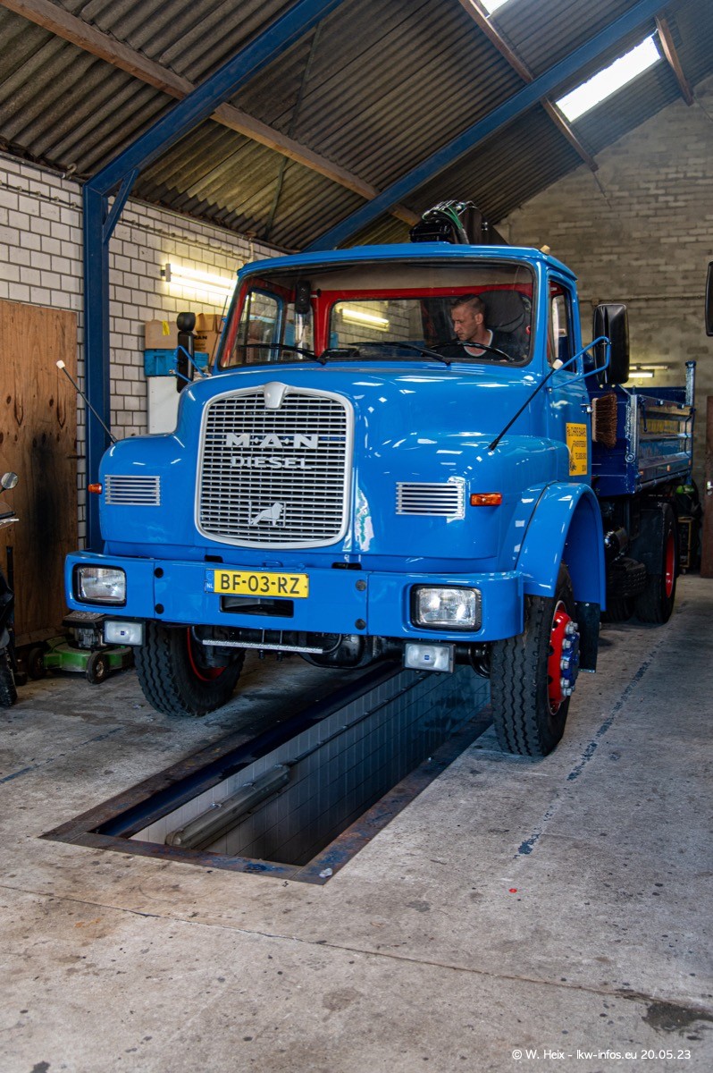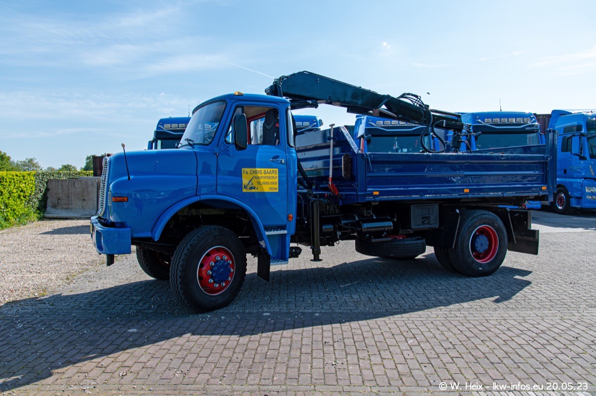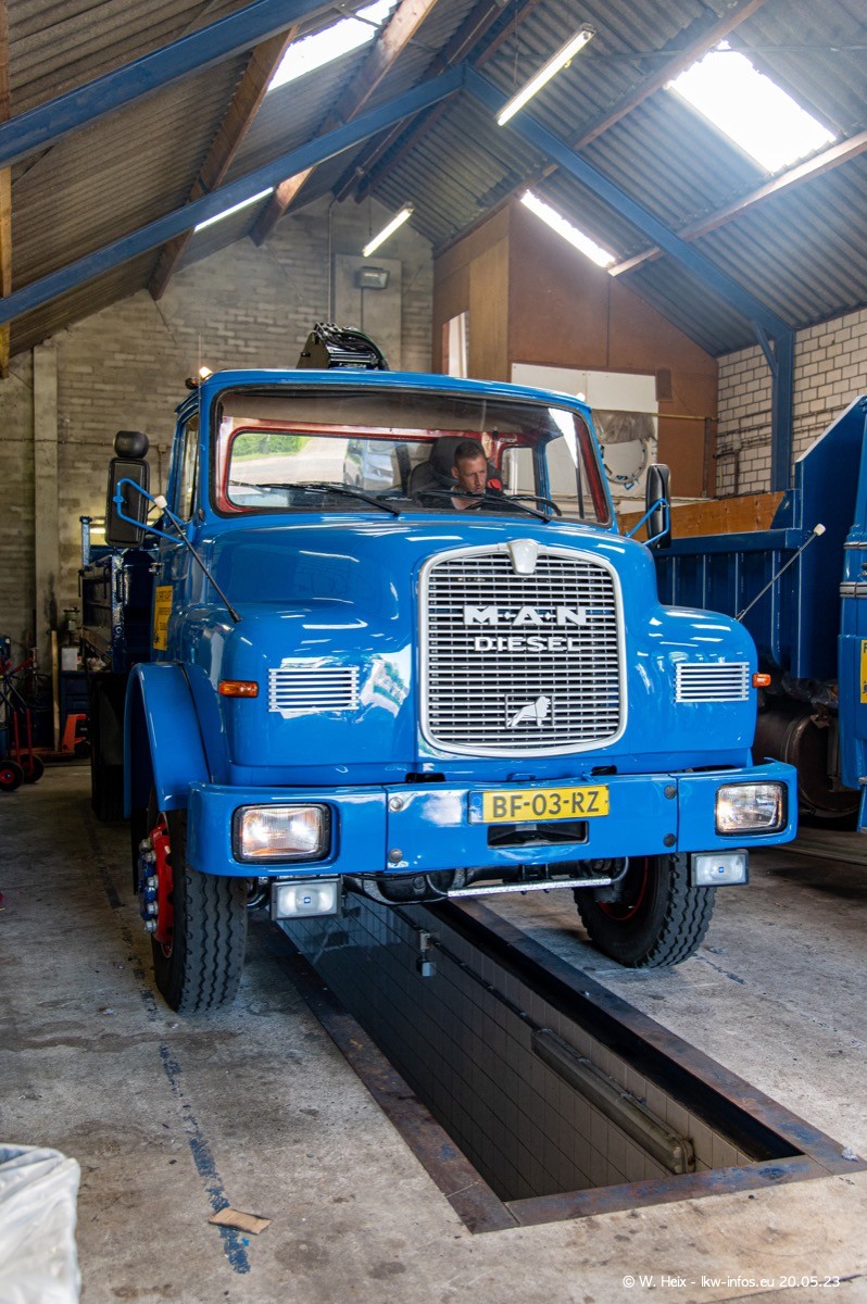 Der Fuhrpark von Baars besteht aus neun MAN, das sind vier MAN der neuen Baureihe und fünf der alten Baureihe. Die Firma ist überwiegend im Bereich Containertransport tätig. Es gibt aber auch noch zwei schöne Oldtimer. Das ist ein MAN 16.168 HAK, Baujahr 1982. Der wurde vor drei Jahren gekauft und in den eigenen Firmenfarben lackiert. Der stand auch gleich für ein kleines Fotoshooting bereit. Der zweite Oldtimer ist ein Hanomag-Henschel H 261 Allrad-Hauber. Der LKW ist von 1970 und wurde damals vom heutigen Senior-Chef neu gekauft und ist bis heute im Familienbesitz. Aktuell ist das Fahrzeug allerdings nicht fahrbereit, darum gibt es "nur" Bilder aus der Garage/Werkstatt.