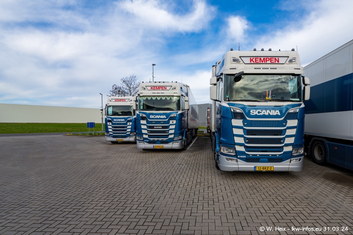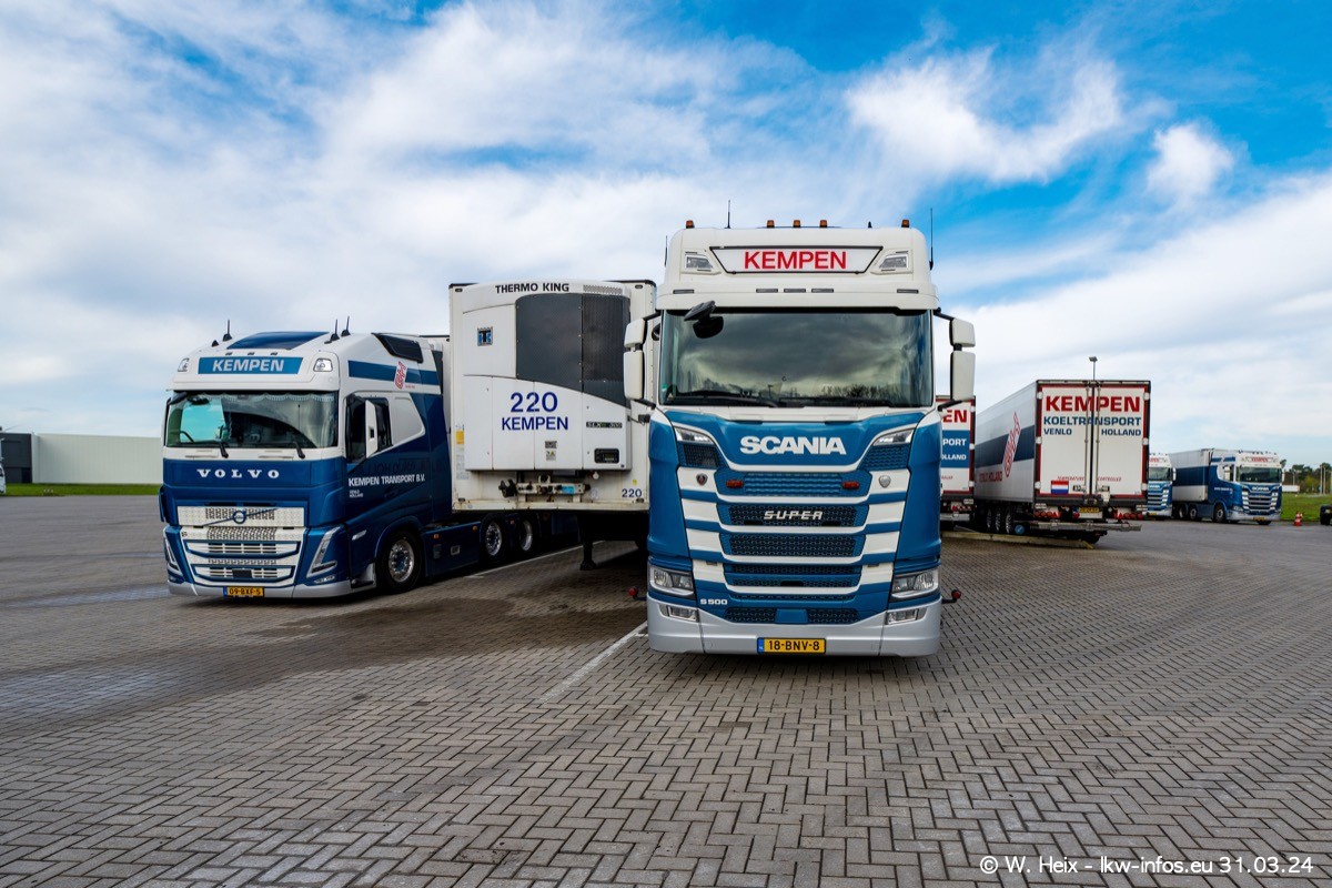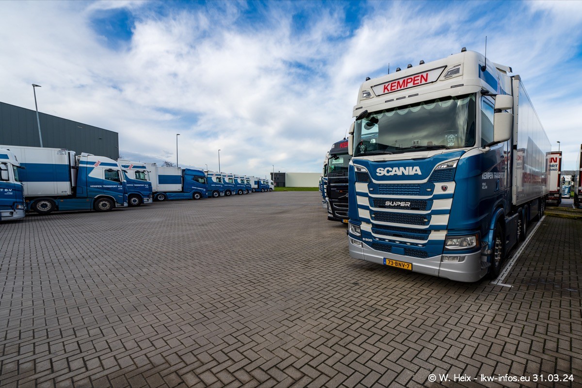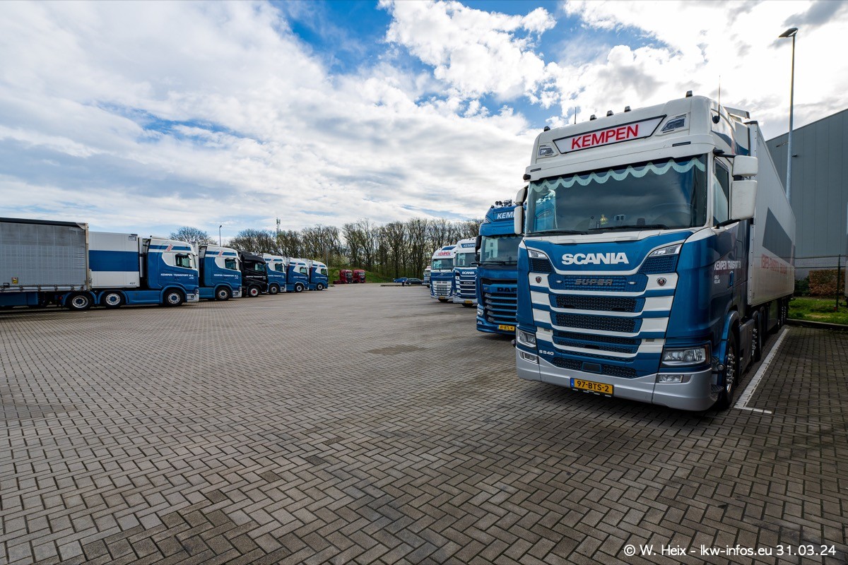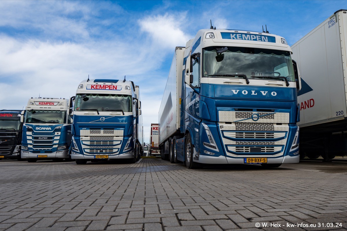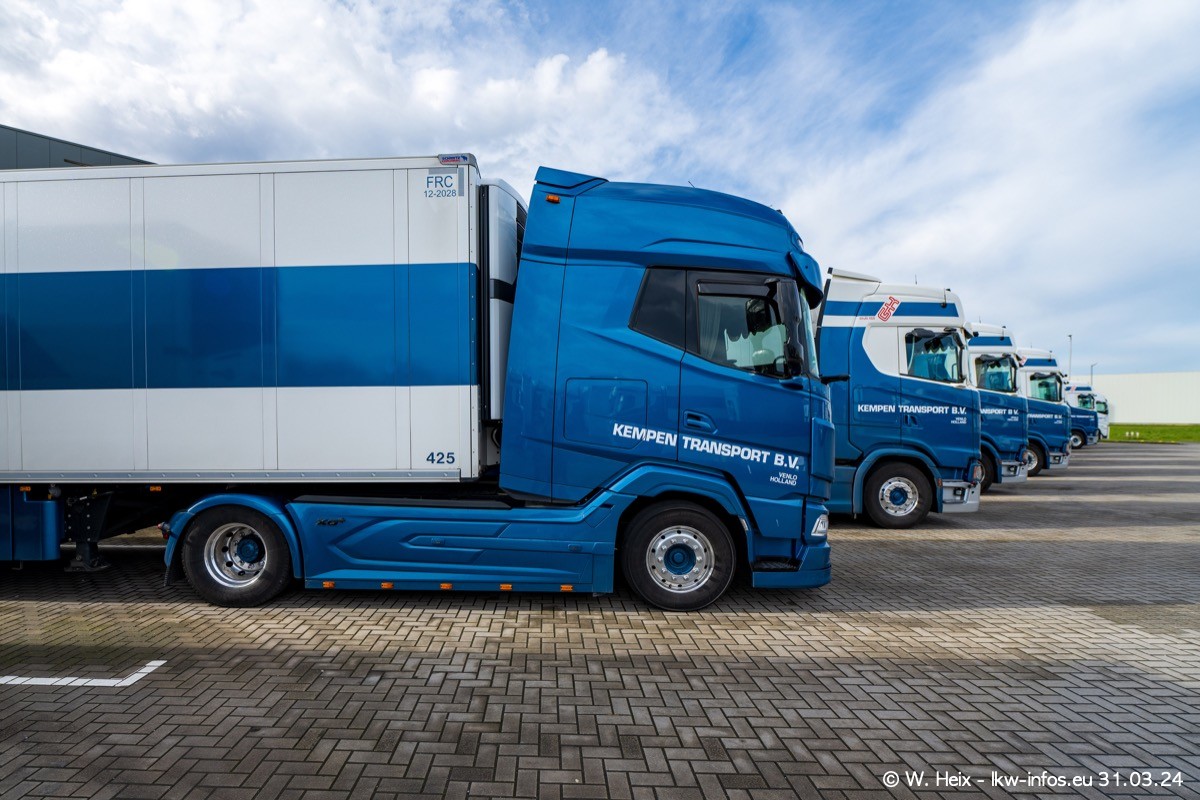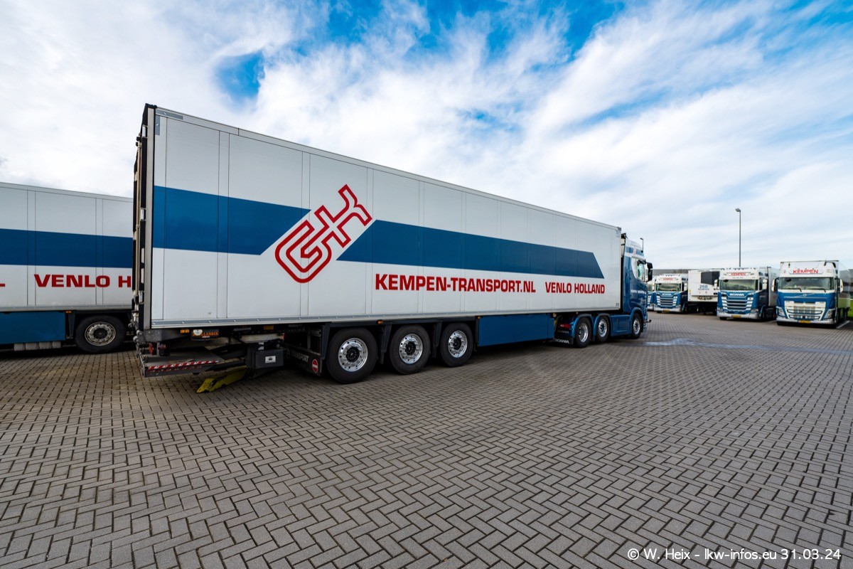 In diesem Jahr sind schon insgesamt mindestens 10 neue LKW in den Fuhrpark gekommen. Alle neuen LKW sind seit 2024 daran zu erkennen, dass aon der Fromt oben am Dach der Kempen-Schriftzug jetzt weiß ist in einem blauen Feld. Bisher war dieser immer rot auf weiß. Es waren so gut wie alle LKW zuzhause und standen auch wieder auf den Nachbargrundstücken. Diesmal konnte ich keinen SCANIA R Streamline und keinen DAF XF mehr sehen bis auf den neuen blauen DAF XG+ natürlich. Vermutlich sind jetzt alle alten SCANIA und DAF ersetzt durch VOLVO FH 5 und SCANIA R/S NextGen. Es sind natürlich auch wieder Bilder von den Chartern (Subunternehmern) in den Galerien enthalten. Auch hier tut sich immer weider mal was.