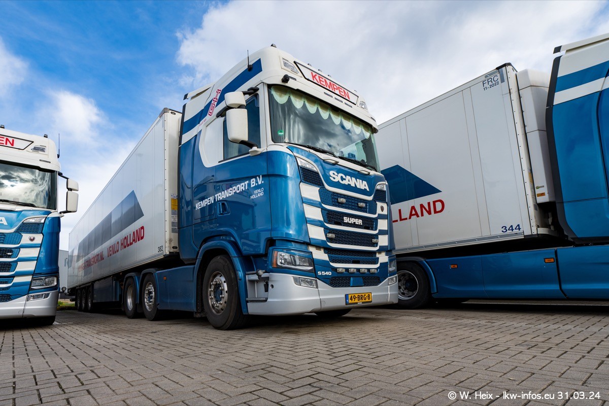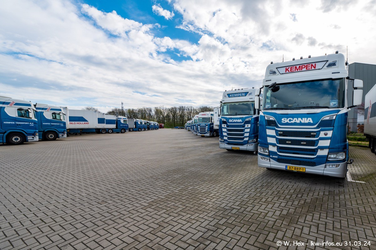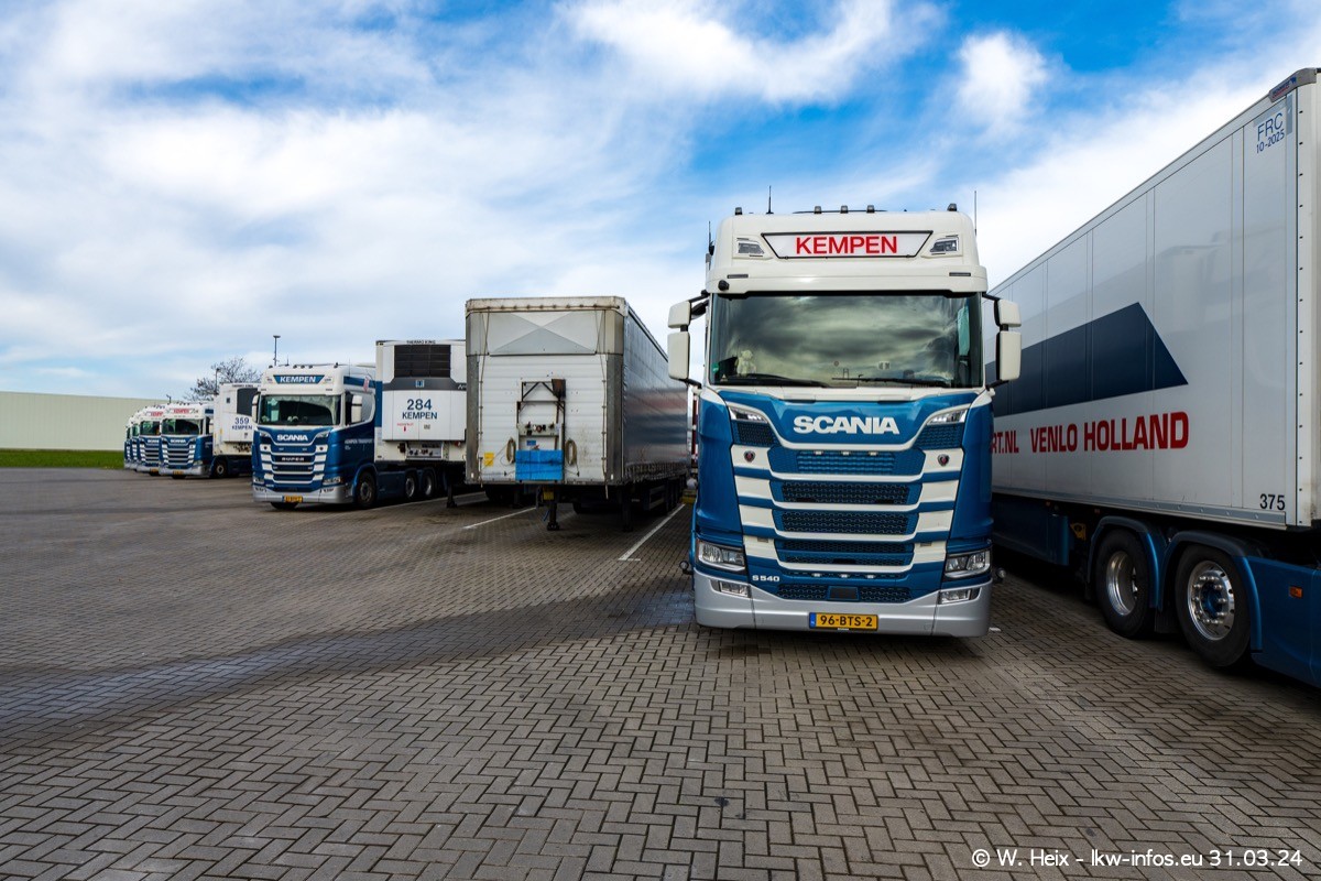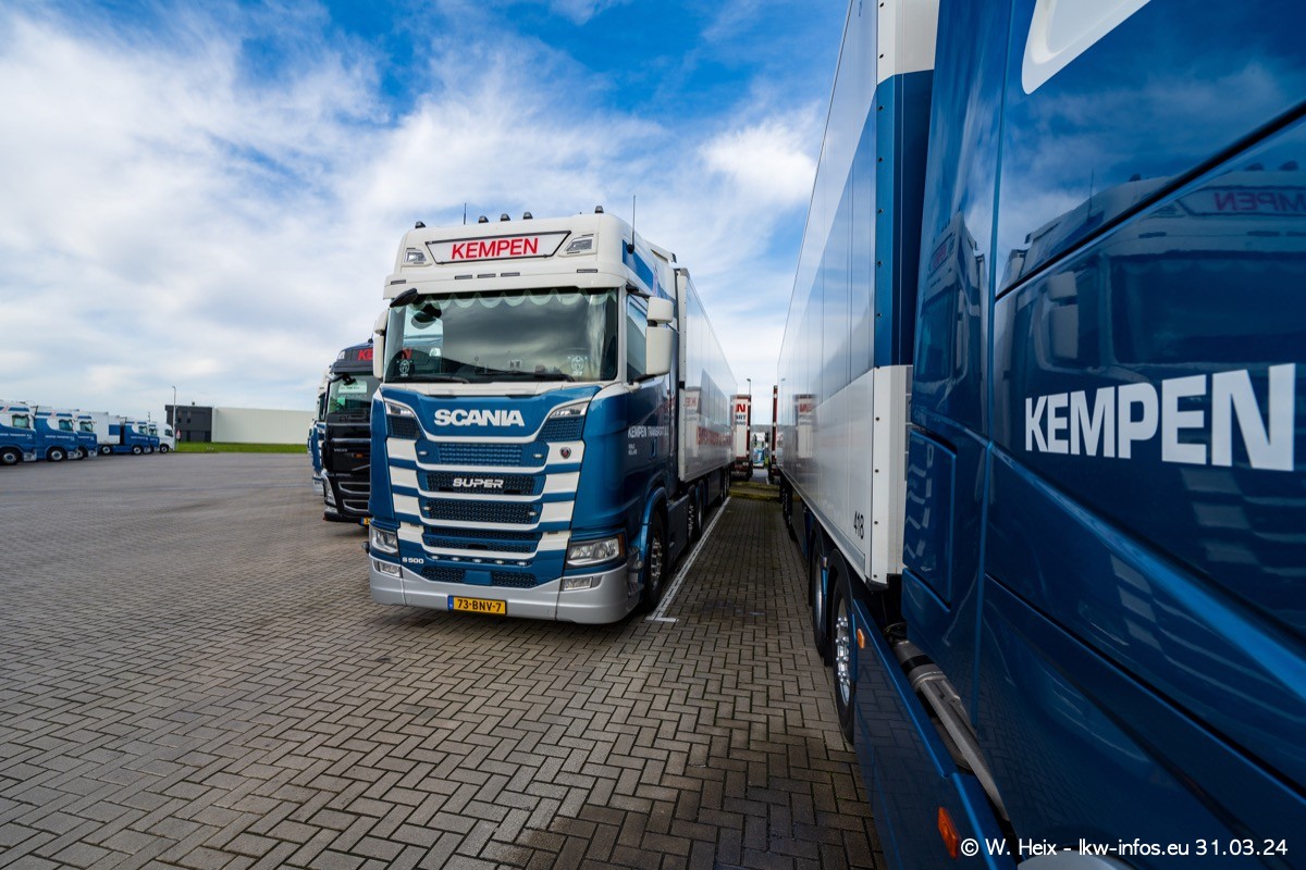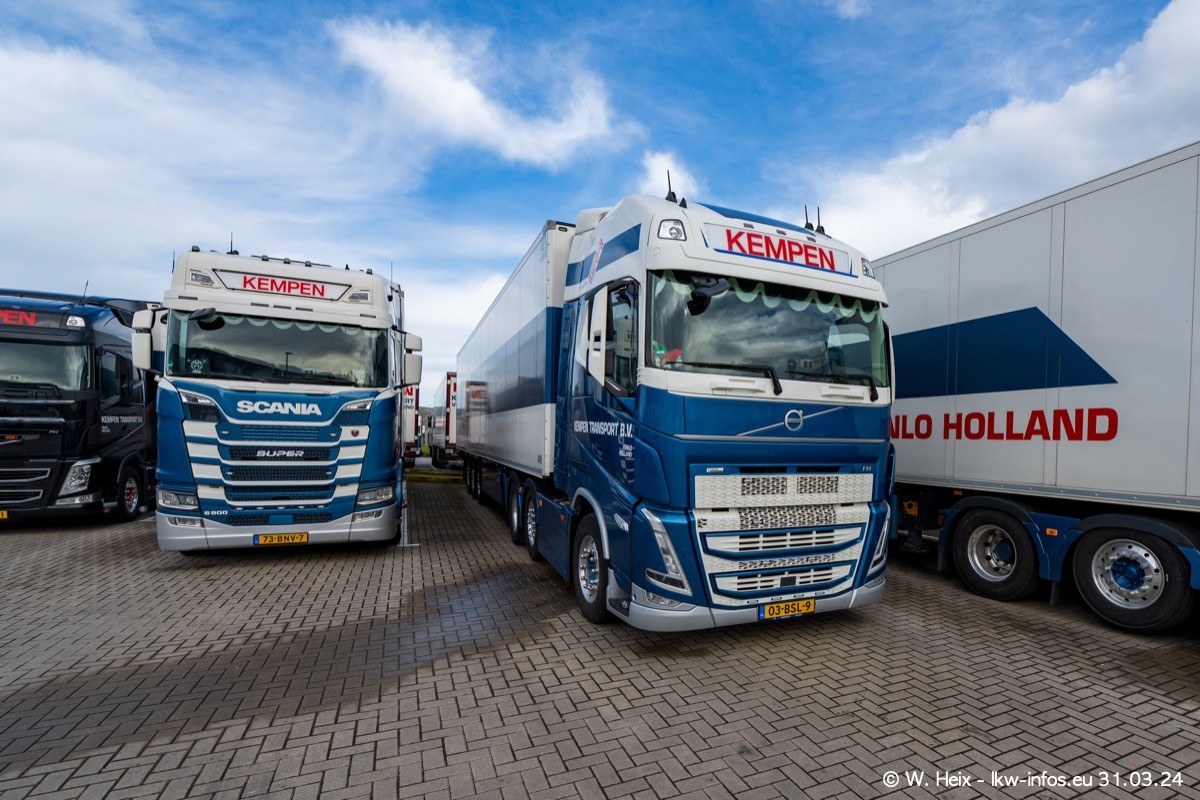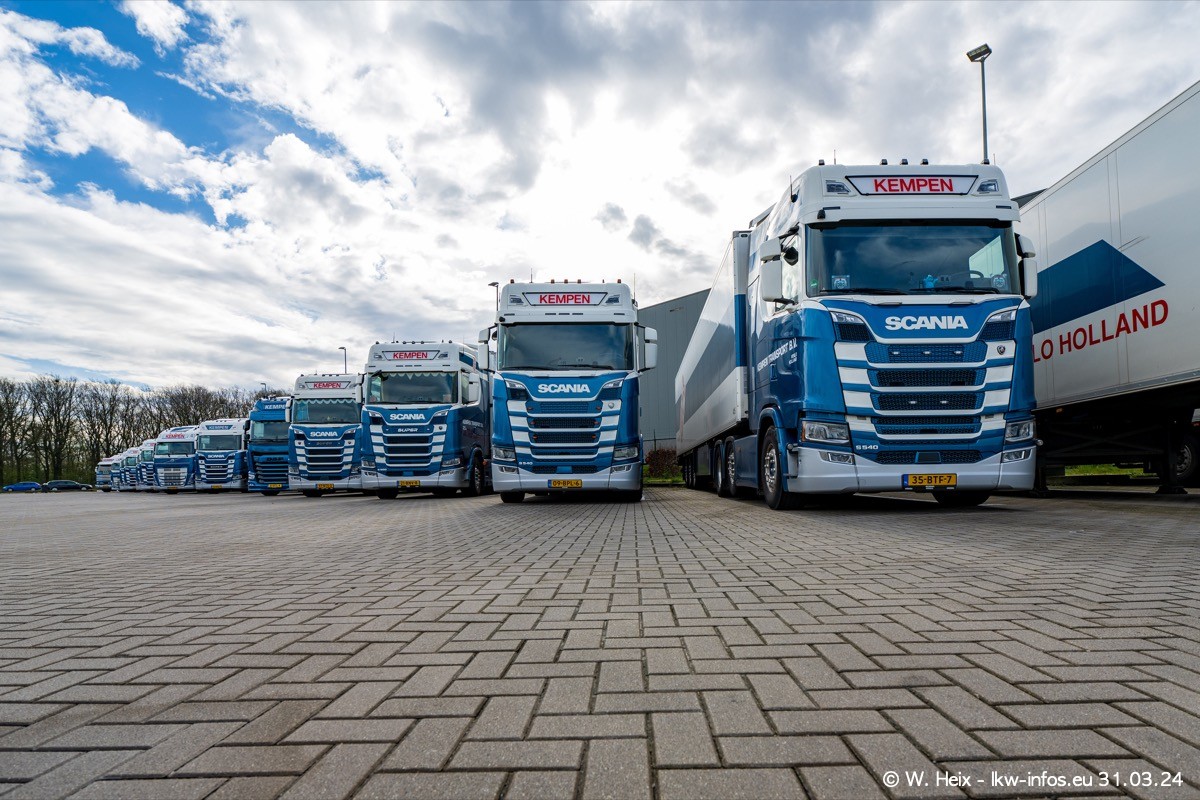 In diesem Jahr sind schon insgesamt mindestens 10 neue LKW in den Fuhrpark gekommen. Alle neuen LKW sind seit 2024 daran zu erkennen, dass aon der Fromt oben am Dach der Kempen-Schriftzug jetzt weiß ist in einem blauen Feld. Bisher war dieser immer rot auf weiß. Es waren so gut wie alle LKW zuzhause und standen auch wieder auf den Nachbargrundstücken. Diesmal konnte ich keinen SCANIA R Streamline und keinen DAF XF mehr sehen bis auf den neuen blauen DAF XG+ natürlich. Vermutlich sind jetzt alle alten SCANIA und DAF ersetzt durch VOLVO FH 5 und SCANIA R/S NextGen. Es sind natürlich auch wieder Bilder von den Chartern (Subunternehmern) in den Galerien enthalten. Auch hier tut sich immer weider mal was.