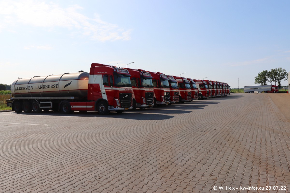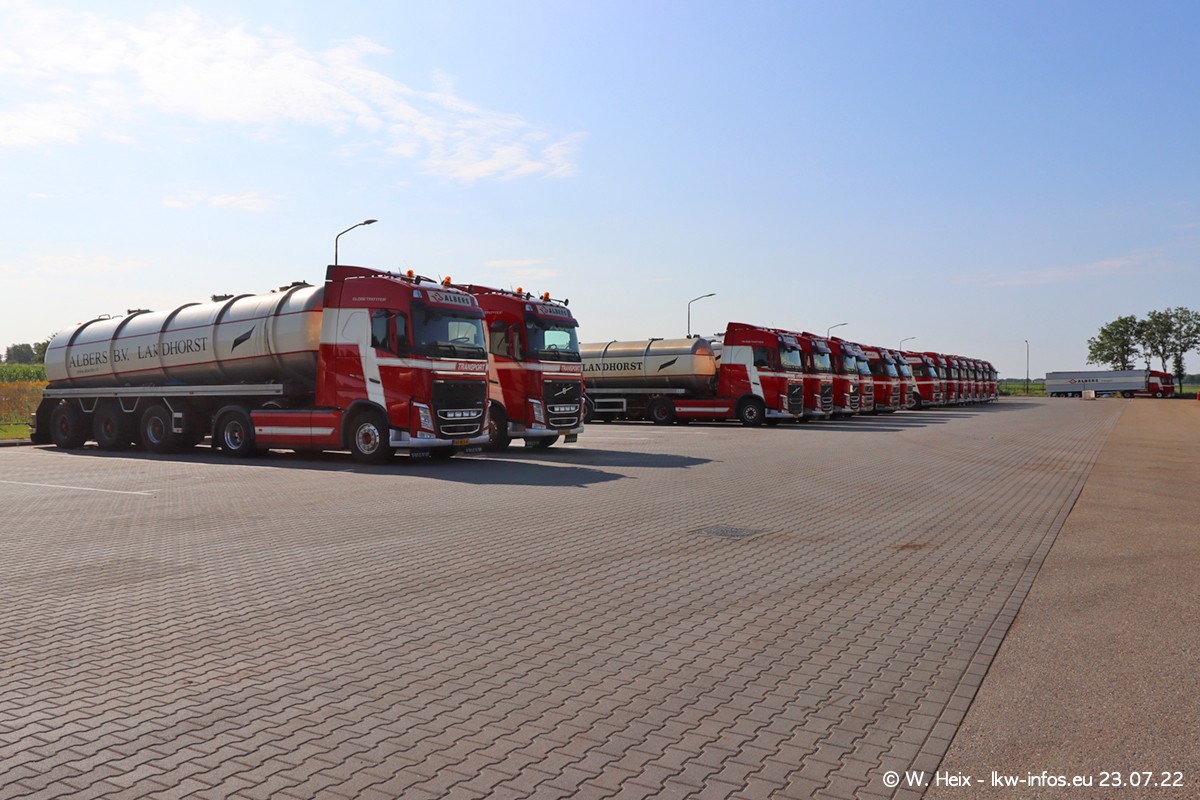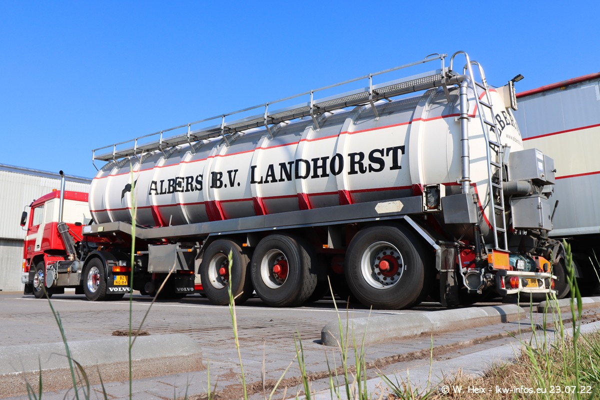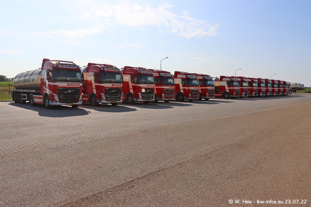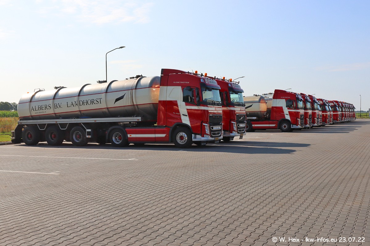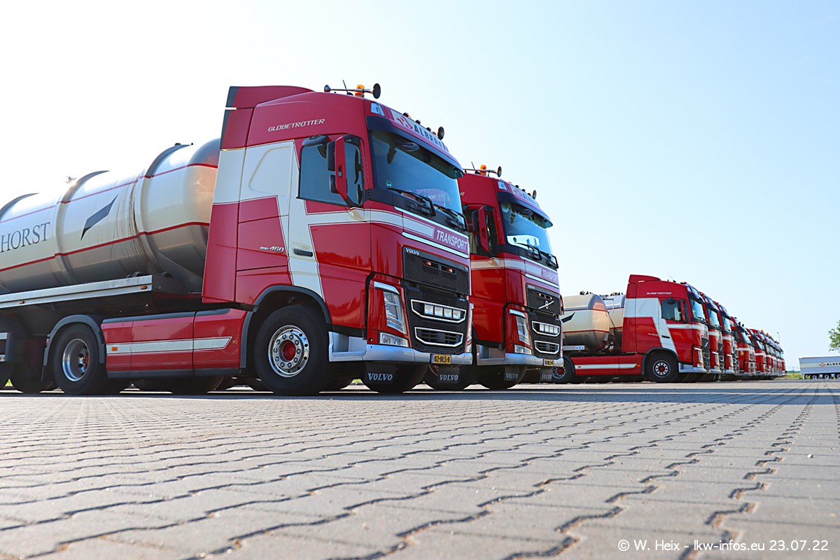 Ende 2021 ist der Fuhrpark von landhorst umgezogen nach Zeeland. Hier gibt es deutlich mehr Platz für die Fahrzeuge. Am Wochenende stehen alle LKW in einer Reihe, sortiert nach Hersteller und Alter. Ein großer Teil der LKW war zuhause. Schön, dass auch der alte VOLVO F10 samt passendem Auflieger mit auf dem Hof stand. Da die Fahrzeuge früh morgens wegen der Sonne genau falsch herum auf dem Gelände standen, war es etwas schwierig mit dem Fotografieren. Aber die Bilder sind trotzdem gut geworden.