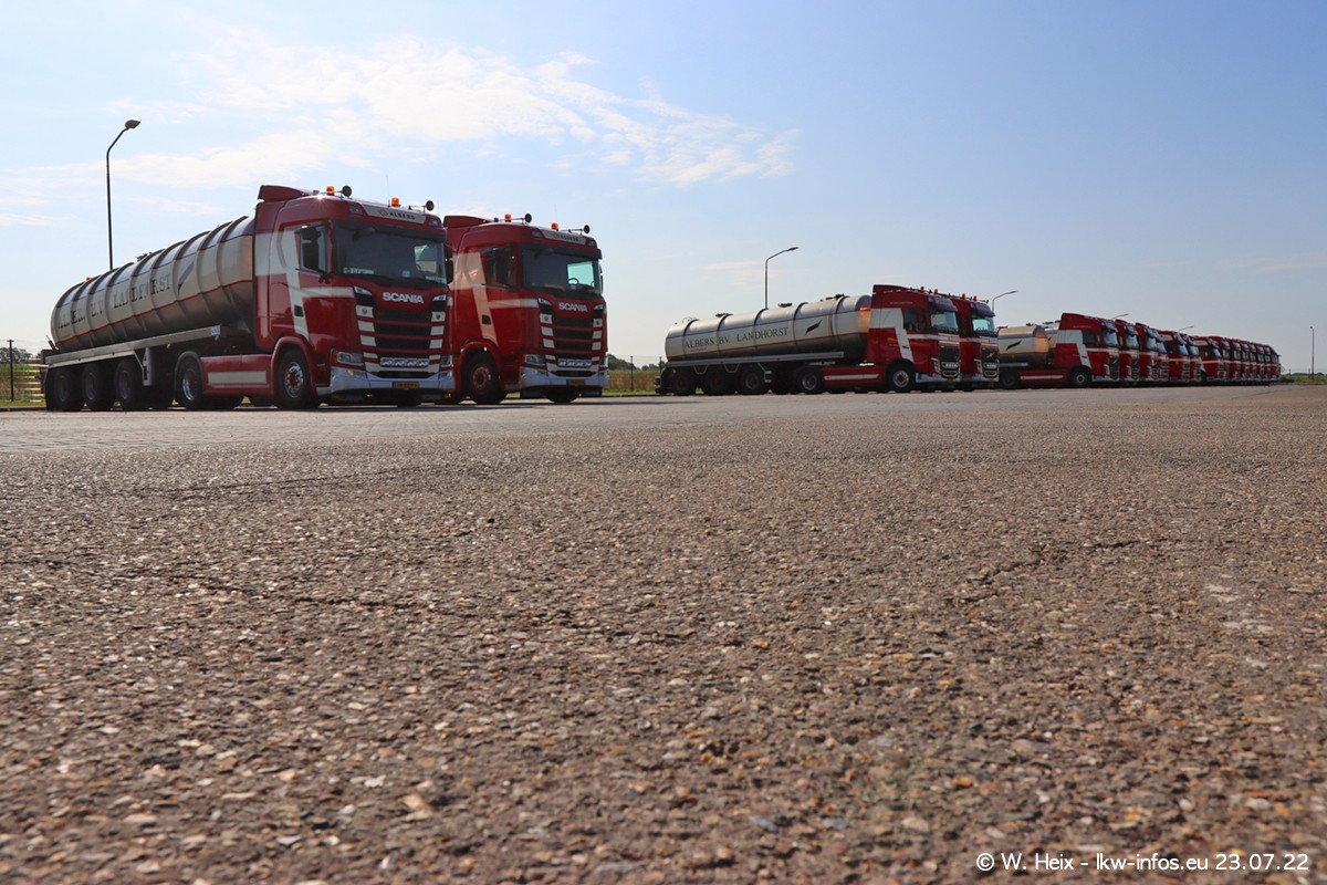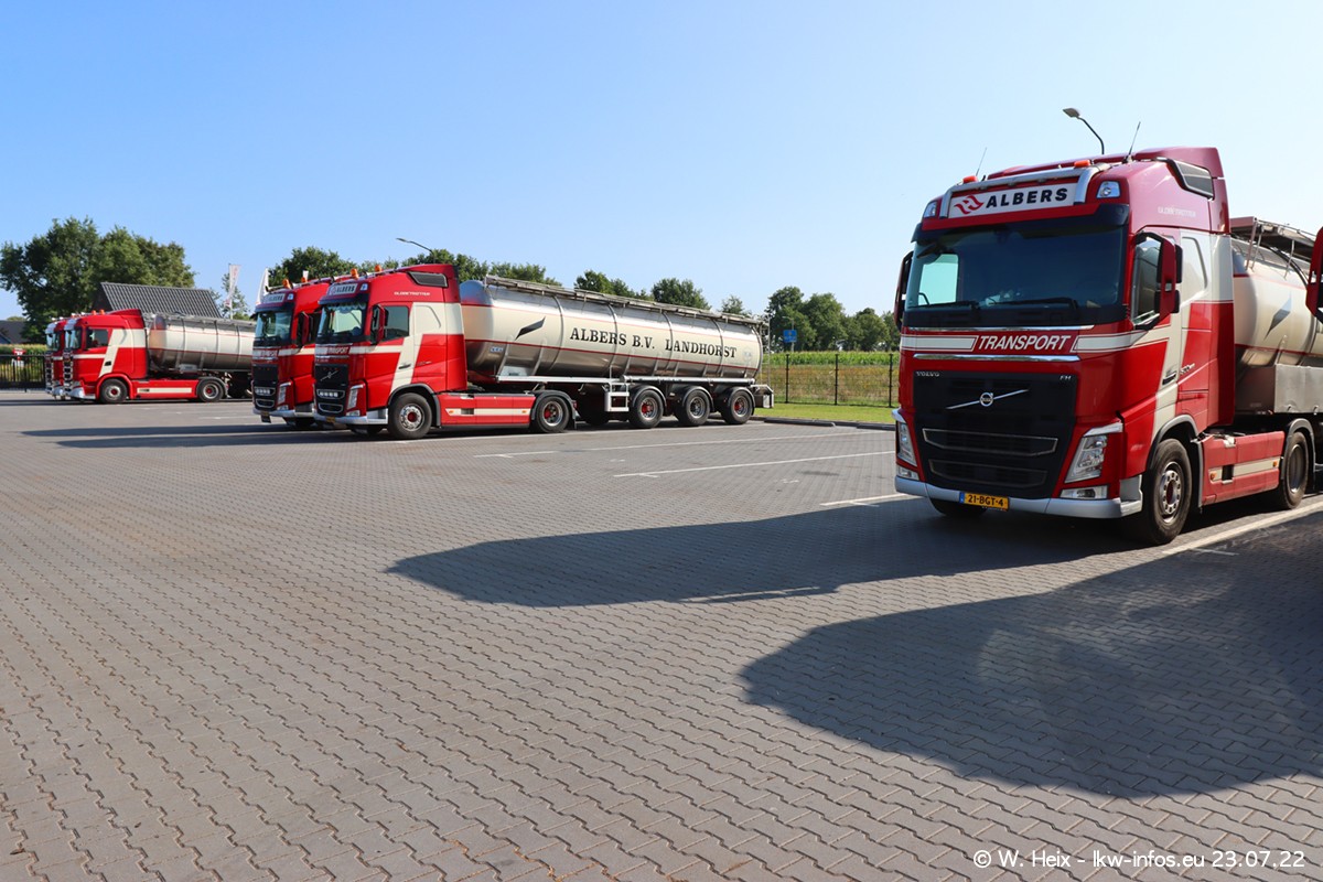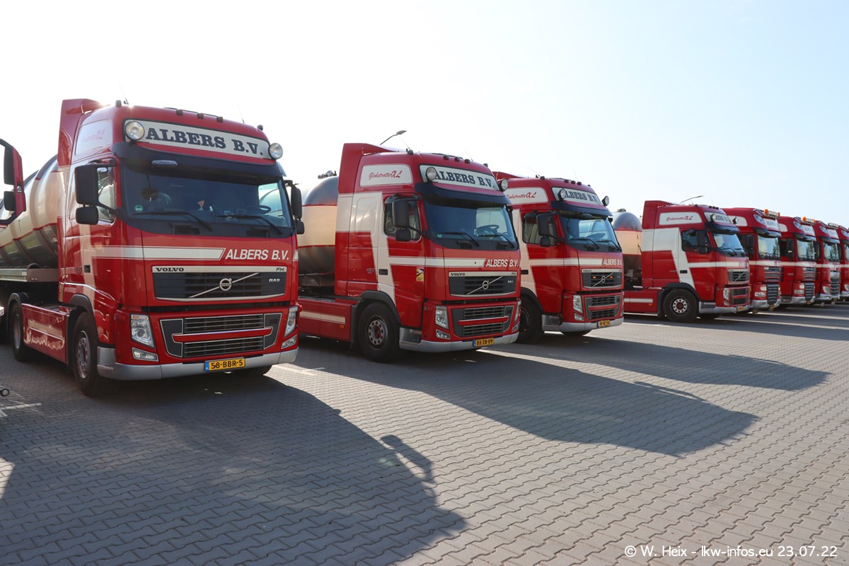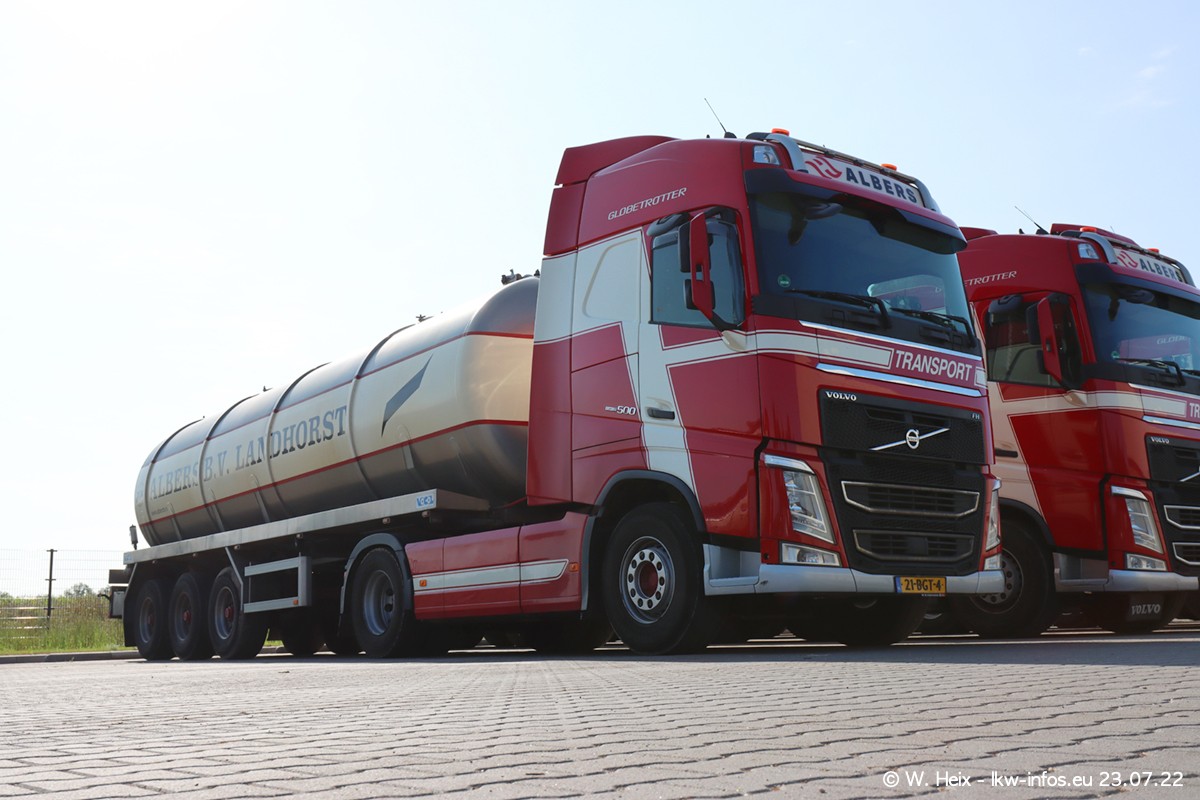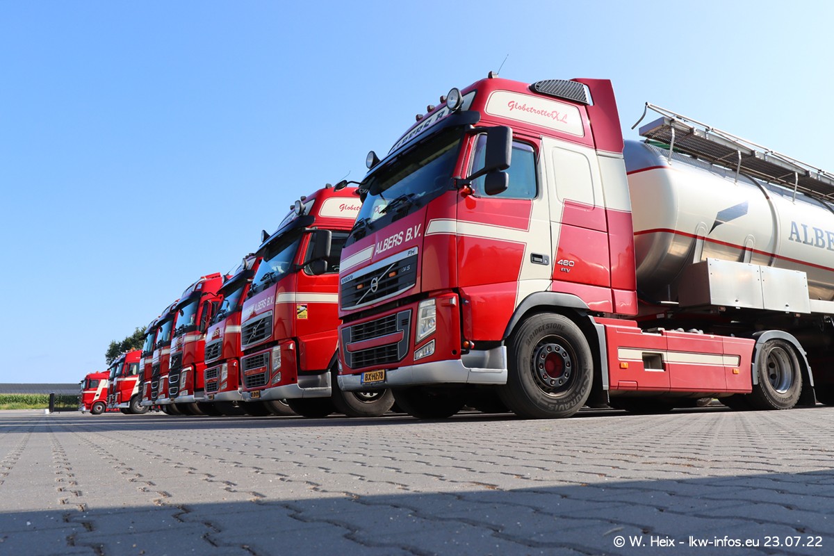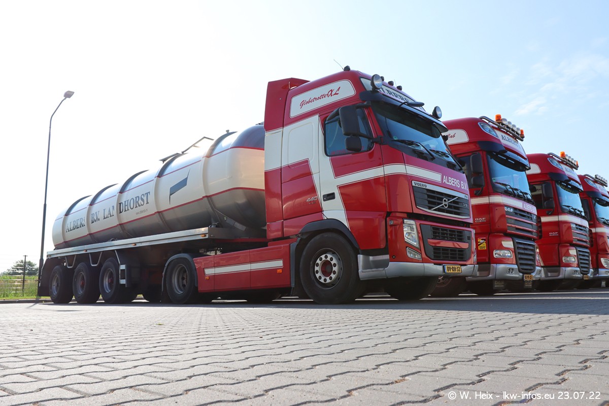 Ende 2021 ist der Fuhrpark von landhorst umgezogen nach Zeeland. Hier gibt es deutlich mehr Platz für die Fahrzeuge. Am Wochenende stehen alle LKW in einer Reihe, sortiert nach Hersteller und Alter. Ein großer Teil der LKW war zuhause. Schön, dass auch der alte VOLVO F10 samt passendem Auflieger mit auf dem Hof stand. Da die Fahrzeuge früh morgens wegen der Sonne genau falsch herum auf dem Gelände standen, war es etwas schwierig mit dem Fotografieren. Aber die Bilder sind trotzdem gut geworden.