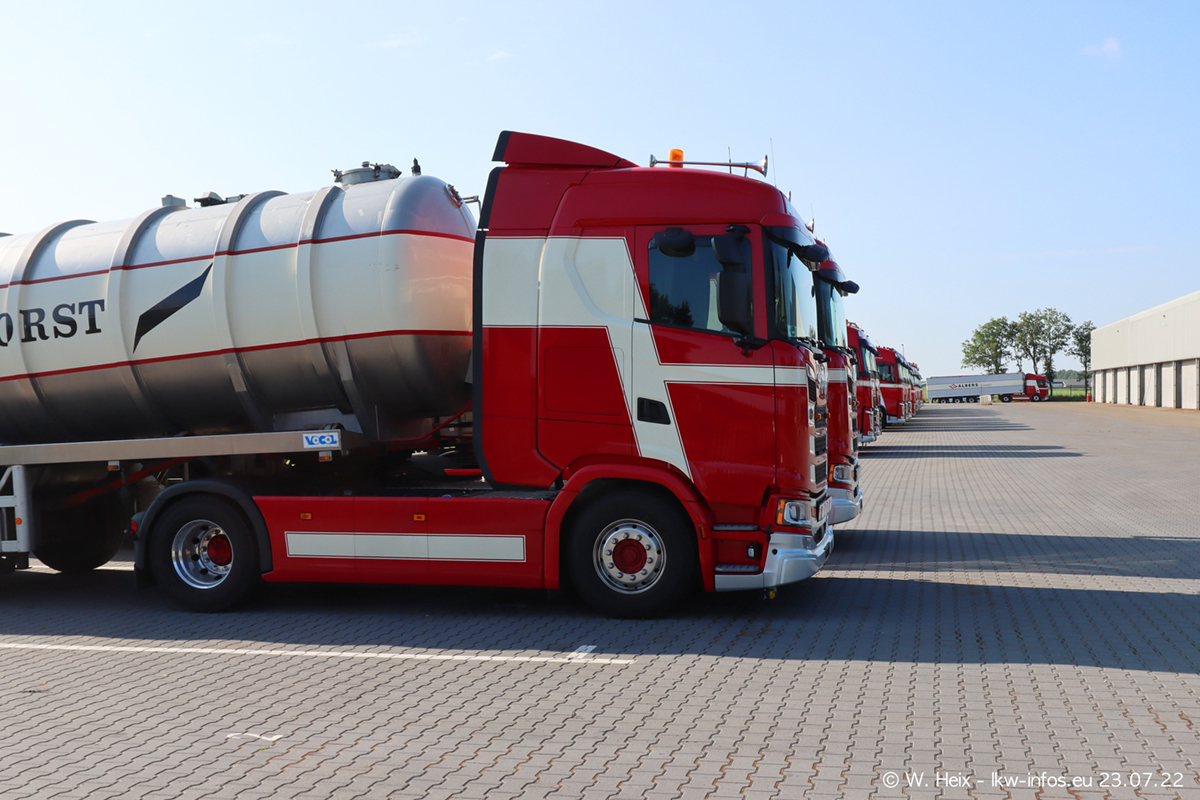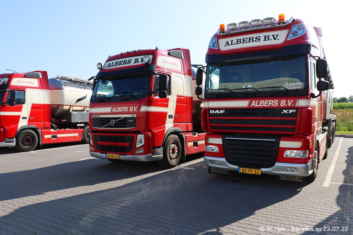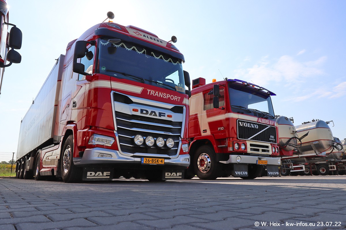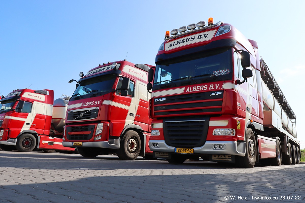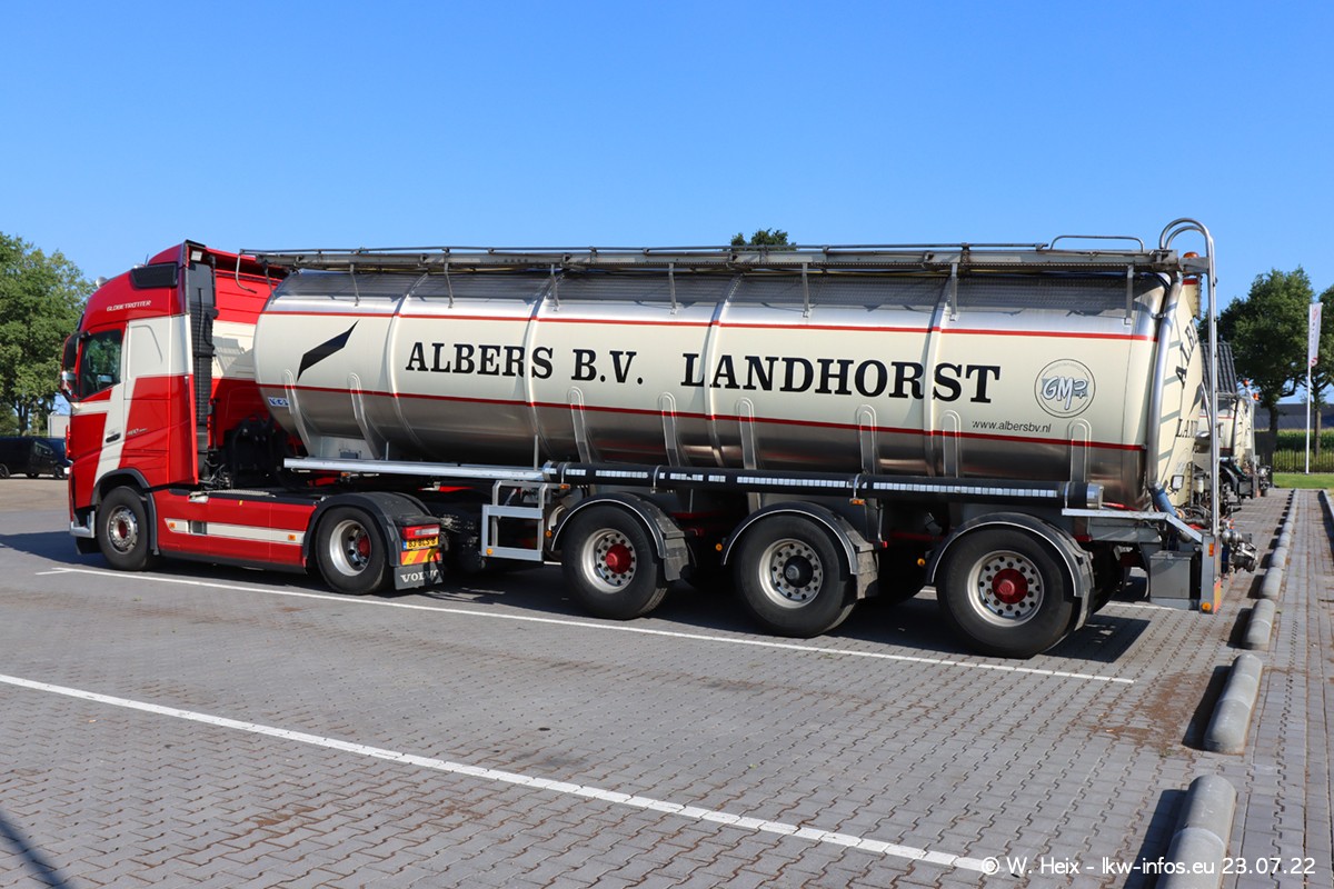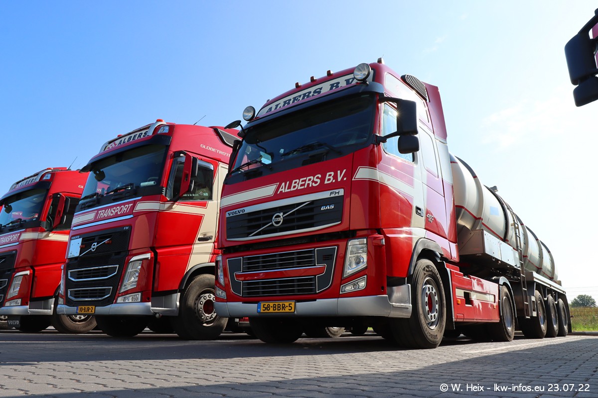 Ende 2021 ist der Fuhrpark von landhorst umgezogen nach Zeeland. Hier gibt es deutlich mehr Platz für die Fahrzeuge. Am Wochenende stehen alle LKW in einer Reihe, sortiert nach Hersteller und Alter. Ein großer Teil der LKW war zuhause. Schön, dass auch der alte VOLVO F10 samt passendem Auflieger mit auf dem Hof stand. Da die Fahrzeuge früh morgens wegen der Sonne genau falsch herum auf dem Gelände standen, war es etwas schwierig mit dem Fotografieren. Aber die Bilder sind trotzdem gut geworden.