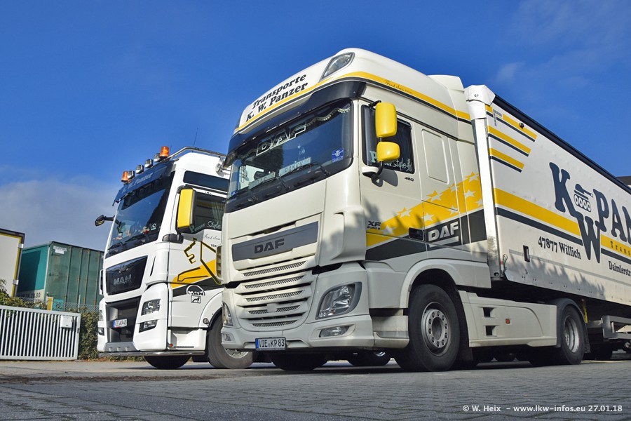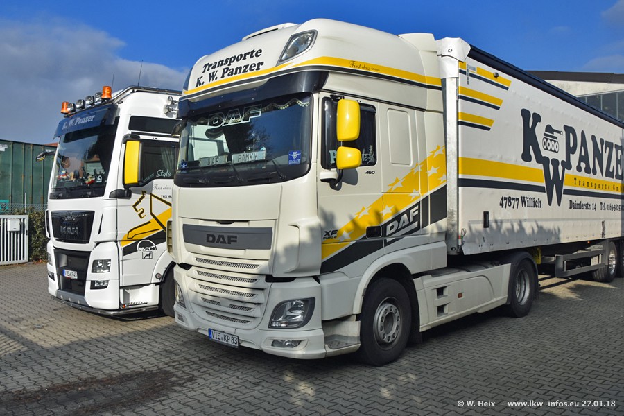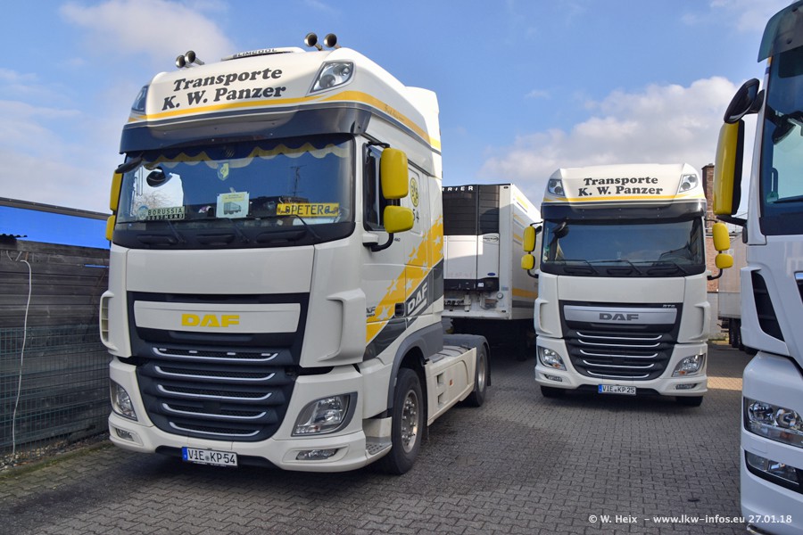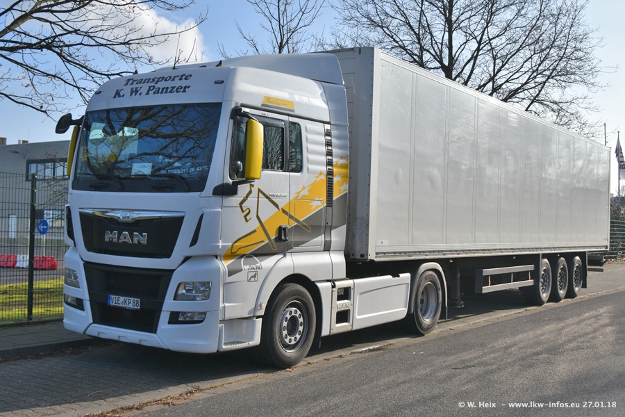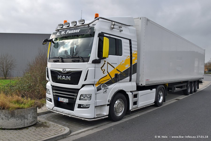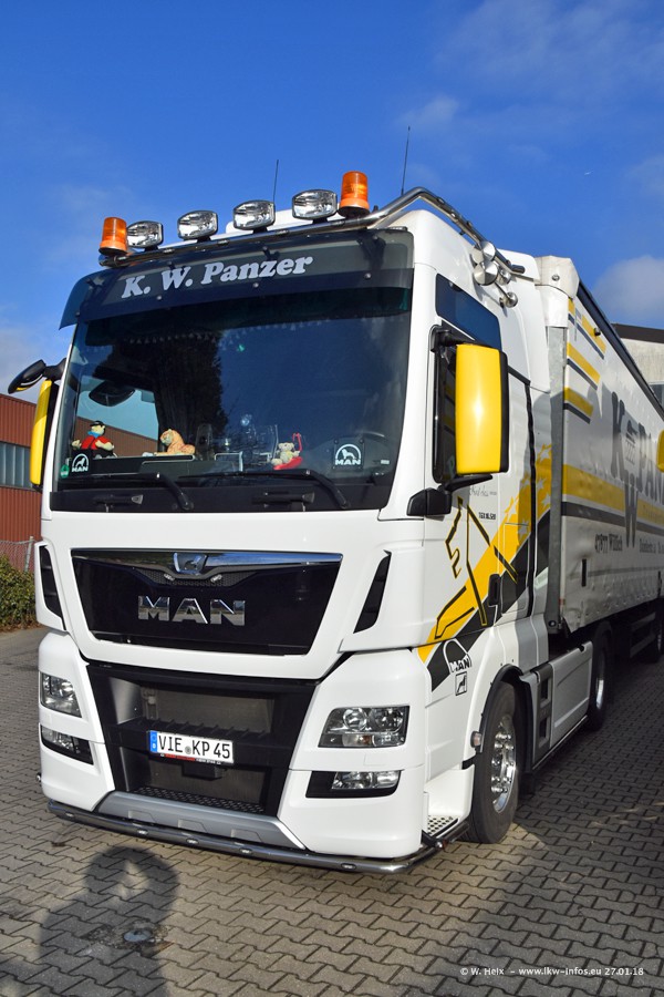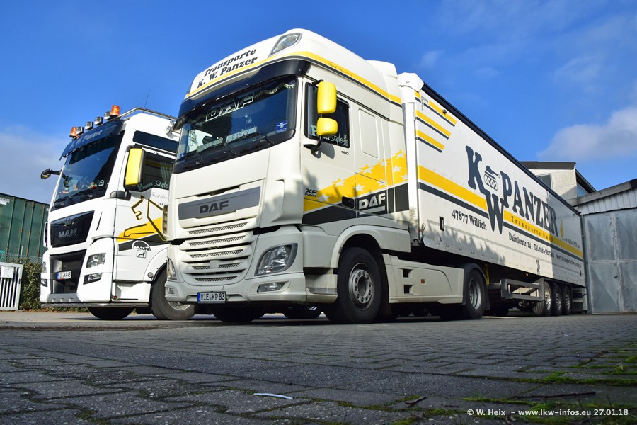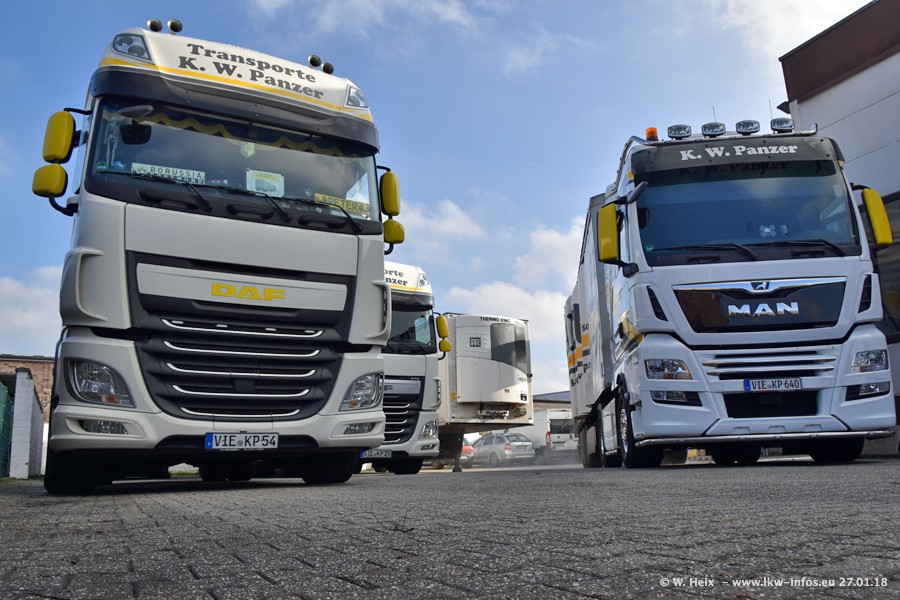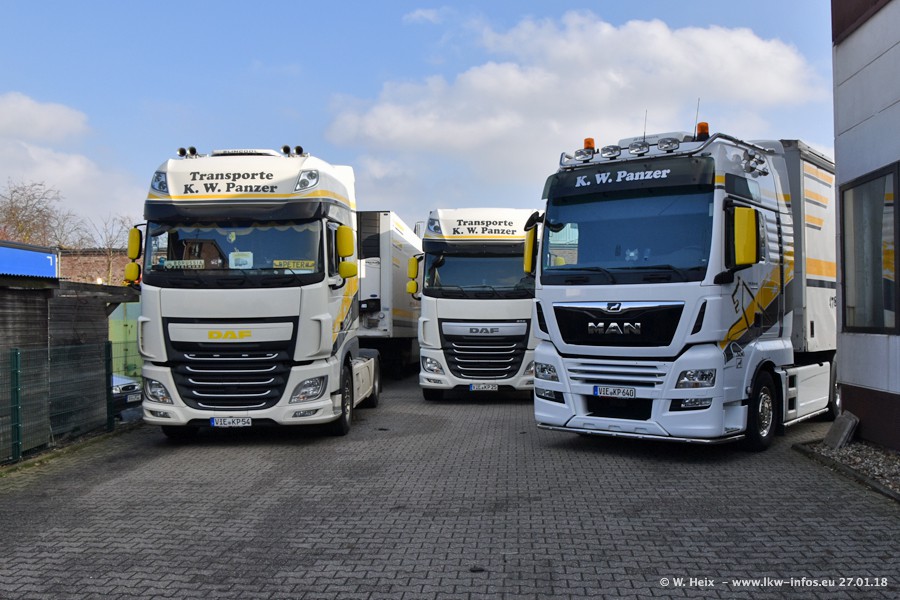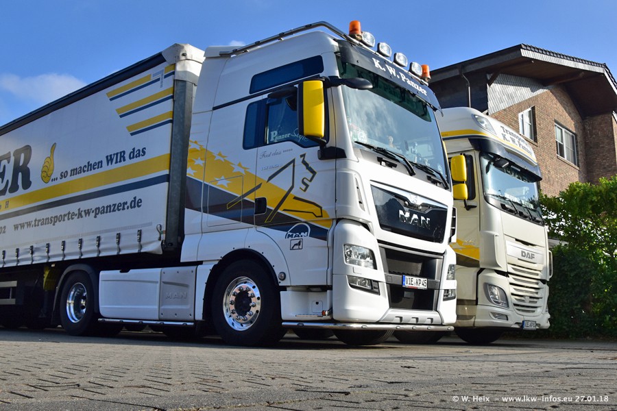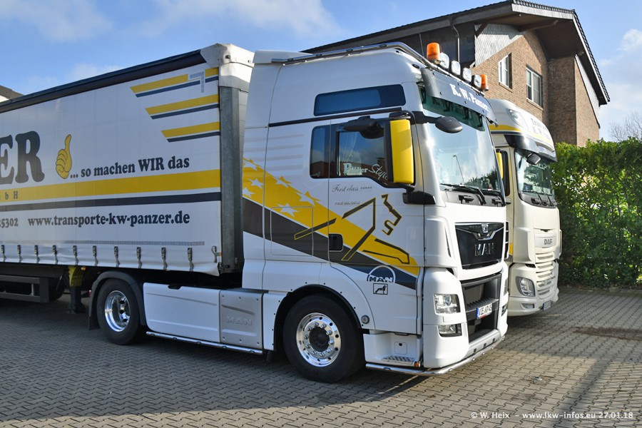 Der Fuhrpark besteht insgesamt aus rund 40 LKW. Das sind zwei Volvo FH 4 Euro, mehrere MAN TGX Euro 6 und DAF XF 105 / XF Euro 6. Da das Firmengelände für die Fahrzeuge viel zu klein ist, stehen die LKW an verschiedenen Stellen in Willich. Rund die Hälfte der LKW konnte ich fotografieren. Den MAN TGX 18.640 Euro 6, der auf den ersten Bildern zu sehen ist, gibt es als 1:87 Modell von Herpa. Die Modelle sind entweder über den Herpa Collectors Club oder direkt bei Panzer erhältlich, aber nicht im "normalen" Handel.