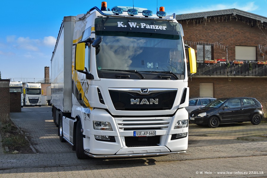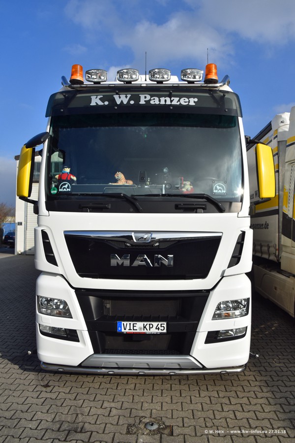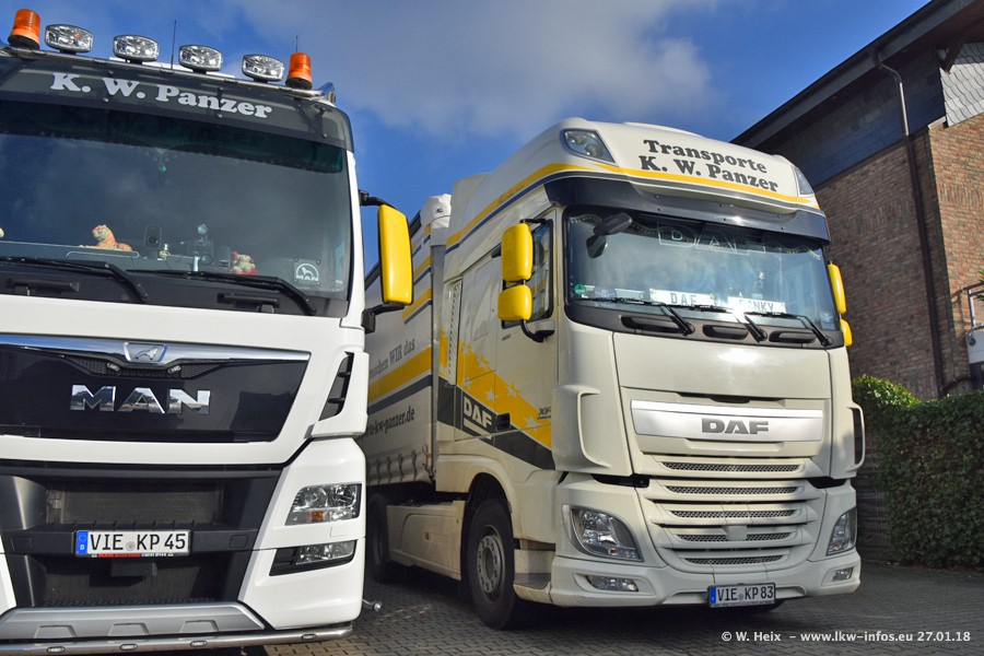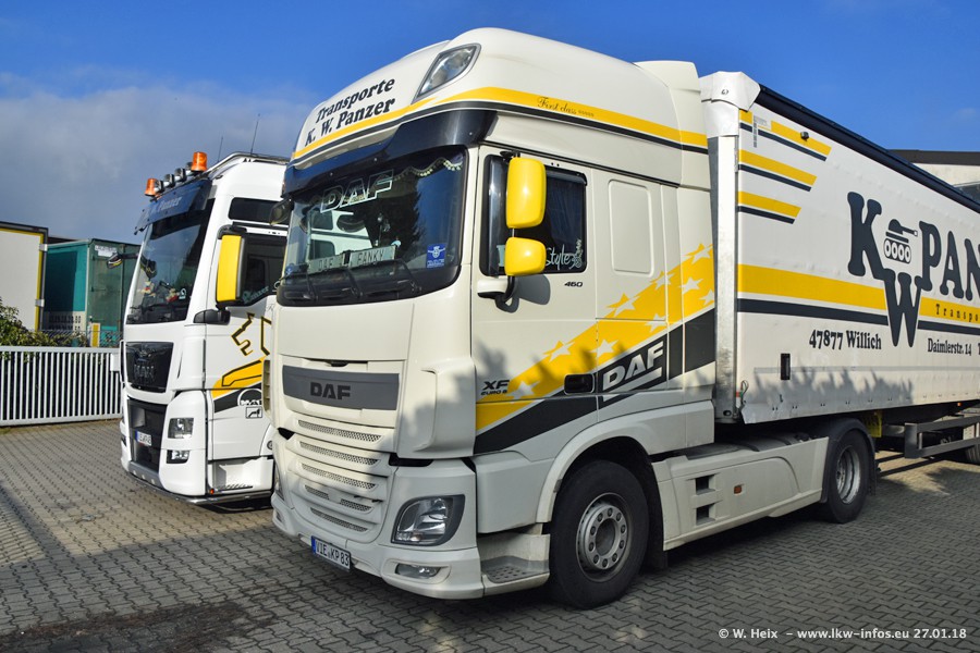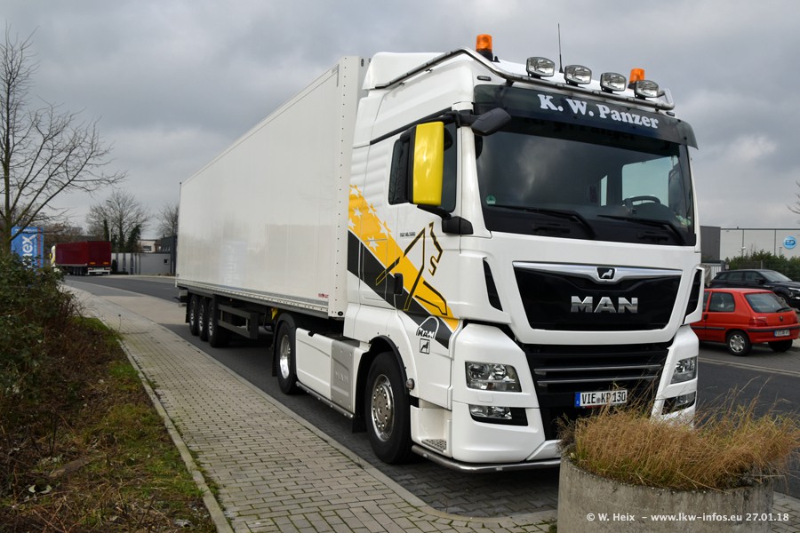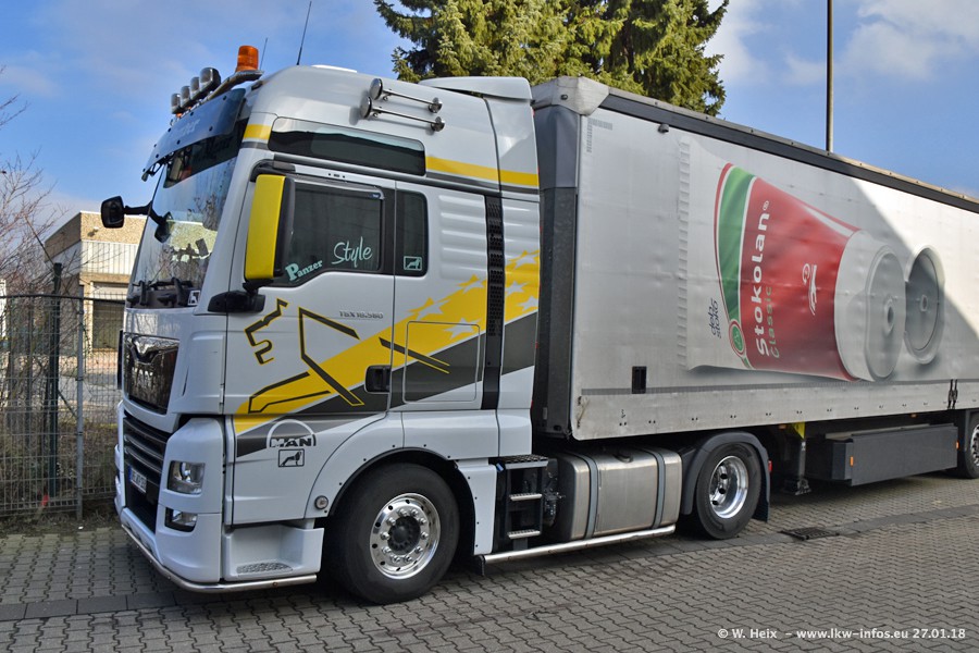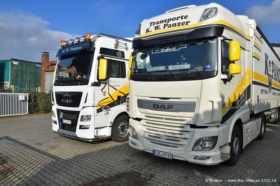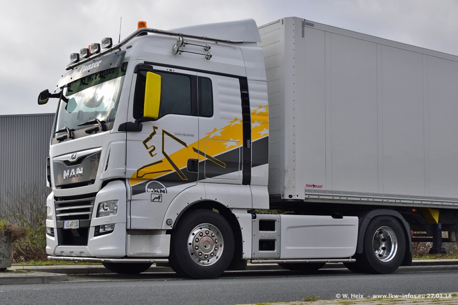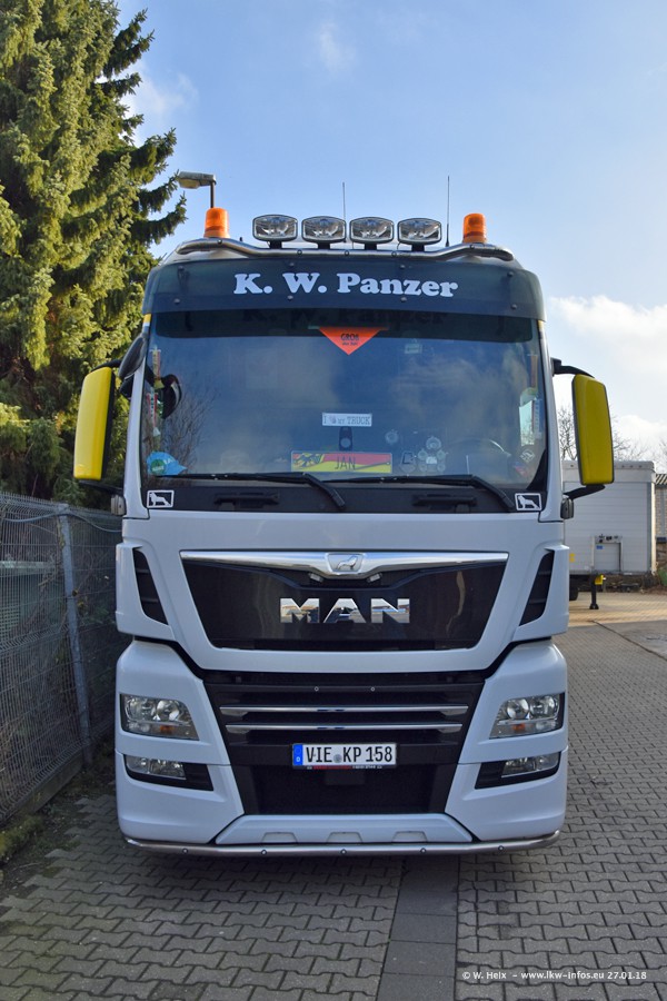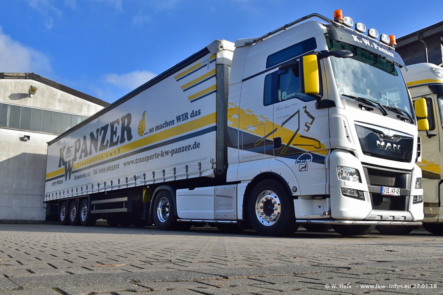 Der Fuhrpark besteht insgesamt aus rund 40 LKW. Das sind zwei Volvo FH 4 Euro, mehrere MAN TGX Euro 6 und DAF XF 105 / XF Euro 6. Da das Firmengelände für die Fahrzeuge viel zu klein ist, stehen die LKW an verschiedenen Stellen in Willich. Rund die Hälfte der LKW konnte ich fotografieren. Den MAN TGX 18.640 Euro 6, der auf den ersten Bildern zu sehen ist, gibt es als 1:87 Modell von Herpa. Die Modelle sind entweder über den Herpa Collectors Club oder direkt bei Panzer erhältlich, aber nicht im "normalen" Handel.