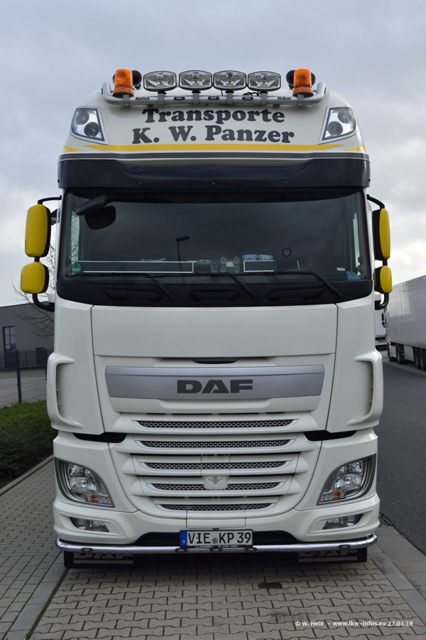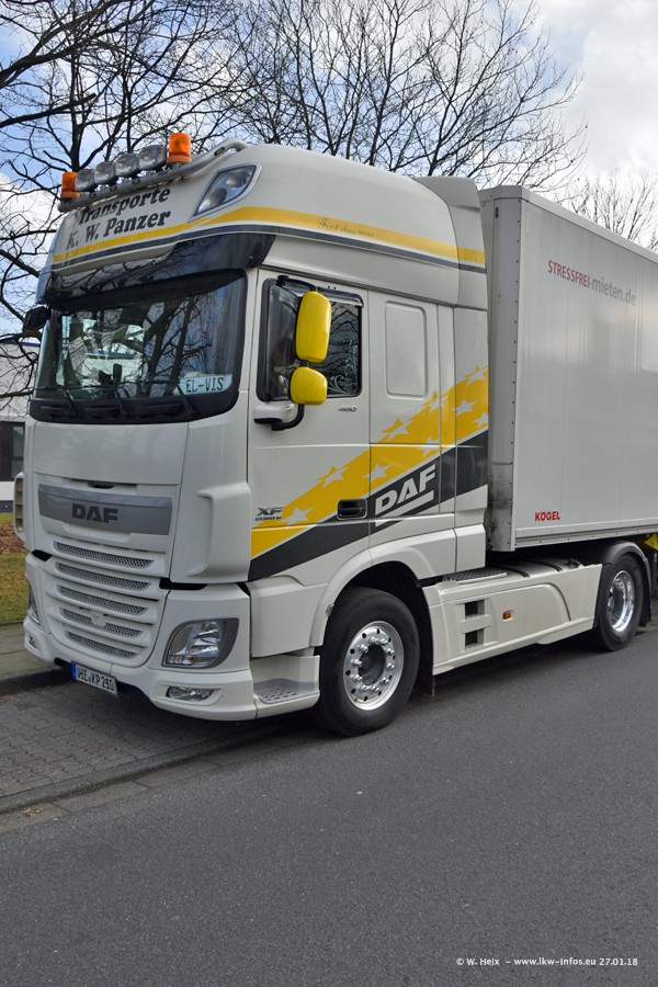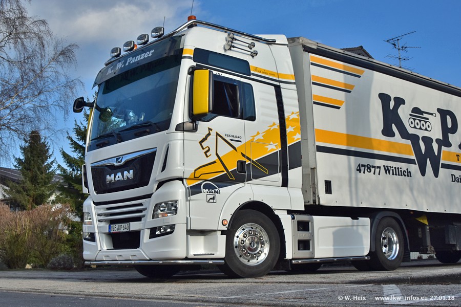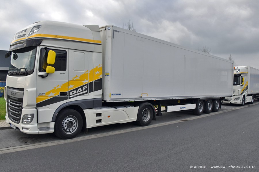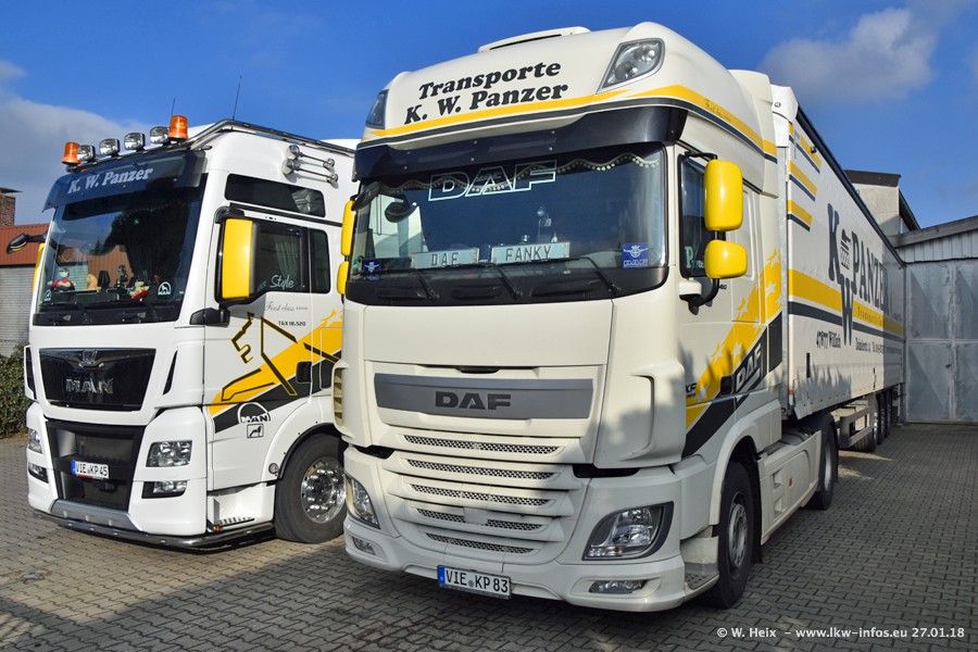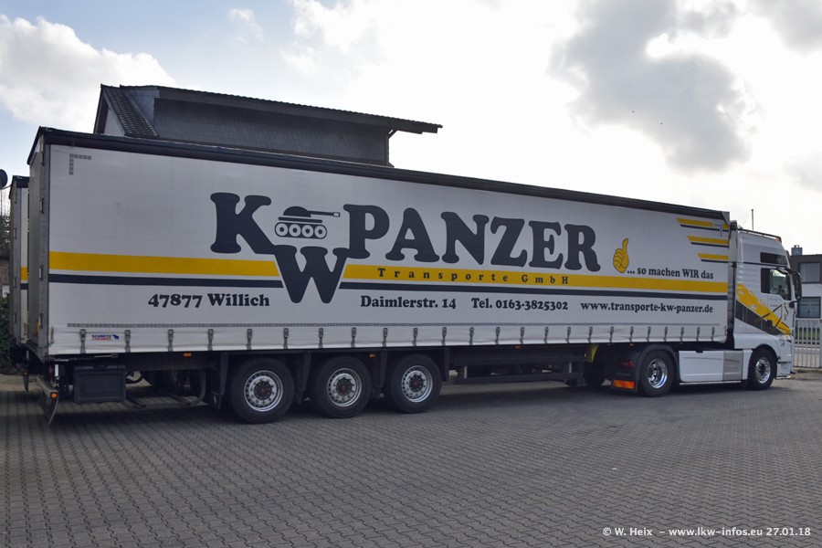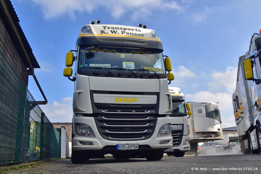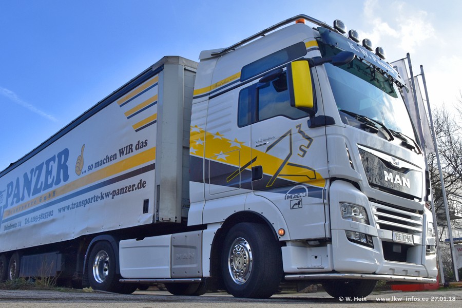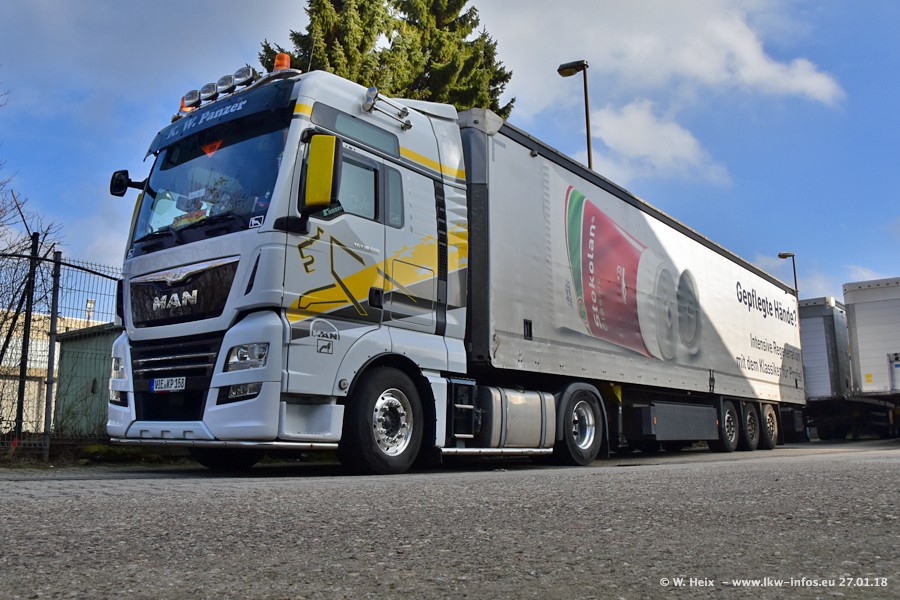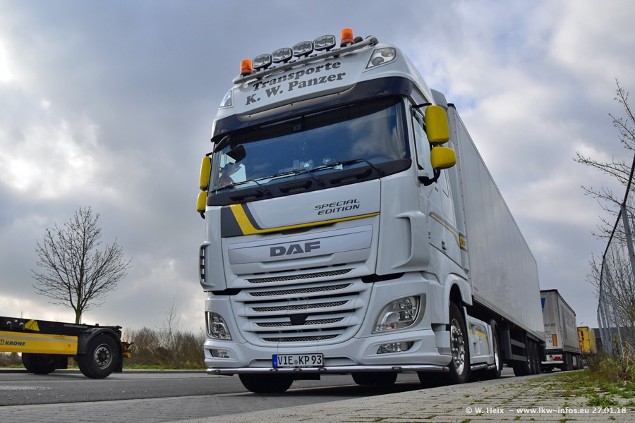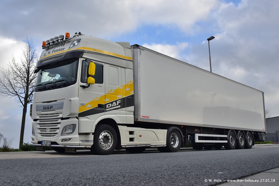 Der Fuhrpark besteht insgesamt aus rund 40 LKW. Das sind zwei Volvo FH 4 Euro, mehrere MAN TGX Euro 6 und DAF XF 105 / XF Euro 6. Da das Firmengelände für die Fahrzeuge viel zu klein ist, stehen die LKW an verschiedenen Stellen in Willich. Rund die Hälfte der LKW konnte ich fotografieren. Den MAN TGX 18.640 Euro 6, der auf den ersten Bildern zu sehen ist, gibt es als 1:87 Modell von Herpa. Die Modelle sind entweder über den Herpa Collectors Club oder direkt bei Panzer erhältlich, aber nicht im "normalen" Handel.