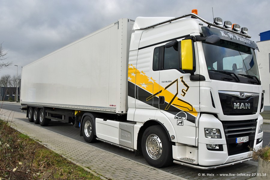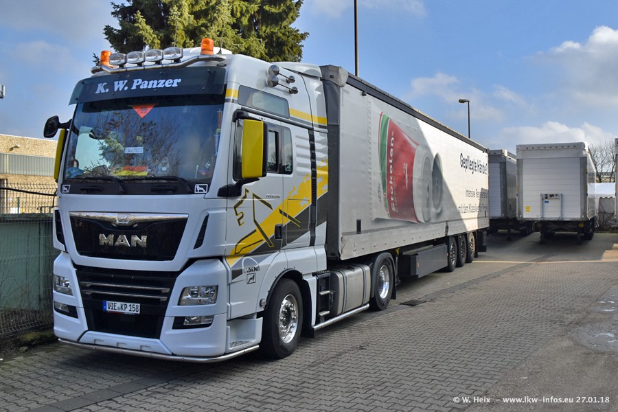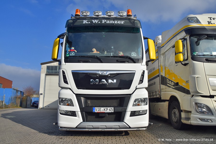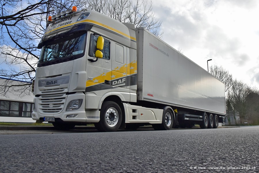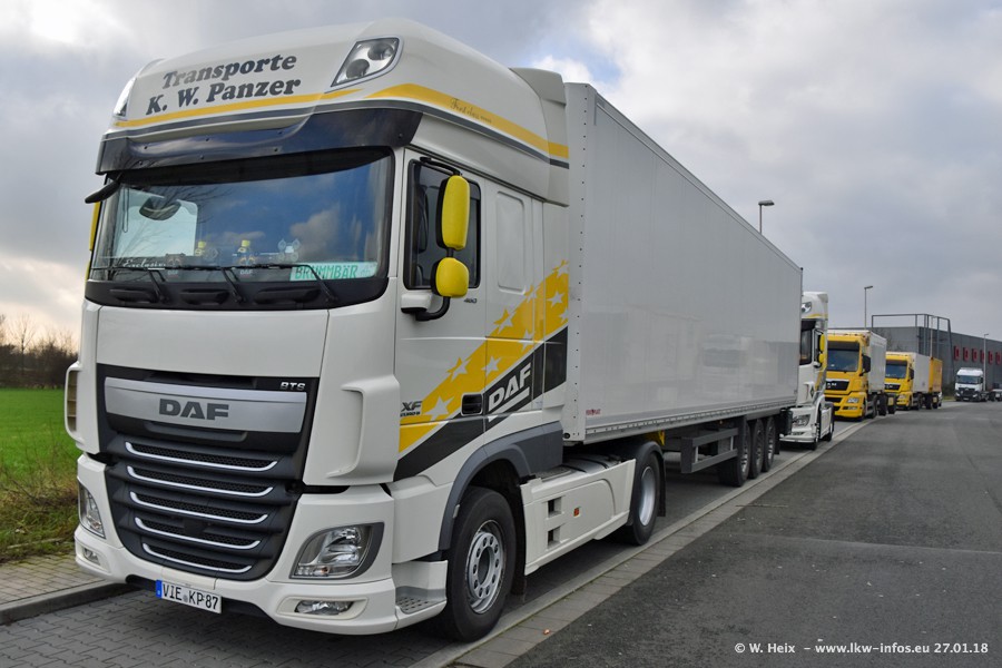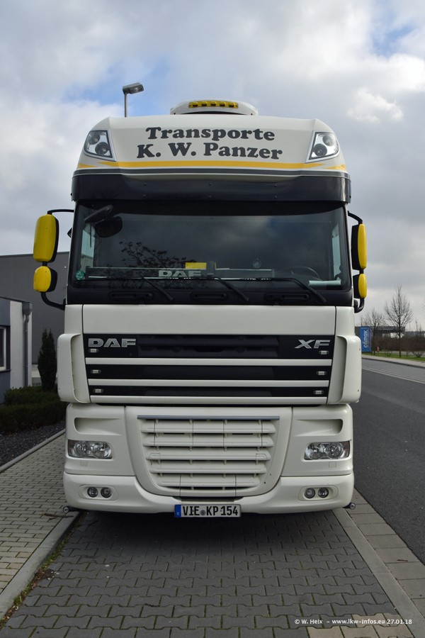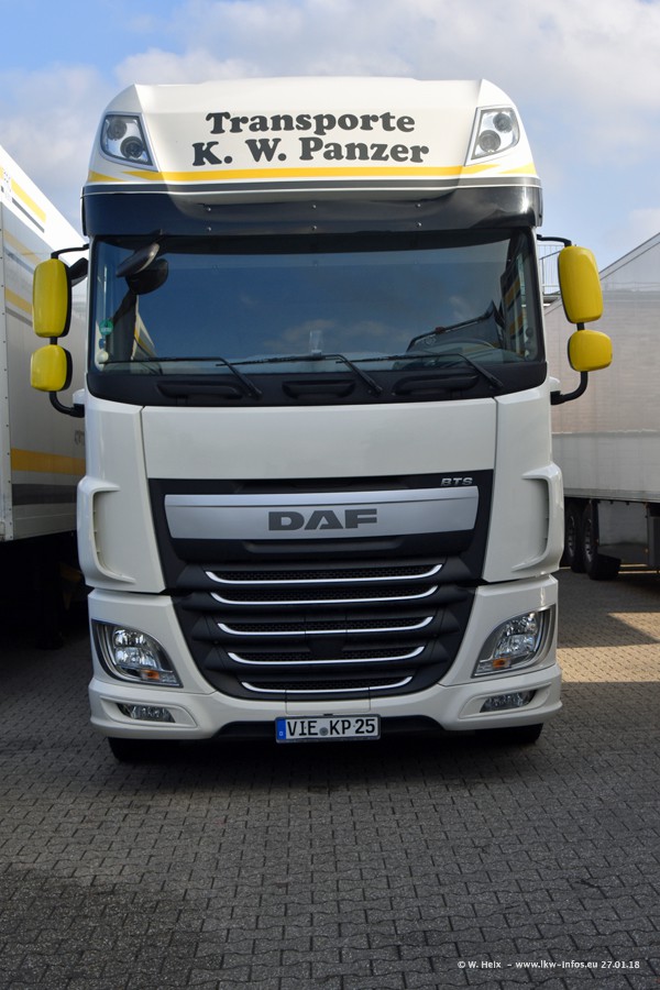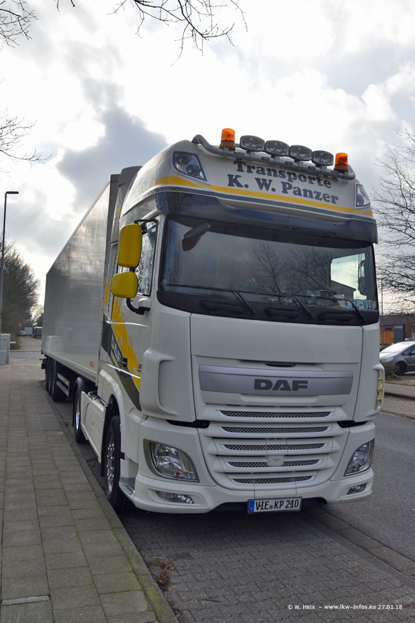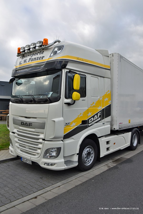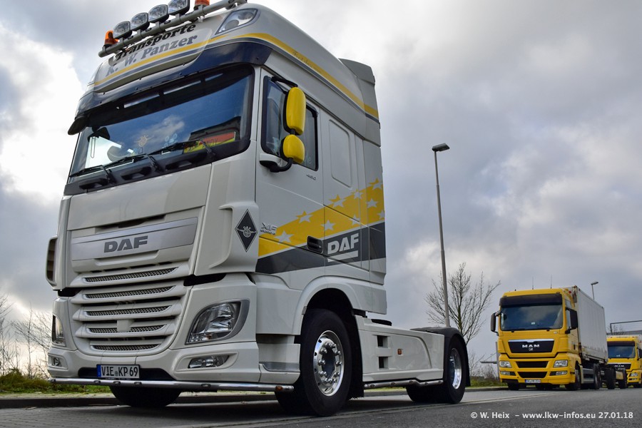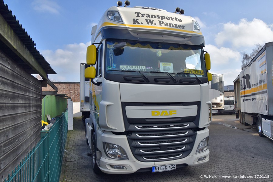Der Fuhrpark besteht insgesamt aus rund 40 LKW. Das sind zwei Volvo FH 4 Euro, mehrere MAN TGX Euro 6 und DAF XF 105 / XF Euro 6. Da das Firmengelände für die Fahrzeuge viel zu klein ist, stehen die LKW an verschiedenen Stellen in Willich. Rund die Hälfte der LKW konnte ich fotografieren. Den MAN TGX 18.640 Euro 6, der auf den ersten Bildern zu sehen ist, gibt es als 1:87 Modell von Herpa. Die Modelle sind entweder über den Herpa Collectors Club oder direkt bei Panzer erhältlich, aber nicht im "normalen" Handel.