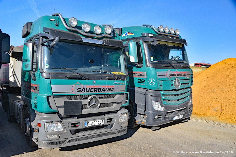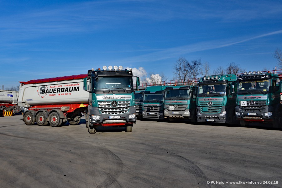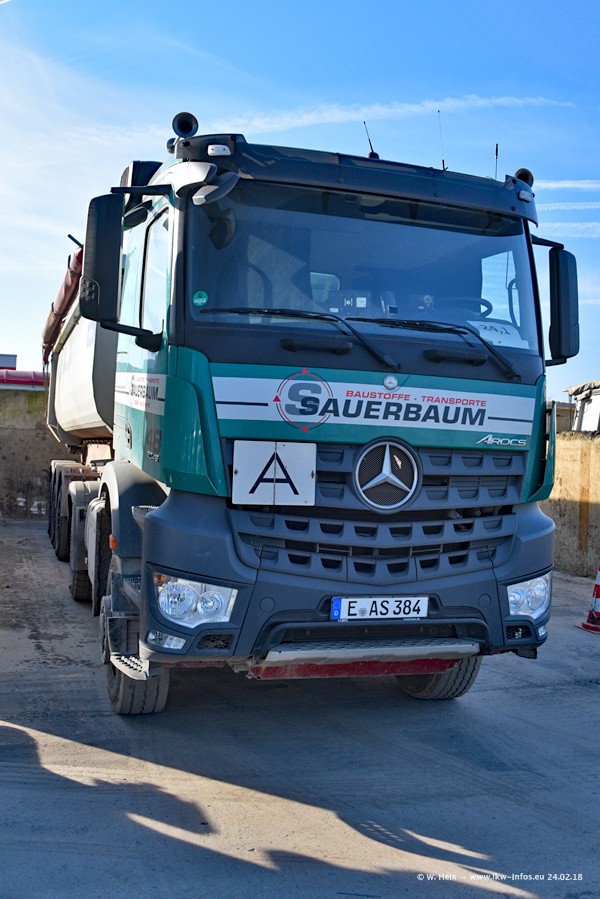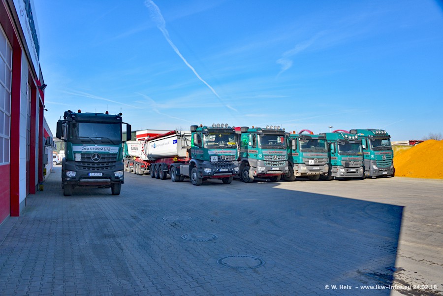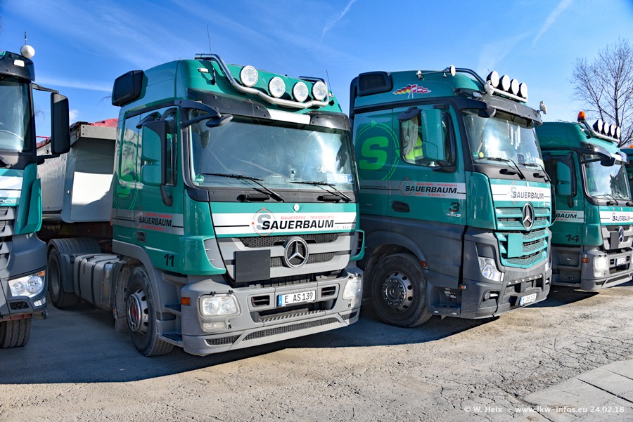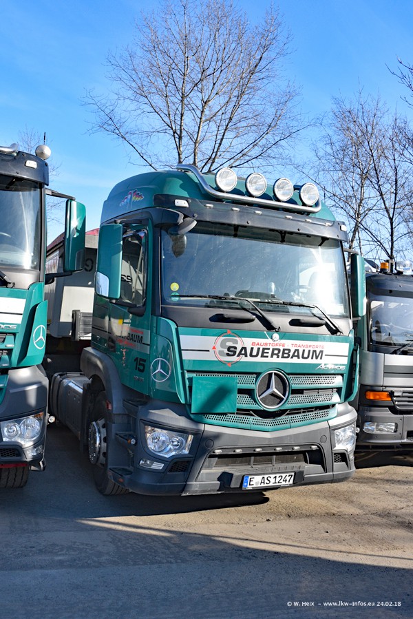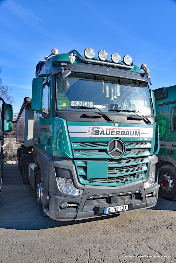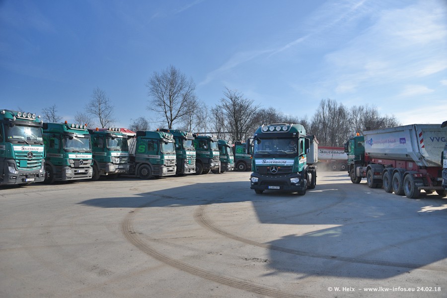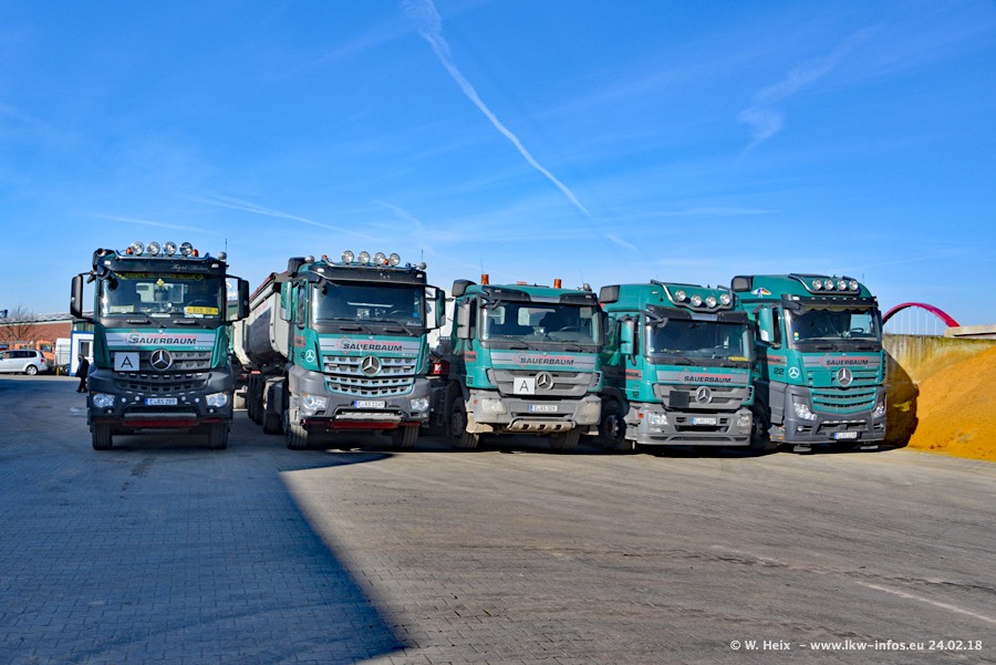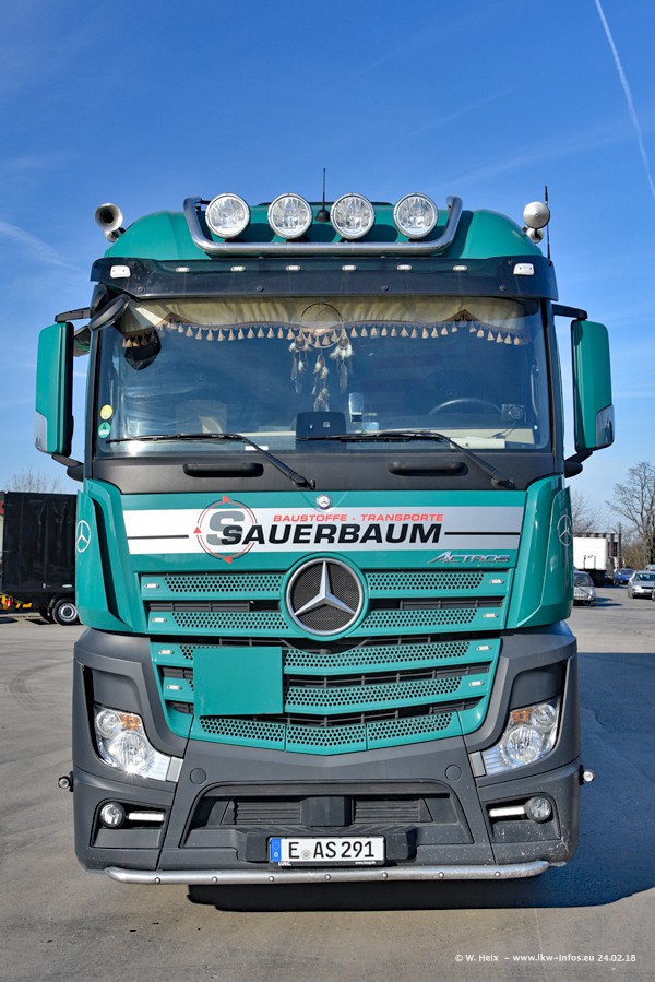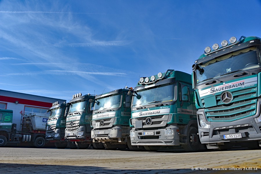 Der Fuhrpark von Sauerbaum besteht aus rund 50 LKW. Das sind 2 MAN TGS Euro 6 und alle anderen Fahrzeuge sind von Mercedes-Benz: Actros 3 und 4 sowie Arocs bei den Allrad-Zugmaschinen.