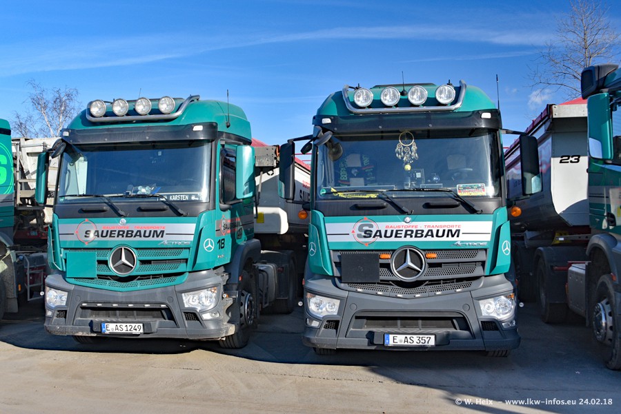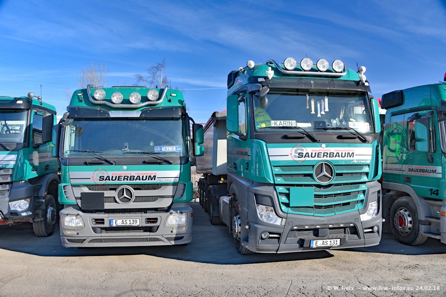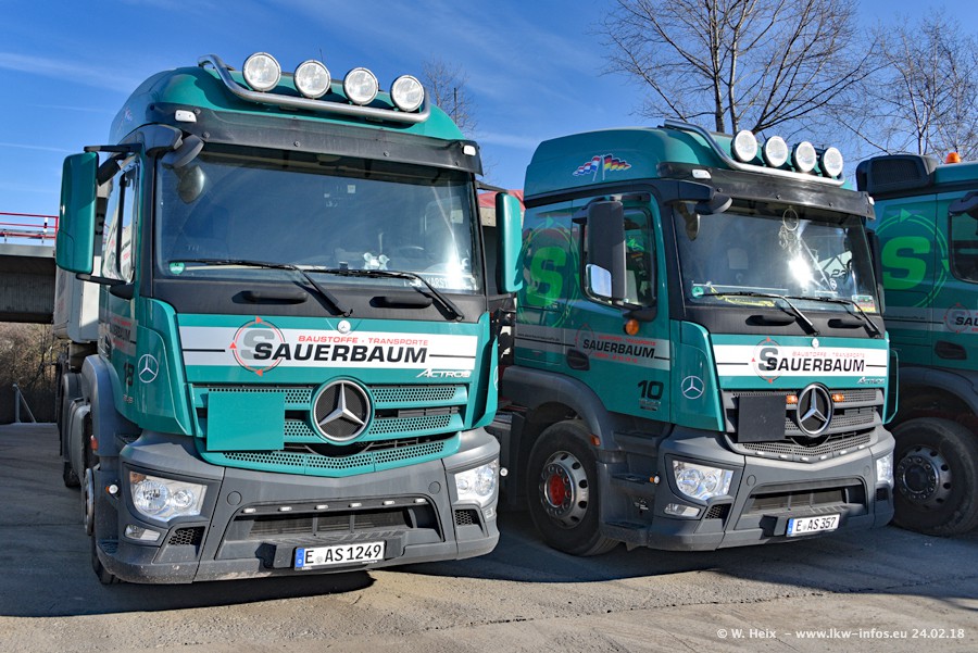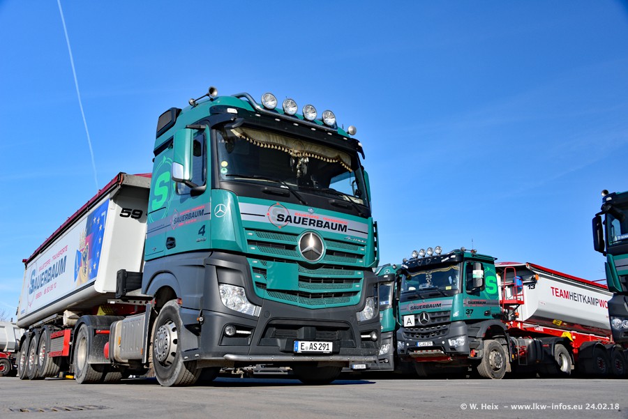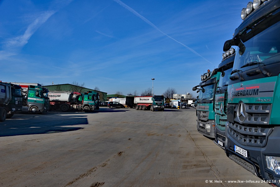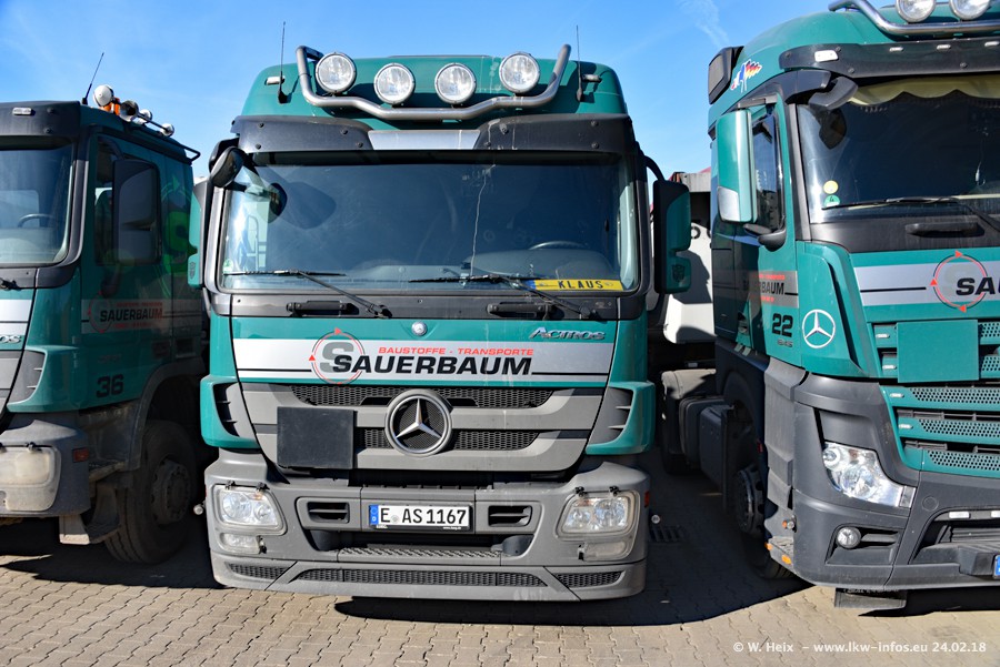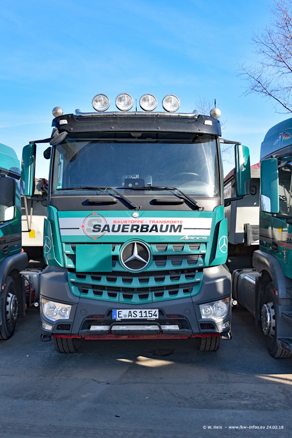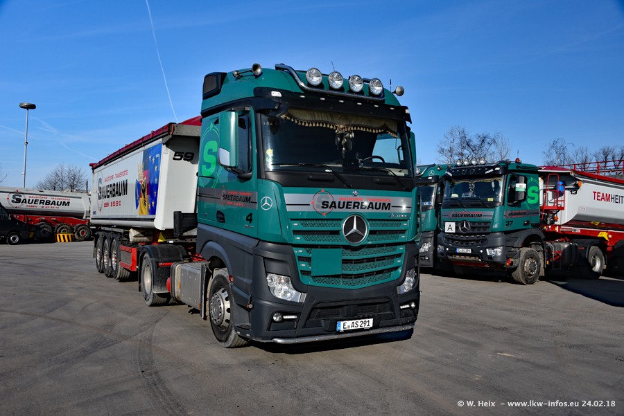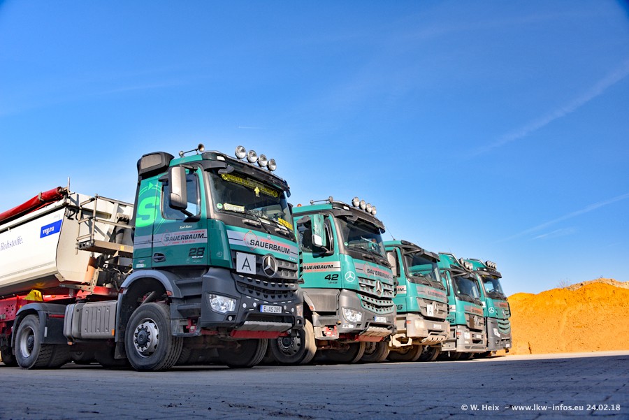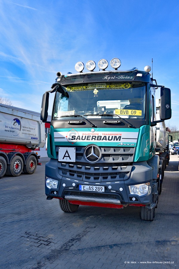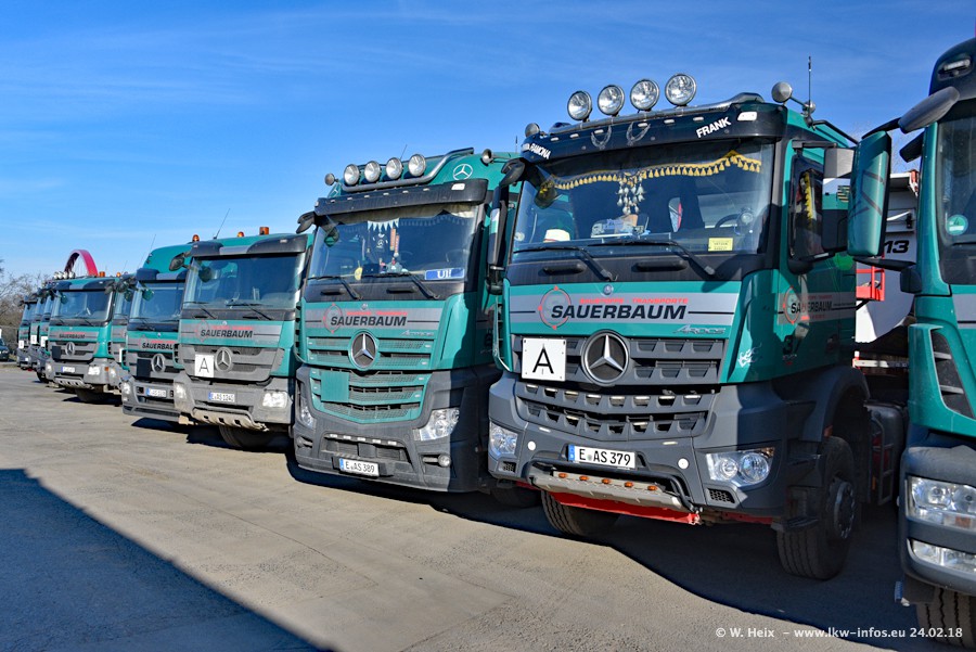 Der Fuhrpark von Sauerbaum besteht aus rund 50 LKW. Das sind 2 MAN TGS Euro 6 und alle anderen Fahrzeuge sind von Mercedes-Benz: Actros 3 und 4 sowie Arocs bei den Allrad-Zugmaschinen.