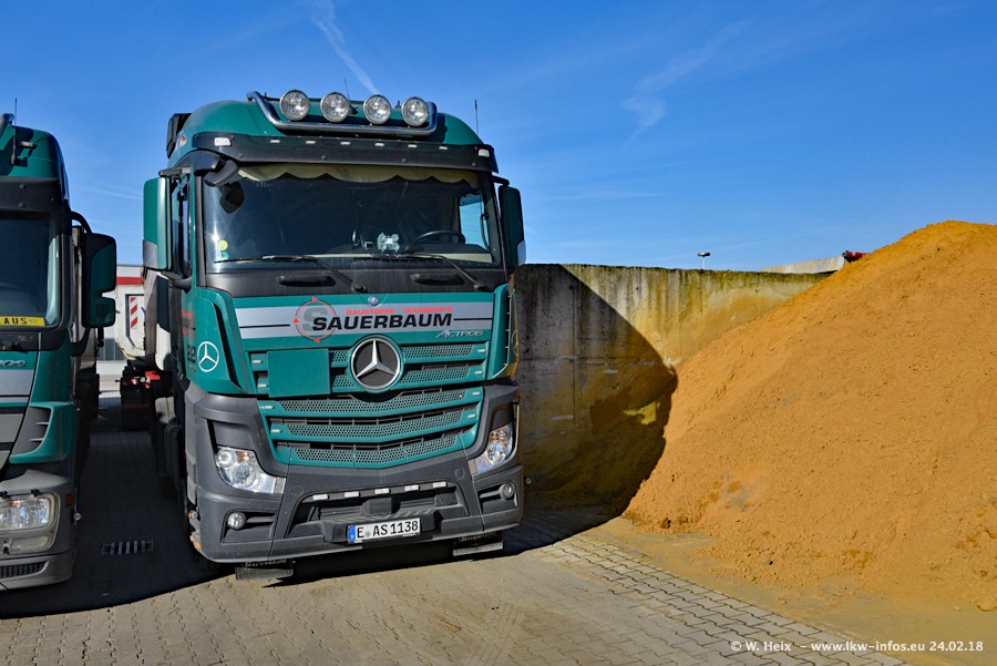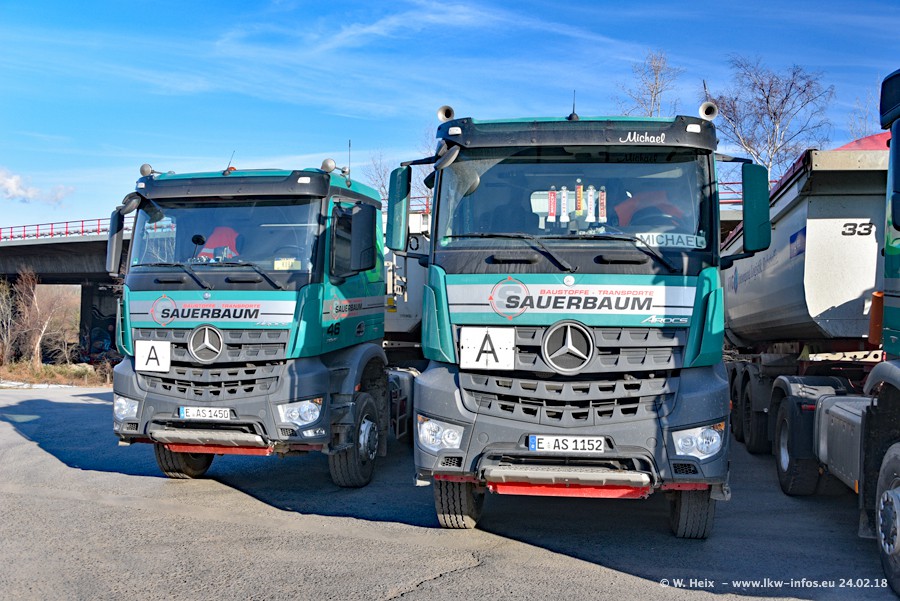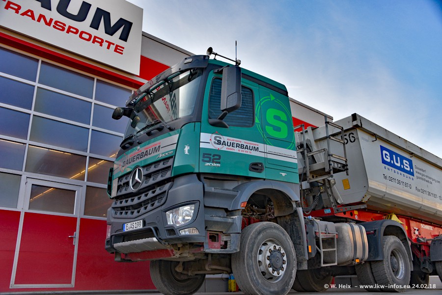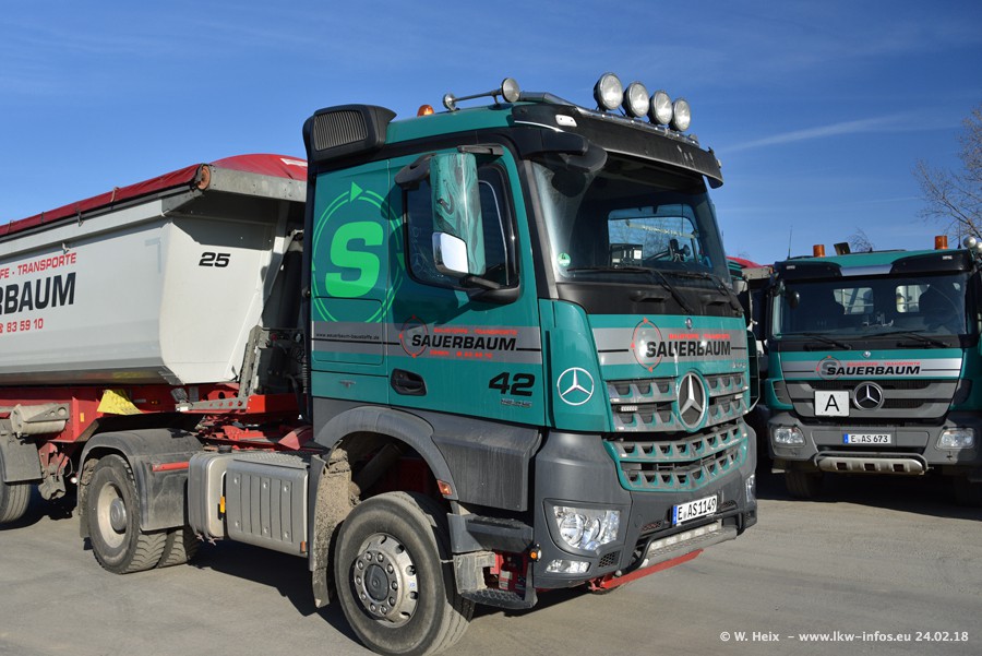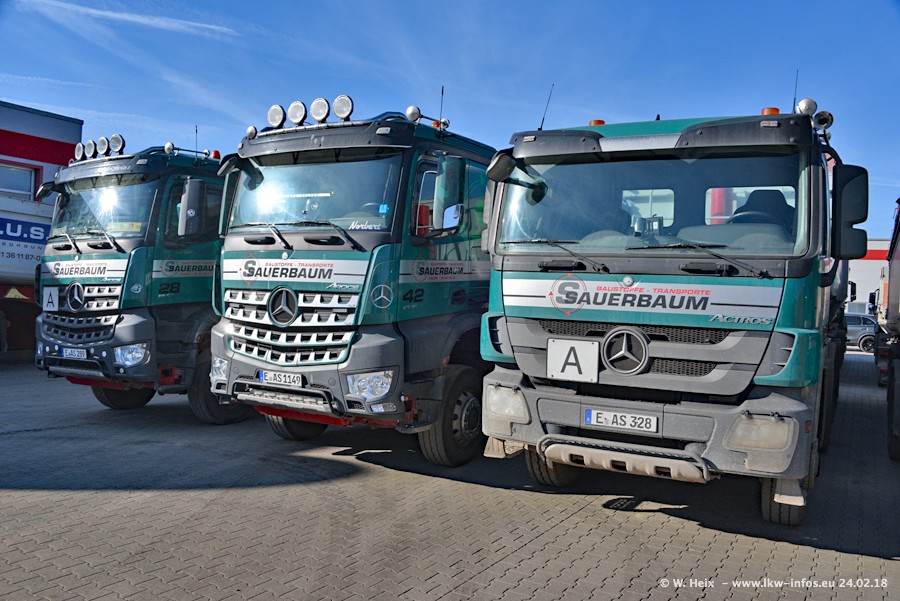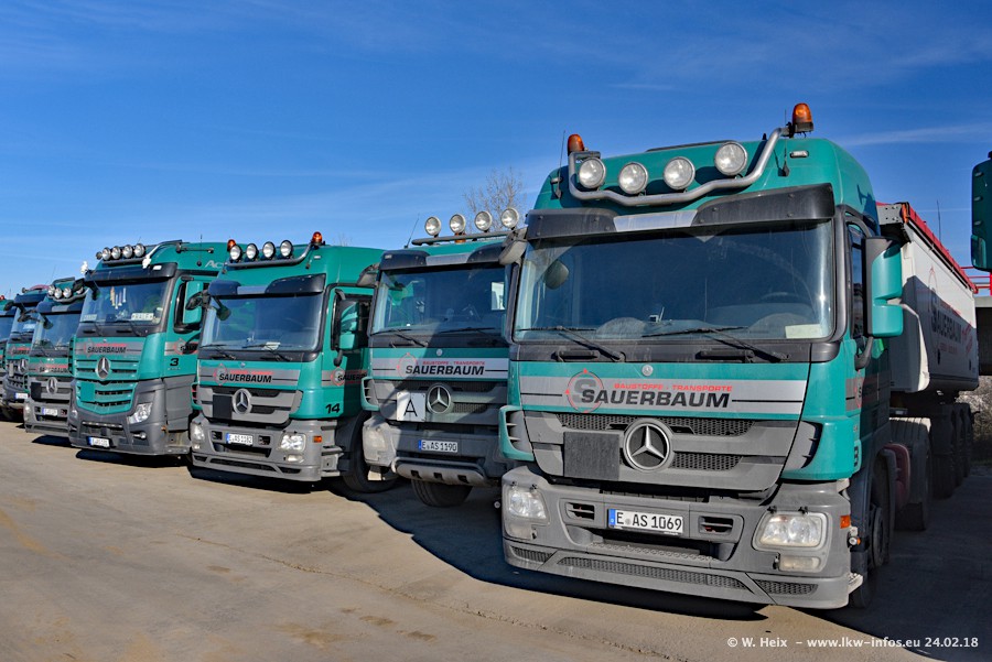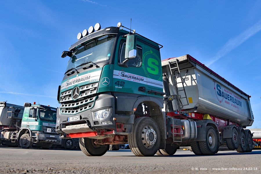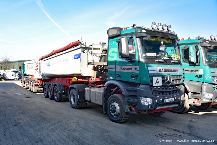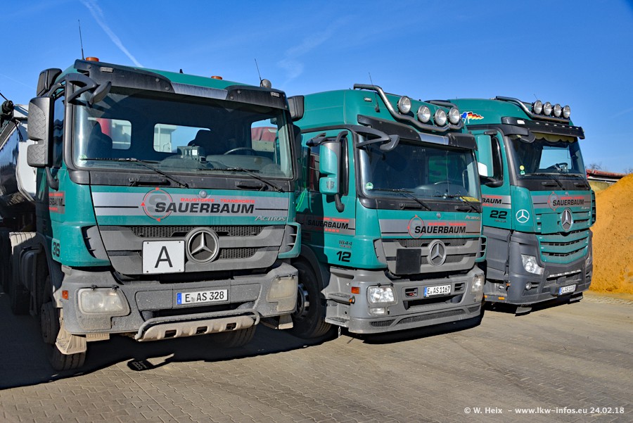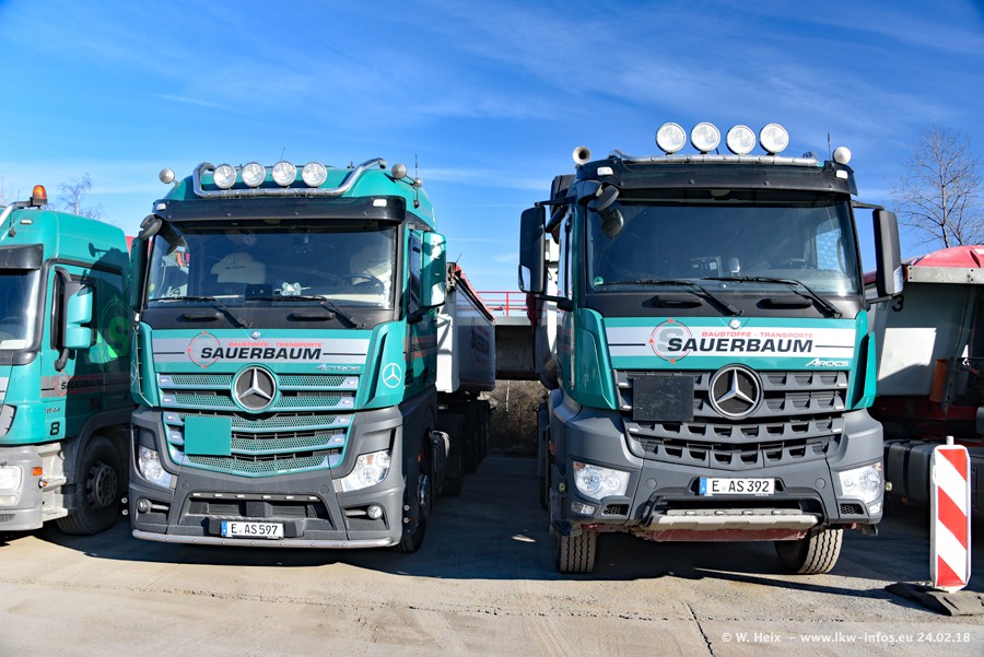 Der Fuhrpark von Sauerbaum besteht aus rund 50 LKW. Das sind 2 MAN TGS Euro 6 und alle anderen Fahrzeuge sind von Mercedes-Benz: Actros 3 und 4 sowie Arocs bei den Allrad-Zugmaschinen.