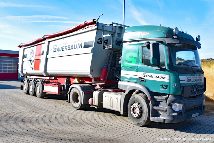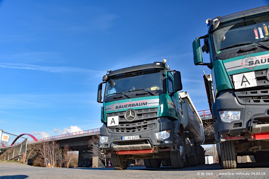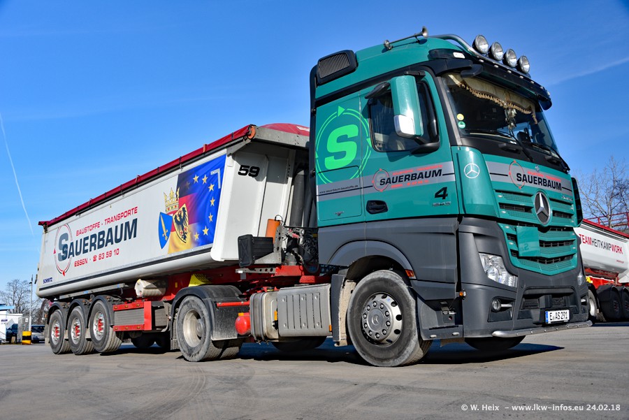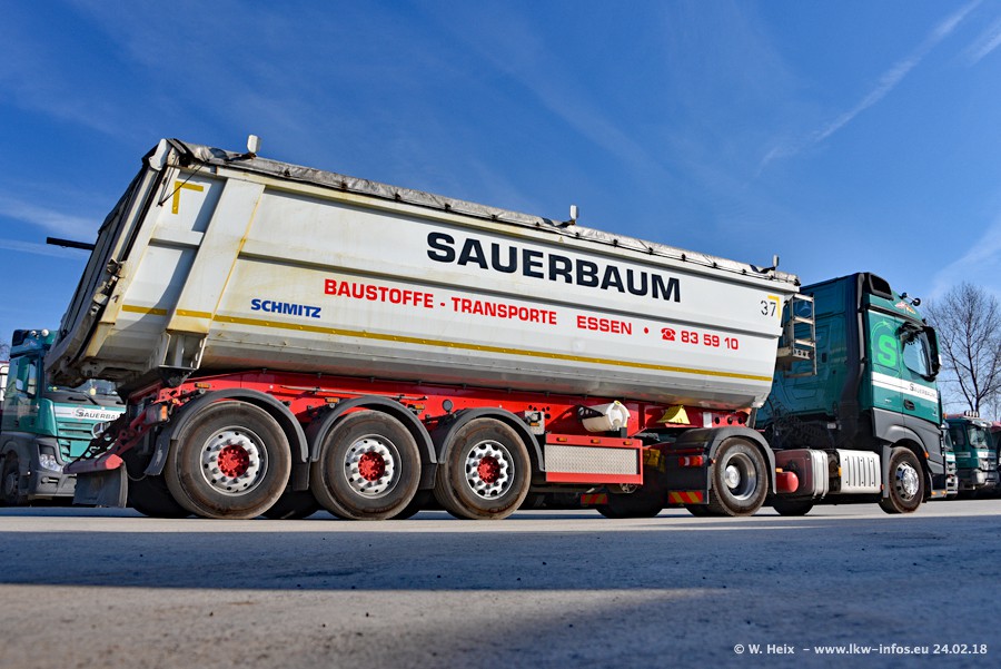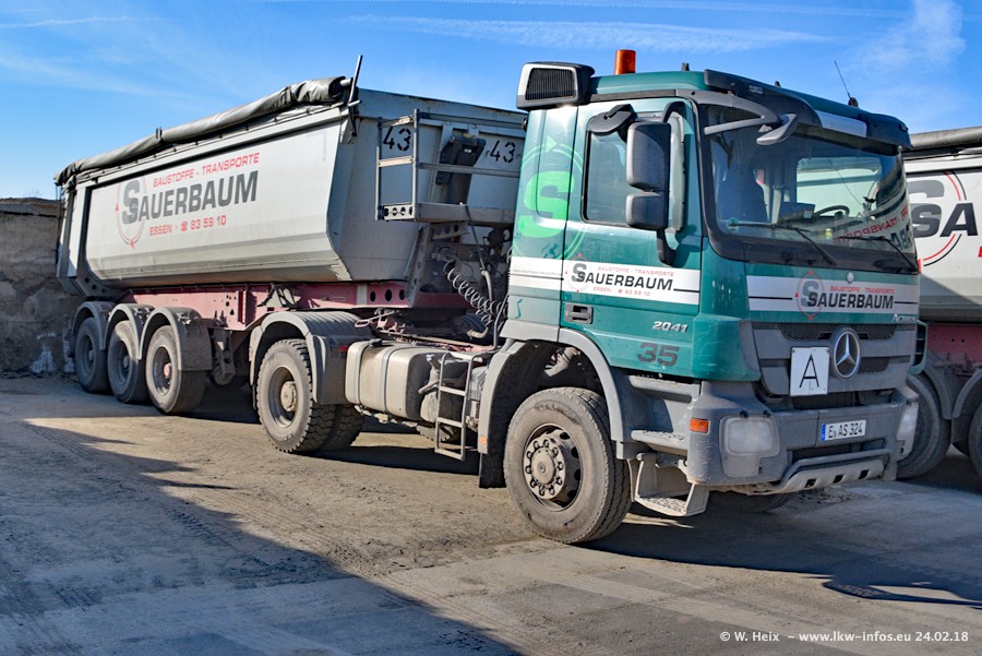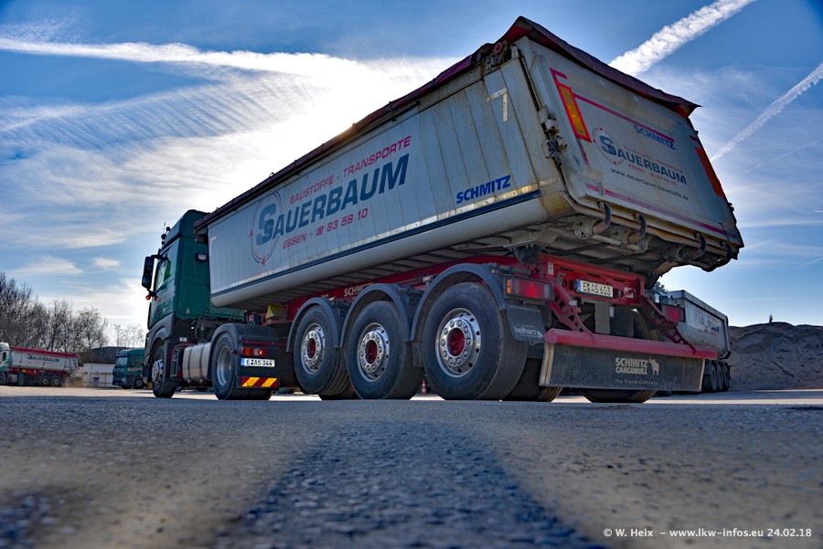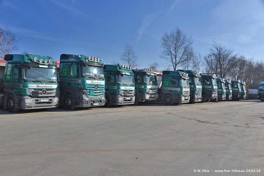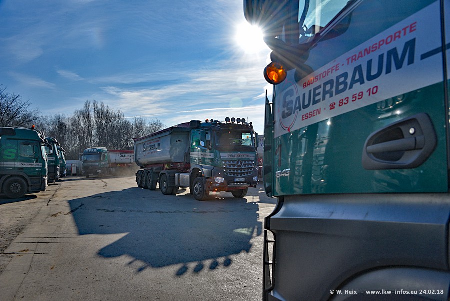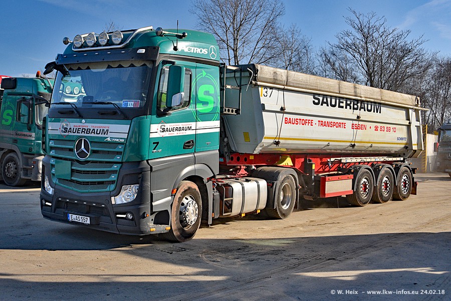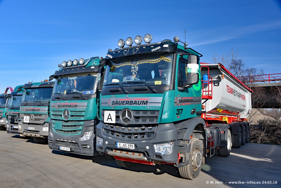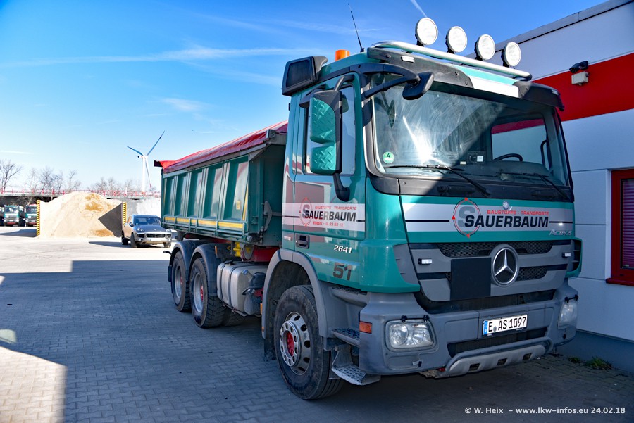 Der Fuhrpark von Sauerbaum besteht aus rund 50 LKW. Das sind 2 MAN TGS Euro 6 und alle anderen Fahrzeuge sind von Mercedes-Benz: Actros 3 und 4 sowie Arocs bei den Allrad-Zugmaschinen.