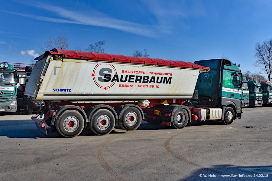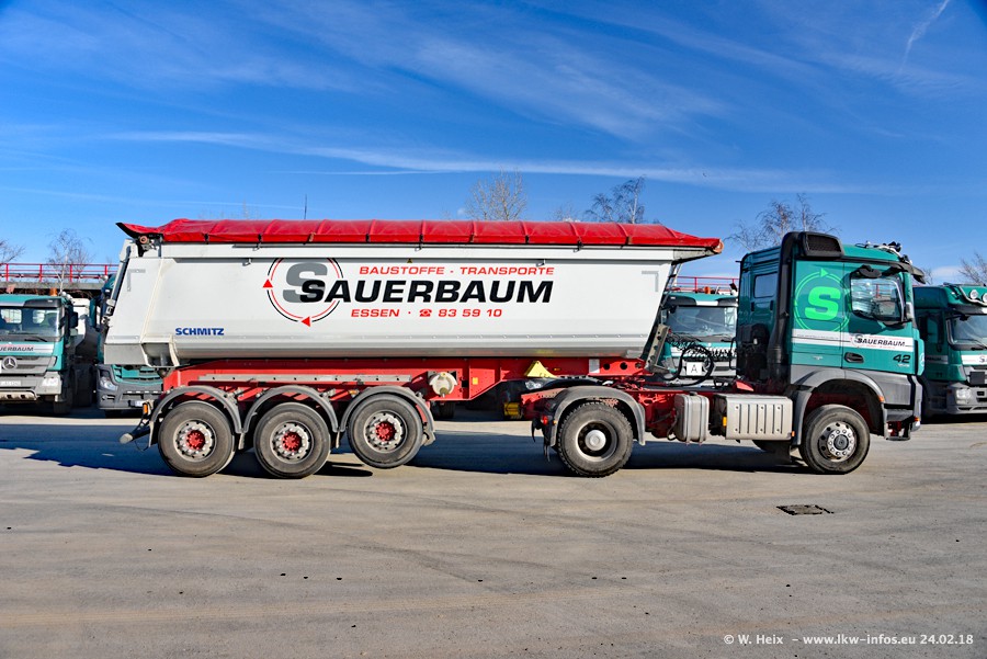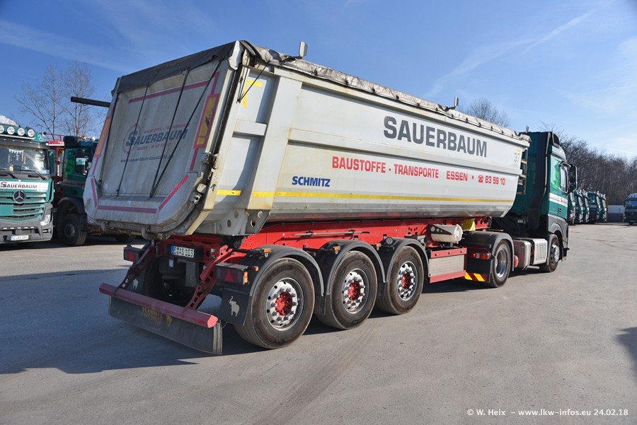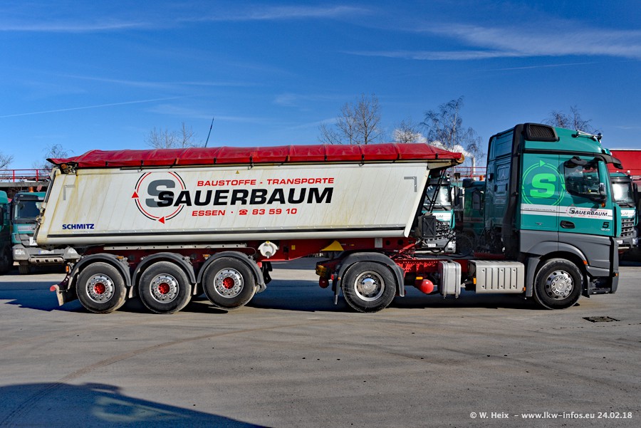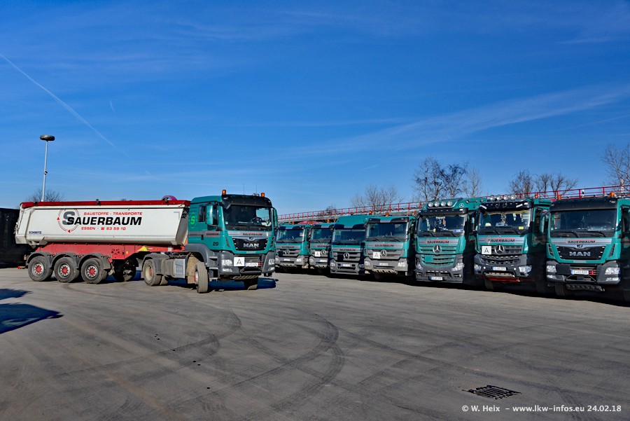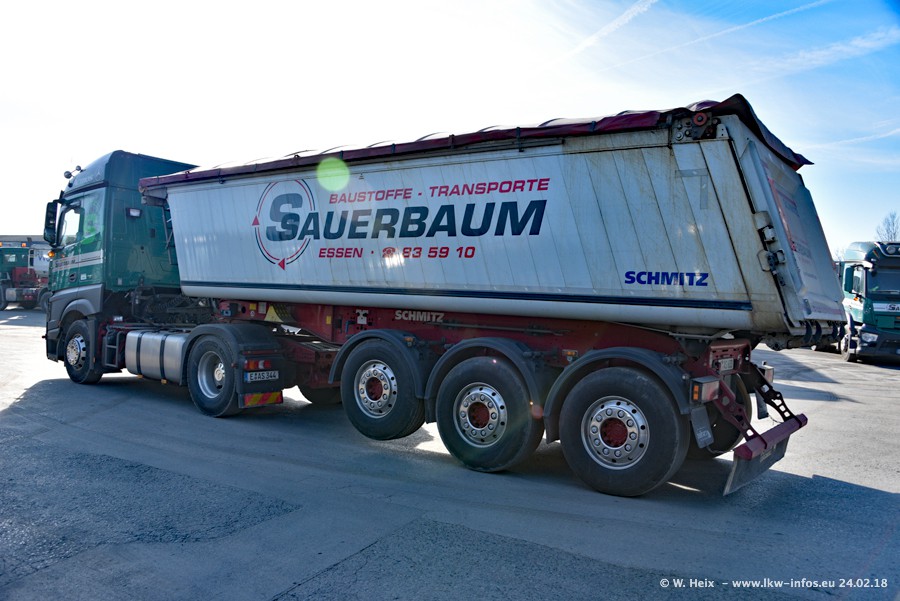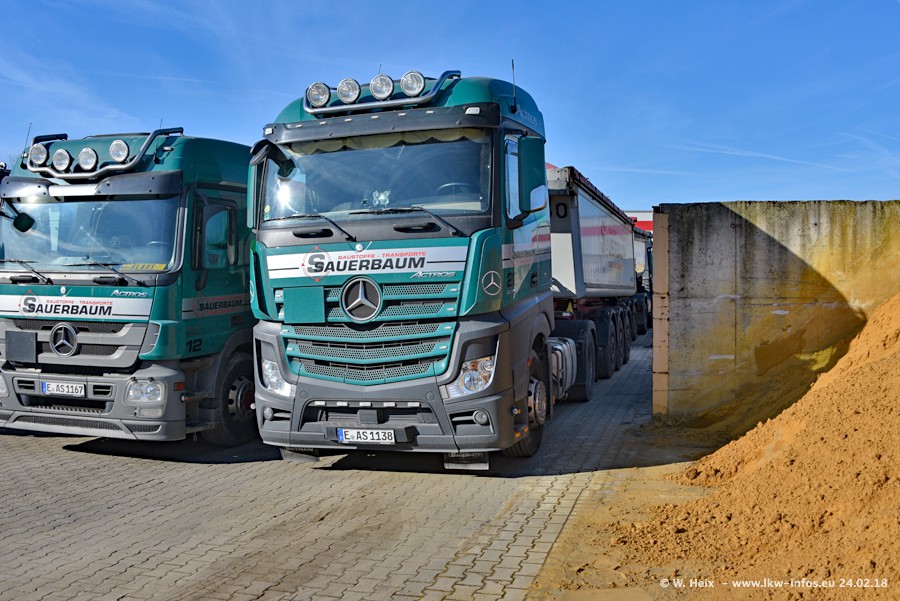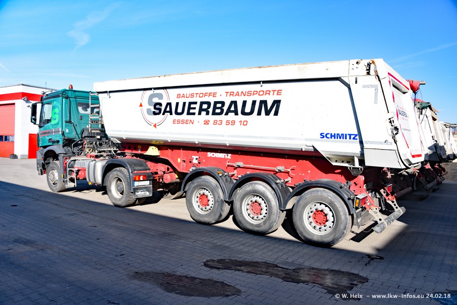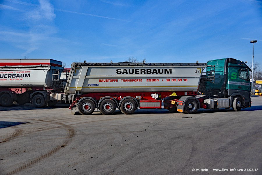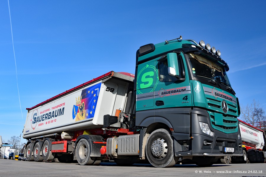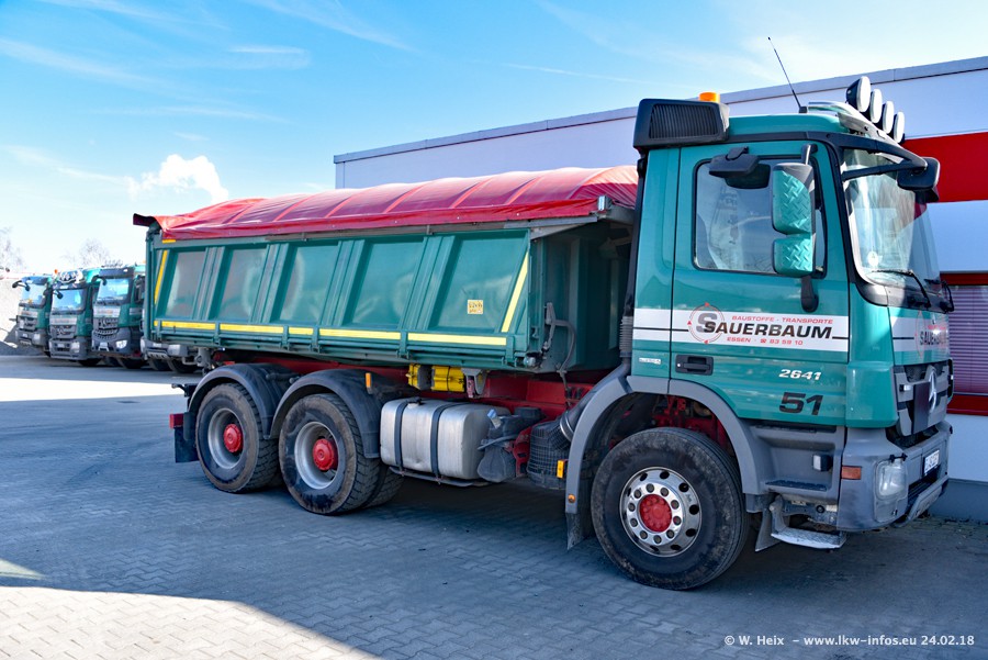 Der Fuhrpark von Sauerbaum besteht aus rund 50 LKW. Das sind 2 MAN TGS Euro 6 und alle anderen Fahrzeuge sind von Mercedes-Benz: Actros 3 und 4 sowie Arocs bei den Allrad-Zugmaschinen.