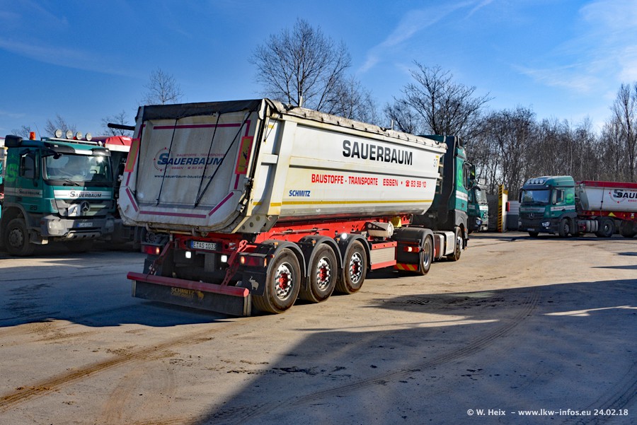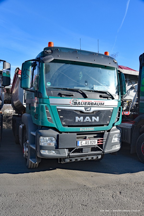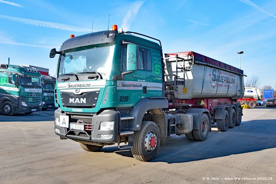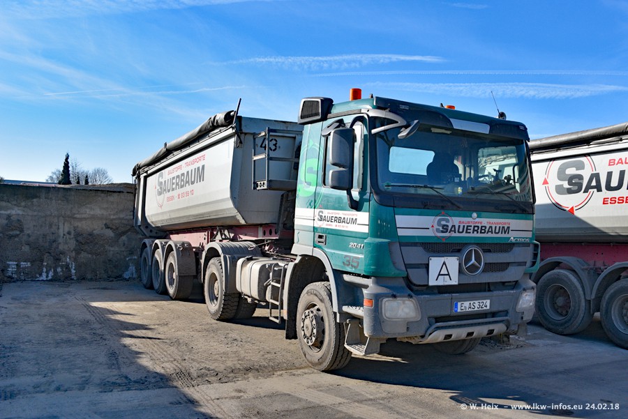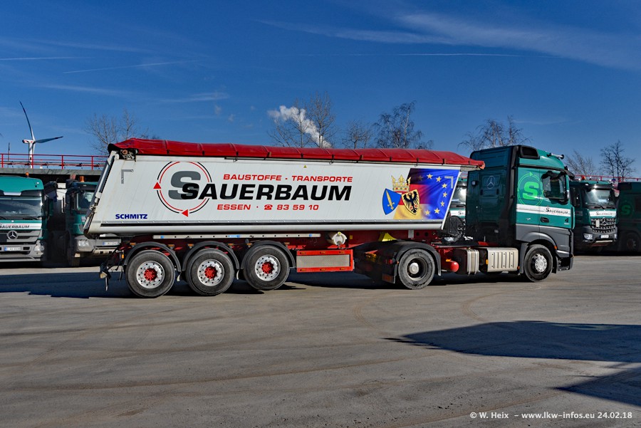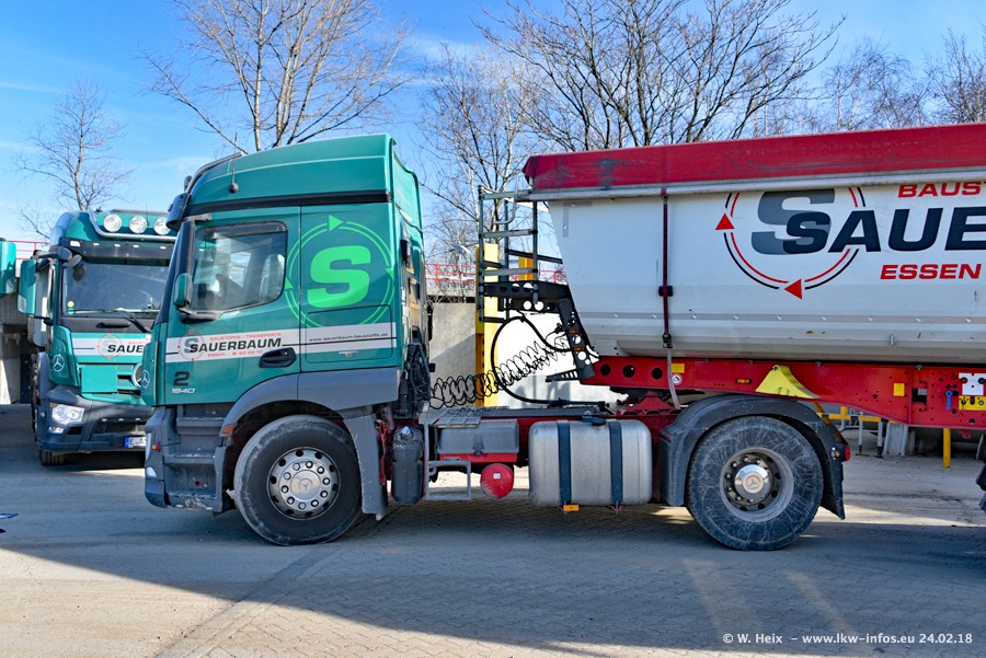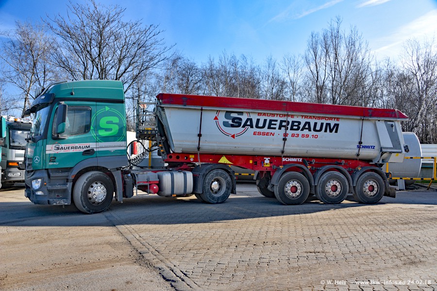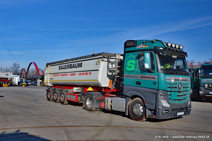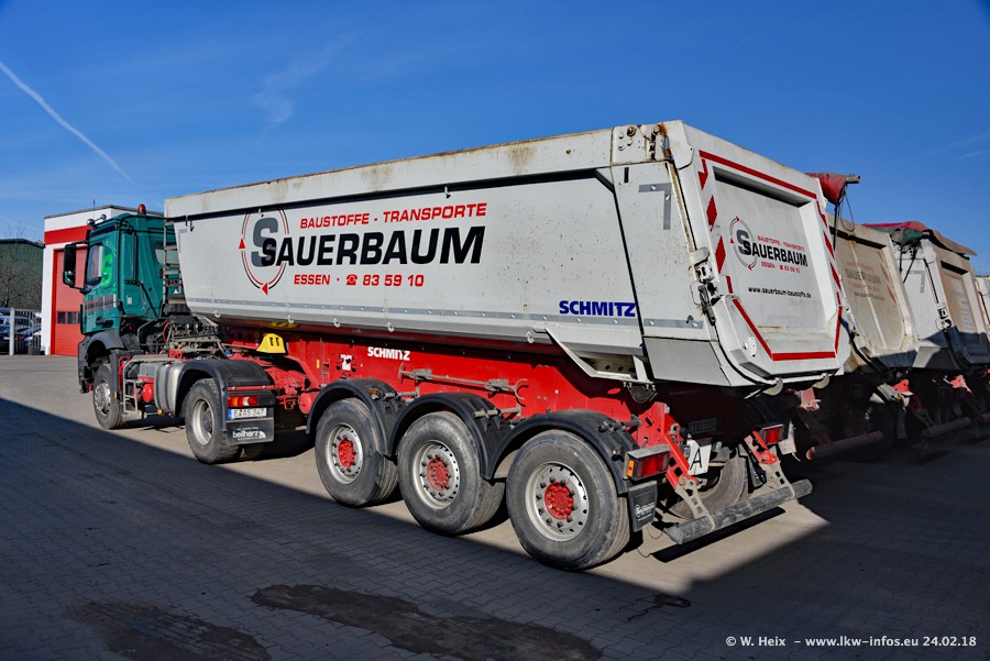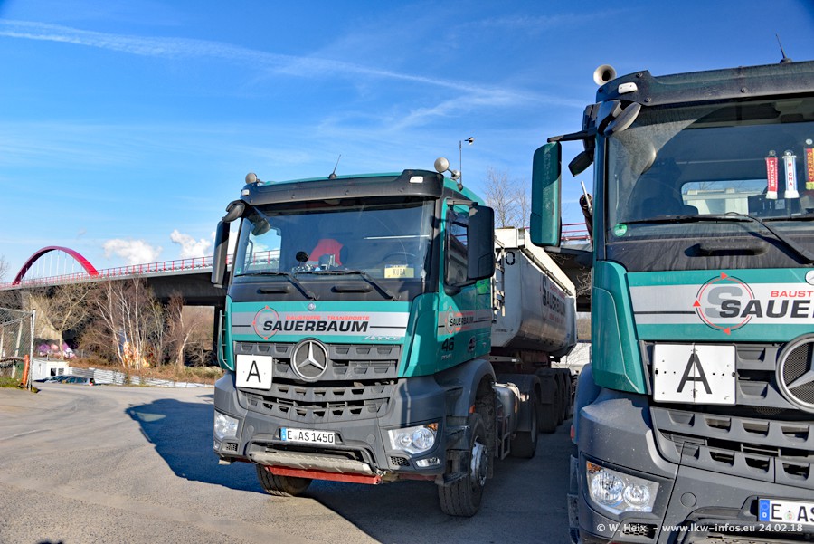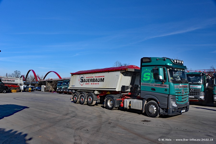Der Fuhrpark von Sauerbaum besteht aus rund 50 LKW. Das sind 2 MAN TGS Euro 6 und alle anderen Fahrzeuge sind von Mercedes-Benz: Actros 3 und 4 sowie Arocs bei den Allrad-Zugmaschinen.