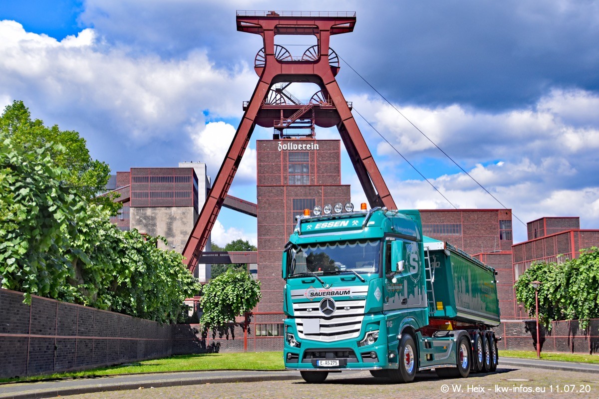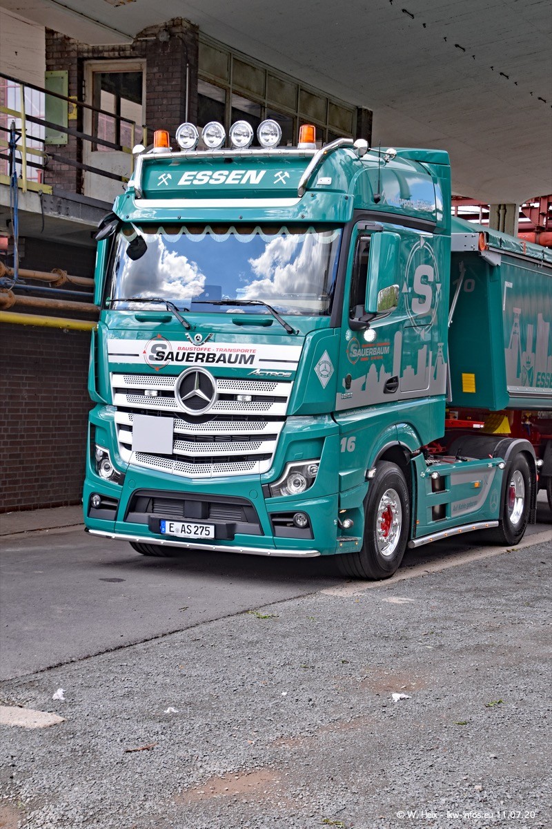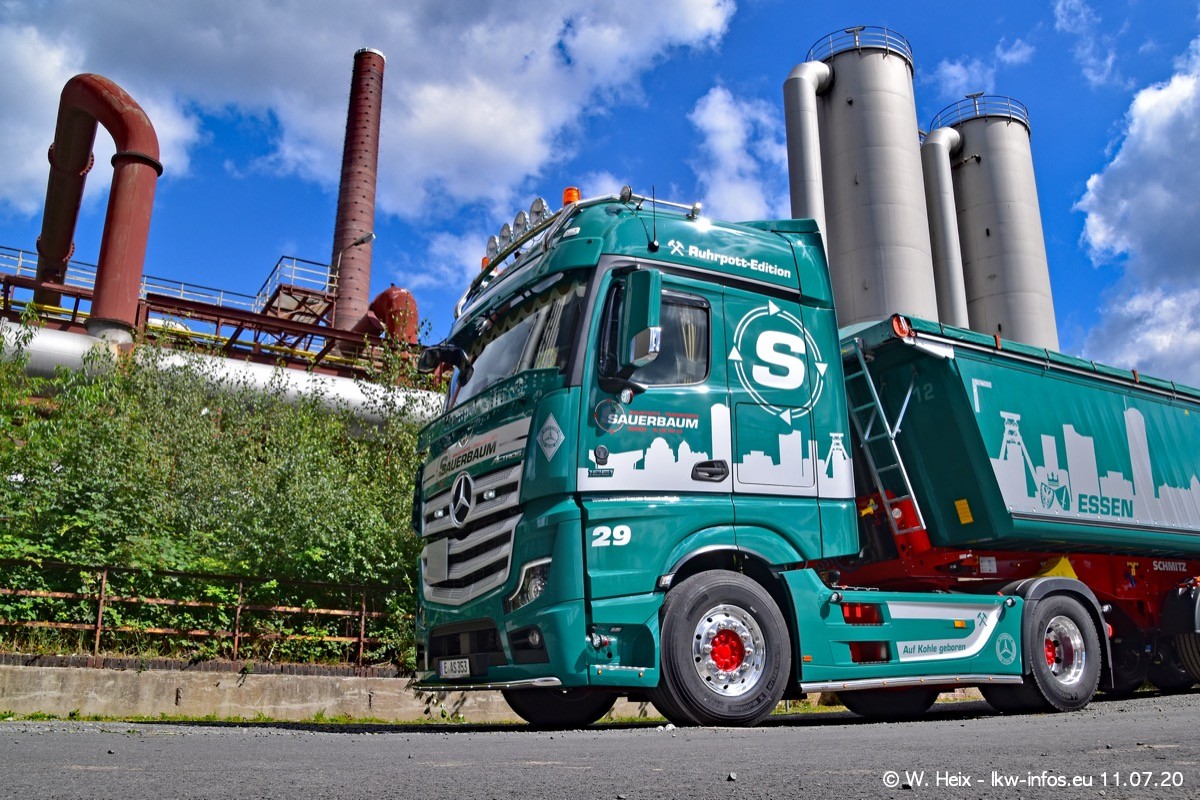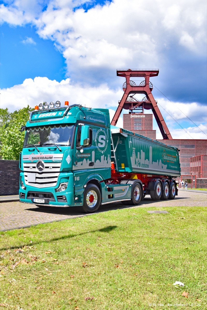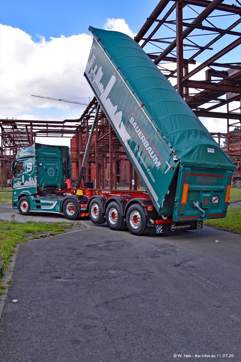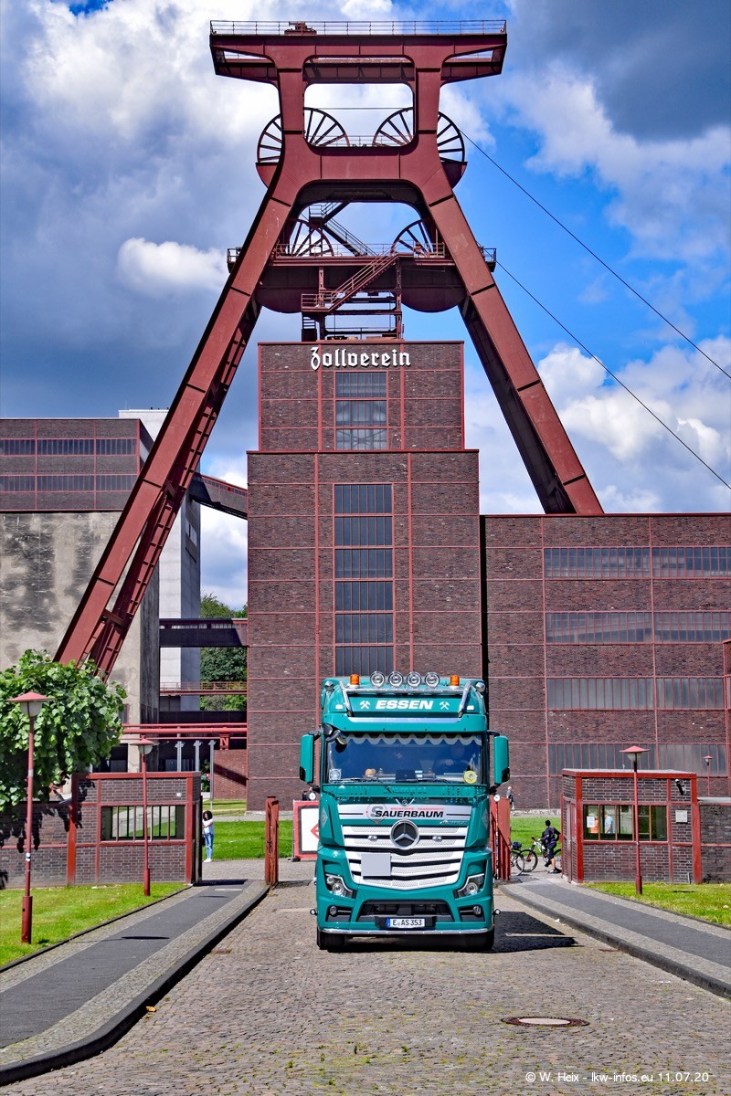 Am 11. Juli hatte mich die Firma Sauerbaum erneut zu einem Fotoshooting eingeladen. Ab Montag werden zwei besondere neue Mercedes-Benz Actros 4 auf den Straßen Europas unterwegs sein. Bei den beiden Actros handelt sich um das neue Modell, allerdings mit Außenspiegel. Beide haben einen 510 PS starken Motor und sind komplett ausgestattet. Die "Ruhrpott Edition Sauerbaum" soll die Heimatverbundenheit zur Stadt Essen dokumentieren. Von außen sind beide Fahrzeuge aufwändig gestaltet, komplett (samt der neuen Schmitz-Cargobull Auflieger) in grün lackiert und mit viel Zubehör (Lampen etc.) versehen. Dieses Fotoshooting wurde ausschießlich mit diesen beiden neuen LKW gemacht und zwar an passenden und bekannten Plätzen in Essen: auf dem Gelände der Zeche Zollverein (UNESCO Weltkuturerbe), vor dem Fussballstadion und natürlich wieder im Stadthafen.