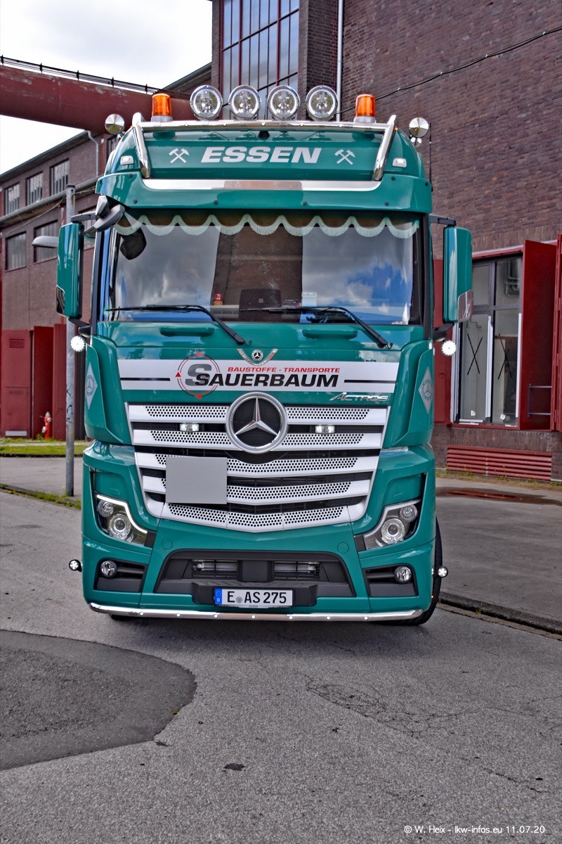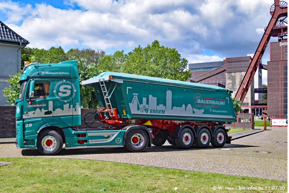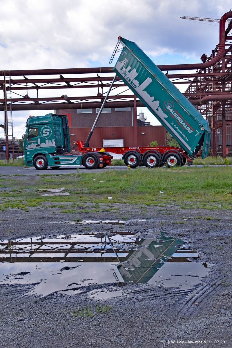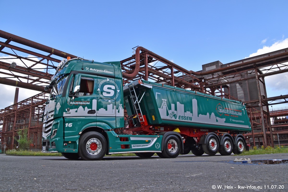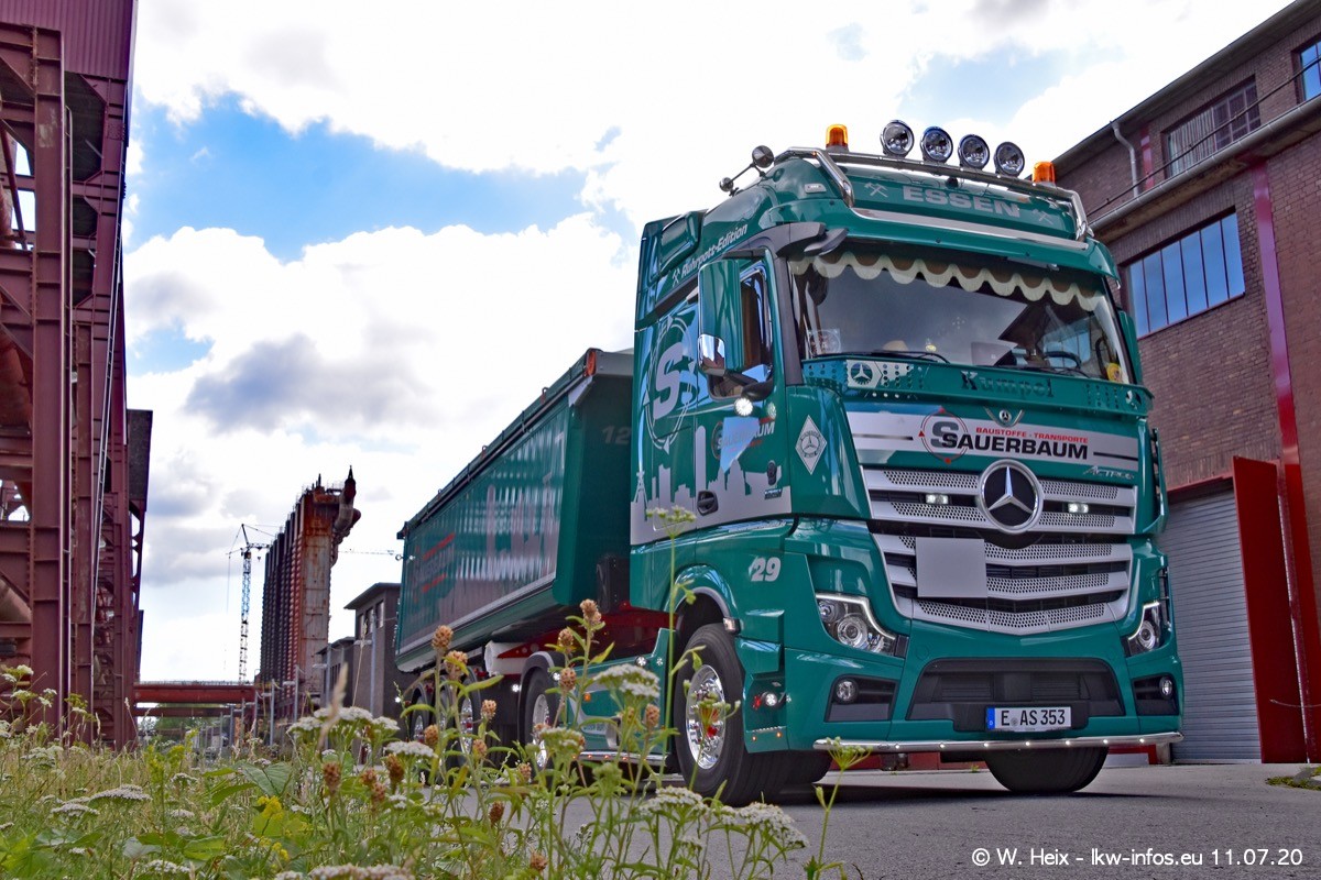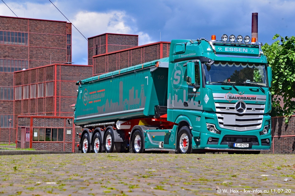 Am 11. Juli hatte mich die Firma Sauerbaum erneut zu einem Fotoshooting eingeladen. Ab Montag werden zwei besondere neue Mercedes-Benz Actros 4 auf den Straßen Europas unterwegs sein. Bei den beiden Actros handelt sich um das neue Modell, allerdings mit Außenspiegel. Beide haben einen 510 PS starken Motor und sind komplett ausgestattet. Die "Ruhrpott Edition Sauerbaum" soll die Heimatverbundenheit zur Stadt Essen dokumentieren. Von außen sind beide Fahrzeuge aufwändig gestaltet, komplett (samt der neuen Schmitz-Cargobull Auflieger) in grün lackiert und mit viel Zubehör (Lampen etc.) versehen. Dieses Fotoshooting wurde ausschießlich mit diesen beiden neuen LKW gemacht und zwar an passenden und bekannten Plätzen in Essen: auf dem Gelände der Zeche Zollverein (UNESCO Weltkuturerbe), vor dem Fussballstadion und natürlich wieder im Stadthafen.