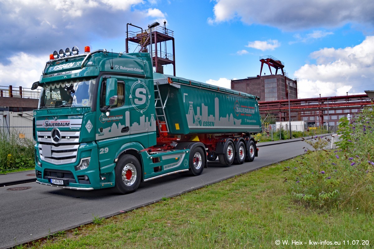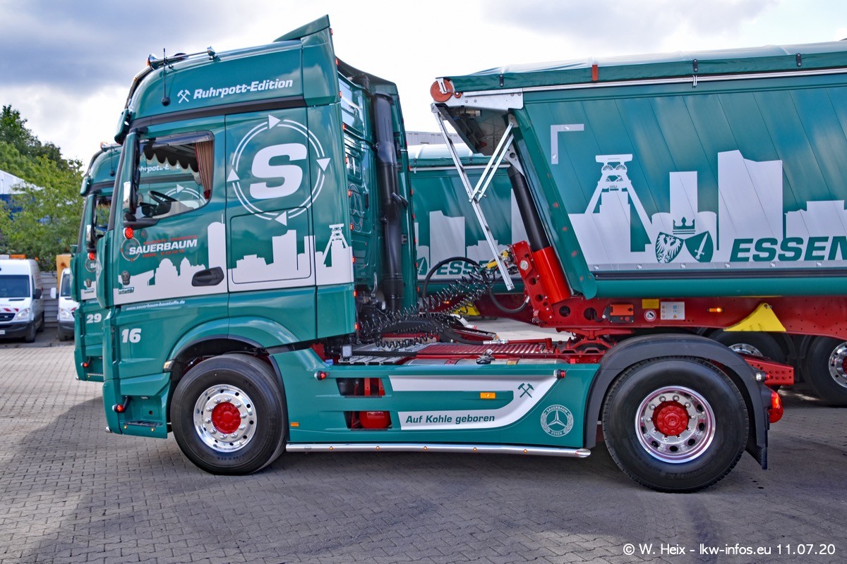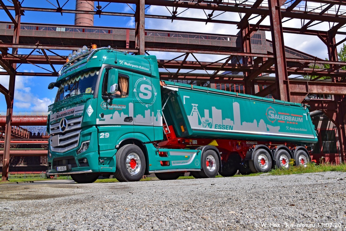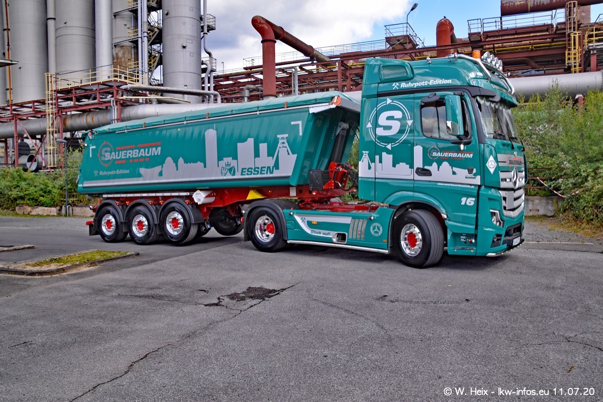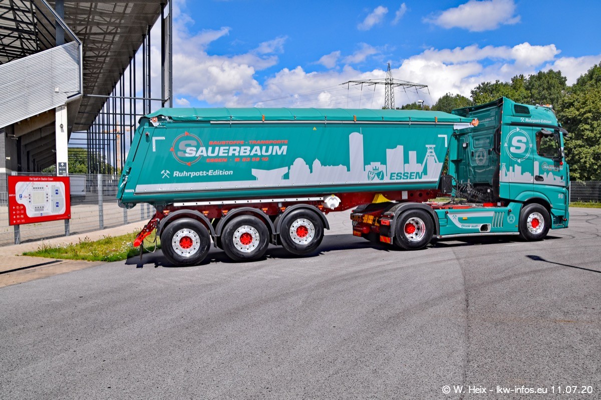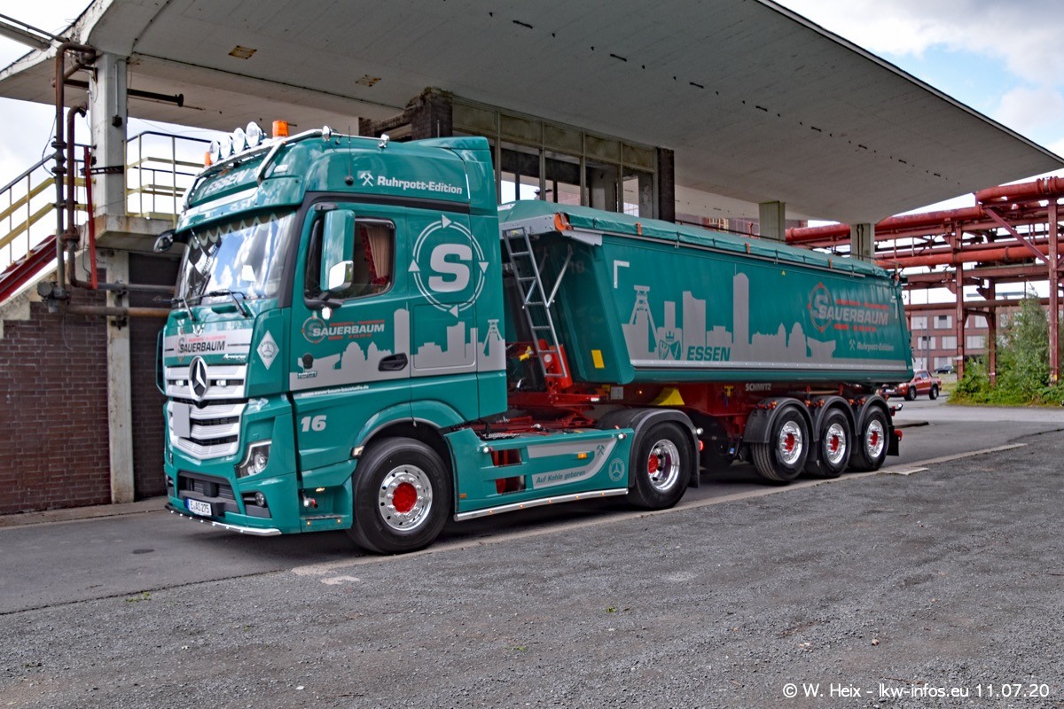 Am 11. Juli hatte mich die Firma Sauerbaum erneut zu einem Fotoshooting eingeladen. Ab Montag werden zwei besondere neue Mercedes-Benz Actros 4 auf den Straßen Europas unterwegs sein. Bei den beiden Actros handelt sich um das neue Modell, allerdings mit Außenspiegel. Beide haben einen 510 PS starken Motor und sind komplett ausgestattet. Die "Ruhrpott Edition Sauerbaum" soll die Heimatverbundenheit zur Stadt Essen dokumentieren. Von außen sind beide Fahrzeuge aufwändig gestaltet, komplett (samt der neuen Schmitz-Cargobull Auflieger) in grün lackiert und mit viel Zubehör (Lampen etc.) versehen. Dieses Fotoshooting wurde ausschießlich mit diesen beiden neuen LKW gemacht und zwar an passenden und bekannten Plätzen in Essen: auf dem Gelände der Zeche Zollverein (UNESCO Weltkuturerbe), vor dem Fussballstadion und natürlich wieder im Stadthafen.