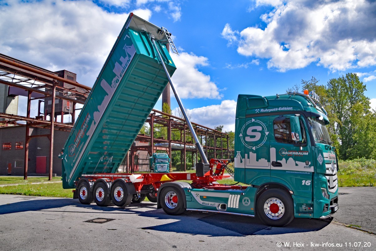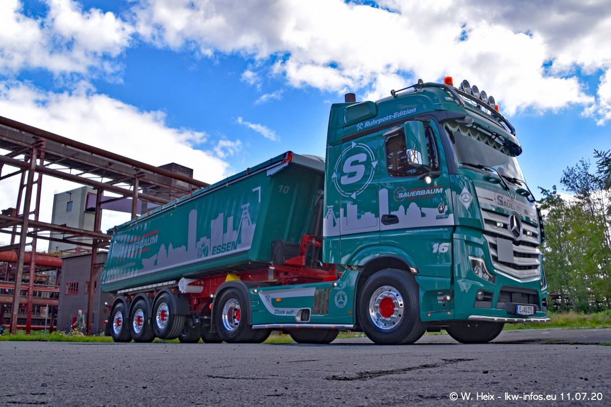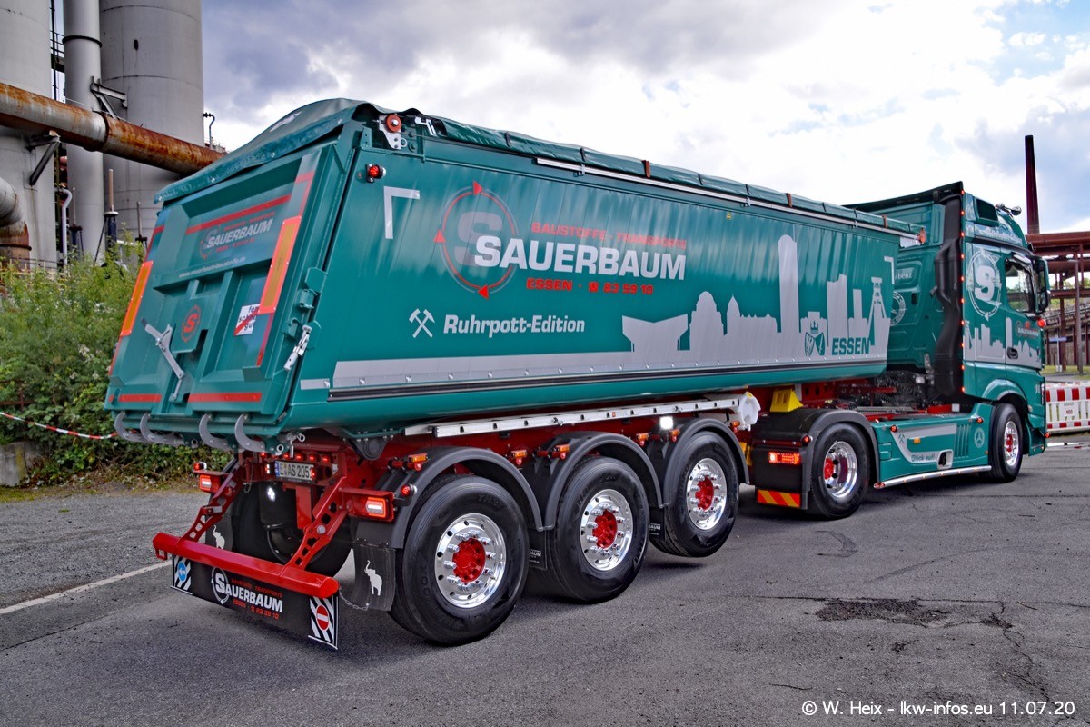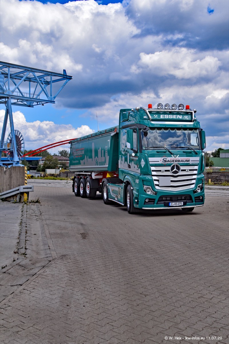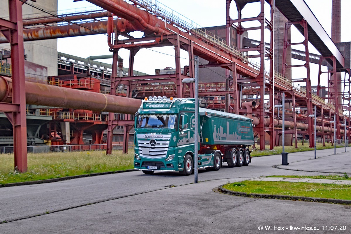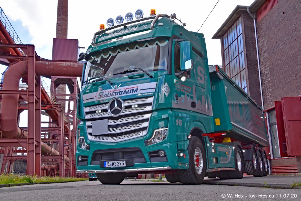 Am 11. Juli hatte mich die Firma Sauerbaum erneut zu einem Fotoshooting eingeladen. Ab Montag werden zwei besondere neue Mercedes-Benz Actros 4 auf den Straßen Europas unterwegs sein. Bei den beiden Actros handelt sich um das neue Modell, allerdings mit Außenspiegel. Beide haben einen 510 PS starken Motor und sind komplett ausgestattet. Die "Ruhrpott Edition Sauerbaum" soll die Heimatverbundenheit zur Stadt Essen dokumentieren. Von außen sind beide Fahrzeuge aufwändig gestaltet, komplett (samt der neuen Schmitz-Cargobull Auflieger) in grün lackiert und mit viel Zubehör (Lampen etc.) versehen. Dieses Fotoshooting wurde ausschießlich mit diesen beiden neuen LKW gemacht und zwar an passenden und bekannten Plätzen in Essen: auf dem Gelände der Zeche Zollverein (UNESCO Weltkuturerbe), vor dem Fussballstadion und natürlich wieder im Stadthafen.