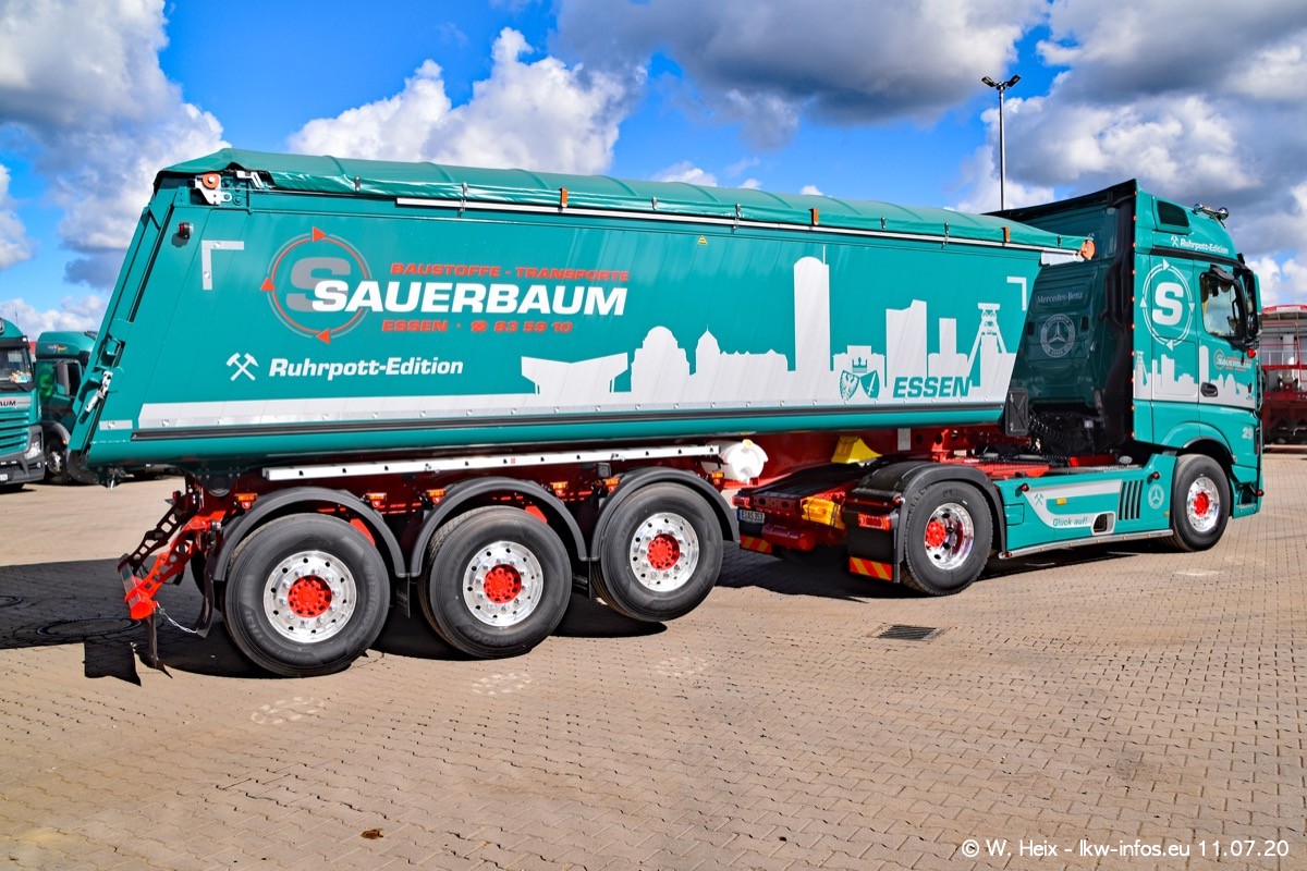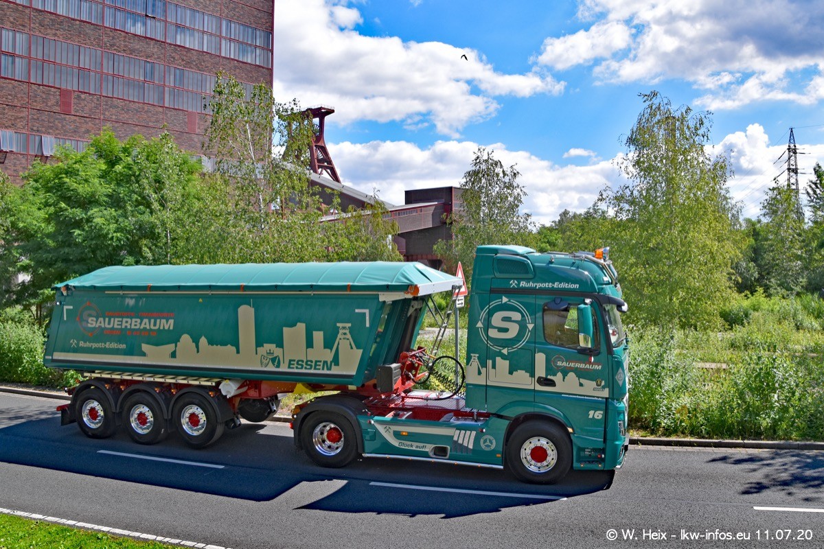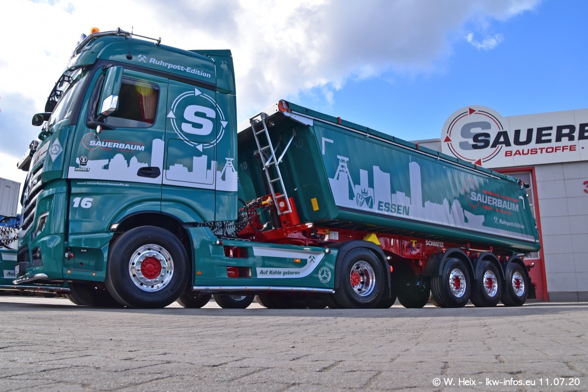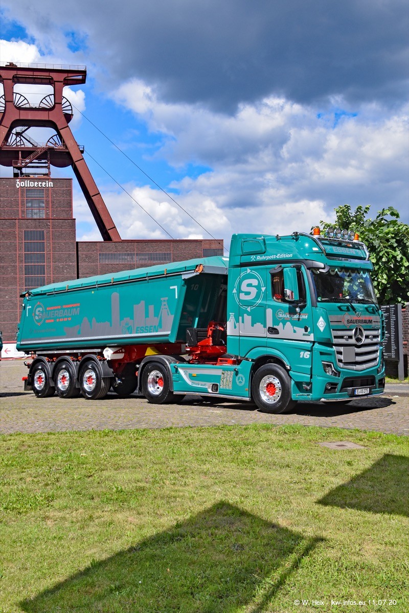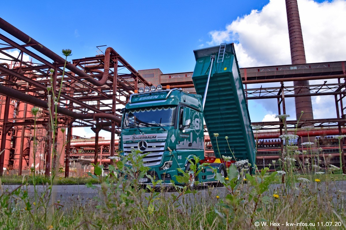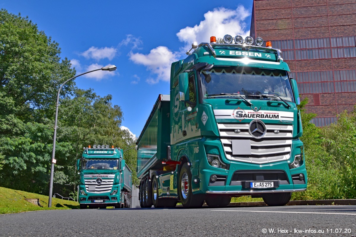 Am 11. Juli hatte mich die Firma Sauerbaum erneut zu einem Fotoshooting eingeladen. Ab Montag werden zwei besondere neue Mercedes-Benz Actros 4 auf den Straßen Europas unterwegs sein. Bei den beiden Actros handelt sich um das neue Modell, allerdings mit Außenspiegel. Beide haben einen 510 PS starken Motor und sind komplett ausgestattet. Die "Ruhrpott Edition Sauerbaum" soll die Heimatverbundenheit zur Stadt Essen dokumentieren. Von außen sind beide Fahrzeuge aufwändig gestaltet, komplett (samt der neuen Schmitz-Cargobull Auflieger) in grün lackiert und mit viel Zubehör (Lampen etc.) versehen. Dieses Fotoshooting wurde ausschießlich mit diesen beiden neuen LKW gemacht und zwar an passenden und bekannten Plätzen in Essen: auf dem Gelände der Zeche Zollverein (UNESCO Weltkuturerbe), vor dem Fussballstadion und natürlich wieder im Stadthafen.