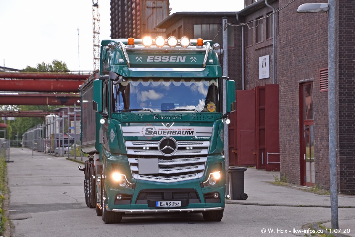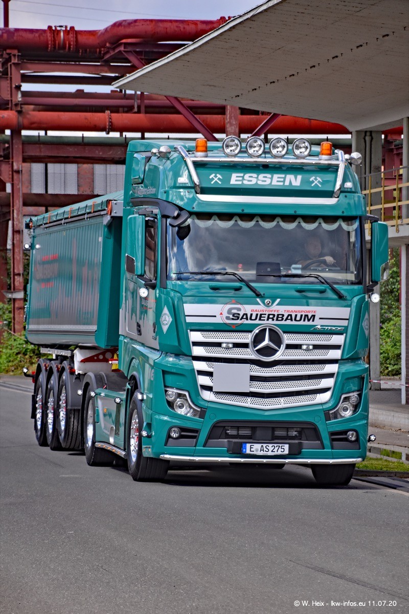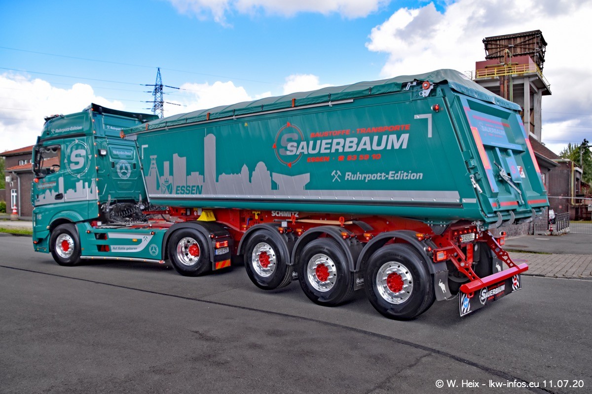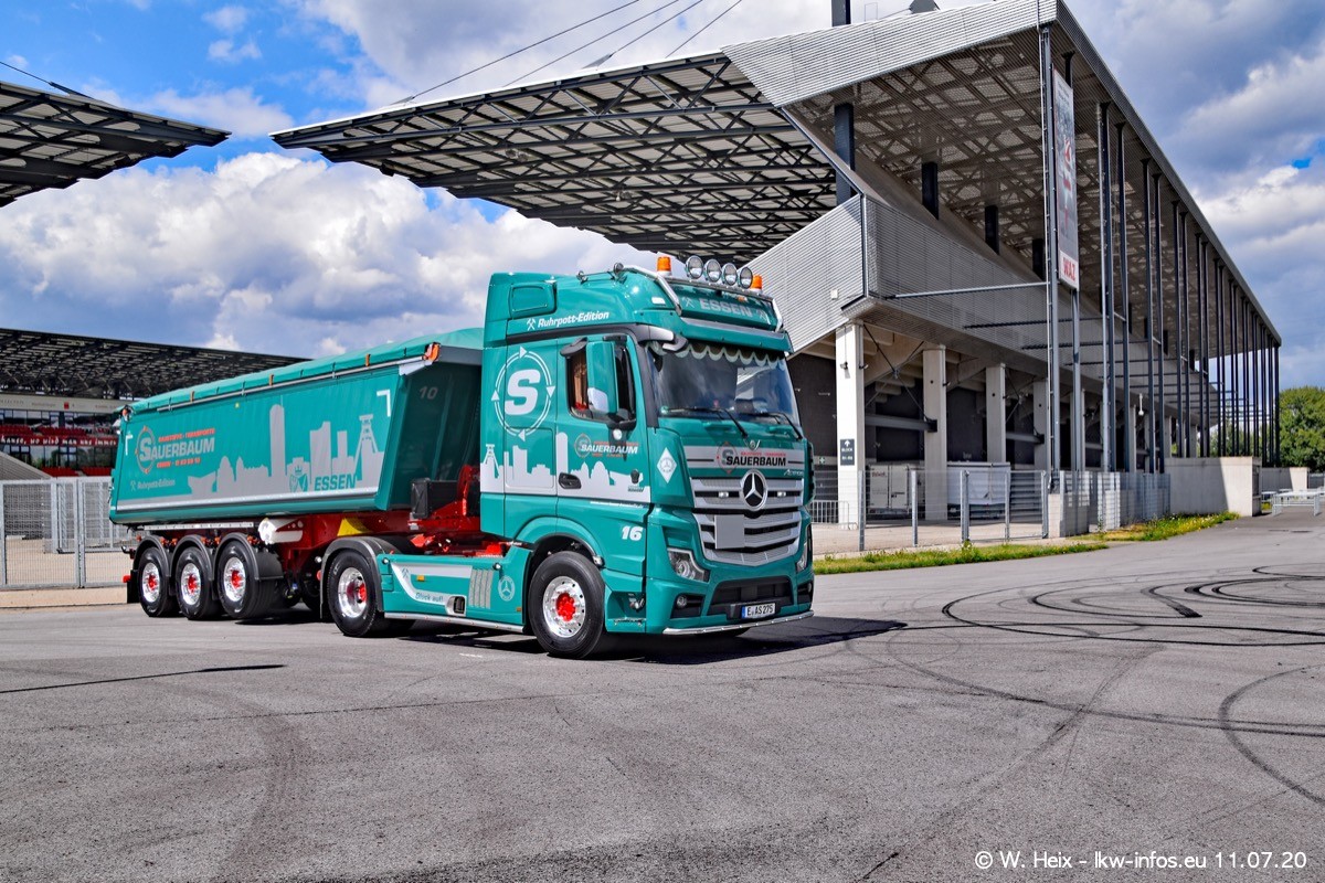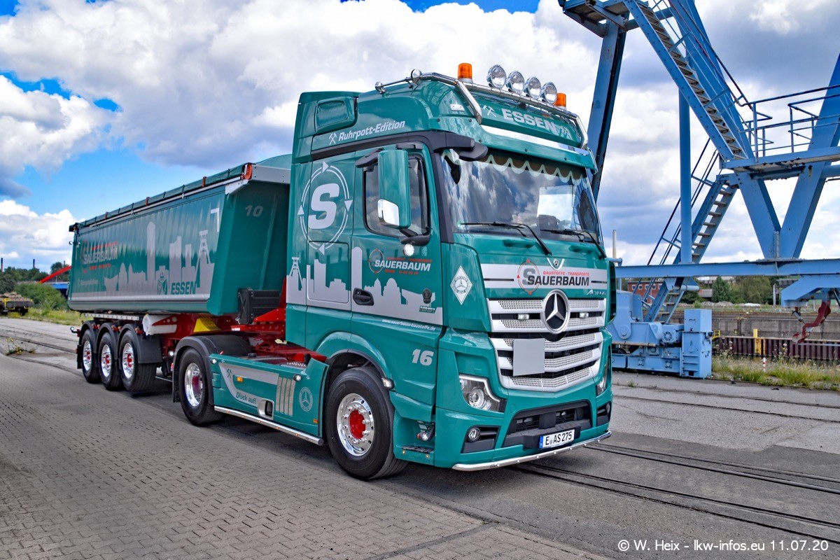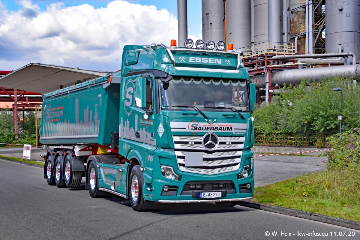 Am 11. Juli hatte mich die Firma Sauerbaum erneut zu einem Fotoshooting eingeladen. Ab Montag werden zwei besondere neue Mercedes-Benz Actros 4 auf den Straßen Europas unterwegs sein. Bei den beiden Actros handelt sich um das neue Modell, allerdings mit Außenspiegel. Beide haben einen 510 PS starken Motor und sind komplett ausgestattet. Die "Ruhrpott Edition Sauerbaum" soll die Heimatverbundenheit zur Stadt Essen dokumentieren. Von außen sind beide Fahrzeuge aufwändig gestaltet, komplett (samt der neuen Schmitz-Cargobull Auflieger) in grün lackiert und mit viel Zubehör (Lampen etc.) versehen. Dieses Fotoshooting wurde ausschießlich mit diesen beiden neuen LKW gemacht und zwar an passenden und bekannten Plätzen in Essen: auf dem Gelände der Zeche Zollverein (UNESCO Weltkuturerbe), vor dem Fussballstadion und natürlich wieder im Stadthafen.
