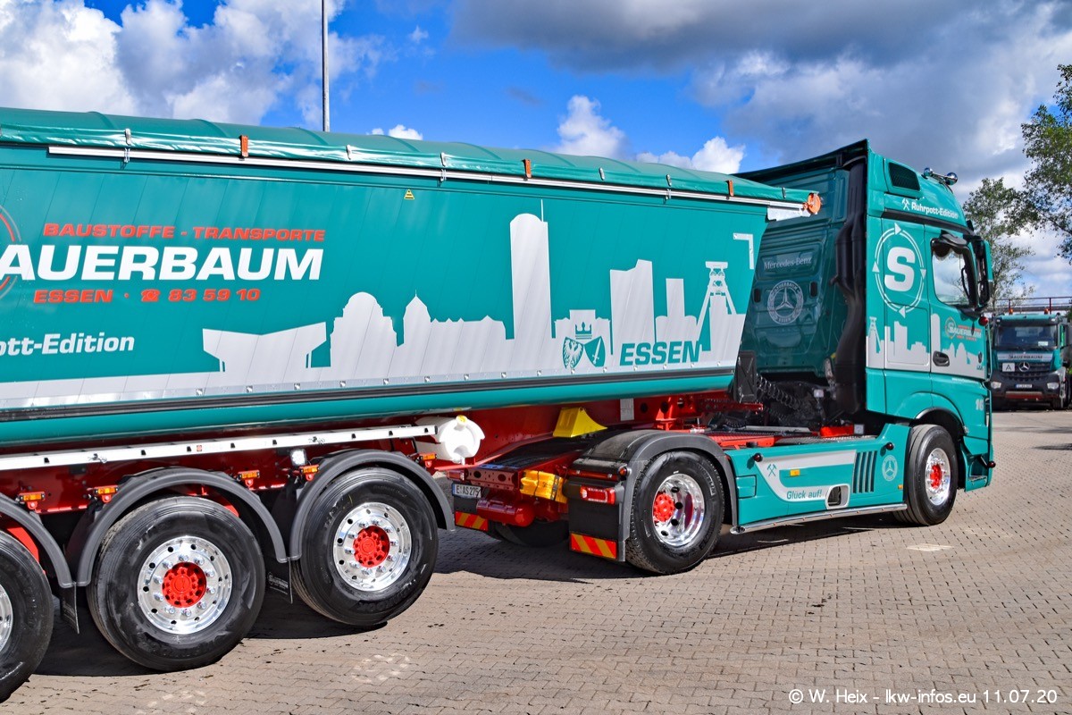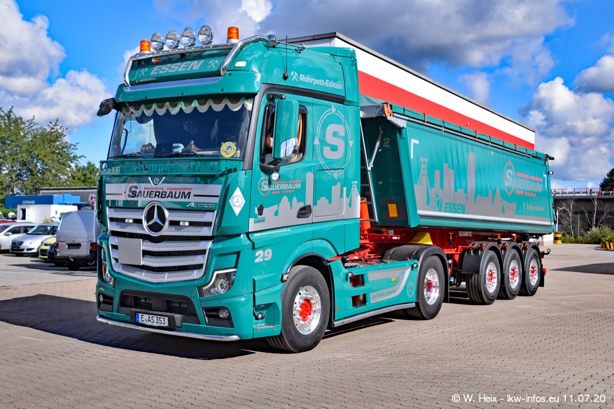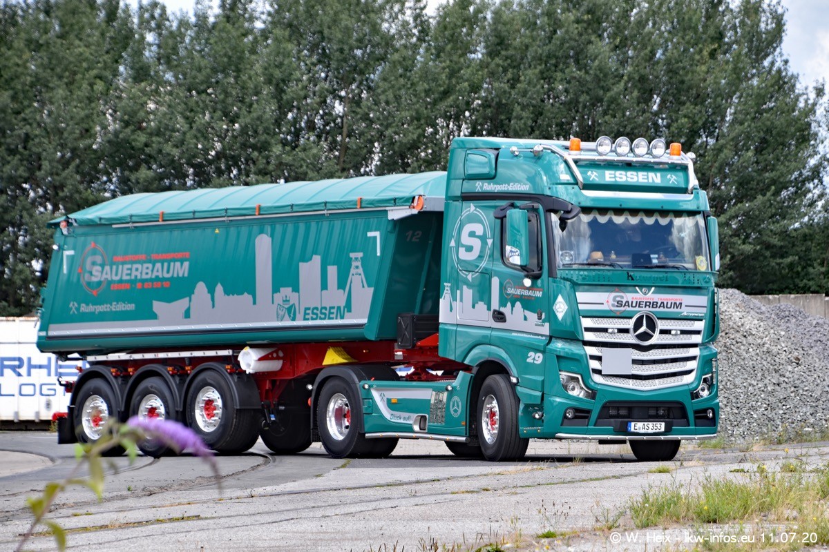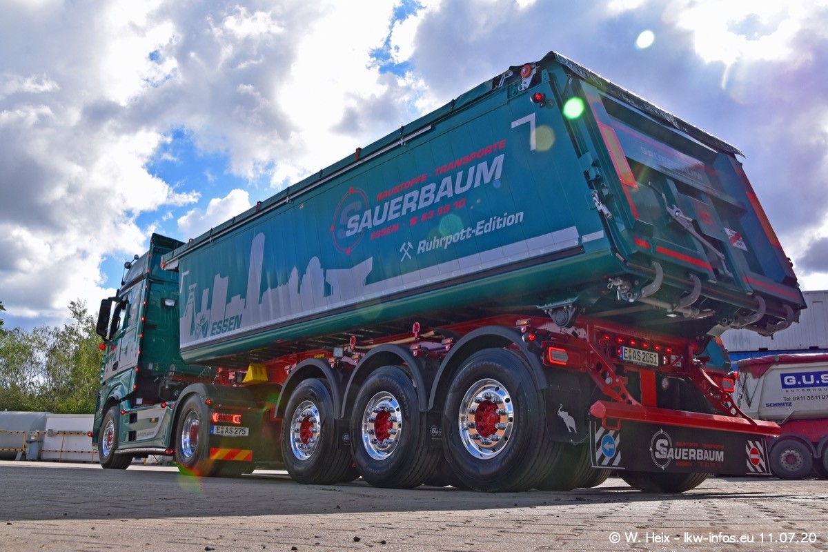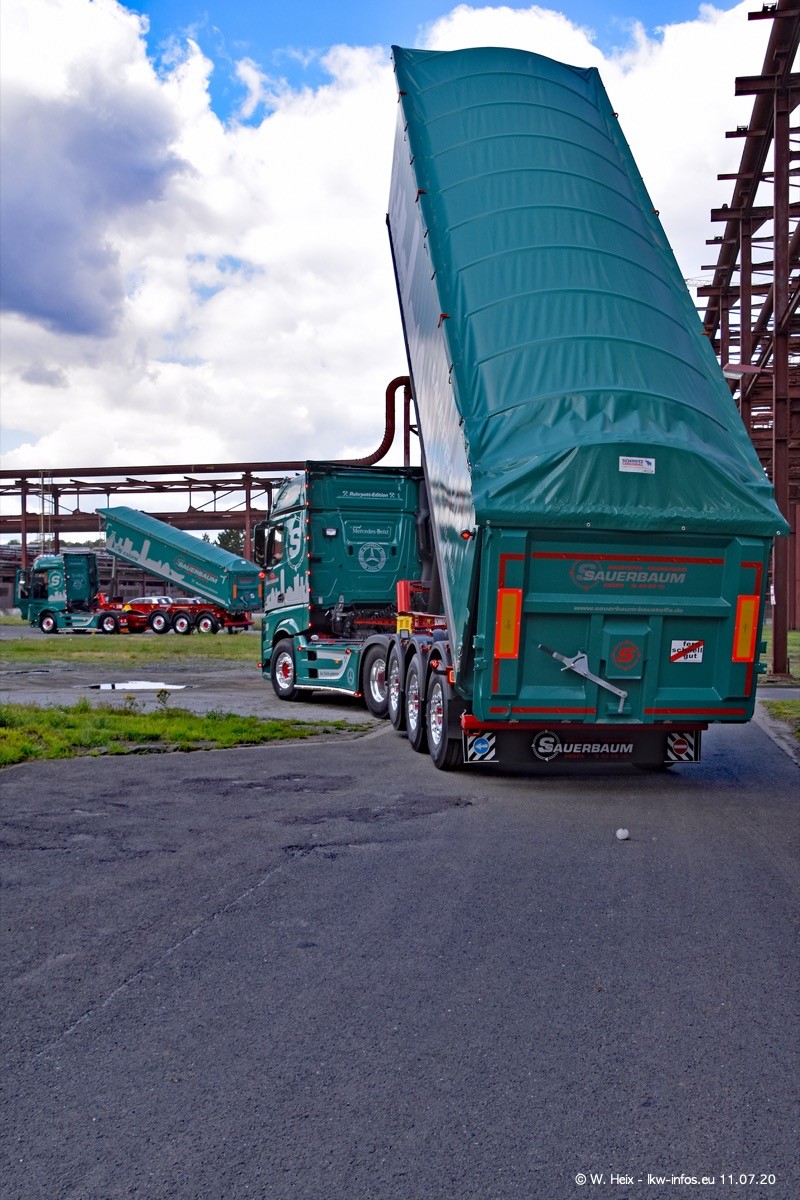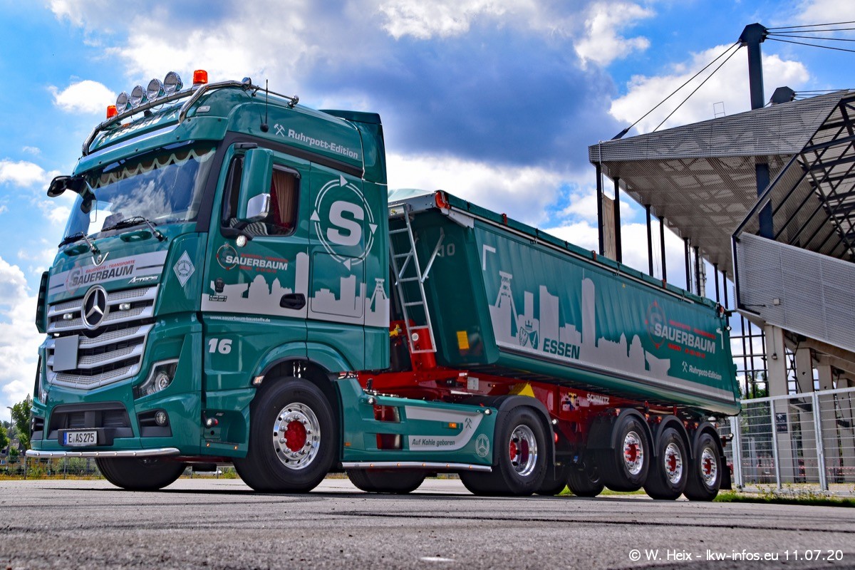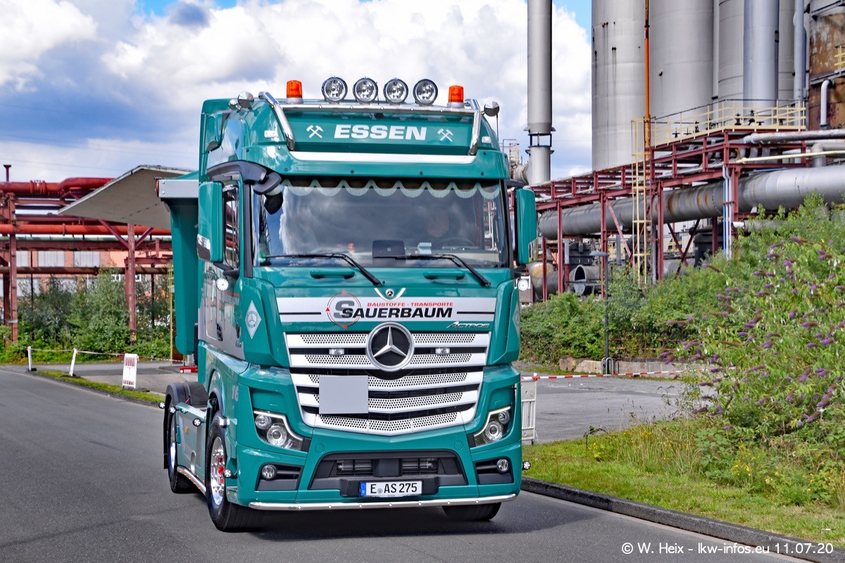 Am 11. Juli hatte mich die Firma Sauerbaum erneut zu einem Fotoshooting eingeladen. Ab Montag werden zwei besondere neue Mercedes-Benz Actros 4 auf den Straßen Europas unterwegs sein. Bei den beiden Actros handelt sich um das neue Modell, allerdings mit Außenspiegel. Beide haben einen 510 PS starken Motor und sind komplett ausgestattet. Die "Ruhrpott Edition Sauerbaum" soll die Heimatverbundenheit zur Stadt Essen dokumentieren. Von außen sind beide Fahrzeuge aufwändig gestaltet, komplett (samt der neuen Schmitz-Cargobull Auflieger) in grün lackiert und mit viel Zubehör (Lampen etc.) versehen. Dieses Fotoshooting wurde ausschießlich mit diesen beiden neuen LKW gemacht und zwar an passenden und bekannten Plätzen in Essen: auf dem Gelände der Zeche Zollverein (UNESCO Weltkuturerbe), vor dem Fussballstadion und natürlich wieder im Stadthafen.