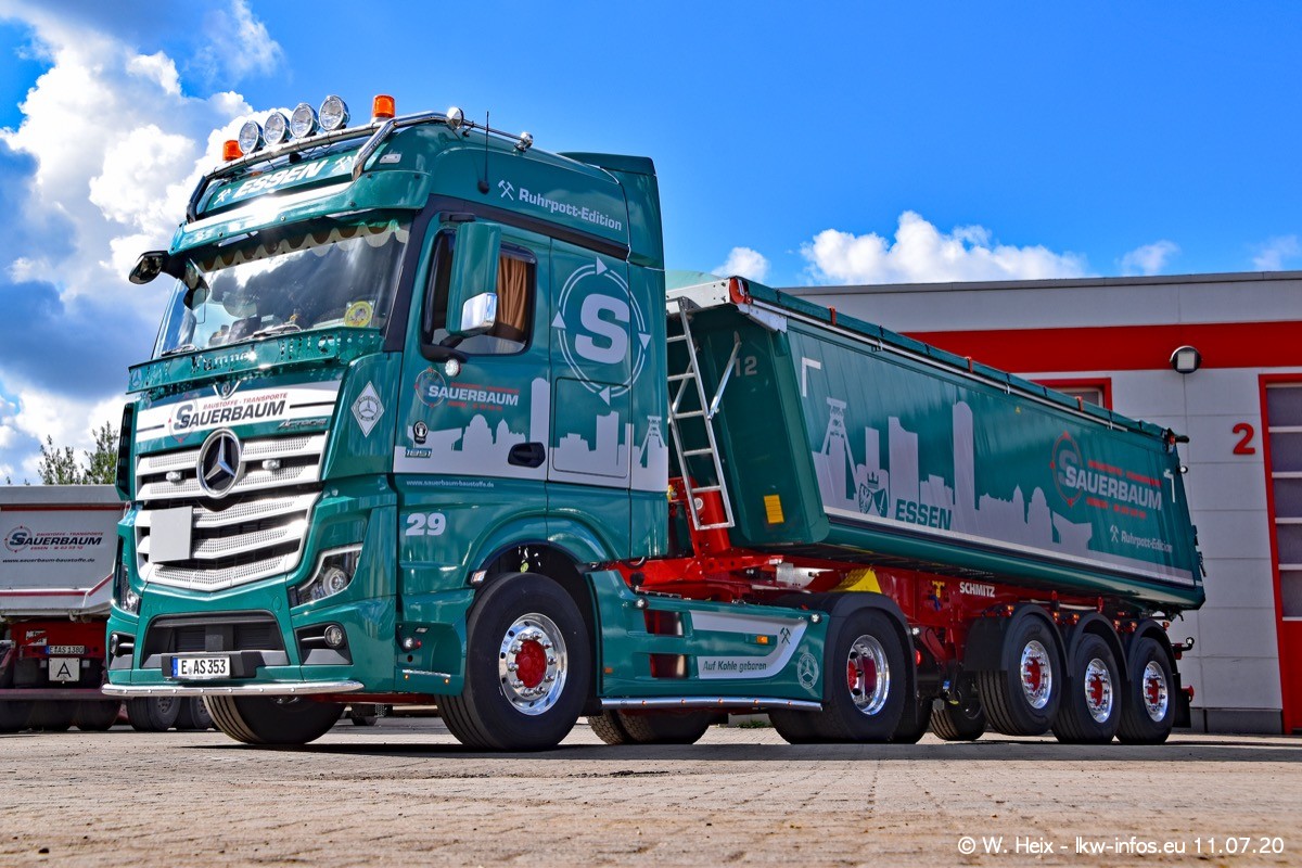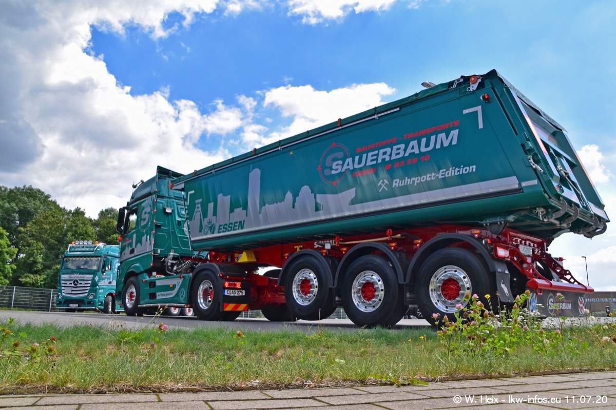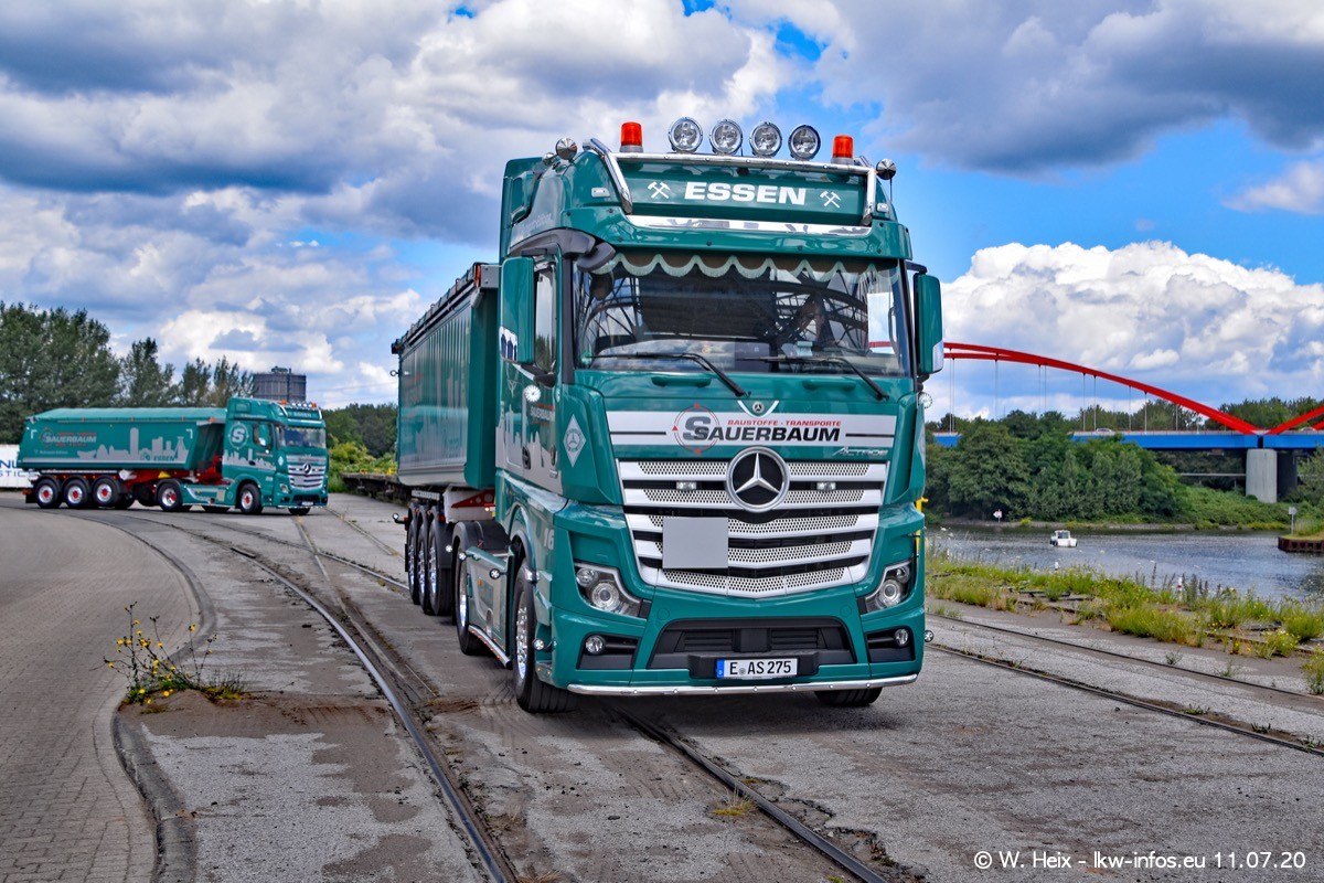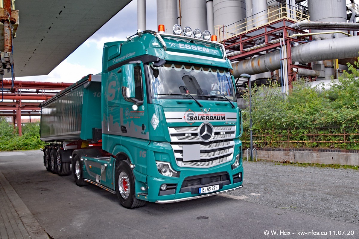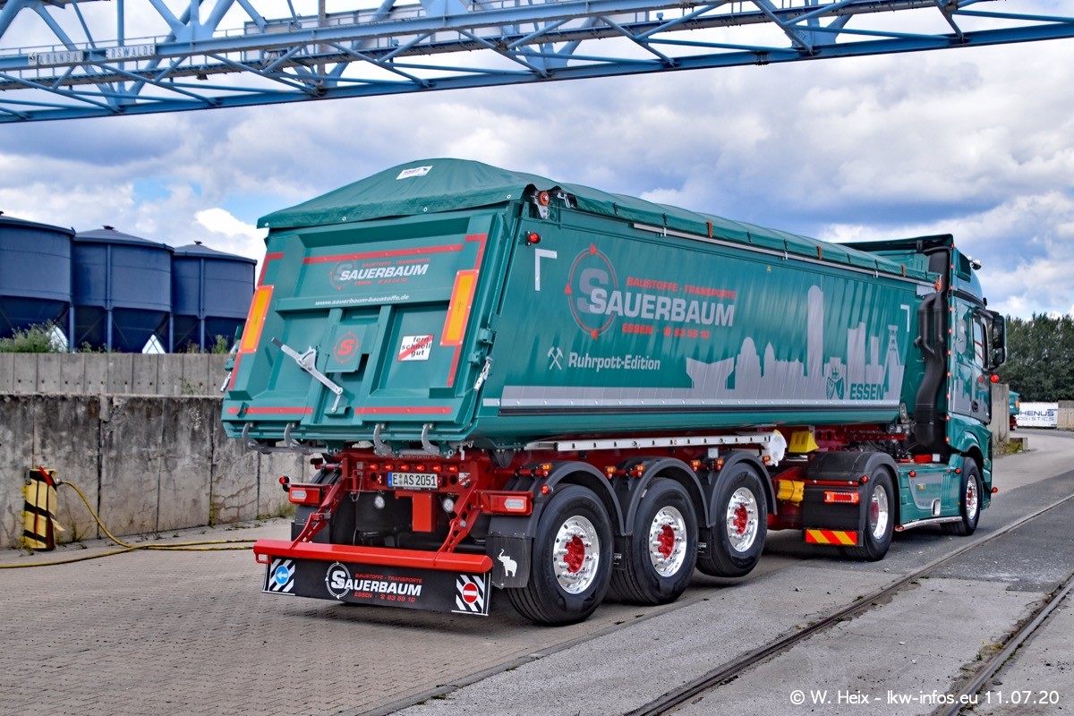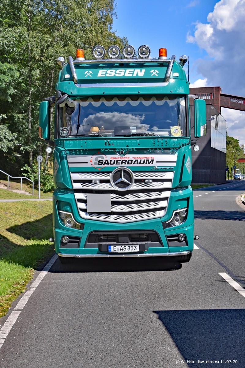 Am 11. Juli hatte mich die Firma Sauerbaum erneut zu einem Fotoshooting eingeladen. Ab Montag werden zwei besondere neue Mercedes-Benz Actros 4 auf den Straßen Europas unterwegs sein. Bei den beiden Actros handelt sich um das neue Modell, allerdings mit Außenspiegel. Beide haben einen 510 PS starken Motor und sind komplett ausgestattet. Die "Ruhrpott Edition Sauerbaum" soll die Heimatverbundenheit zur Stadt Essen dokumentieren. Von außen sind beide Fahrzeuge aufwändig gestaltet, komplett (samt der neuen Schmitz-Cargobull Auflieger) in grün lackiert und mit viel Zubehör (Lampen etc.) versehen. Dieses Fotoshooting wurde ausschießlich mit diesen beiden neuen LKW gemacht und zwar an passenden und bekannten Plätzen in Essen: auf dem Gelände der Zeche Zollverein (UNESCO Weltkuturerbe), vor dem Fussballstadion und natürlich wieder im Stadthafen.