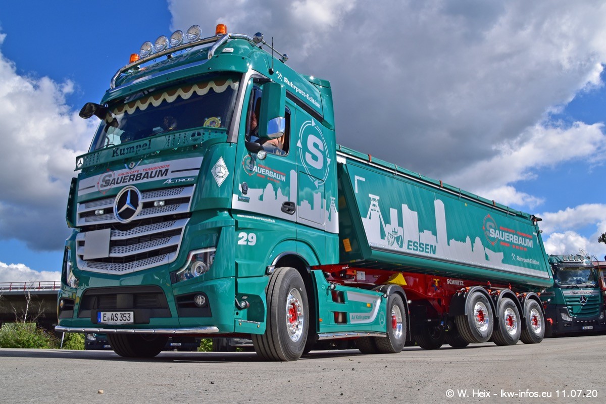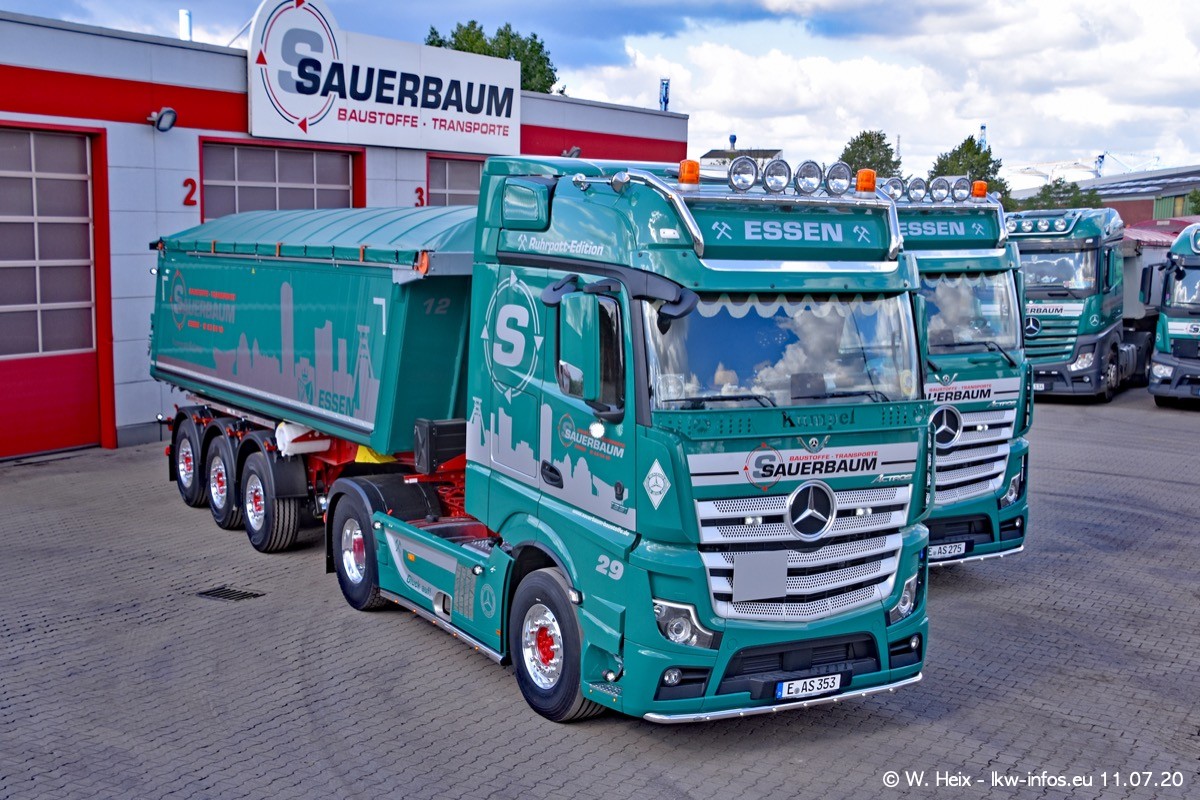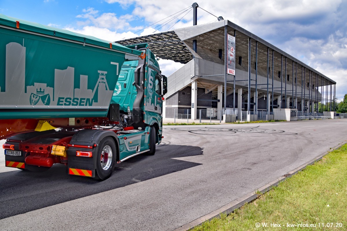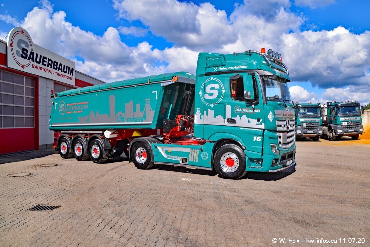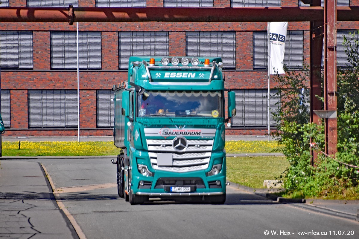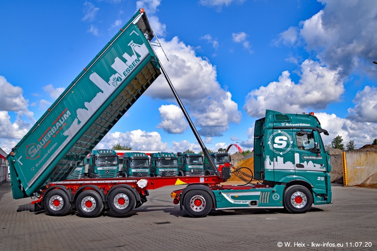 Am 11. Juli hatte mich die Firma Sauerbaum erneut zu einem Fotoshooting eingeladen. Ab Montag werden zwei besondere neue Mercedes-Benz Actros 4 auf den Straßen Europas unterwegs sein. Bei den beiden Actros handelt sich um das neue Modell, allerdings mit Außenspiegel. Beide haben einen 510 PS starken Motor und sind komplett ausgestattet. Die "Ruhrpott Edition Sauerbaum" soll die Heimatverbundenheit zur Stadt Essen dokumentieren. Von außen sind beide Fahrzeuge aufwändig gestaltet, komplett (samt der neuen Schmitz-Cargobull Auflieger) in grün lackiert und mit viel Zubehör (Lampen etc.) versehen. Dieses Fotoshooting wurde ausschießlich mit diesen beiden neuen LKW gemacht und zwar an passenden und bekannten Plätzen in Essen: auf dem Gelände der Zeche Zollverein (UNESCO Weltkuturerbe), vor dem Fussballstadion und natürlich wieder im Stadthafen.