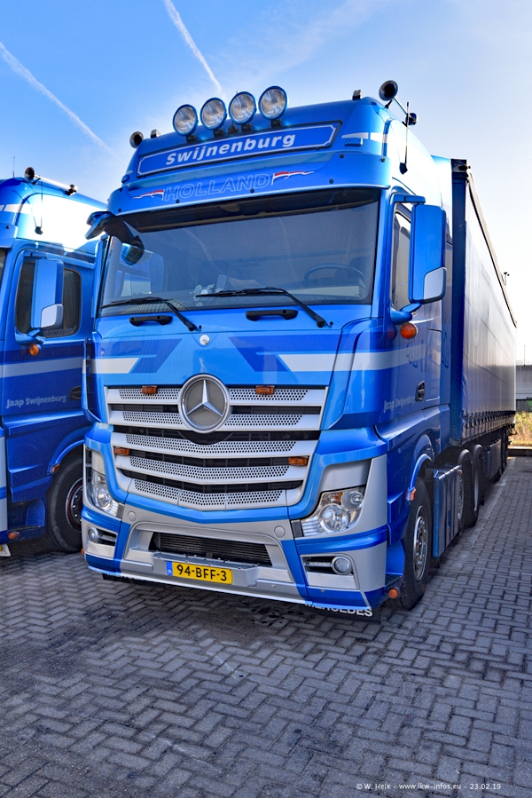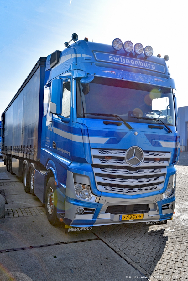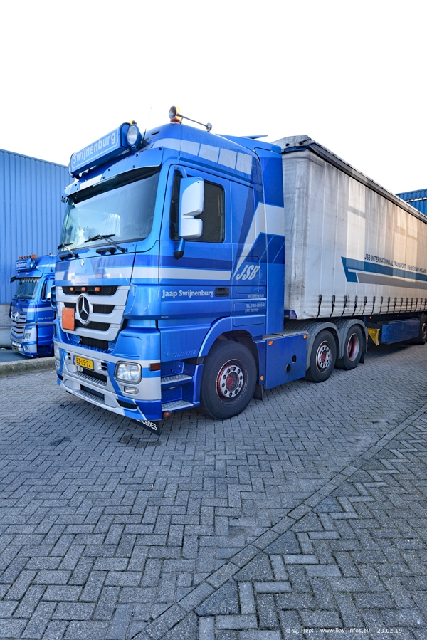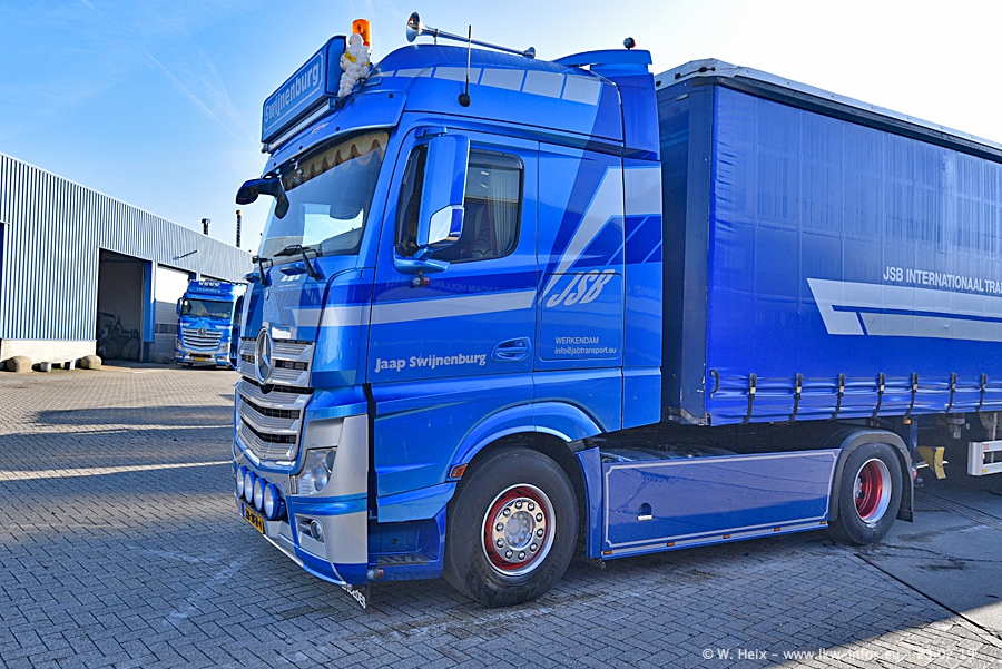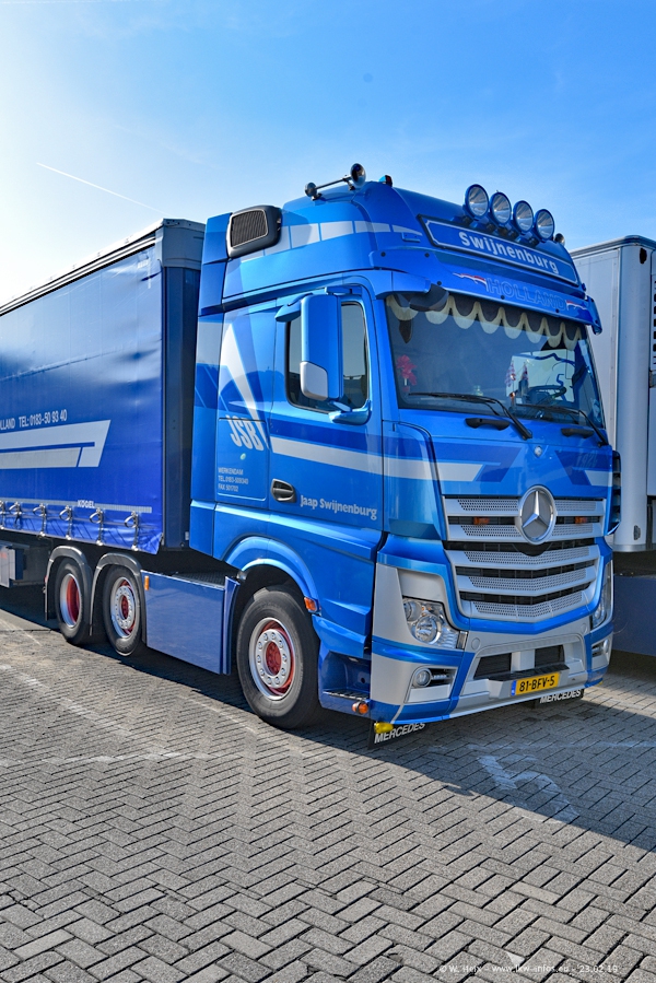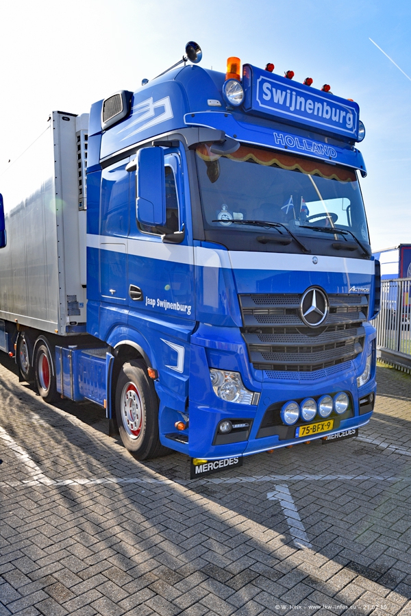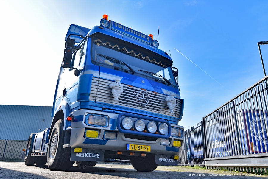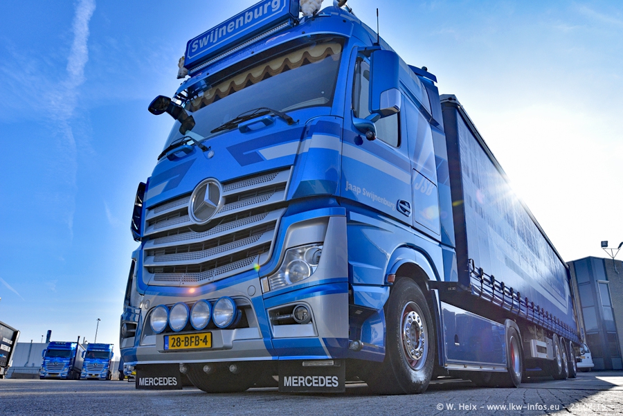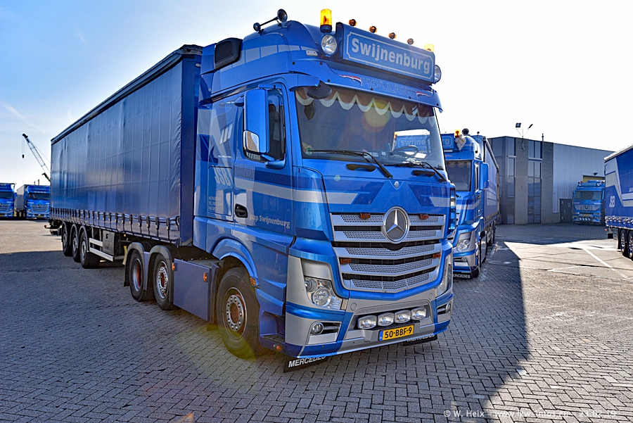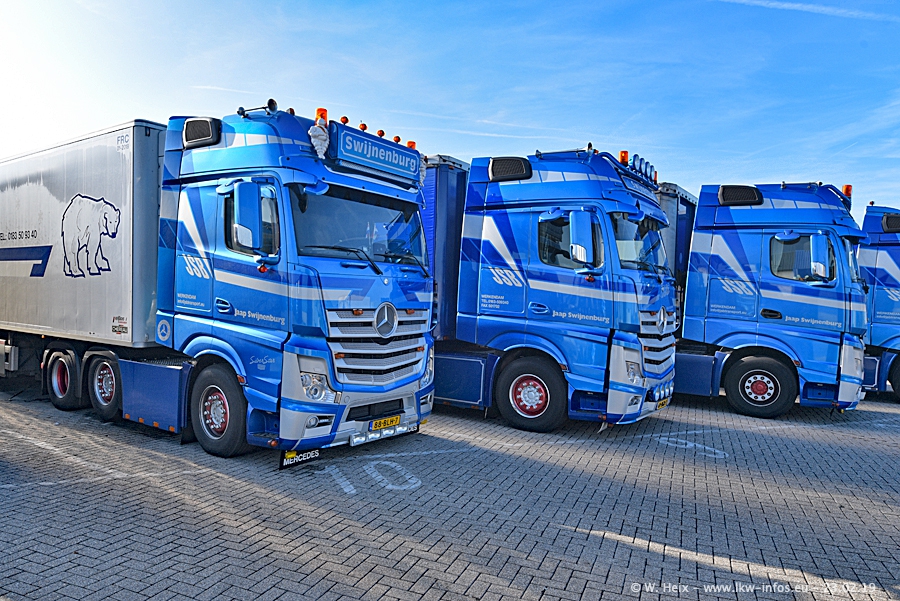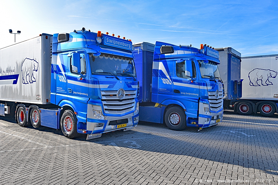Mein letzter Besuch bei JSB Swijnenburg war im Jahr 2014. In den letzten fünf Jahren hat sich entsprechend viel verändert im Fuhrpark, der aus ca. 30 LKW besetht. Das sind ausschließlich Zugmaschinen der Actros-Baureihe. Inzwischen sind das fast alles Actros 4. Dazu kommt noch ein SK 1948 der ersten Generation, der vor ca. 5-6 Jahren restauriert wurde. Ob diese Zugmaschine noch eingesetzt wird, weiß ich nicht. Der SK stand beim Besuch ganz vorne in der Reihe vor den ganzen Actros.