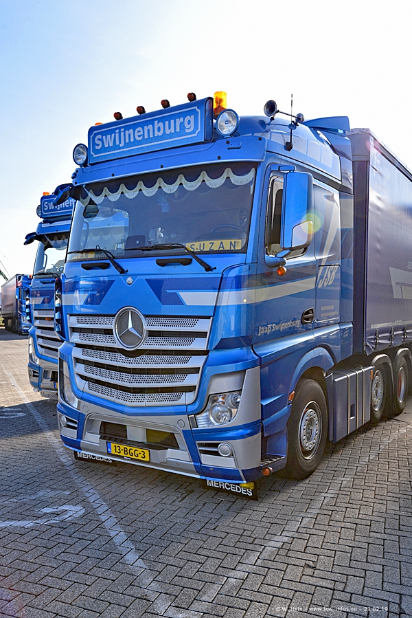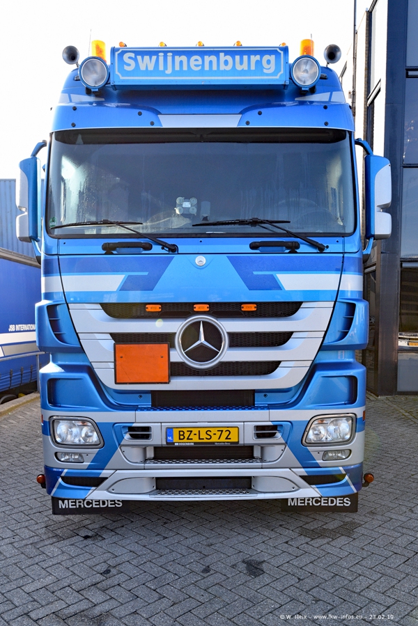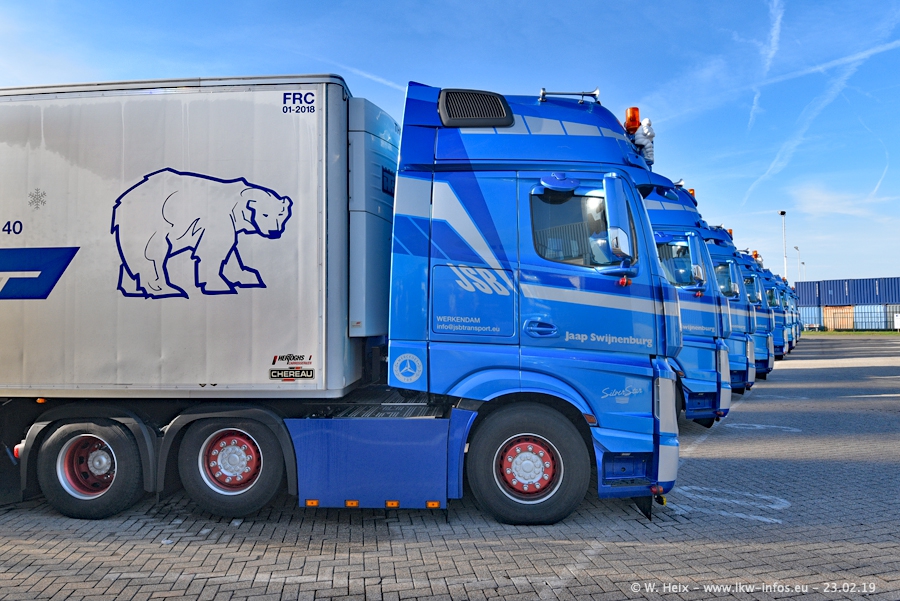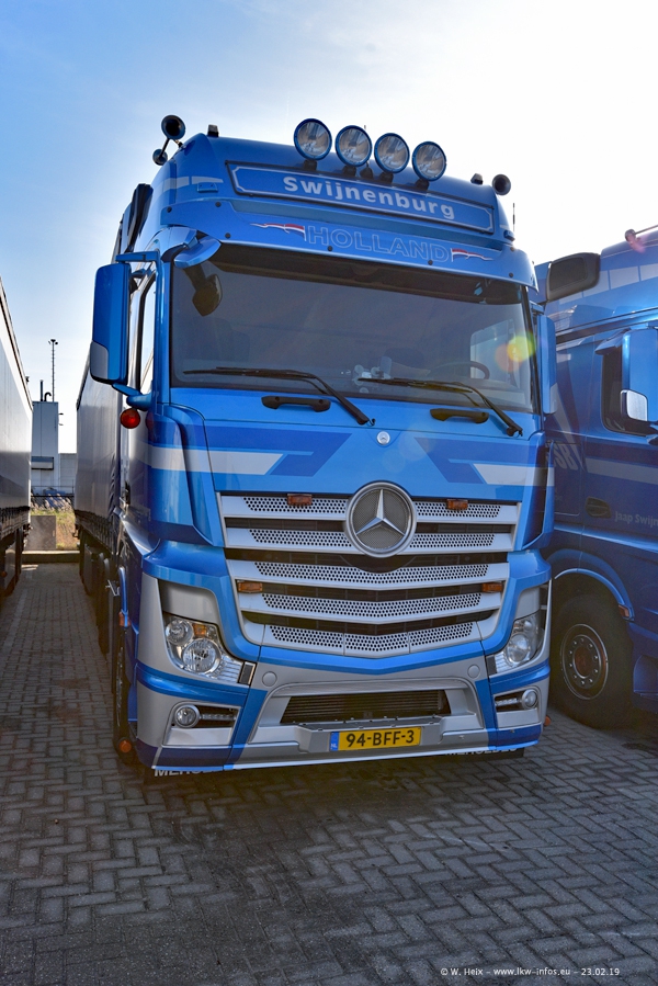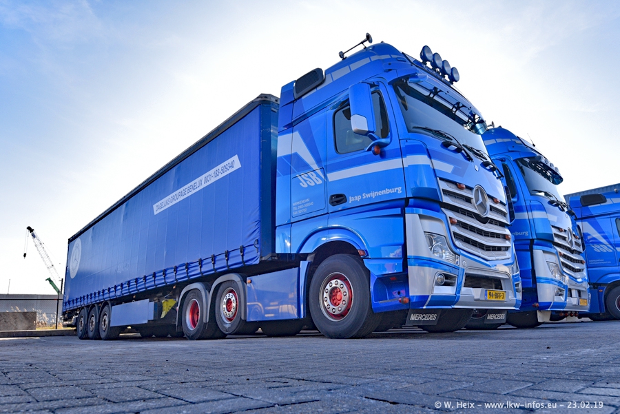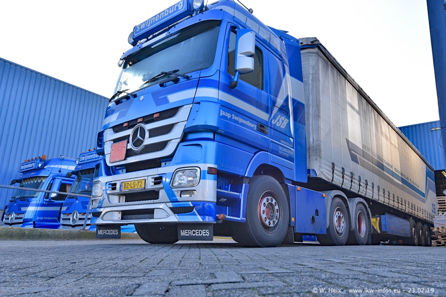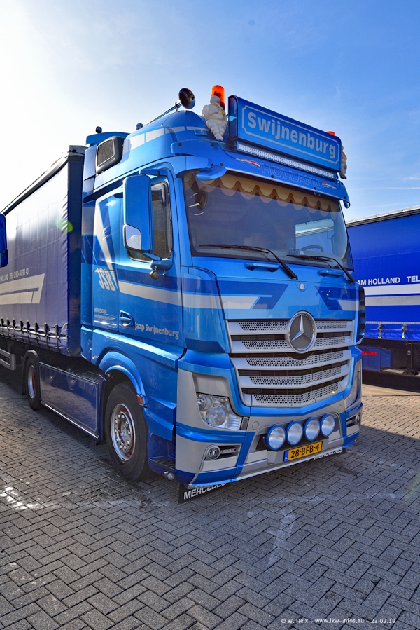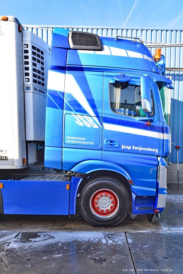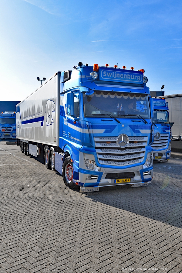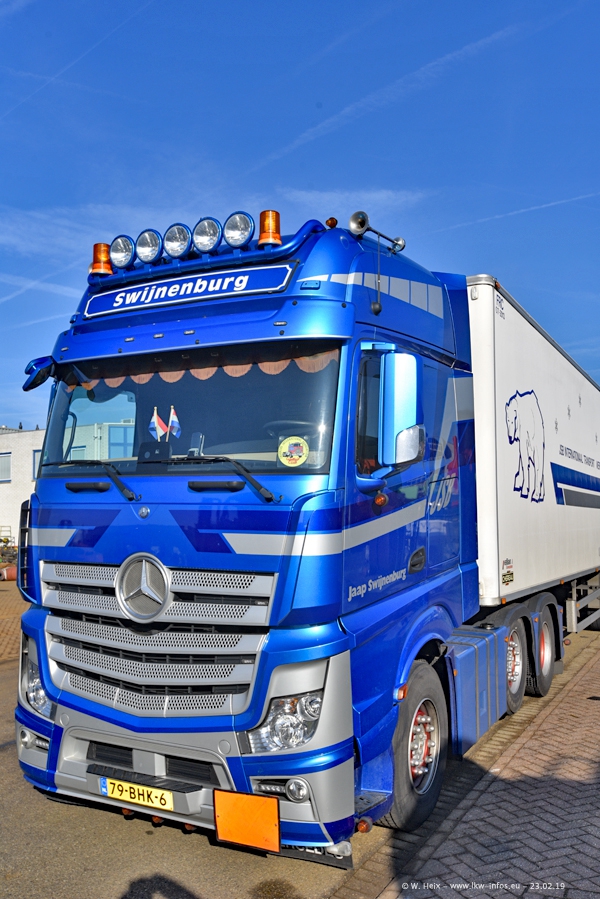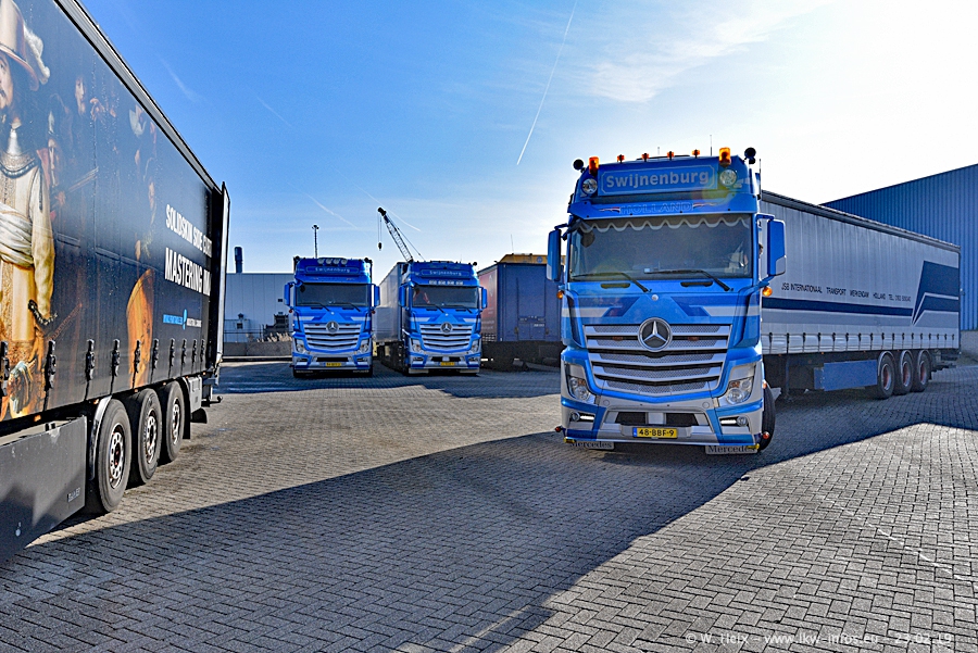Mein letzter Besuch bei JSB Swijnenburg war im Jahr 2014. In den letzten fünf Jahren hat sich entsprechend viel verändert im Fuhrpark, der aus ca. 30 LKW besetht. Das sind ausschließlich Zugmaschinen der Actros-Baureihe. Inzwischen sind das fast alles Actros 4. Dazu kommt noch ein SK 1948 der ersten Generation, der vor ca. 5-6 Jahren restauriert wurde. Ob diese Zugmaschine noch eingesetzt wird, weiß ich nicht. Der SK stand beim Besuch ganz vorne in der Reihe vor den ganzen Actros.