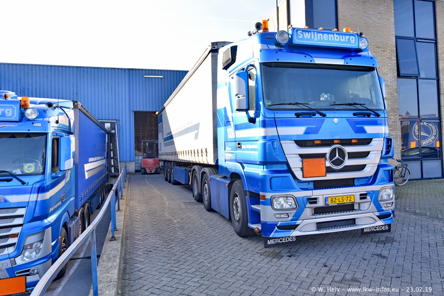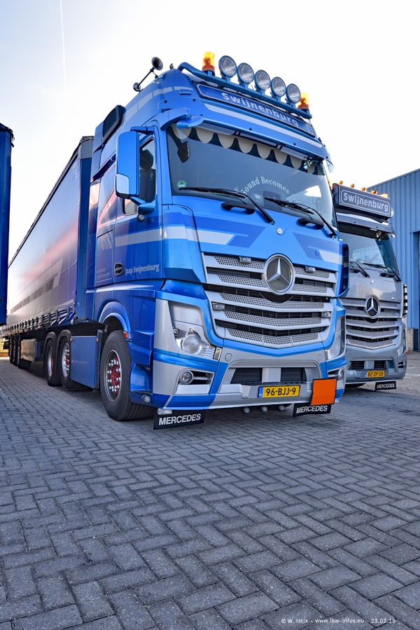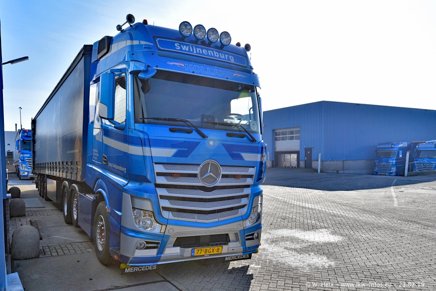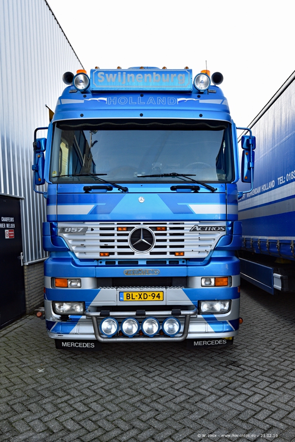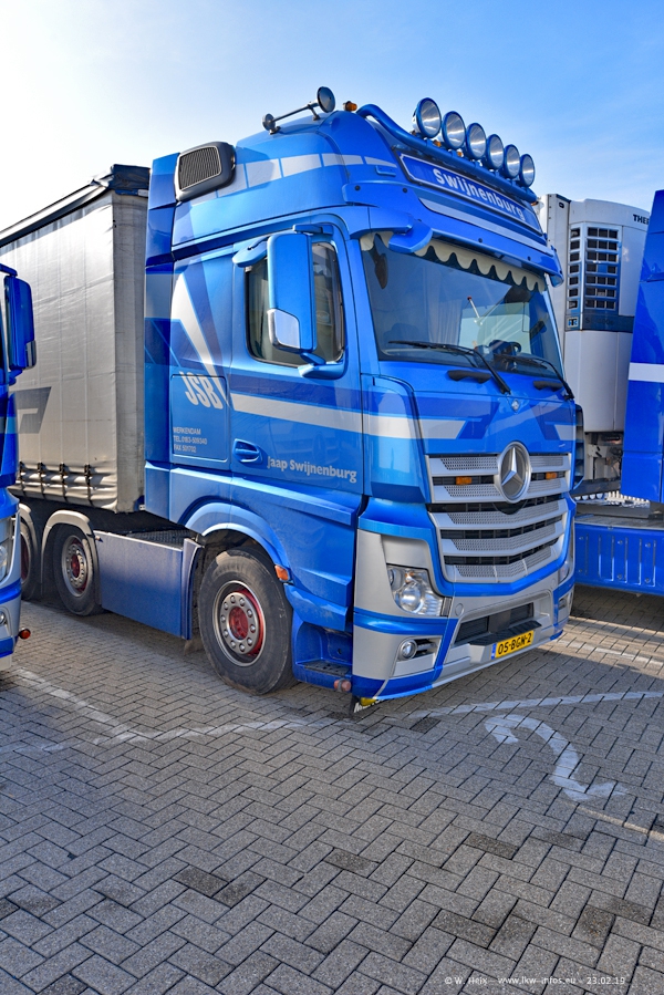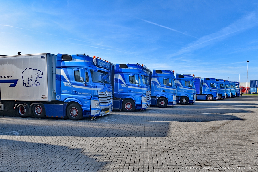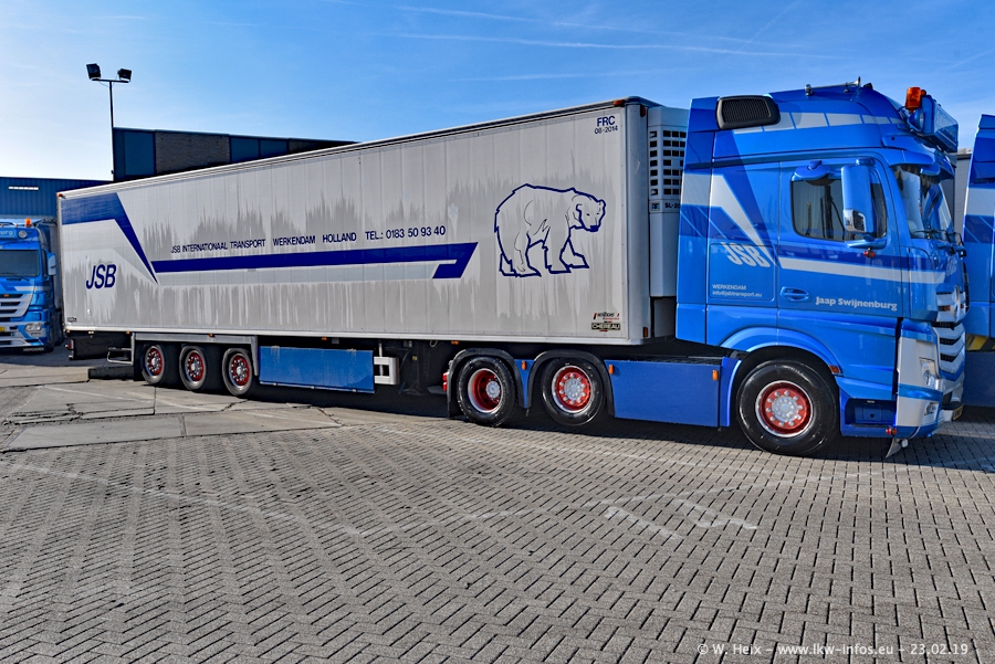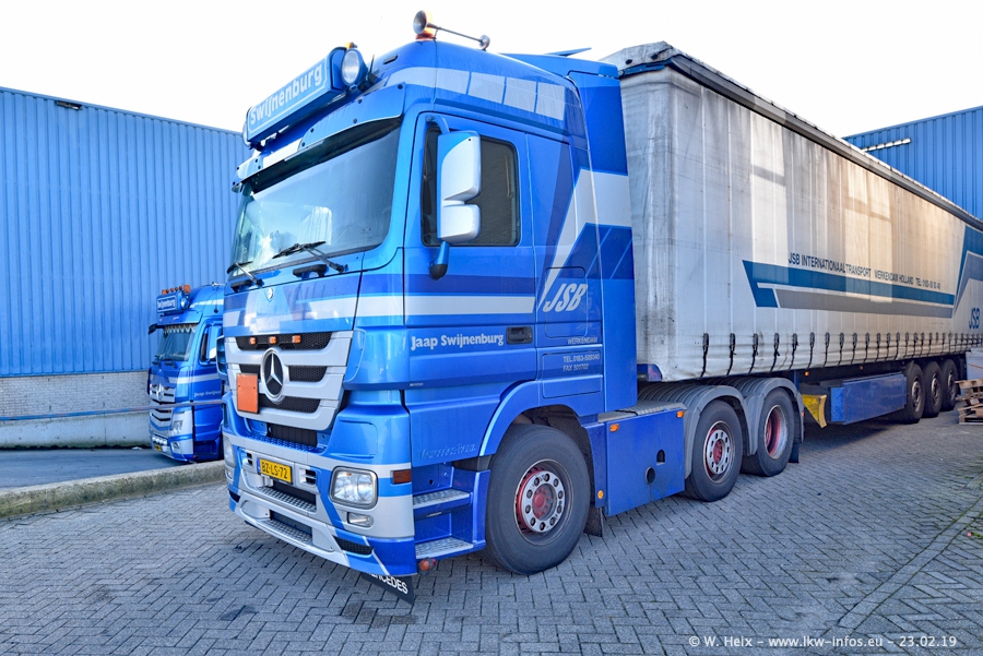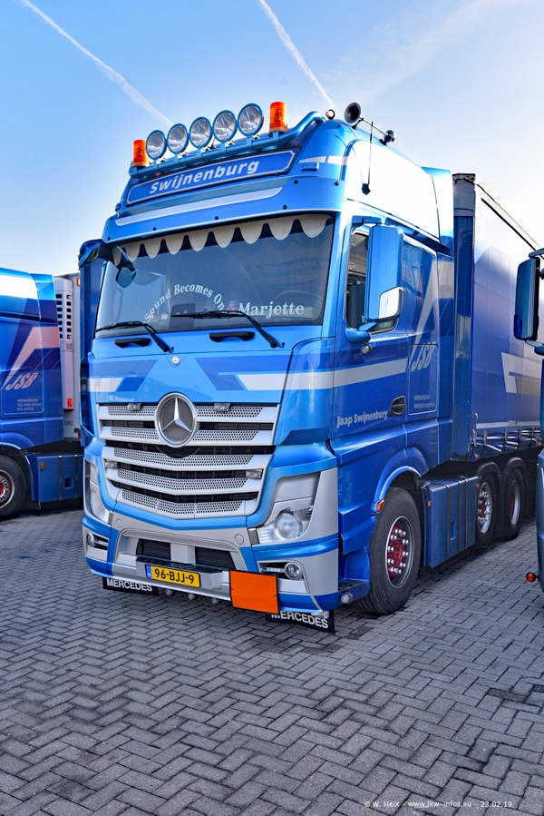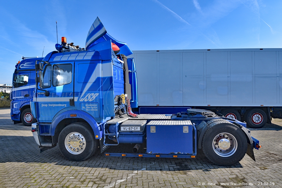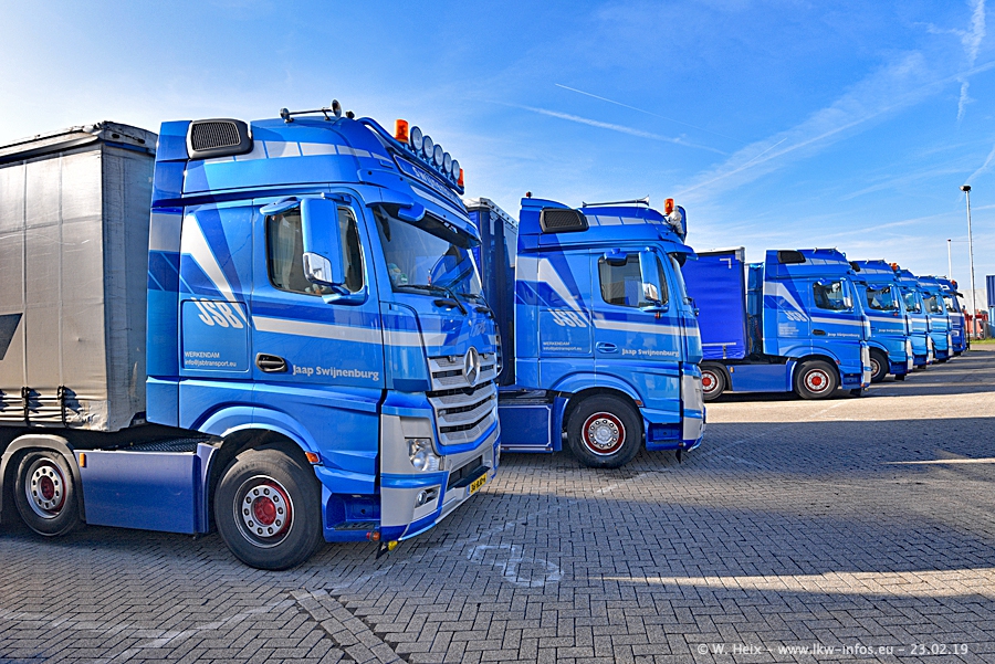 Mein letzter Besuch bei JSB Swijnenburg war im Jahr 2014. In den letzten fünf Jahren hat sich entsprechend viel verändert im Fuhrpark, der aus ca. 30 LKW besetht. Das sind ausschließlich Zugmaschinen der Actros-Baureihe. Inzwischen sind das fast alles Actros 4. Dazu kommt noch ein SK 1948 der ersten Generation, der vor ca. 5-6 Jahren restauriert wurde. Ob diese Zugmaschine noch eingesetzt wird, weiß ich nicht. Der SK stand beim Besuch ganz vorne in der Reihe vor den ganzen Actros.