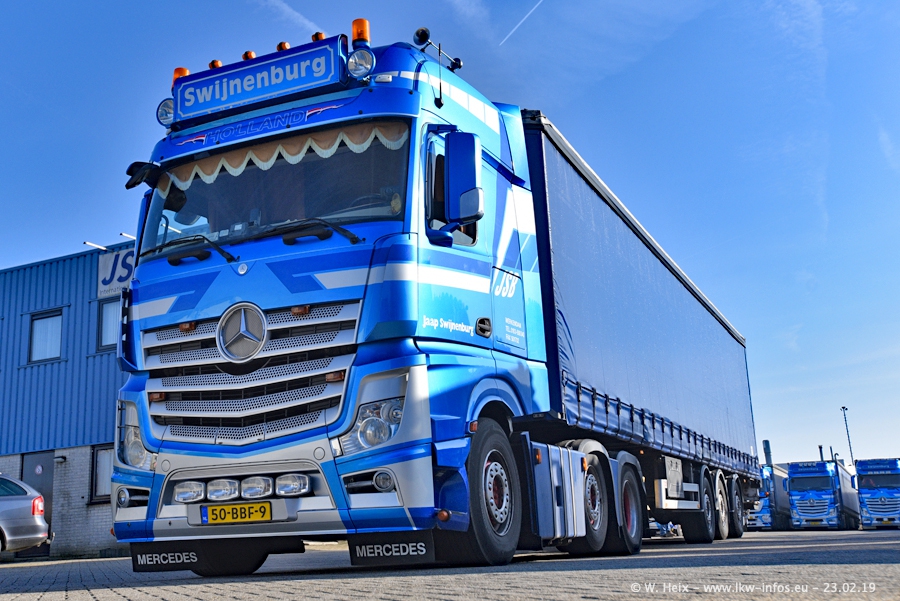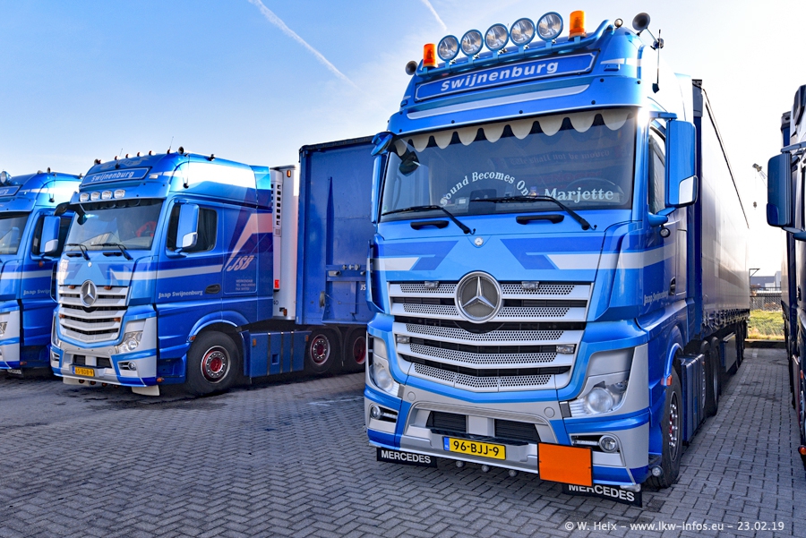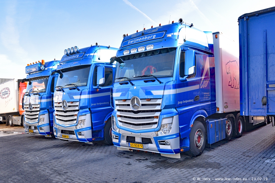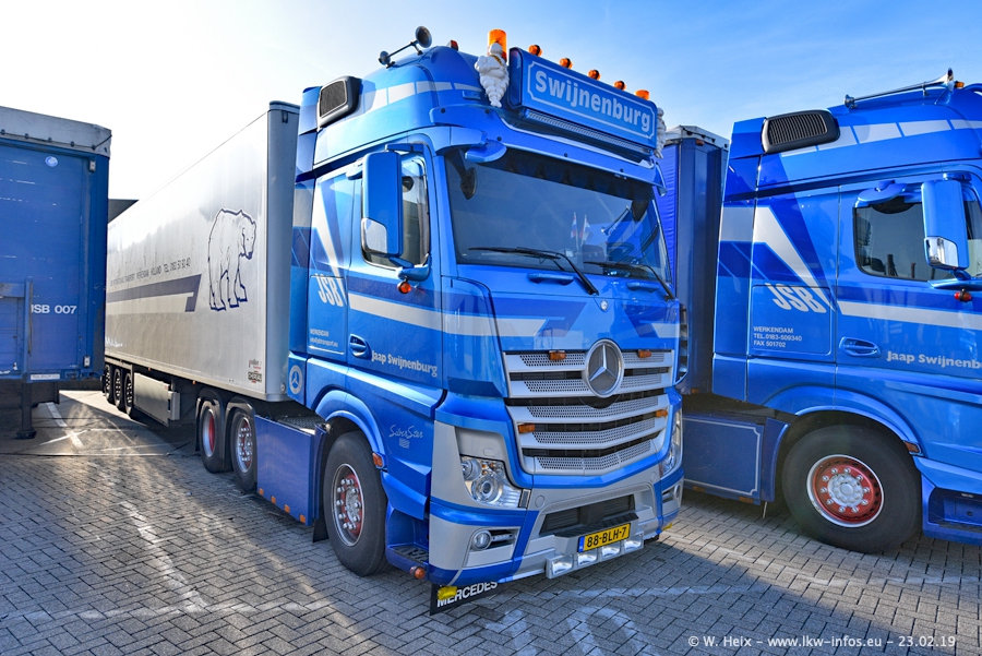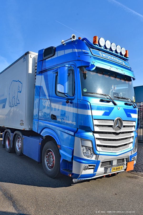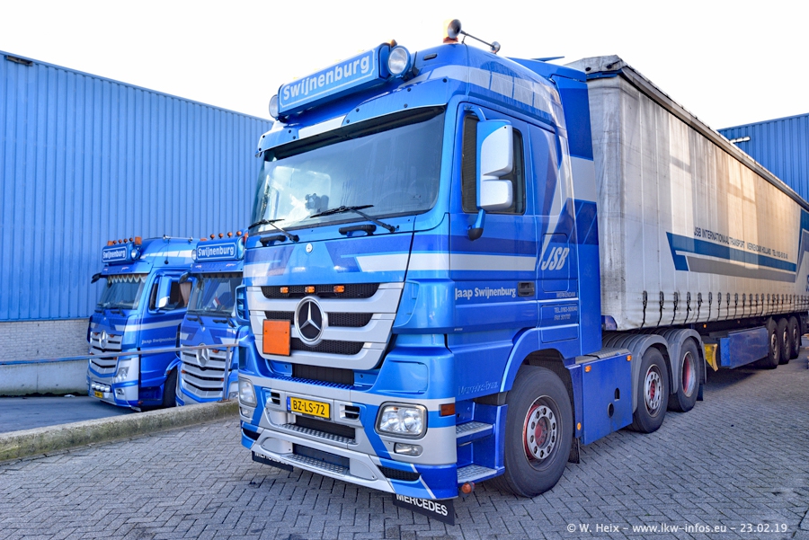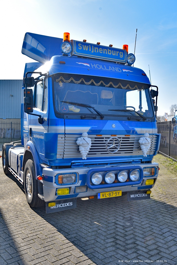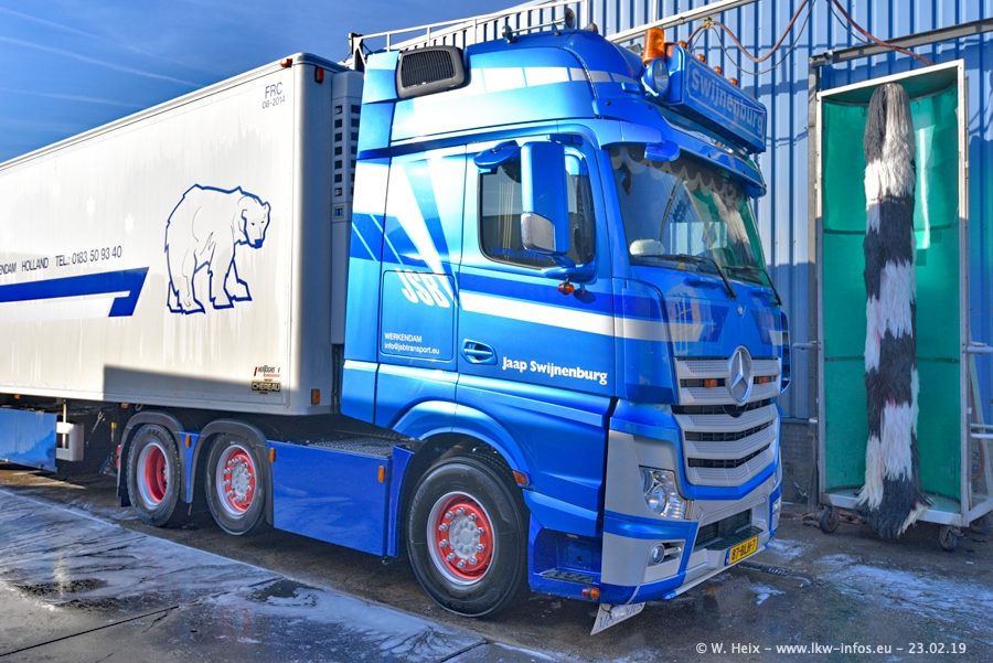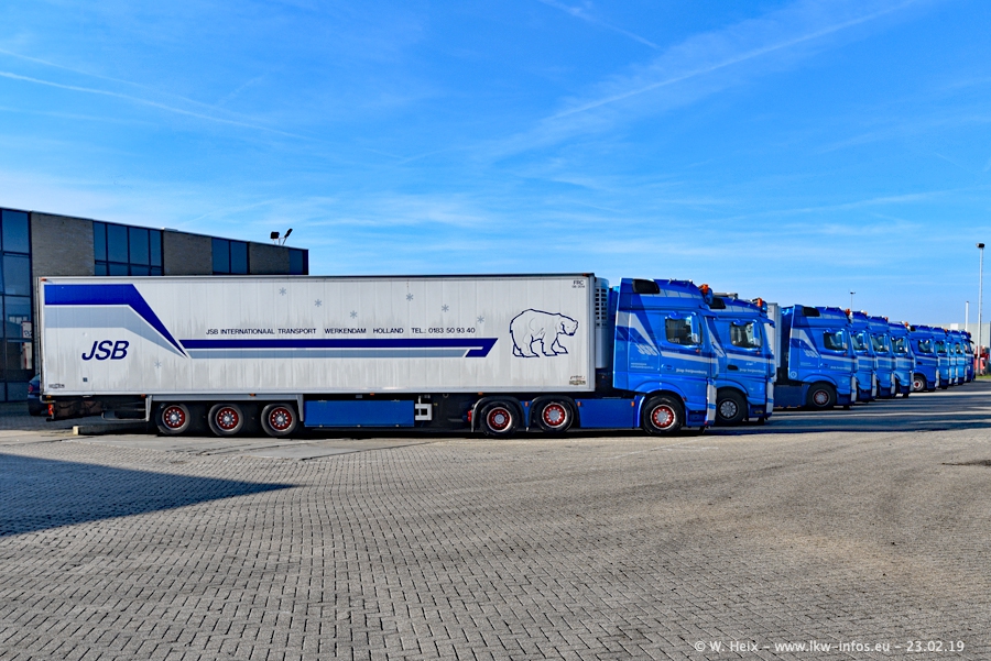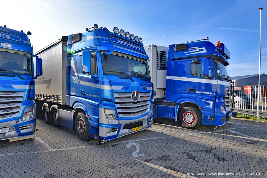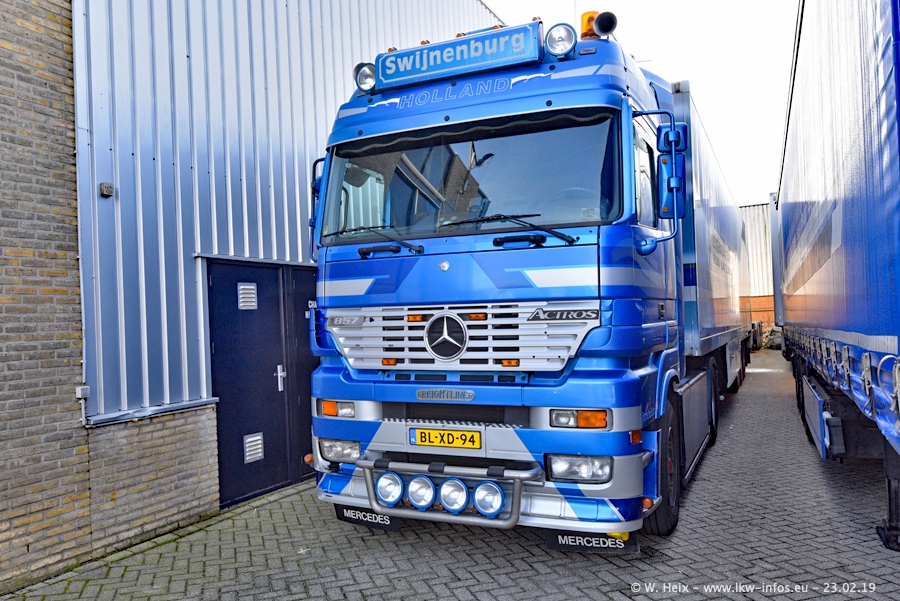 Mein letzter Besuch bei JSB Swijnenburg war im Jahr 2014. In den letzten fünf Jahren hat sich entsprechend viel verändert im Fuhrpark, der aus ca. 30 LKW besetht. Das sind ausschließlich Zugmaschinen der Actros-Baureihe. Inzwischen sind das fast alles Actros 4. Dazu kommt noch ein SK 1948 der ersten Generation, der vor ca. 5-6 Jahren restauriert wurde. Ob diese Zugmaschine noch eingesetzt wird, weiß ich nicht. Der SK stand beim Besuch ganz vorne in der Reihe vor den ganzen Actros.