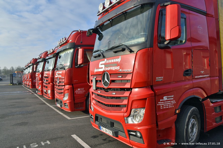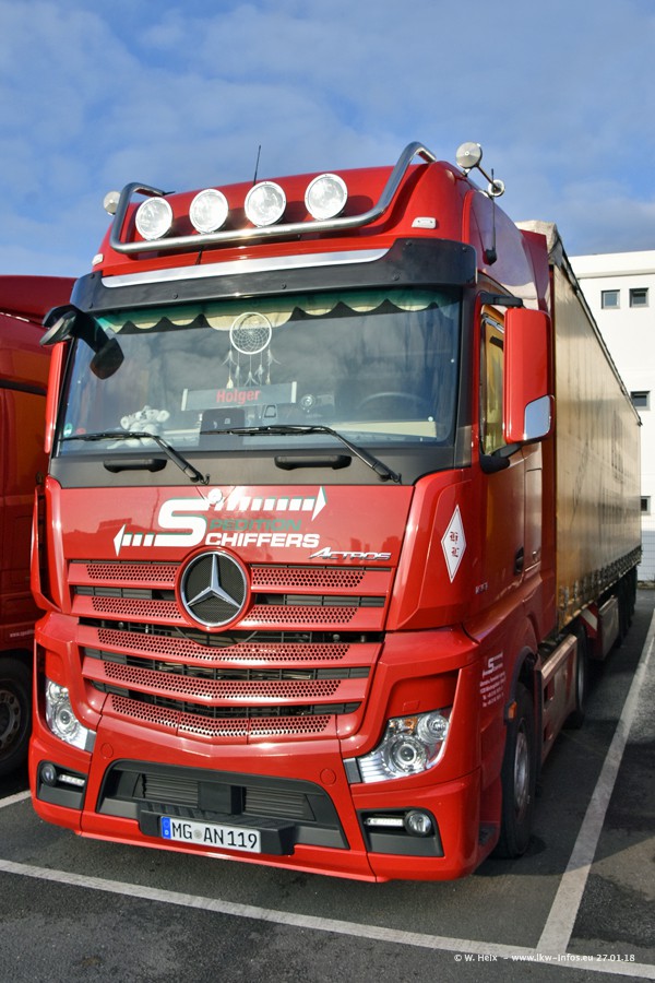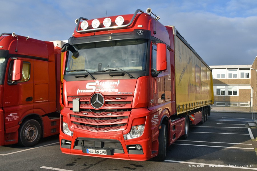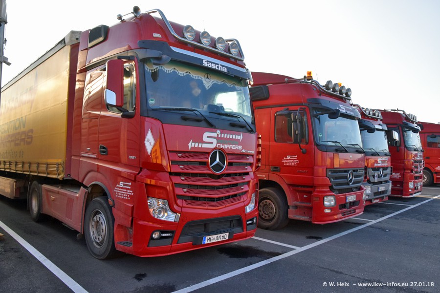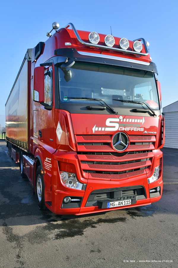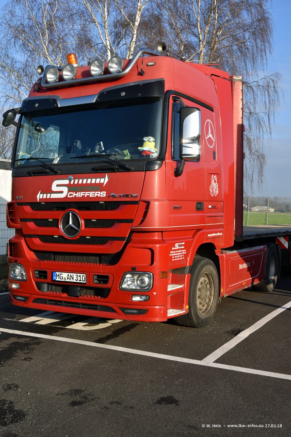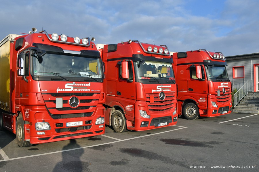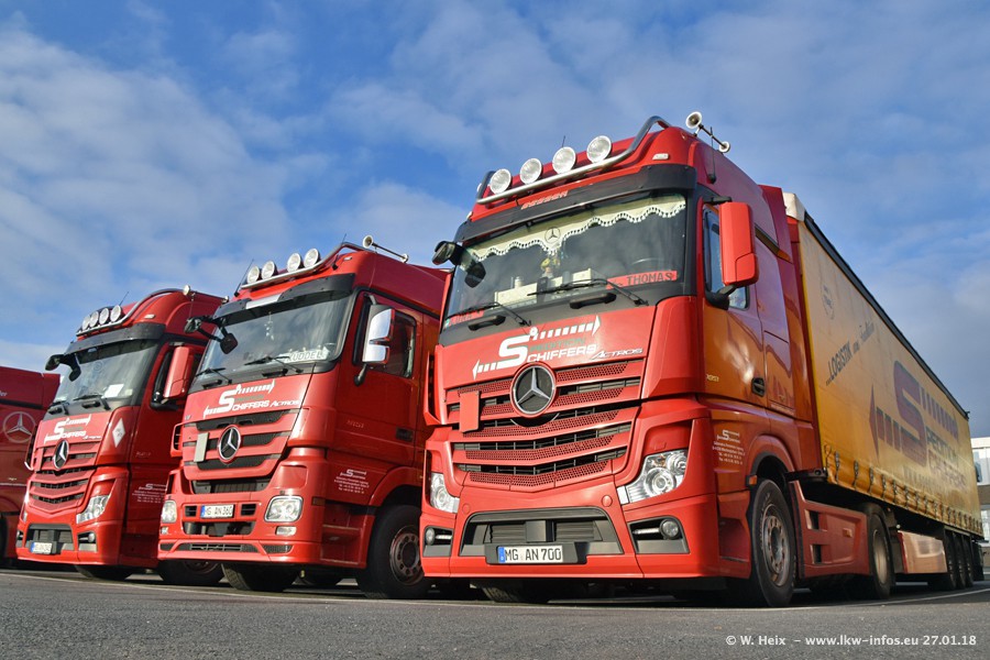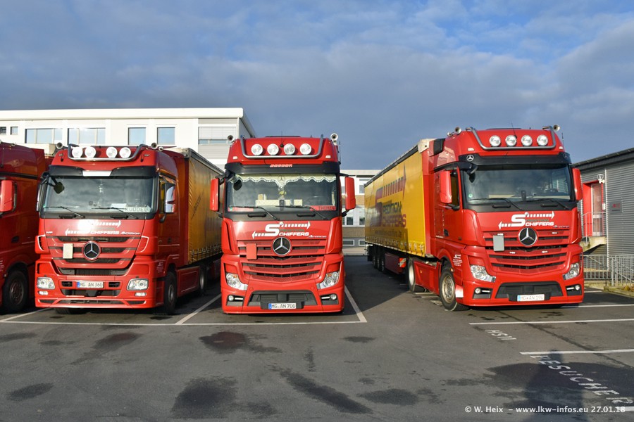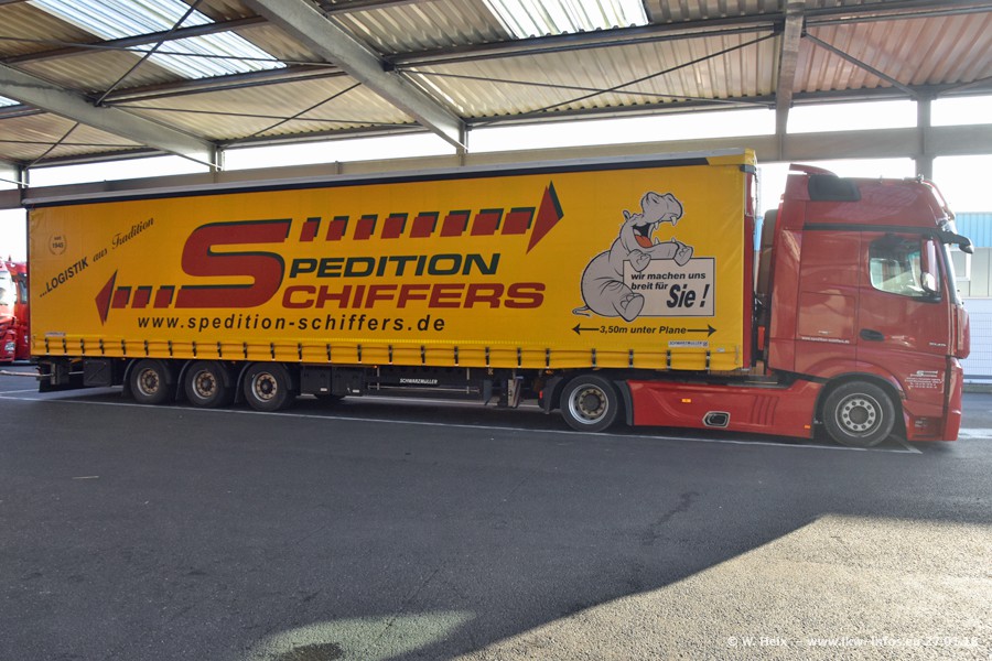 Heute war ich zum ersten Mal bei Schiffers in Mönchengladbach. Es gibt insgesamt 28 LKW, alle von Mercedes-Benz. Im Fernverkehr sind überwiegend Actros 4 im Einsatz. Im Nahverkehr werden überwiegend Mercedes-Benz der Baureihen Actros MP2 und Actros 3 eingesetzt.